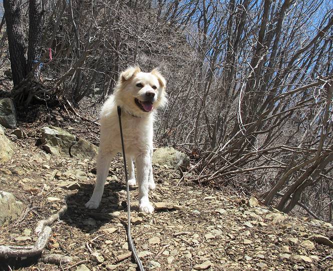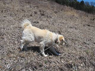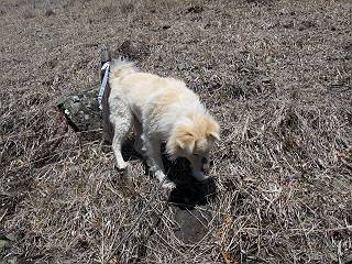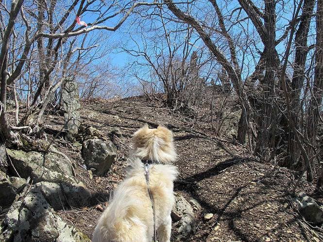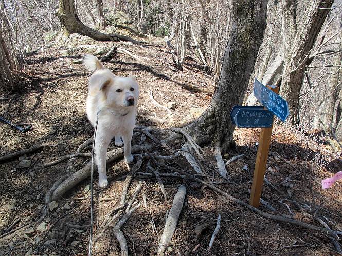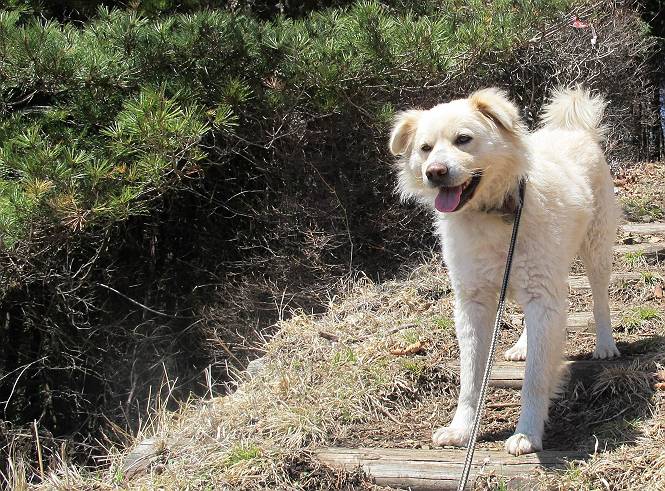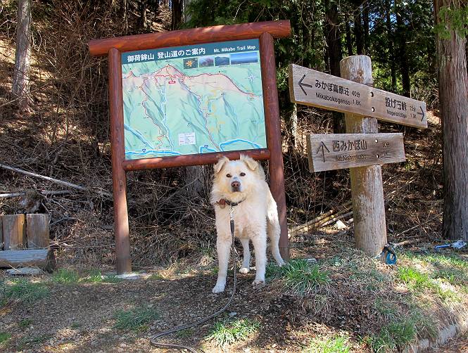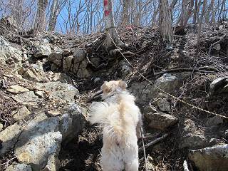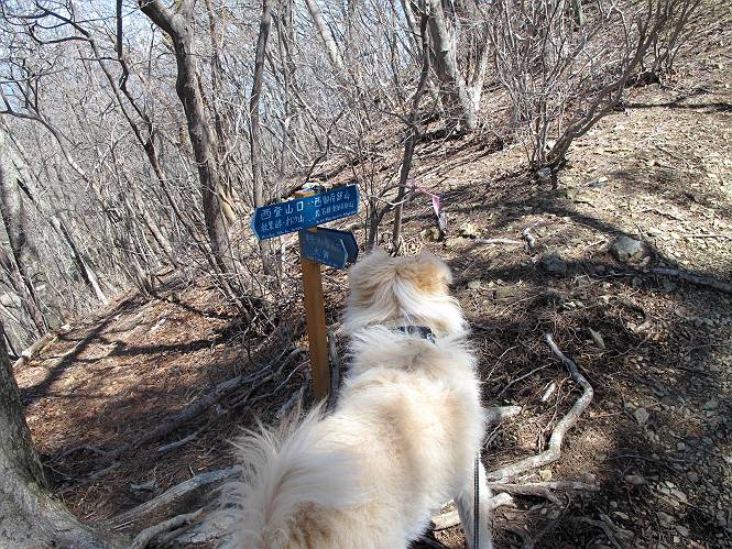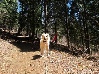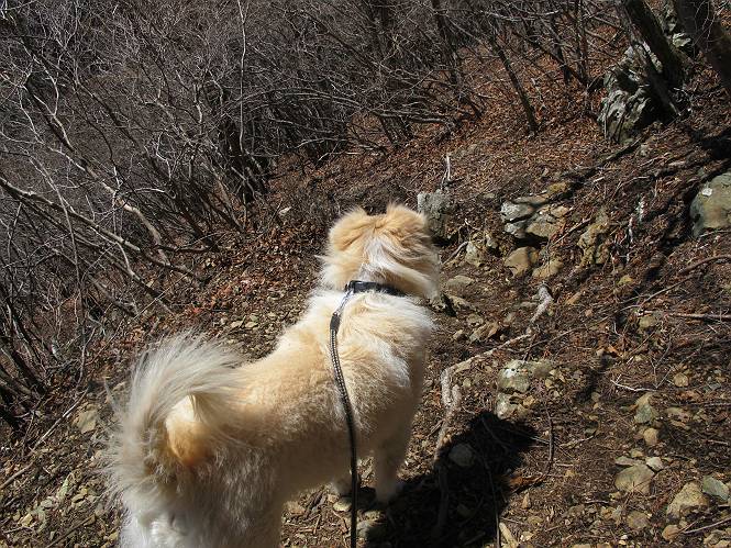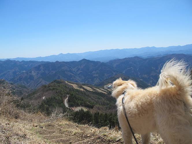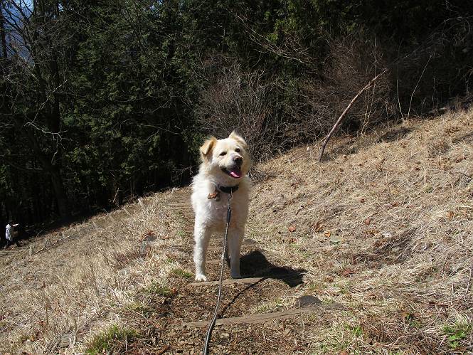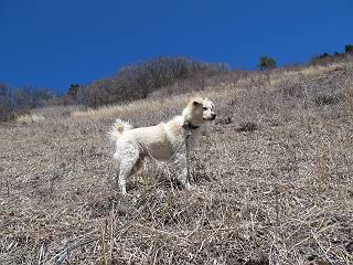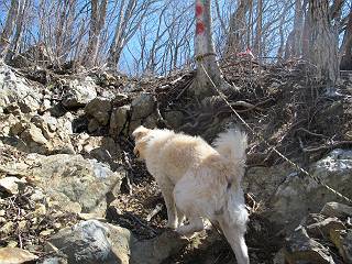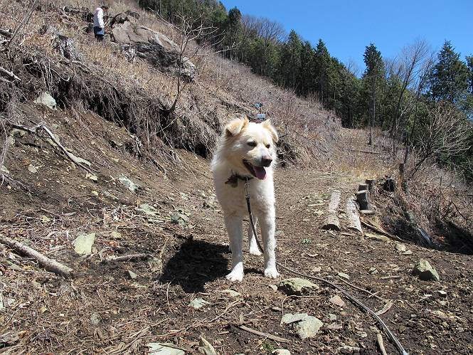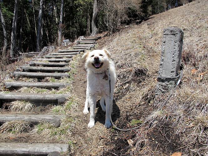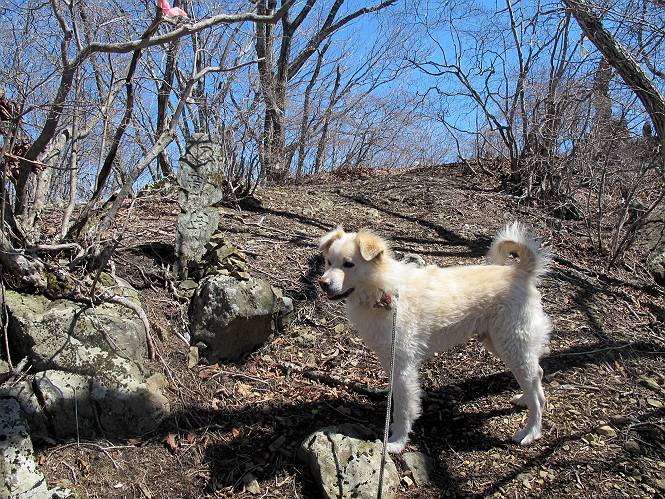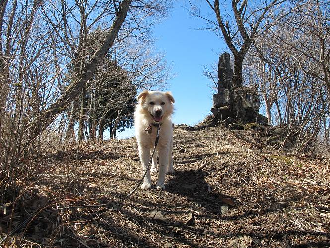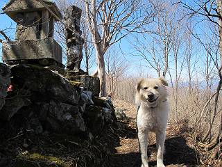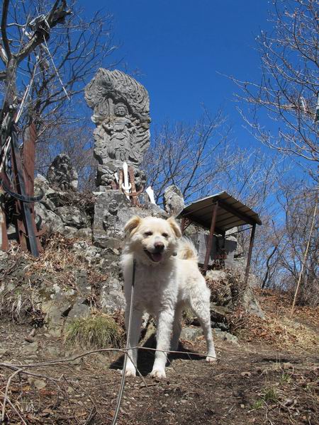| 平成二十五年四月八日 Before 写真集目次へ Next これから西上州の御荷鉾山へ出かけます、レッツゴー! 高速で藤岡ICに出て、鬼石の石屋さん家へちょっと寄って、西御荷鉾山へ向かいます。 神流湖のほとり、保美濃山から山道に入って、御荷鉾スーパー林道を走って、西御荷鉾中央登山口から歩き出し、桧林を抜けて登山道を上ってきました。 この先で丸太の階段が終わり、雑木林の中に入るそうです。 今日は、お母さんも一緒なんです、後から離れてついてきてます。 雑木林を上って行くと尾根に出て、道標がありました。右に上るようです。 尾根に出たら、強い風が吹いて、寒いです。 急坂の方の道を上ってます、3cmほどの霜柱ができてます、寒いわけですね。 石碑が見えてきました、そろそろ山頂ですね。 お母さんが横の道からひょっこり現れました。 頂上到着でーす。 早速、記念写真を撮ってもらいました。 浅間山がきれいに見えてます、隣は四阿山ですって。 西〜北側の眺めです。 写真をクリックすると大きくなるよ。 ![]() 南側の眺めです。 これも写真をクリックすると大きくなるよ。 ![]() 山頂の東側にやってきました、お母さんは山頂にいます。 怖そうな神様が、あっちにも、こっちにも立ってます。 この道を進むと東御荷鉾山へ行けるんですって。 今度は西のコワイ神様の前で撮ってもらいました。 そろそろ、来た道を下ります。 風が静かになりました。 南が開け、山並が良く見えますが、 ぼくにはどこの山だかわかりません。 リードをいっぱいにのばしてもらって、急斜面を下りました。 もう、広い道に出てしまいました。 桧林を通って 案内板のある登山口に戻りました。山頂は風が強かったので、ゆっくりできませんでした。 Before 写真集目次へ Next |