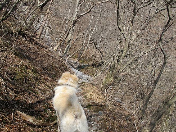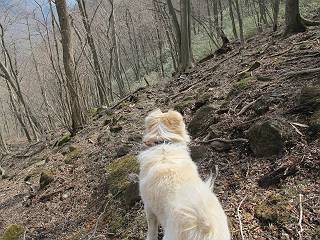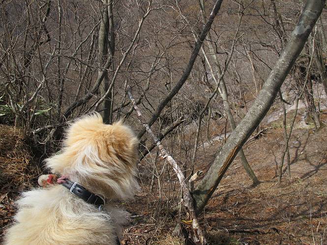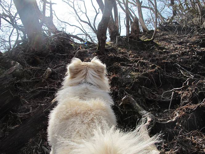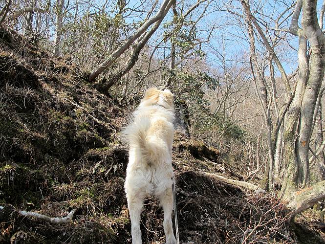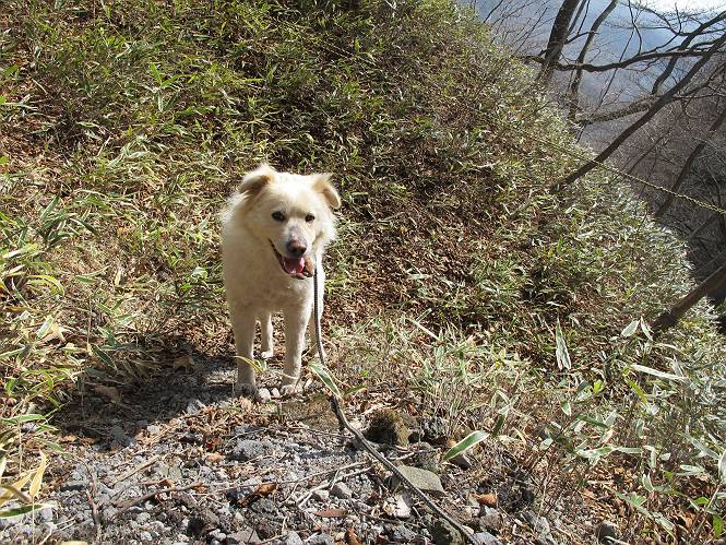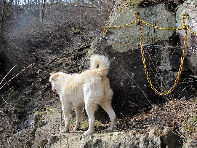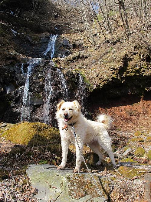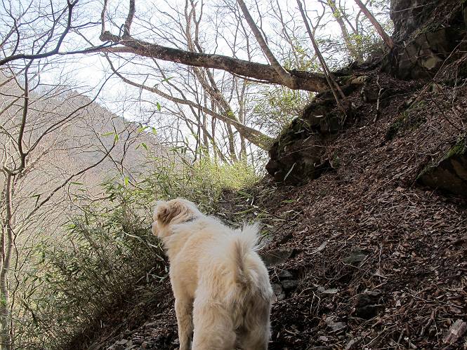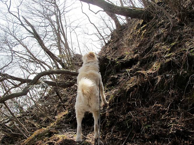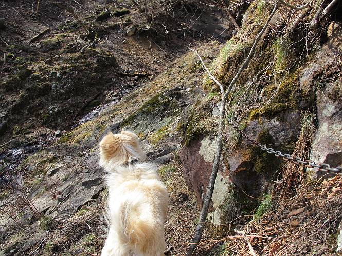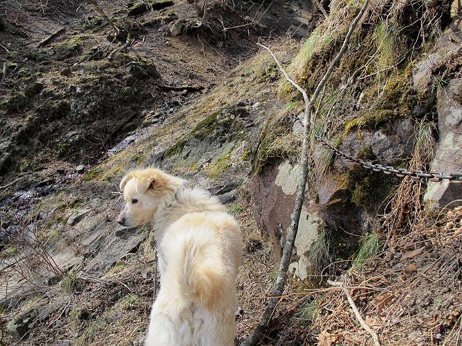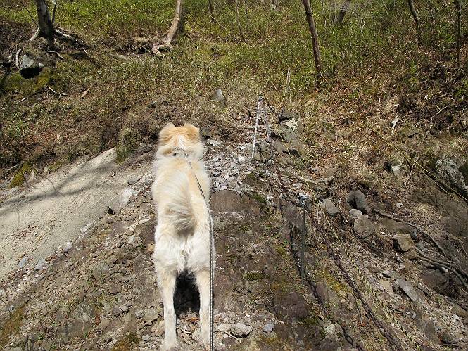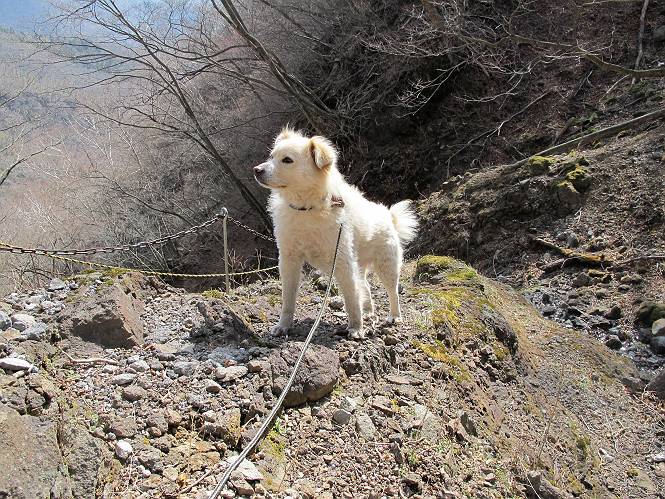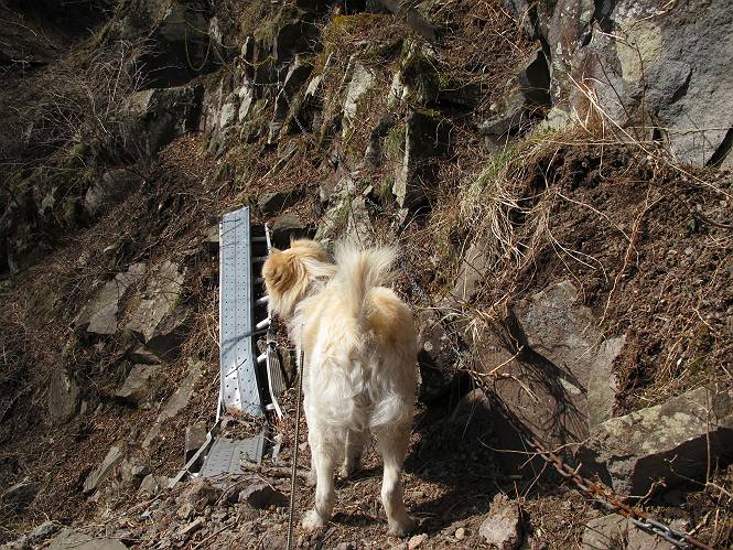 | 平成二十五年四月十六日 Before 写真集目次へ Next 今日は、朝の散歩をやめて、赤城利平茶屋森林公園の遊歩道を一周する陽だまりハイク?に連れてってもらいました。駐車場には、平日で早目だったので、1台も車がありませんでした。 8:00頃の森林公園入口です。 奥の広場から橋を渡ります。 ロープがかけてありましたが、4/30までお休みのようです。 突き当たりに案内板があり、まず、橙色のコースで三階の滝まで行きます、距離は600mだそうです。 作業道をしばらく歩きます、「滝ってあれ?」、 「あれは堰堤だよ」 ここから細い道に変りました、ここには“山崖の滝”と書いてありました。 少し進むと、雪が残ってました、美味しかったですよ。 上も面白そうですね。 沢の中を遊びながら登って行きました。 「あれが、三階の滝?」、 「そうだよ」、 「きれいだね」 三階(山崖)の滝 記念写真を撮ってもらいました。 滝の周りにもアチコチ雪が残ってました、また食べちゃったよ。 ここからは、赤いコース、500mの急坂で、危険な場所もあるそうです、ぼくは初めてです。 上ってきたぞ。 眺めがいいなあ。 「何、これ」、「足元が危険、注意しなさい、ということ」、「そういうことね」 ここはアルミ板と岩の間をゆっくり、お父さんについて、注意しながら歩きました。 ここも狭いので岩に体をピッタリつけて渡りました、お父さんがおさえてくれてたよ。 高くなってきたぞ。 「そっちじゃないぞ」 ちょっと見渡しながら、一歩ずつ歩いてます。 もう少しで、クサリ場が終わるようです。 「まだ、この先に危険な場所が・・・」 「あっ、そう、まだ、あるんだ」 でも、息切れしましたよ。 あっ、あそこかな? ぼくは、こういう場所は得意です、スイスイ渡れるよ。 危険な場所が過ぎて、今度は急斜面です。 でも、爪が引っかかるから歩きやすいです。 おお、ここは、急だなあ。 緑色の葉っぱの木が出てきました、シャクナゲだそうです。 急な道ですが面白いですね。 はぁー、と、もう少しで尾根に出るようです。 緩やかになって、ラクになったと思ったら、 ベンチのあるお休み所に着きました。 次は緑色の600mで尾根道です。 ここで少し休憩ですって。 お父さんは、南の斜面に下りて行って盛んに上を見上げています、何かな? ぼくも行きたいけど、危ないんだって。 尾根伝いに歩いて行くと向こうの方に滝が見えてきました。 この滝も3段になっているとか、大きさはこちらの方がずっと大きいそうです。 尾根歩きって見晴らしは良いし、 上ったり下がったりして楽しいですね。 「こら、駄目だ、飛び出したりして・・・」、「鹿が走っていったんだ、すみません」 深いなあ。 「落ちたら大怪我しちゃうね」、「だから、飛び出たら駄目なんだ」 また、危なそうな場所で写真を撮ってます。 地割れしているんですって、ドカッて崩れたら・・・・・・。 最近強い風が吹いたようで、枝が点々と落ちています、リードが引っかかって、大変です。 東の下降点に着ました、一面笹原です。 ここからは下り750mで広場に戻るそうです。 「また、鹿を見たよ、鹿君と遊びたいなあ」、「吠えたら、逃げちゃうよ」、「そうか、????」 ここからは、林の中を下るだけなんだって、さ。 後に見える山は駒ケ岳だそうです、葉がないから良く見えますね。 おやっ、木も草もないや、 どうしてかな。 あーあ、また引っかかっちゃった、「お父さん、取って」 「あれっ、何?」 「コバイケイソウの芽だよ 」 「あっちにも、こっちにも沢山出てるね。」 一回りして、吊橋に着きました。 沢に沿って、水を飲みながら歩きました。 森林公園に到着です。 陽だまりハイク?、楽しかったでーす。お花はスミレ一花、全然咲いてませんでした。 ほくの鼻、黒いでしょ、毛が抜けちゃったんだよね、また生えてくるでしょう。 車で二ノ鳥居まで走ったら、チョコっとオオヤマザクラが咲き出してました。 Before 写真集目次へ Next |