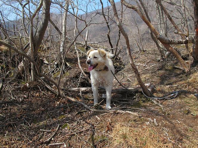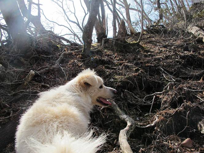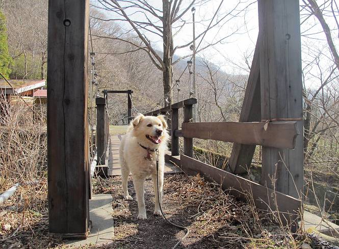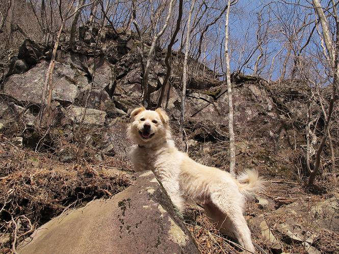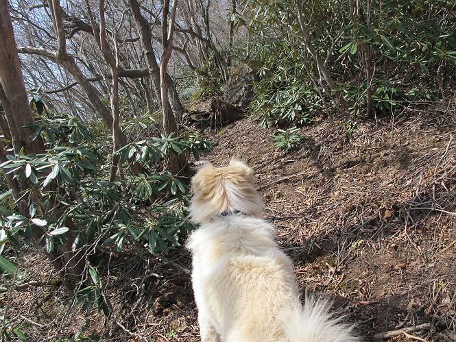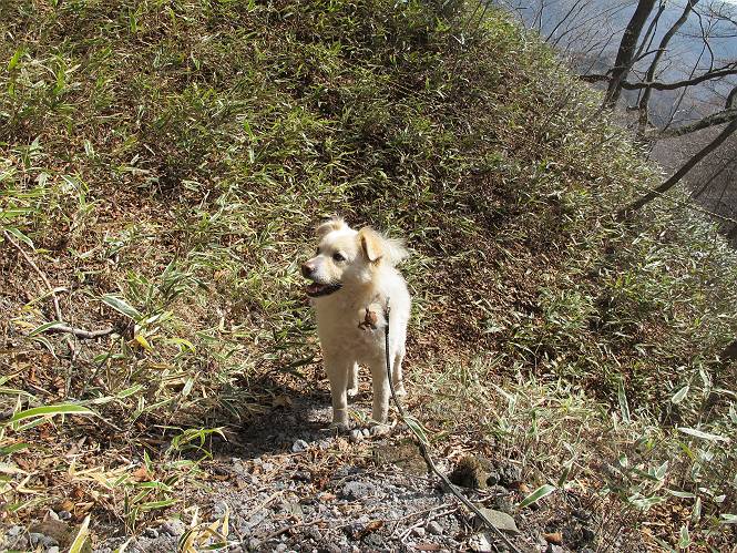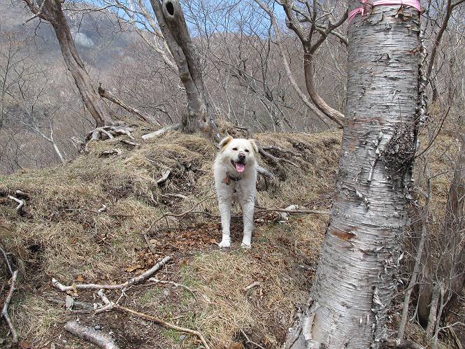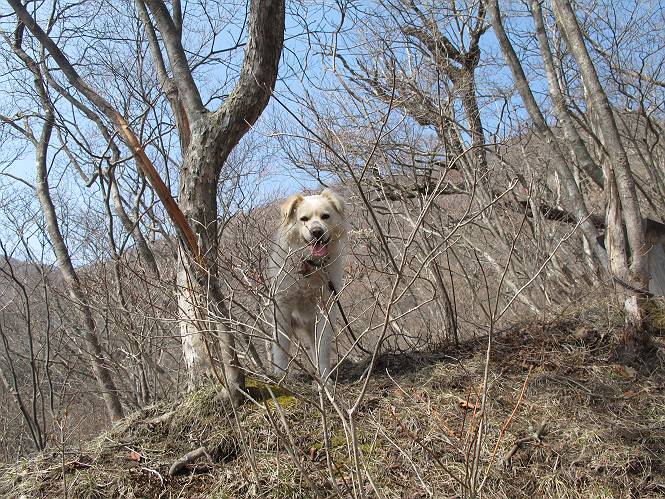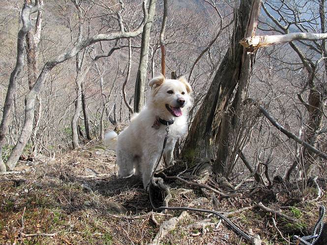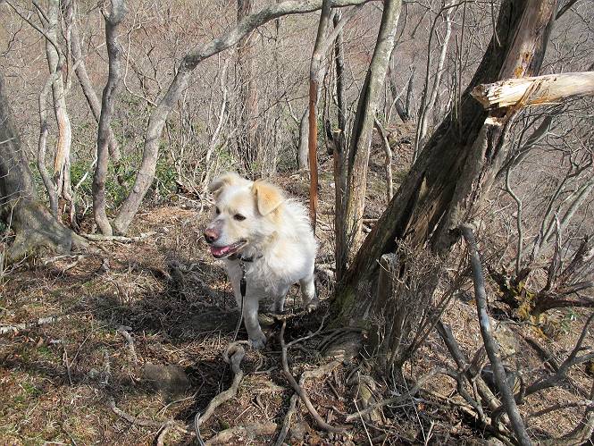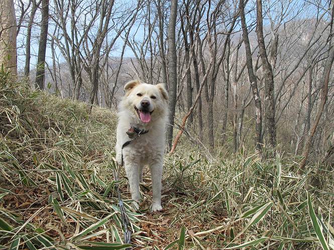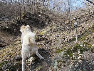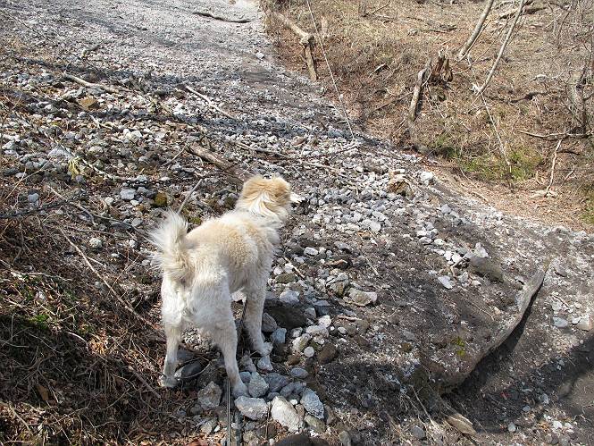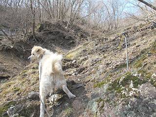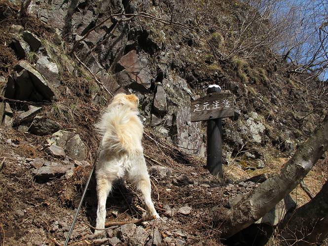 | 平成二十五年四月十六日 Before 写真集目次へ Next 今日は、朝の散歩をやめて、赤城利平茶屋森林公園の遊歩道を一周する陽だまりハイク?に連れてってもらいました。駐車場には、平日で早目だったので、1台も車がありませんでした。 8:00頃の森林公園入口です。 奥の広場から橋を渡ります。 ロープがかけてありましたが、4/30までお休みのようです。 突き当たりに案内板があり、まず、橙色のコースで三階の滝まで行きます、距離は600mだそうです。 作業道をしばらく歩きます、「滝ってあれ?」、 「あれは堰堤だよ」 ここから細い道に変りました、ここには“山崖の滝”と書いてありました。 少し進むと、雪が残ってました、美味しかったですよ。 上も面白そうですね。 沢の中を遊びながら登って行きました。 「あれが、三階の滝?」、 「そうだよ」、 「きれいだね」 三階(山崖)の滝 記念写真を撮ってもらいました。 滝の周りにもアチコチ雪が残ってました、また食べちゃったよ。 ここからは、赤いコース、500mの急坂で、危険な場所もあるそうです、ぼくは初めてです。 上ってきたぞ。 眺めがいいなあ。 「何、これ」、「足元が危険、注意しなさい、ということ」、「そういうことね」 ここはアルミ板と岩の間をゆっくり、お父さんについて、注意しながら歩きました。 ここも狭いので岩に体をピッタリつけて渡りました、お父さんがおさえてくれてたよ。 高くなってきたぞ。 「そっちじゃないぞ」 ちょっと見渡しながら、一歩ずつ歩いてます。 もう少しで、クサリ場が終わるようです。 「まだ、この先に危険な場所が・・・」 「あっ、そう、まだ、あるんだ」 でも、息切れしましたよ。 あっ、あそこかな? ぼくは、こういう場所は得意です、スイスイ渡れるよ。 危険な場所が過ぎて、今度は急斜面です。 でも、爪が引っかかるから歩きやすいです。 おお、ここは、急だなあ。 緑色の葉っぱの木が出てきました、シャクナゲだそうです。 急な道ですが面白いですね。 はぁー、と、もう少しで尾根に出るようです。 緩やかになって、ラクになったと思ったら、 ベンチのあるお休み所に着きました。 次は緑色の600mで尾根道です。 ここで少し休憩ですって。 お父さんは、南の斜面に下りて行って盛んに上を見上げています、何かな? ぼくも行きたいけど、危ないんだって。 尾根伝いに歩いて行くと向こうの方に滝が見えてきました。 この滝も3段になっているとか、大きさはこちらの方がずっと大きいそうです。 尾根歩きって見晴らしは良いし、 上ったり下がったりして楽しいですね。 「こら、駄目だ、飛び出したりして・・・」、「鹿が走っていったんだ、すみません」 深いなあ。 「落ちたら大怪我しちゃうね」、「だから、飛び出たら駄目なんだ」 また、危なそうな場所で写真を撮ってます。 地割れしているんですって、ドカッて崩れたら・・・・・・。 最近強い風が吹いたようで、枝が点々と落ちています、リードが引っかかって、大変です。 東の下降点に着ました、一面笹原です。 ここからは下り750mで広場に戻るそうです。 「また、鹿を見たよ、鹿君と遊びたいなあ」、「吠えたら、逃げちゃうよ」、「そうか、????」 ここからは、林の中を下るだけなんだって、さ。 後に見える山は駒ケ岳だそうです、葉がないから良く見えますね。 おやっ、木も草もないや、 どうしてかな。 あーあ、また引っかかっちゃった、「お父さん、取って」 「あれっ、何?」 「コバイケイソウの芽だよ 」 「あっちにも、こっちにも沢山出てるね。」 一回りして、吊橋に着きました。 沢に沿って、水を飲みながら歩きました。 森林公園に到着です。 陽だまりハイク?、楽しかったでーす。お花はスミレ一花、全然咲いてませんでした。 ほくの鼻、黒いでしょ、毛が抜けちゃったんだよね、また生えてくるでしょう。 車で二ノ鳥居まで走ったら、チョコっとオオヤマザクラが咲き出してました。 Before 写真集目次へ Next |