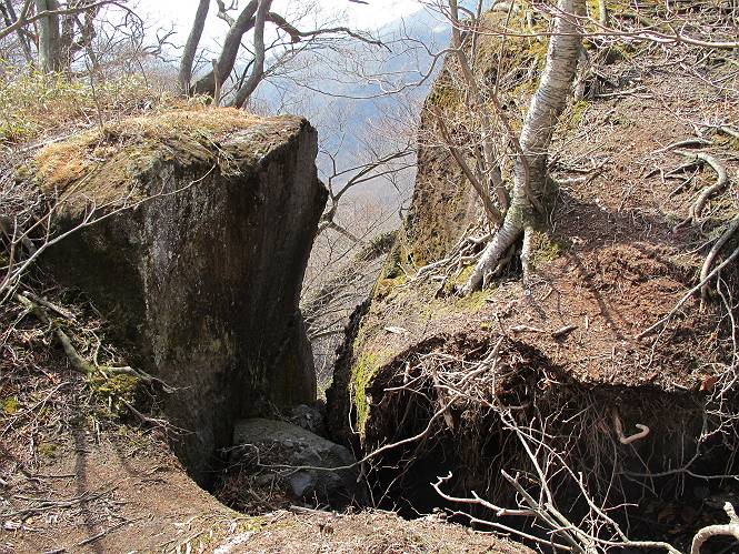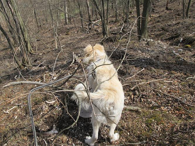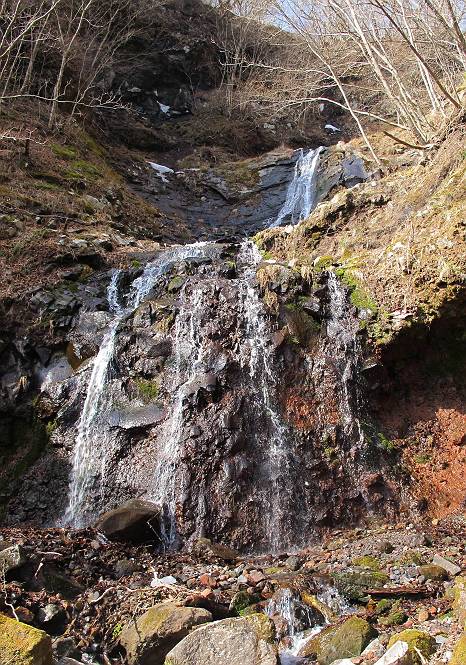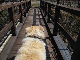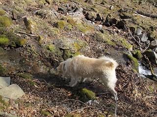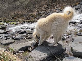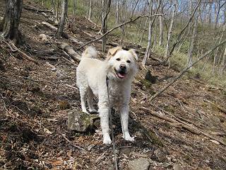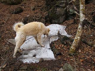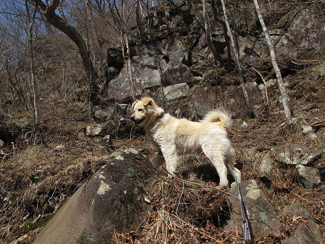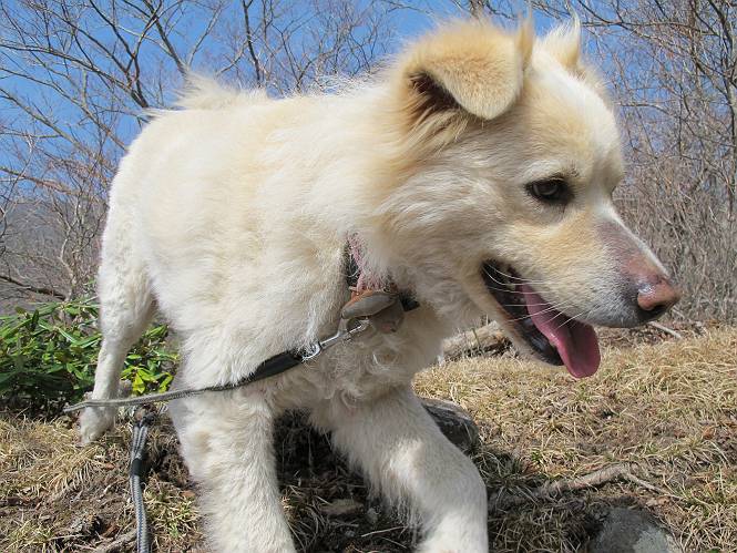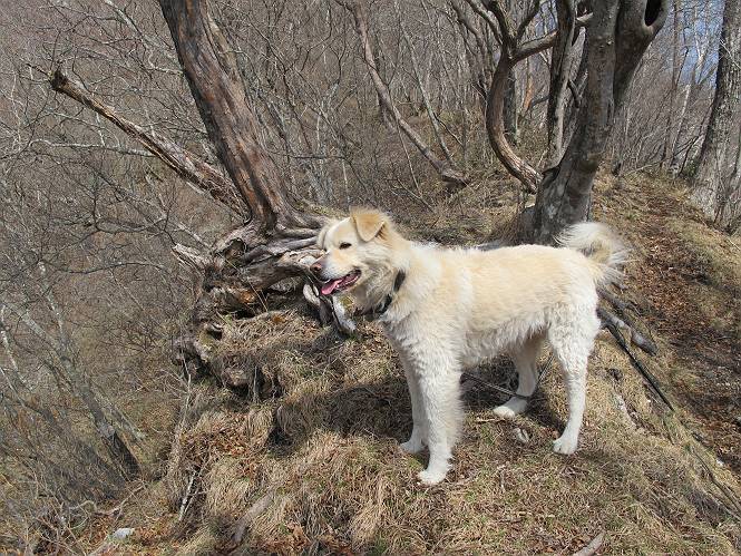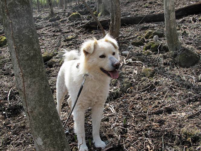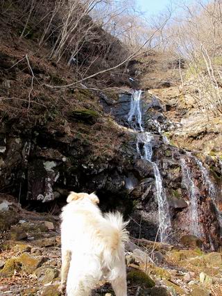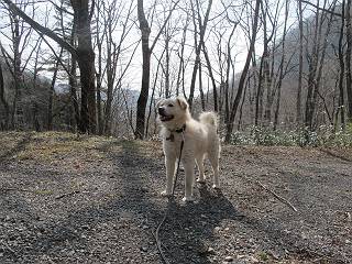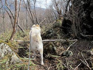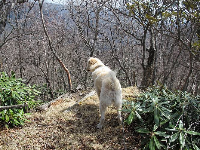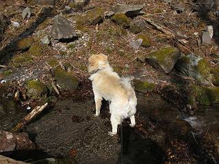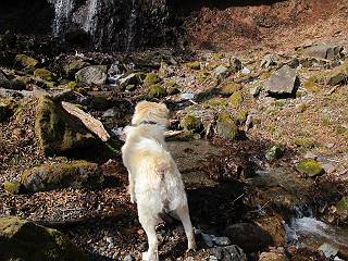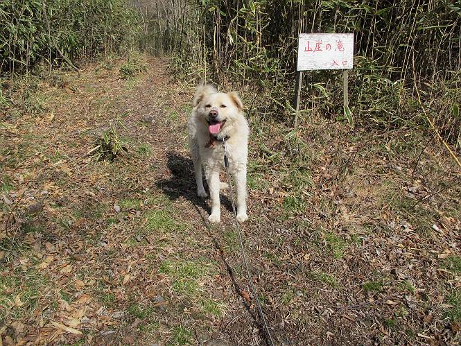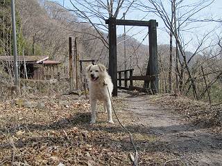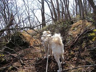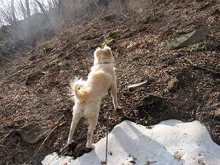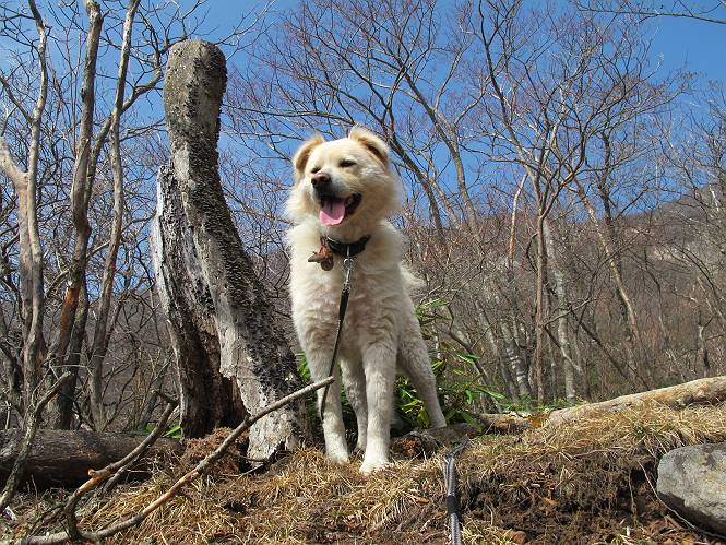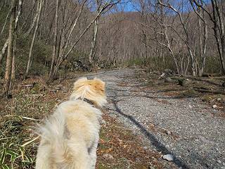 | 平成二十五年四月十六日 Before 写真集目次へ Next 今日は、朝の散歩をやめて、赤城利平茶屋森林公園の遊歩道を一周する陽だまりハイク?に連れてってもらいました。駐車場には、平日で早目だったので、1台も車がありませんでした。 8:00頃の森林公園入口です。 奥の広場から橋を渡ります。 ロープがかけてありましたが、4/30までお休みのようです。 突き当たりに案内板があり、まず、橙色のコースで三階の滝まで行きます、距離は600mだそうです。 作業道をしばらく歩きます、「滝ってあれ?」、 「あれは堰堤だよ」 ここから細い道に変りました、ここには“山崖の滝”と書いてありました。 少し進むと、雪が残ってました、美味しかったですよ。 上も面白そうですね。 沢の中を遊びながら登って行きました。 「あれが、三階の滝?」、 「そうだよ」、 「きれいだね」 三階(山崖)の滝 記念写真を撮ってもらいました。 滝の周りにもアチコチ雪が残ってました、また食べちゃったよ。 ここからは、赤いコース、500mの急坂で、危険な場所もあるそうです、ぼくは初めてです。 上ってきたぞ。 眺めがいいなあ。 「何、これ」、「足元が危険、注意しなさい、ということ」、「そういうことね」 ここはアルミ板と岩の間をゆっくり、お父さんについて、注意しながら歩きました。 ここも狭いので岩に体をピッタリつけて渡りました、お父さんがおさえてくれてたよ。 高くなってきたぞ。 「そっちじゃないぞ」 ちょっと見渡しながら、一歩ずつ歩いてます。 もう少しで、クサリ場が終わるようです。 「まだ、この先に危険な場所が・・・」 「あっ、そう、まだ、あるんだ」 でも、息切れしましたよ。 あっ、あそこかな? ぼくは、こういう場所は得意です、スイスイ渡れるよ。 危険な場所が過ぎて、今度は急斜面です。 でも、爪が引っかかるから歩きやすいです。 おお、ここは、急だなあ。 緑色の葉っぱの木が出てきました、シャクナゲだそうです。 急な道ですが面白いですね。 はぁー、と、もう少しで尾根に出るようです。 緩やかになって、ラクになったと思ったら、 ベンチのあるお休み所に着きました。 次は緑色の600mで尾根道です。 ここで少し休憩ですって。 お父さんは、南の斜面に下りて行って盛んに上を見上げています、何かな? ぼくも行きたいけど、危ないんだって。 尾根伝いに歩いて行くと向こうの方に滝が見えてきました。 この滝も3段になっているとか、大きさはこちらの方がずっと大きいそうです。 尾根歩きって見晴らしは良いし、 上ったり下がったりして楽しいですね。 「こら、駄目だ、飛び出したりして・・・」、「鹿が走っていったんだ、すみません」 深いなあ。 「落ちたら大怪我しちゃうね」、「だから、飛び出たら駄目なんだ」 また、危なそうな場所で写真を撮ってます。 地割れしているんですって、ドカッて崩れたら・・・・・・。 最近強い風が吹いたようで、枝が点々と落ちています、リードが引っかかって、大変です。 東の下降点に着ました、一面笹原です。 ここからは下り750mで広場に戻るそうです。 「また、鹿を見たよ、鹿君と遊びたいなあ」、「吠えたら、逃げちゃうよ」、「そうか、????」 ここからは、林の中を下るだけなんだって、さ。 後に見える山は駒ケ岳だそうです、葉がないから良く見えますね。 おやっ、木も草もないや、 どうしてかな。 あーあ、また引っかかっちゃった、「お父さん、取って」 「あれっ、何?」 「コバイケイソウの芽だよ 」 「あっちにも、こっちにも沢山出てるね。」 一回りして、吊橋に着きました。 沢に沿って、水を飲みながら歩きました。 森林公園に到着です。 陽だまりハイク?、楽しかったでーす。お花はスミレ一花、全然咲いてませんでした。 ほくの鼻、黒いでしょ、毛が抜けちゃったんだよね、また生えてくるでしょう。 車で二ノ鳥居まで走ったら、チョコっとオオヤマザクラが咲き出してました。 Before 写真集目次へ Next |