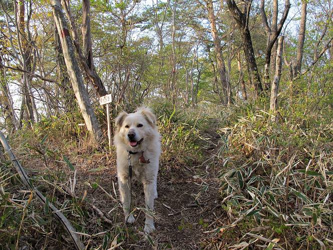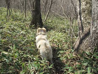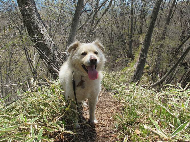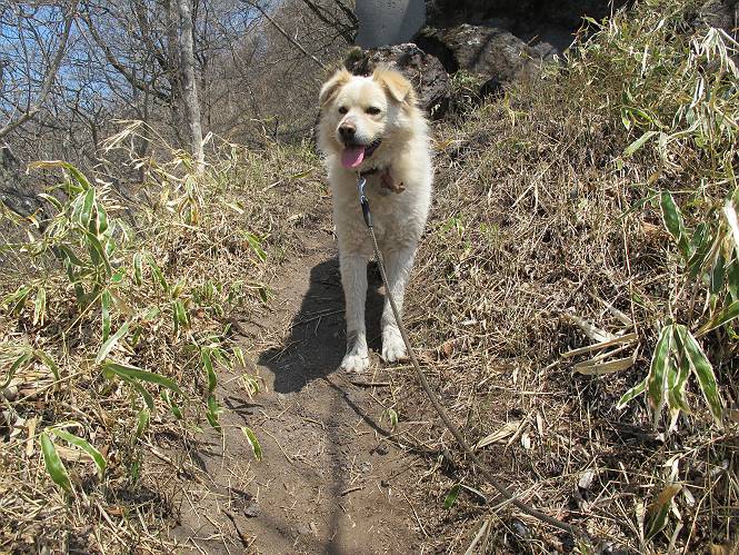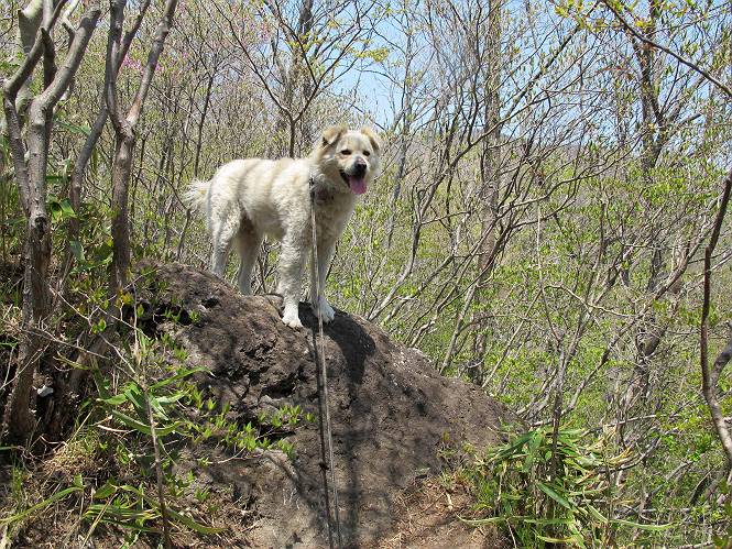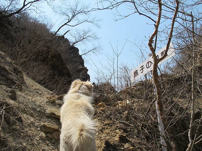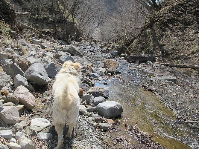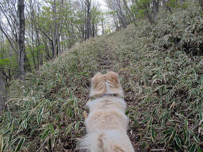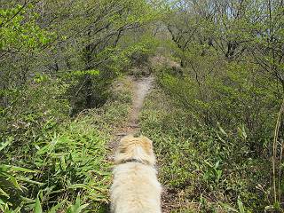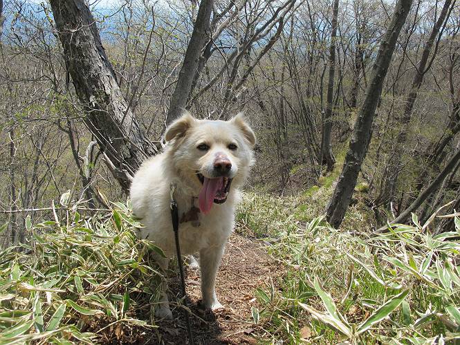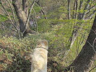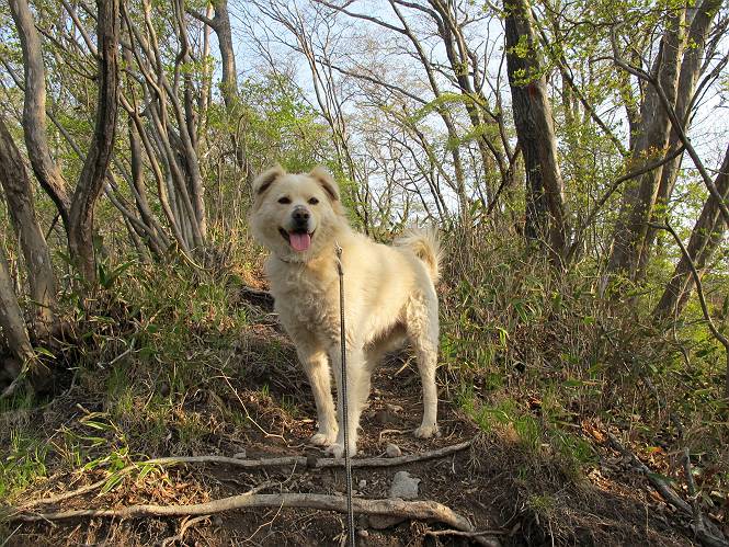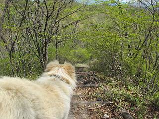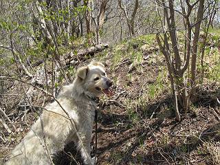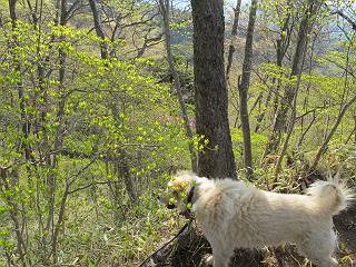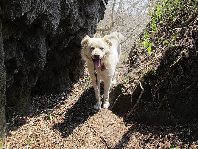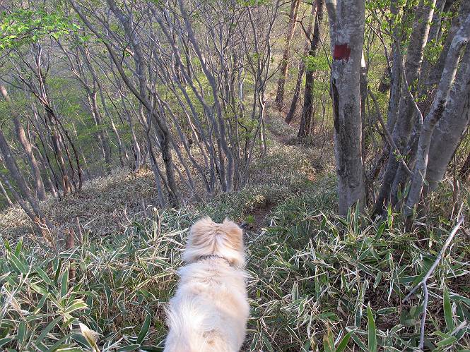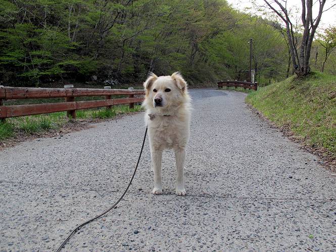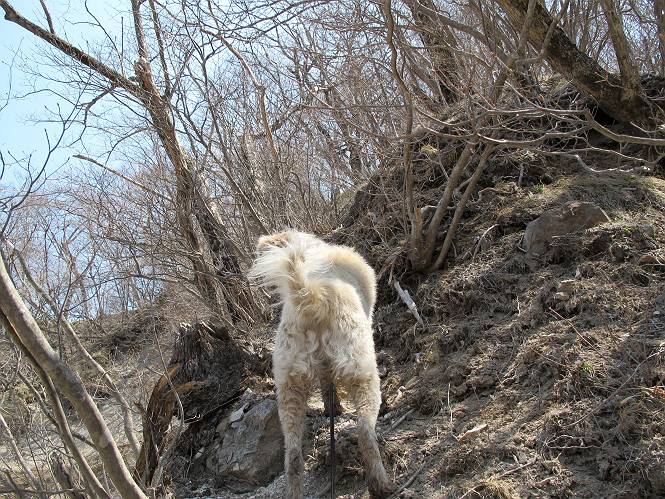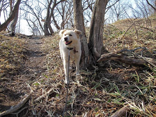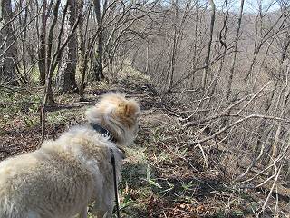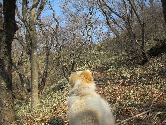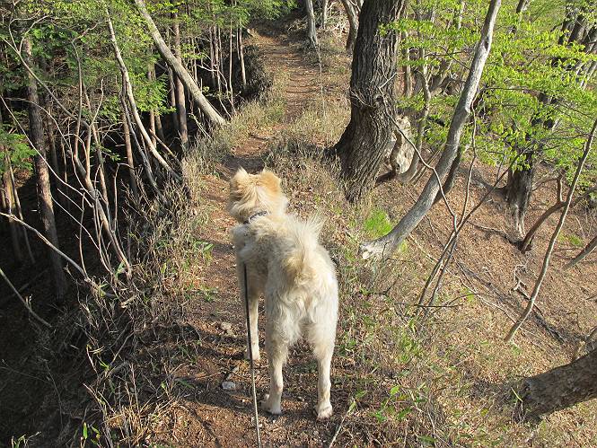 | 平成二十五年五月九日 Before 写真集目次へ Next 朝の散歩は止めて、赤城山の南尾根を一回りしてきました。前橋市粕川地区の大猿(山乃家)から大猿川の東尾根を歩いて茶ノ木畑峠を通って、藪を漕いで長七郎山へ、南へ下ってオトギの森から小滝、粕川を歩いて銚子ノ伽藍へ、粕川の東の尾根に上って、つつじケ峰を下って大猿へ戻りました。 大猿山乃家の駐車場から出発です。 道路を少し戻ると登山口に出ます。 丸太の長い階段をジグザグに進んで尾根に出ます。 尾根を少し進むと梨木方面の案内板がありました。ぼく達は真っ直ぐ尾根伝いに進みます。 ミツバツツジが咲いてました。 北方向には茶ノ木畑峠方面が見えてます。 緩やかな笹尾根をしばらく進みます。 ヤマツツジも咲き出してました。 ミツバツツジも点々と咲いてます。 真っ直ぐな急坂に入りました。 また、少し下ります。 おおっ、キレイ、ミツバツツジ。 ツツジもきれいだけど、 緑もきれいですね。 また、ミツバツツジだ、若葉がなんだか美味しそうだね。 左側が檜の人工林になりました。 ちょっと緑が薄くなってきたようですね。 若葉っていいなあ、つつじが点々と、目立つねぇ。 人工林が終わって、両側とも芽吹きの眩しい林です。 今ねぇ、ニホンカモシカを見つけたんだ、白っぽい色をしてたね、ワンワン吠えちゃったよ。 雨やどり岩ってところに来たよ。上に大きな岩があるんだけど、それかな。 デッカイ木だなあ、ミズナラだってさ、緑がすっかり薄くなったね。 この尾根は急坂が少なく歩きやすいですね。 今度は、岳人岩だってさ。冷たい強い風が吹いてきました、お父さんは一枚着込みました。 岩の間を上っていきます、ちょっと急坂になりましたね。 追分だってさ、梨木と大猿からの尾根が合わさってるそうです。 ここから少し進むと鹿が2頭現れました、それ、行け! リードを抑えられ止められてしまいました。 茶ノ木畑峠が見えてきました。 スゴイ風です、これではおやすみ出来ません、寒いし。 オトギの森分岐点まで下って、風の当たらない場所でおやすみするそうです。 オトギの森分岐点に着ました。雪が点々と残ってます、おいしいなあ。 ちょっとお休みして、笹の藪の中を上ってます。 木にリードが絡んだりしてね、でも面白いね。 結構急斜面でしたが、簡単に抜けられました。 長七郎山の山頂に着きました、西に地蔵岳が見えてます、山頂は寒いです。 お山の大将をしてます、後が黒檜山です。 南側にきましたが、風があります、後ろは荒山です。遠くの山は霞んでいて見えません。 下って、また暖かい場所を見つけてお休みするそうです。 荒山を正面に下ってます、木の陰でちょっとお休みしました。 あっという間に下ってしまいました。 ここが長七郎山の南の登山口です。 ここからは、ぼく、はじめて歩きます。 森の高い木の上に枯れ枝を集めたようなものがあります、熊棚だそうです、熊が出るんですね。 南の方向に進んで、怪しい場所に向かっているようです。 小沼から流れる粕川沿いに進んでいるんだそうです。 崖と崖の間を下ります。 パッと下の方が開けて、荒山が見えました。 水が涸れていますが、小滝だそうです。 崖に沿って細い道を歩いてきました。 「忠治、あまり前に出るなよ」、って言ってます。 ぼく、怖かったです。 またまた、変なところを下って、ジメジメした場所に出ました、直ぐ下には水が湧いてました。 下流に向かって歩いてます、水量はどんどん増えてます。 左が血ノ池、右が歩いてきた粕川で、ここで合流してます。 ![]() 粕川をポチャポチャと遊びながら歩きます。 ここは下が深そうなので大きな岩を回りました。 水量が増えましたね。 もう少しで銚子の伽藍に出るそうです。 またちょっとお遊びタイムです。 銚子の伽藍に出ました。 ここから水が落ちているのですが、怖くて覗けません。 ぼくには無理だねえ、怖いよ。 またまた、怖そうなところを上っていきます。 崖の間に滝を作って一気に水が落ちているんだそうです。 アヤヤヤヤ、?????? どうしよう、大丈夫かな。お父さんにピッタリついて行こう。 危なそうだなあ。 怖い、怖い。 やっと、危険地帯を脱したそうです。 あれだもんね、怪我しなくて良かった。 尾根に出てからは、木々の間を緩やかに進んで、 横引き尾根とつつじケ峰の合流点に出ました。 ぼくのオヤツは全部食べてしまったので、お父さんのお菓子を少しもらいました。 おいしかったです、お水も全部飲んでしまいました。 つつじケ峰をちょっと下ると、 さねすり岩に出ます。 ここは危ないところはないですよ。 この尾根も、この先2,3ヶ所崩れている場所があるようです。 でも、伽藍の怖さはないですよ。 あとは笹の尾根をほとんど、 下るだけだそうです。 時々休みながら下ってます、先ほどおじさんとおばさんに会いました。 こんな感じで、お休みです。 また何かいたぞ、遊びたいなあ。 ミツバツツジを入れて写真を