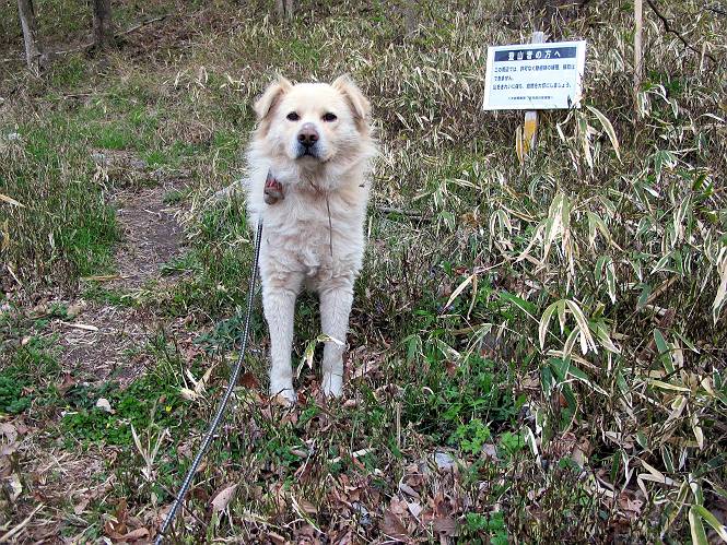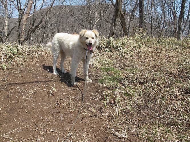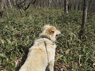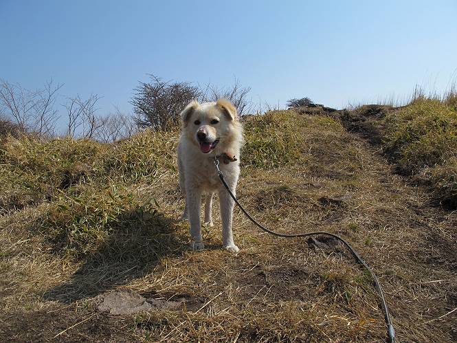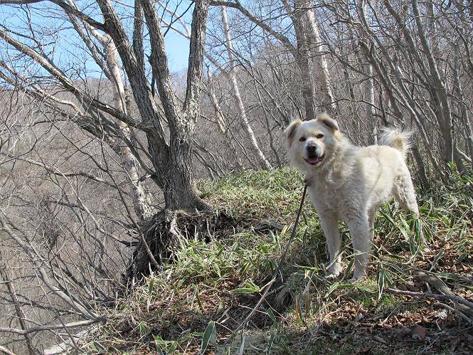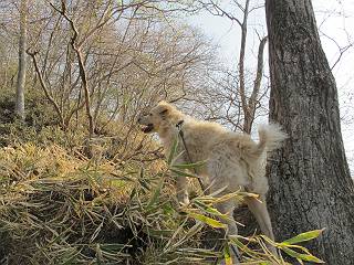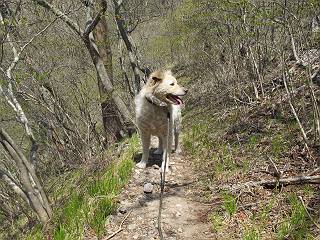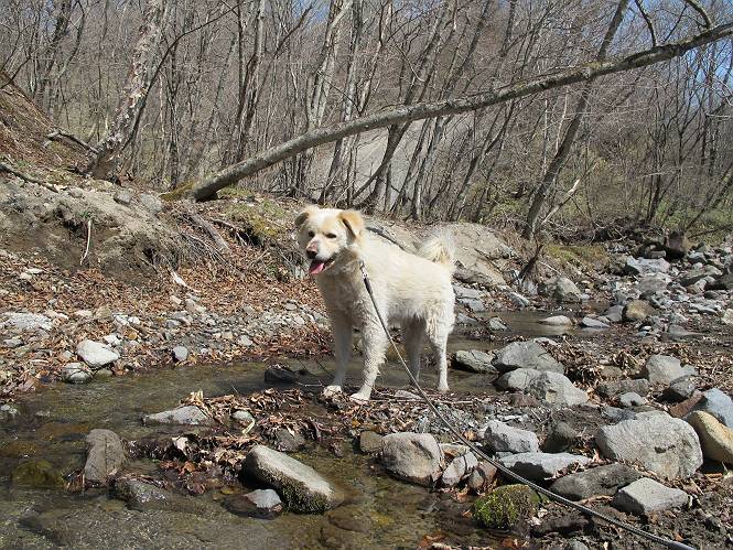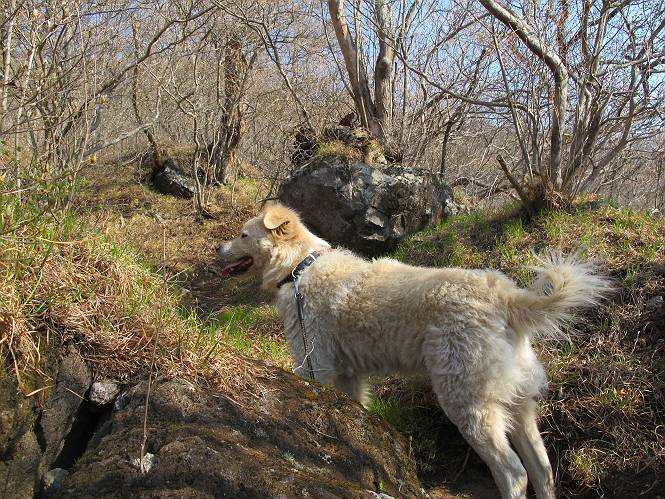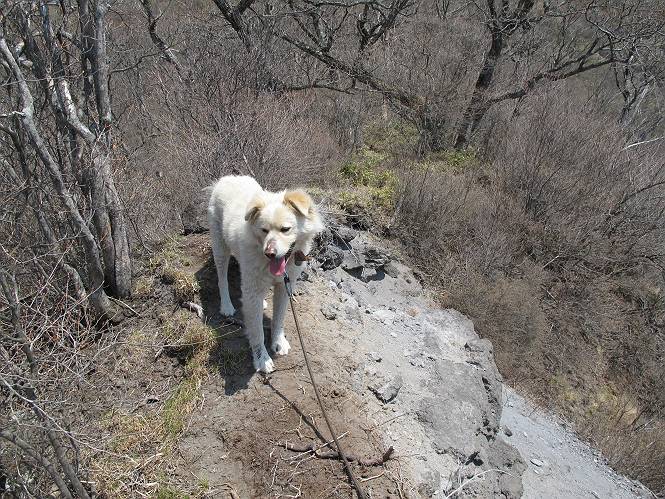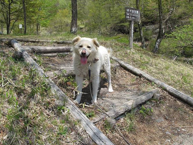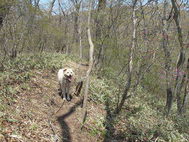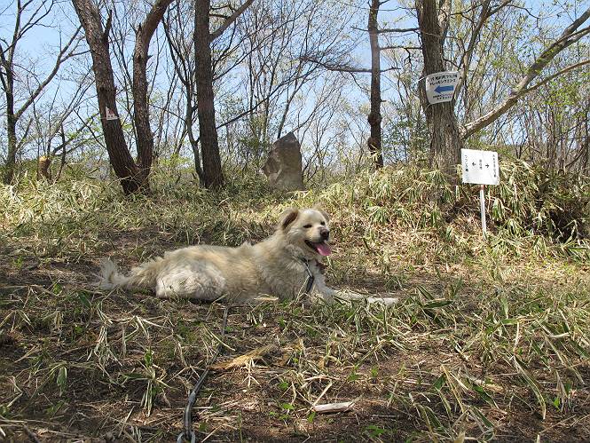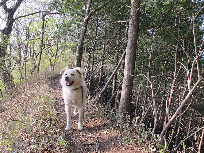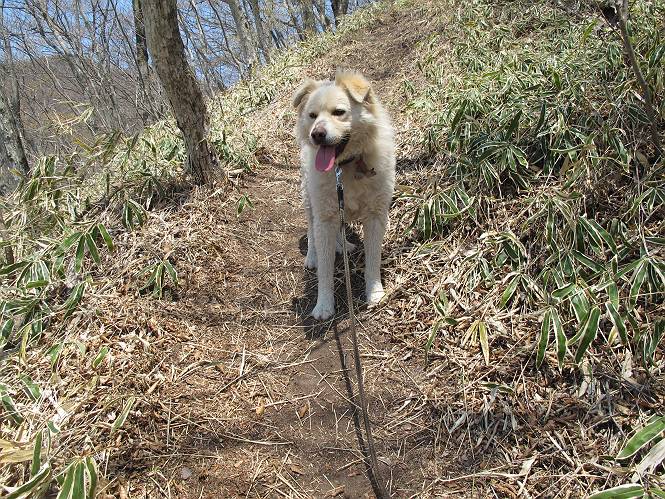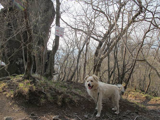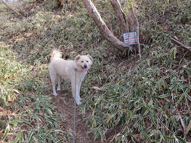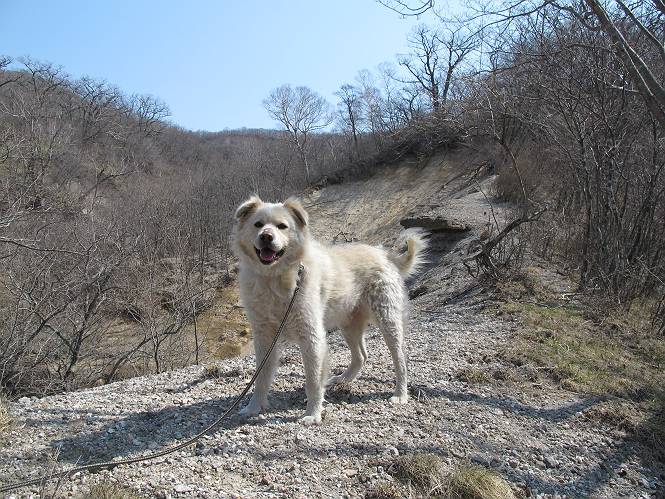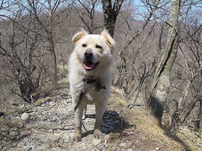 | 平成二十五年五月九日 Before 写真集目次へ Next 朝の散歩は止めて、赤城山の南尾根を一回りしてきました。前橋市粕川地区の大猿(山乃家)から大猿川の東尾根を歩いて茶ノ木畑峠を通って、藪を漕いで長七郎山へ、南へ下ってオトギの森から小滝、粕川を歩いて銚子ノ伽藍へ、粕川の東の尾根に上って、つつじケ峰を下って大猿へ戻りました。 大猿山乃家の駐車場から出発です。 道路を少し戻ると登山口に出ます。 丸太の長い階段をジグザグに進んで尾根に出ます。 尾根を少し進むと梨木方面の案内板がありました。ぼく達は真っ直ぐ尾根伝いに進みます。 ミツバツツジが咲いてました。 北方向には茶ノ木畑峠方面が見えてます。 緩やかな笹尾根をしばらく進みます。 ヤマツツジも咲き出してました。 ミツバツツジも点々と咲いてます。 真っ直ぐな急坂に入りました。 また、少し下ります。 おおっ、キレイ、ミツバツツジ。 ツツジもきれいだけど、 緑もきれいですね。 また、ミツバツツジだ、若葉がなんだか美味しそうだね。 左側が檜の人工林になりました。 ちょっと緑が薄くなってきたようですね。 若葉っていいなあ、つつじが点々と、目立つねぇ。 人工林が終わって、両側とも芽吹きの眩しい林です。 今ねぇ、ニホンカモシカを見つけたんだ、白っぽい色をしてたね、ワンワン吠えちゃったよ。 雨やどり岩ってところに来たよ。上に大きな岩があるんだけど、それかな。 デッカイ木だなあ、ミズナラだってさ、緑がすっかり薄くなったね。 この尾根は急坂が少なく歩きやすいですね。 今度は、岳人岩だってさ。冷たい強い風が吹いてきました、お父さんは一枚着込みました。 岩の間を上っていきます、ちょっと急坂になりましたね。 追分だってさ、梨木と大猿からの尾根が合わさってるそうです。 ここから少し進むと鹿が2頭現れました、それ、行け! リードを抑えられ止められてしまいました。 茶ノ木畑峠が見えてきました。 スゴイ風です、これではおやすみ出来ません、寒いし。 オトギの森分岐点まで下って、風の当たらない場所でおやすみするそうです。 オトギの森分岐点に着ました。雪が点々と残ってます、おいしいなあ。 ちょっとお休みして、笹の藪の中を上ってます。 木にリードが絡んだりしてね、でも面白いね。 結構急斜面でしたが、簡単に抜けられました。 長七郎山の山頂に着きました、西に地蔵岳が見えてます、山頂は寒いです。 お山の大将をしてます、後が黒檜山です。 南側にきましたが、風があります、後ろは荒山です。遠くの山は霞んでいて見えません。 下って、また暖かい場所を見つけてお休みするそうです。 荒山を正面に下ってます、木の陰でちょっとお休みしました。 あっという間に下ってしまいました。 ここが長七郎山の南の登山口です。 ここからは、ぼく、はじめて歩きます。 森の高い木の上に枯れ枝を集めたようなものがあります、熊棚だそうです、熊が出るんですね。 南の方向に進んで、怪しい場所に向かっているようです。 小沼から流れる粕川沿いに進んでいるんだそうです。 崖と崖の間を下ります。 パッと下の方が開けて、荒山が見えました。 水が涸れていますが、小滝だそうです。 崖に沿って細い道を歩いてきました。 「忠治、あまり前に出るなよ」、って言ってます。 ぼく、怖かったです。 またまた、変なところを下って、ジメジメした場所に出ました、直ぐ下には水が湧いてました。 下流に向かって歩いてます、水量はどんどん増えてます。 左が血ノ池、右が歩いてきた粕川で、ここで合流してます。 ![]() 粕川をポチャポチャと遊びながら歩きます。 ここは下が深そうなので大きな岩を回りました。 水量が増えましたね。 もう少しで銚子の伽藍に出るそうです。 またちょっとお遊びタイムです。 銚子の伽藍に出ました。 ここから水が落ちているのですが、怖くて覗けません。 ぼくには無理だねえ、怖いよ。 またまた、怖そうなところを上っていきます。 崖の間に滝を作って一気に水が落ちているんだそうです。 アヤヤヤヤ、?????? どうしよう、大丈夫かな。お父さんにピッタリついて行こう。 危なそうだなあ。 怖い、怖い。 やっと、危険地帯を脱したそうです。 あれだもんね、怪我しなくて良かった。 尾根に出てからは、木々の間を緩やかに進んで、 横引き尾根とつつじケ峰の合流点に出ました。 ぼくのオヤツは全部食べてしまったので、お父さんのお菓子を少しもらいました。 おいしかったです、お水も全部飲んでしまいました。 つつじケ峰をちょっと下ると、 さねすり岩に出ます。 ここは危ないところはないですよ。 この尾根も、この先2,3ヶ所崩れている場所があるようです。 でも、伽藍の怖さはないですよ。 あとは笹の尾根をほとんど、 下るだけだそうです。 時々休みながら下ってます、先ほどおじさんとおばさんに会いました。 こんな感じで、お休みです。 また何かいたぞ、遊びたいなあ。 ミツバツツジを入れて写真を