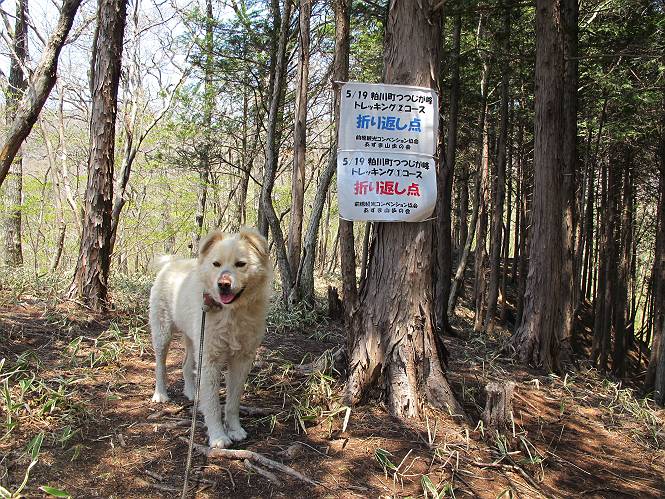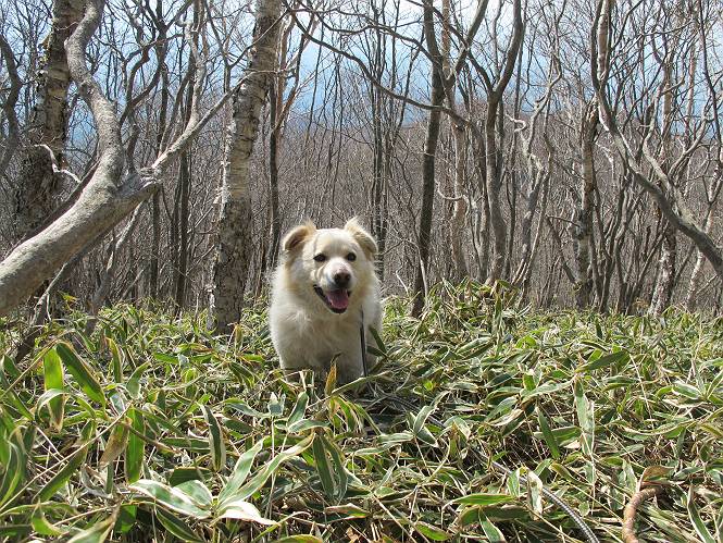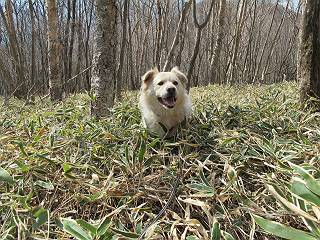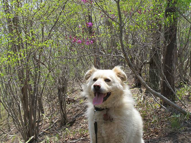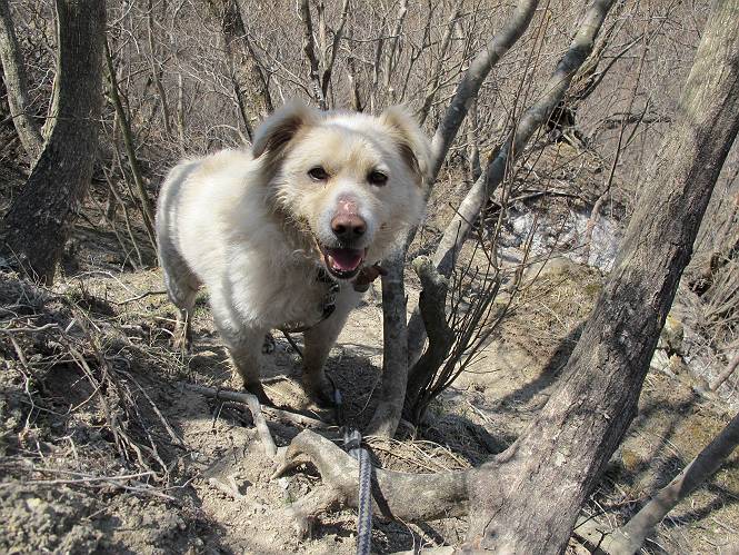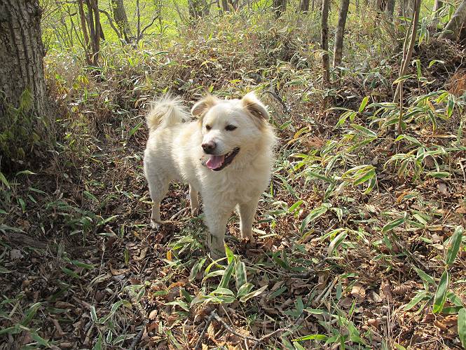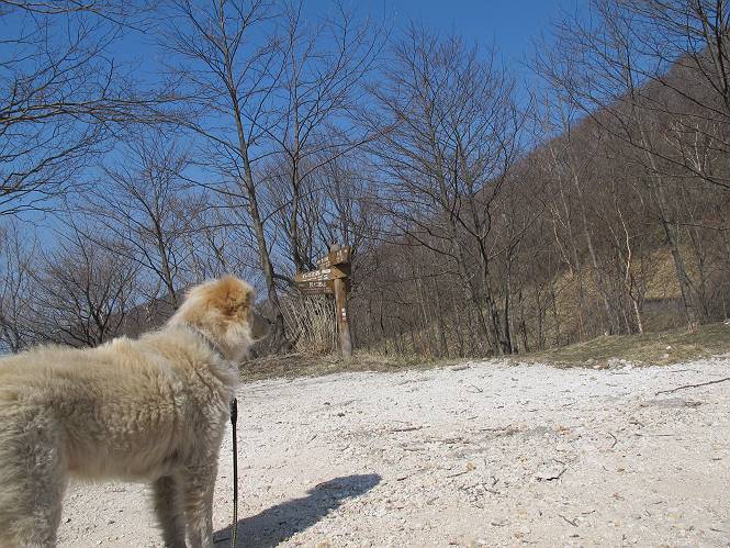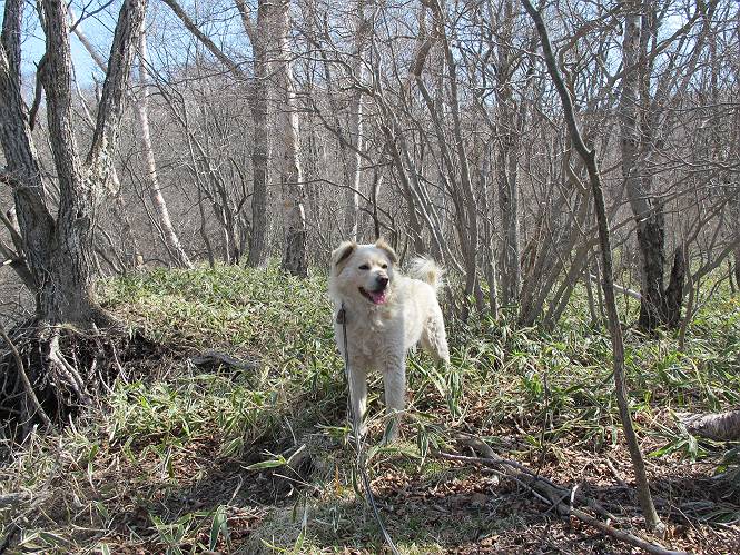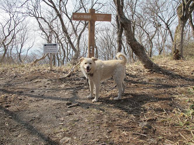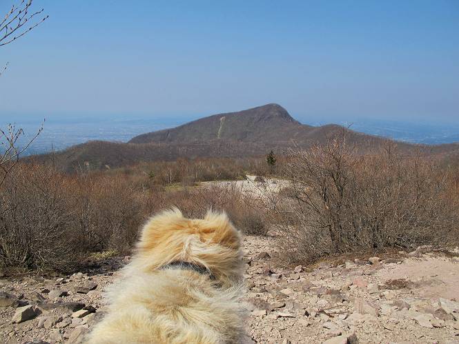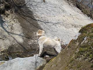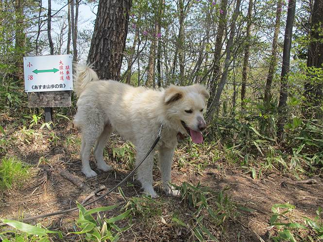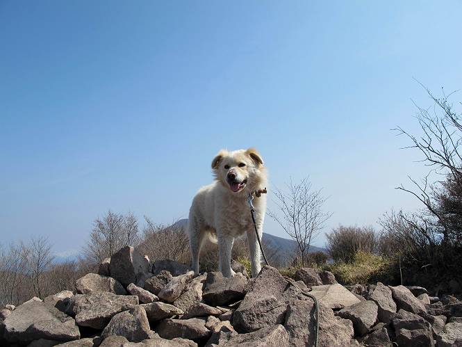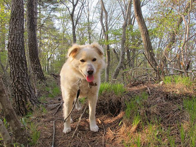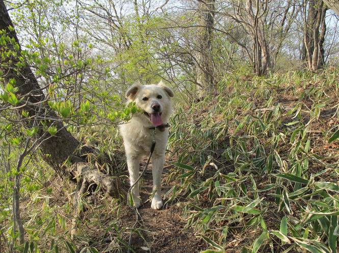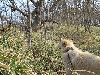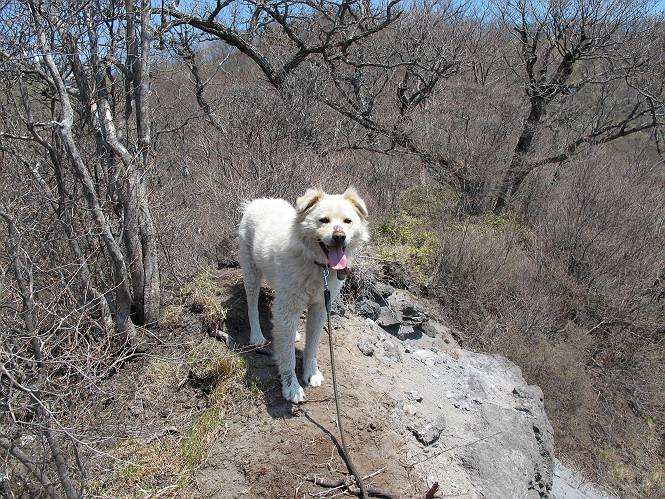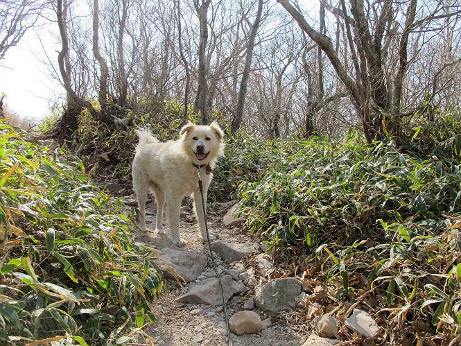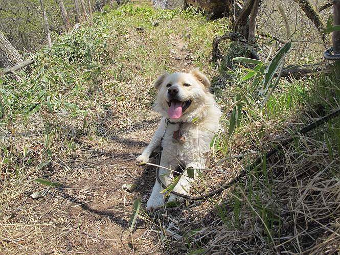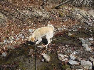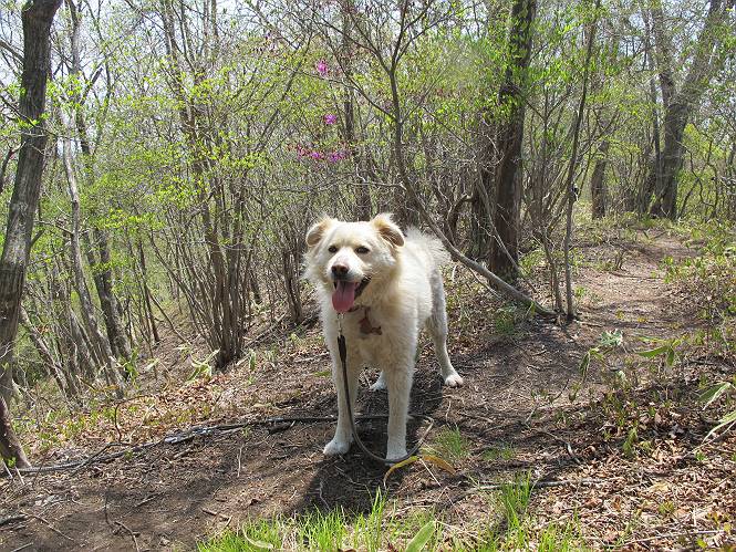 | 平成二十五年五月九日 Before 写真集目次へ Next 朝の散歩は止めて、赤城山の南尾根を一回りしてきました。前橋市粕川地区の大猿(山乃家)から大猿川の東尾根を歩いて茶ノ木畑峠を通って、藪を漕いで長七郎山へ、南へ下ってオトギの森から小滝、粕川を歩いて銚子ノ伽藍へ、粕川の東の尾根に上って、つつじケ峰を下って大猿へ戻りました。 大猿山乃家の駐車場から出発です。 道路を少し戻ると登山口に出ます。 丸太の長い階段をジグザグに進んで尾根に出ます。 尾根を少し進むと梨木方面の案内板がありました。ぼく達は真っ直ぐ尾根伝いに進みます。 ミツバツツジが咲いてました。 北方向には茶ノ木畑峠方面が見えてます。 緩やかな笹尾根をしばらく進みます。 ヤマツツジも咲き出してました。 ミツバツツジも点々と咲いてます。 真っ直ぐな急坂に入りました。 また、少し下ります。 おおっ、キレイ、ミツバツツジ。 ツツジもきれいだけど、 緑もきれいですね。 また、ミツバツツジだ、若葉がなんだか美味しそうだね。 左側が檜の人工林になりました。 ちょっと緑が薄くなってきたようですね。 若葉っていいなあ、つつじが点々と、目立つねぇ。 人工林が終わって、両側とも芽吹きの眩しい林です。 今ねぇ、ニホンカモシカを見つけたんだ、白っぽい色をしてたね、ワンワン吠えちゃったよ。 雨やどり岩ってところに来たよ。上に大きな岩があるんだけど、それかな。 デッカイ木だなあ、ミズナラだってさ、緑がすっかり薄くなったね。 この尾根は急坂が少なく歩きやすいですね。 今度は、岳人岩だってさ。冷たい強い風が吹いてきました、お父さんは一枚着込みました。 岩の間を上っていきます、ちょっと急坂になりましたね。 追分だってさ、梨木と大猿からの尾根が合わさってるそうです。 ここから少し進むと鹿が2頭現れました、それ、行け! リードを抑えられ止められてしまいました。 茶ノ木畑峠が見えてきました。 スゴイ風です、これではおやすみ出来ません、寒いし。 オトギの森分岐点まで下って、風の当たらない場所でおやすみするそうです。 オトギの森分岐点に着ました。雪が点々と残ってます、おいしいなあ。 ちょっとお休みして、笹の藪の中を上ってます。 木にリードが絡んだりしてね、でも面白いね。 結構急斜面でしたが、簡単に抜けられました。 長七郎山の山頂に着きました、西に地蔵岳が見えてます、山頂は寒いです。 お山の大将をしてます、後が黒檜山です。 南側にきましたが、風があります、後ろは荒山です。遠くの山は霞んでいて見えません。 下って、また暖かい場所を見つけてお休みするそうです。 荒山を正面に下ってます、木の陰でちょっとお休みしました。 あっという間に下ってしまいました。 ここが長七郎山の南の登山口です。 ここからは、ぼく、はじめて歩きます。 森の高い木の上に枯れ枝を集めたようなものがあります、熊棚だそうです、熊が出るんですね。 南の方向に進んで、怪しい場所に向かっているようです。 小沼から流れる粕川沿いに進んでいるんだそうです。 崖と崖の間を下ります。 パッと下の方が開けて、荒山が見えました。 水が涸れていますが、小滝だそうです。 崖に沿って細い道を歩いてきました。 「忠治、あまり前に出るなよ」、って言ってます。 ぼく、怖かったです。 またまた、変なところを下って、ジメジメした場所に出ました、直ぐ下には水が湧いてました。 下流に向かって歩いてます、水量はどんどん増えてます。 左が血ノ池、右が歩いてきた粕川で、ここで合流してます。 ![]() 粕川をポチャポチャと遊びながら歩きます。 ここは下が深そうなので大きな岩を回りました。 水量が増えましたね。 もう少しで銚子の伽藍に出るそうです。 またちょっとお遊びタイムです。 銚子の伽藍に出ました。 ここから水が落ちているのですが、怖くて覗けません。 ぼくには無理だねえ、怖いよ。 またまた、怖そうなところを上っていきます。 崖の間に滝を作って一気に水が落ちているんだそうです。 アヤヤヤヤ、?????? どうしよう、大丈夫かな。お父さんにピッタリついて行こう。 危なそうだなあ。 怖い、怖い。 やっと、危険地帯を脱したそうです。 あれだもんね、怪我しなくて良かった。 尾根に出てからは、木々の間を緩やかに進んで、 横引き尾根とつつじケ峰の合流点に出ました。 ぼくのオヤツは全部食べてしまったので、お父さんのお菓子を少しもらいました。 おいしかったです、お水も全部飲んでしまいました。 つつじケ峰をちょっと下ると、 さねすり岩に出ます。 ここは危ないところはないですよ。 この尾根も、この先2,3ヶ所崩れている場所があるようです。 でも、伽藍の怖さはないですよ。 あとは笹の尾根をほとんど、 下るだけだそうです。 時々休みながら下ってます、先ほどおじさんとおばさんに会いました。 こんな感じで、お休みです。 また何かいたぞ、遊びたいなあ。 ミツバツツジを入れて写真を