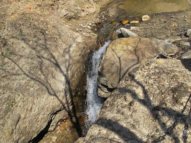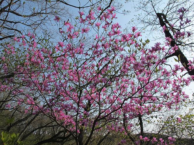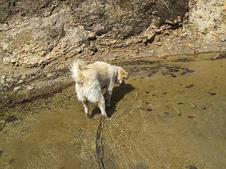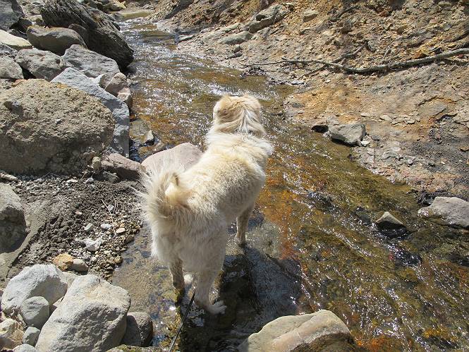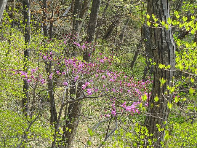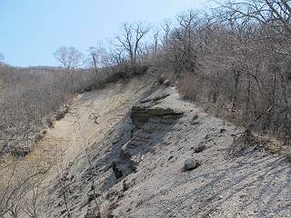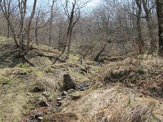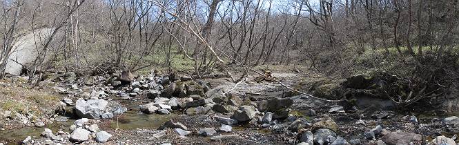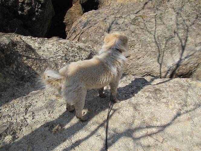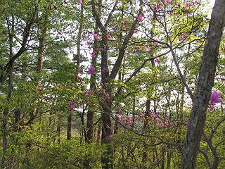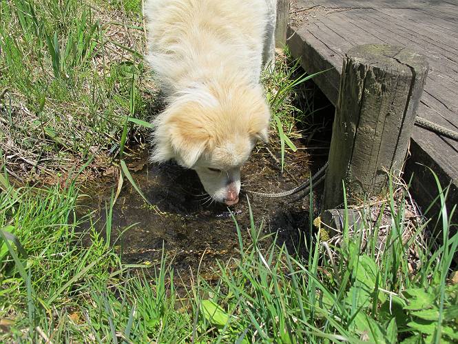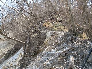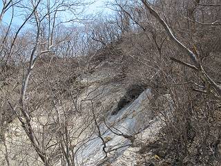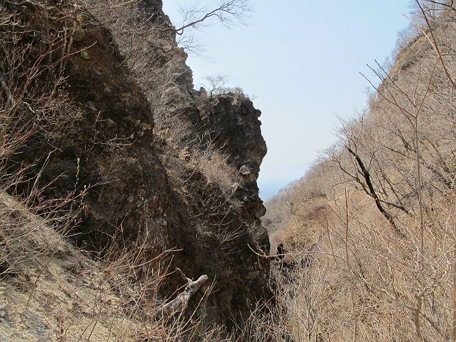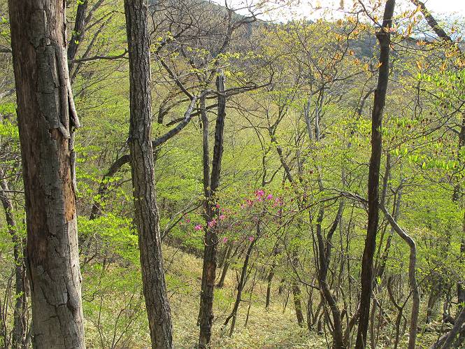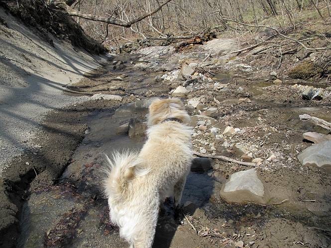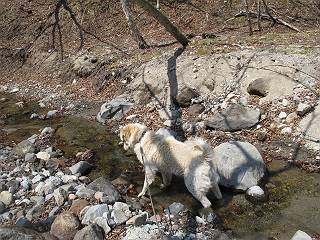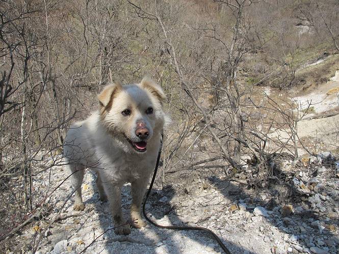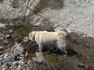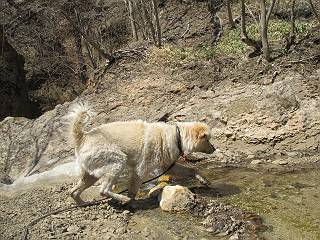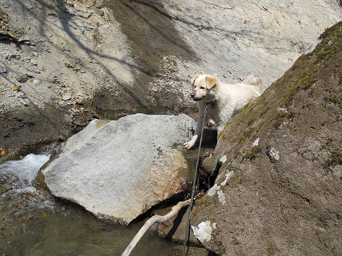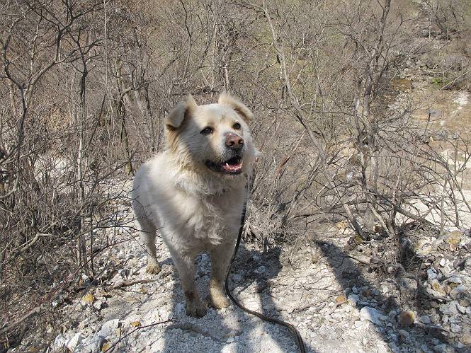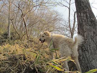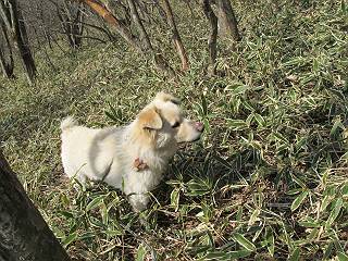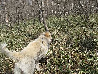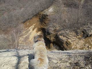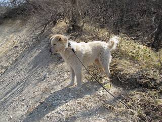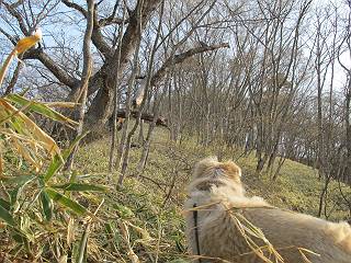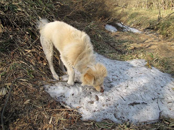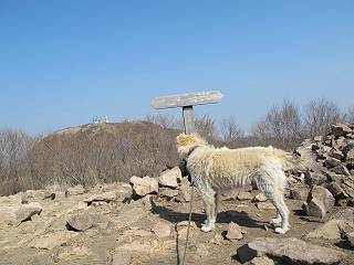 | 平成二十五年五月九日 Before 写真集目次へ Next 朝の散歩は止めて、赤城山の南尾根を一回りしてきました。前橋市粕川地区の大猿(山乃家)から大猿川の東尾根を歩いて茶ノ木畑峠を通って、藪を漕いで長七郎山へ、南へ下ってオトギの森から小滝、粕川を歩いて銚子ノ伽藍へ、粕川の東の尾根に上って、つつじケ峰を下って大猿へ戻りました。 大猿山乃家の駐車場から出発です。 道路を少し戻ると登山口に出ます。 丸太の長い階段をジグザグに進んで尾根に出ます。 尾根を少し進むと梨木方面の案内板がありました。ぼく達は真っ直ぐ尾根伝いに進みます。 ミツバツツジが咲いてました。 北方向には茶ノ木畑峠方面が見えてます。 緩やかな笹尾根をしばらく進みます。 ヤマツツジも咲き出してました。 ミツバツツジも点々と咲いてます。 真っ直ぐな急坂に入りました。 また、少し下ります。 おおっ、キレイ、ミツバツツジ。 ツツジもきれいだけど、 緑もきれいですね。 また、ミツバツツジだ、若葉がなんだか美味しそうだね。 左側が檜の人工林になりました。 ちょっと緑が薄くなってきたようですね。 若葉っていいなあ、つつじが点々と、目立つねぇ。 人工林が終わって、両側とも芽吹きの眩しい林です。 今ねぇ、ニホンカモシカを見つけたんだ、白っぽい色をしてたね、ワンワン吠えちゃったよ。 雨やどり岩ってところに来たよ。上に大きな岩があるんだけど、それかな。 デッカイ木だなあ、ミズナラだってさ、緑がすっかり薄くなったね。 この尾根は急坂が少なく歩きやすいですね。 今度は、岳人岩だってさ。冷たい強い風が吹いてきました、お父さんは一枚着込みました。 岩の間を上っていきます、ちょっと急坂になりましたね。 追分だってさ、梨木と大猿からの尾根が合わさってるそうです。 ここから少し進むと鹿が2頭現れました、それ、行け! リードを抑えられ止められてしまいました。 茶ノ木畑峠が見えてきました。 スゴイ風です、これではおやすみ出来ません、寒いし。 オトギの森分岐点まで下って、風の当たらない場所でおやすみするそうです。 オトギの森分岐点に着ました。雪が点々と残ってます、おいしいなあ。 ちょっとお休みして、笹の藪の中を上ってます。 木にリードが絡んだりしてね、でも面白いね。 結構急斜面でしたが、簡単に抜けられました。 長七郎山の山頂に着きました、西に地蔵岳が見えてます、山頂は寒いです。 お山の大将をしてます、後が黒檜山です。 南側にきましたが、風があります、後ろは荒山です。遠くの山は霞んでいて見えません。 下って、また暖かい場所を見つけてお休みするそうです。 荒山を正面に下ってます、木の陰でちょっとお休みしました。 あっという間に下ってしまいました。 ここが長七郎山の南の登山口です。 ここからは、ぼく、はじめて歩きます。 森の高い木の上に枯れ枝を集めたようなものがあります、熊棚だそうです、熊が出るんですね。 南の方向に進んで、怪しい場所に向かっているようです。 小沼から流れる粕川沿いに進んでいるんだそうです。 崖と崖の間を下ります。 パッと下の方が開けて、荒山が見えました。 水が涸れていますが、小滝だそうです。 崖に沿って細い道を歩いてきました。 「忠治、あまり前に出るなよ」、って言ってます。 ぼく、怖かったです。 またまた、変なところを下って、ジメジメした場所に出ました、直ぐ下には水が湧いてました。 下流に向かって歩いてます、水量はどんどん増えてます。 左が血ノ池、右が歩いてきた粕川で、ここで合流してます。 ![]() 粕川をポチャポチャと遊びながら歩きます。 ここは下が深そうなので大きな岩を回りました。 水量が増えましたね。 もう少しで銚子の伽藍に出るそうです。 またちょっとお遊びタイムです。 銚子の伽藍に出ました。 ここから水が落ちているのですが、怖くて覗けません。 ぼくには無理だねえ、怖いよ。 またまた、怖そうなところを上っていきます。 崖の間に滝を作って一気に水が落ちているんだそうです。 アヤヤヤヤ、?????? どうしよう、大丈夫かな。お父さんにピッタリついて行こう。 危なそうだなあ。 怖い、怖い。 やっと、危険地帯を脱したそうです。 あれだもんね、怪我しなくて良かった。 尾根に出てからは、木々の間を緩やかに進んで、 横引き尾根とつつじケ峰の合流点に出ました。 ぼくのオヤツは全部食べてしまったので、お父さんのお菓子を少しもらいました。 おいしかったです、お水も全部飲んでしまいました。 つつじケ峰をちょっと下ると、 さねすり岩に出ます。 ここは危ないところはないですよ。 この尾根も、この先2,3ヶ所崩れている場所があるようです。 でも、伽藍の怖さはないですよ。 あとは笹の尾根をほとんど、 下るだけだそうです。 時々休みながら下ってます、先ほどおじさんとおばさんに会いました。 こんな感じで、お休みです。 また何かいたぞ、遊びたいなあ。 ミツバツツジを入れて写真を