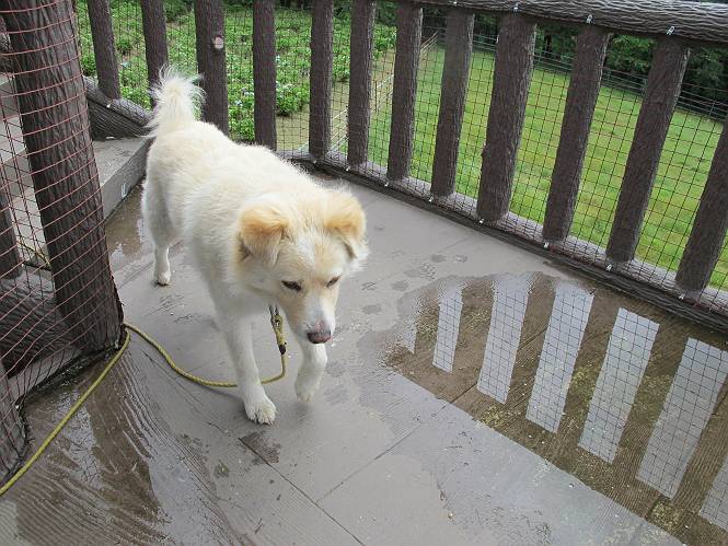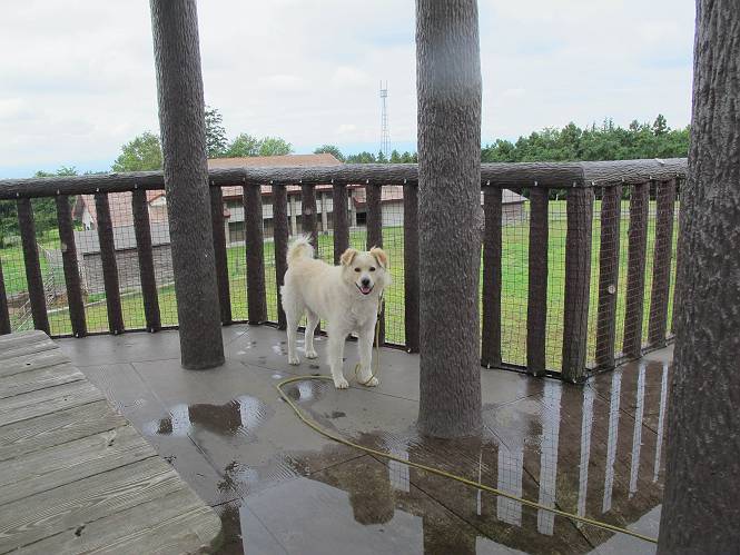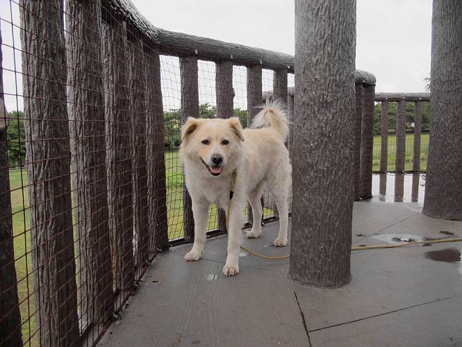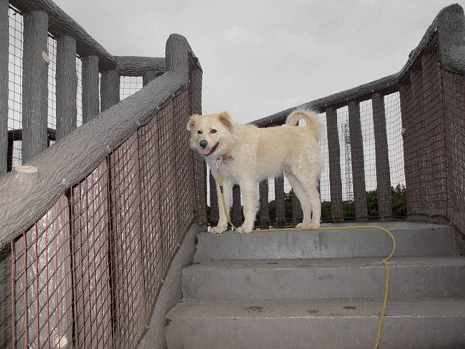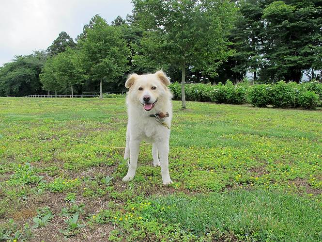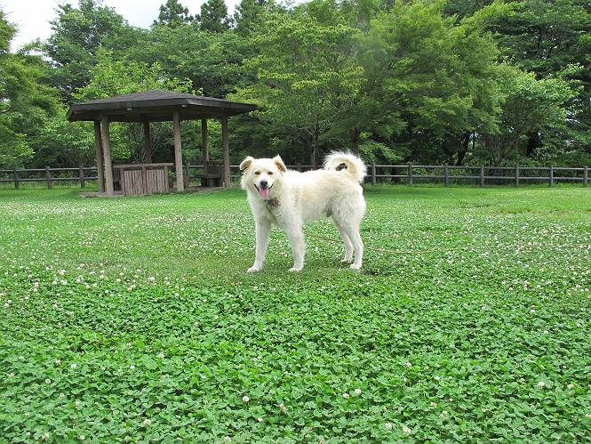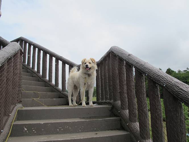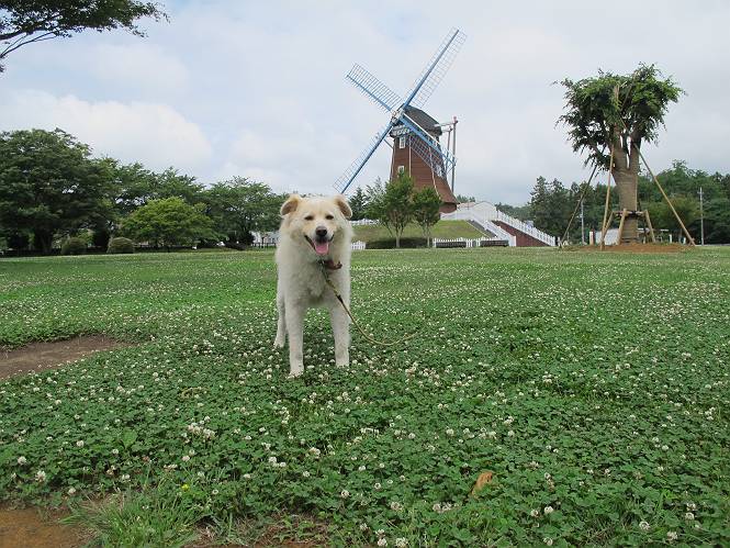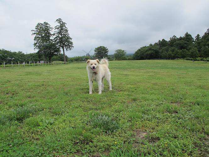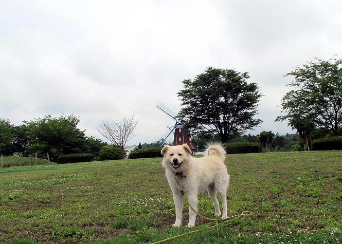 | 平成二十五年六月十四日 Before 写真集目次へ Next やだねぇ、雨が降ったりやんだり、でもの、薄日が時々差してるんですよ。赤城南面の道の駅、ぐりーんふらわー牧場・大胡にやってきました。お母さんが“さんぽ道”でお買い物をしている間、隣の牧場の中を散歩してます。この辺から赤城の鍋割山がきれいに見えるんですが、今日は雲の中です。 草は露をタップリ含んでビショビショです。真ん中にシャクヤクが沢山植えてあるのですが、もう花が終わってしまって、管理のおじさんたちが草刈をしています。後のアジサイはこれからですね。 いつもここに来ると、展望台に上って、景色を眺めるのですが、 ここは展望台の中間です。 いちばん上にやってきました、誰もいません。景色も、牛さんも見えないなあ。 風車の辺で散歩している人は2,3人見えます。 あーあ、残念でした。乾いた所にいっぱいぼくの足跡をつけちゃったね。 草の中を走り回って遊んでました、「そろそろお母さんのお買い物の終わる頃かな」、と言ってます。 公園内の道の北側にやってきました。白い花が沢山咲いてますね、シロツメグサでしょうか? シロツメグサと風車、青空が少し見えてきました。帰り道、どこかで、また、遊べるかな・・・・・・。 Before 写真集目次へ Next |