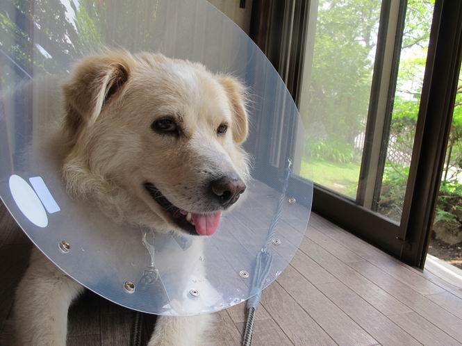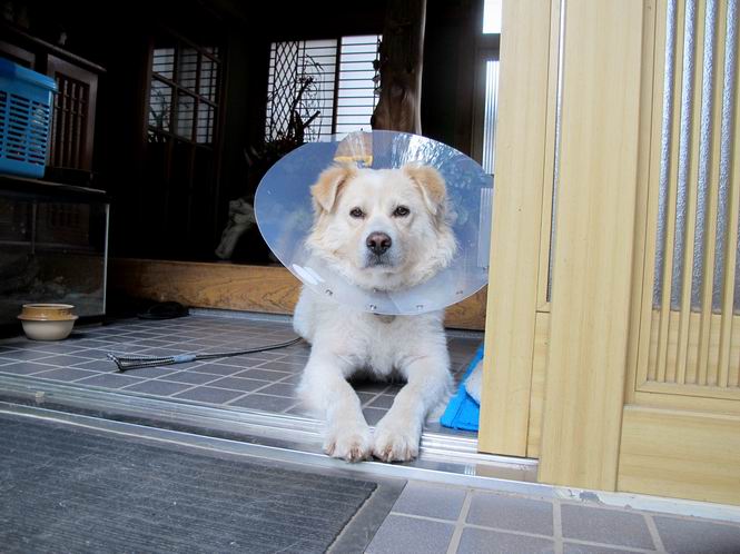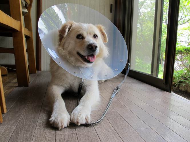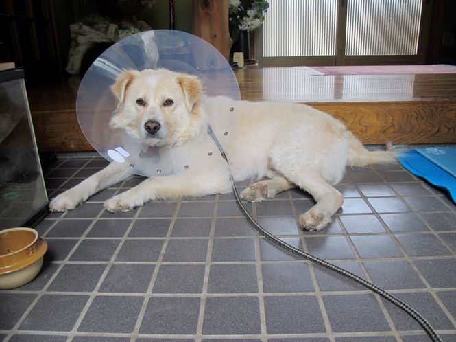 | 平成二十五年六月二十九日 Before 写真集目次へ Next ぼく、こんなものつけられちゃったんです。なぜかというと、下腹部に黒いカサプタが沢山出来ちゃって、かいたり、なめたりするものですから、薬がきかない、ってわけ。そこで、今日はシャンプーして、薬をぬって、エリザベスカラーを首につけられてしまいました。前回、ほとんど治ったのですが、また出来ちゃったんですよ。 歩くとぶつかってガサガサ、バリバリ音がしたり、水飲み場、食器を高くしてもらったり、邪魔ですけどしかたないよね。 でもね、散歩の時は外してもらいました。軟らかいので伏せもできるし、アゴも床につけられんですよ。 5日ほどの辛抱ですって、さ。頑張るぞ! Before 写真集目次へ Next |