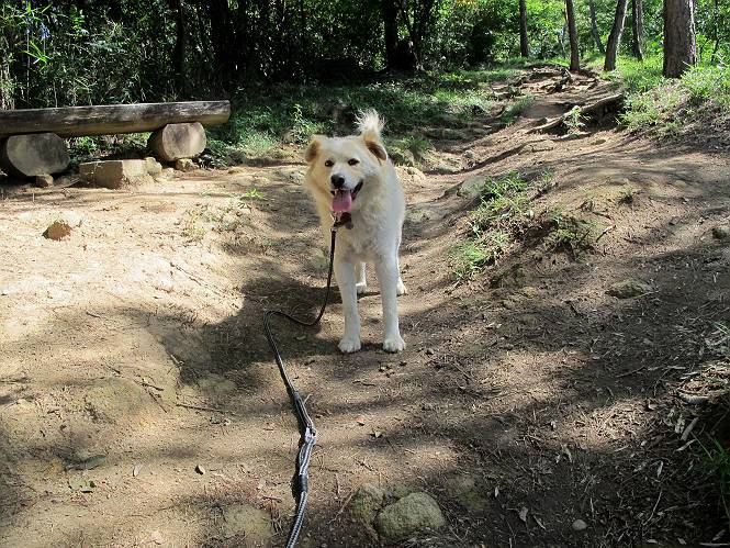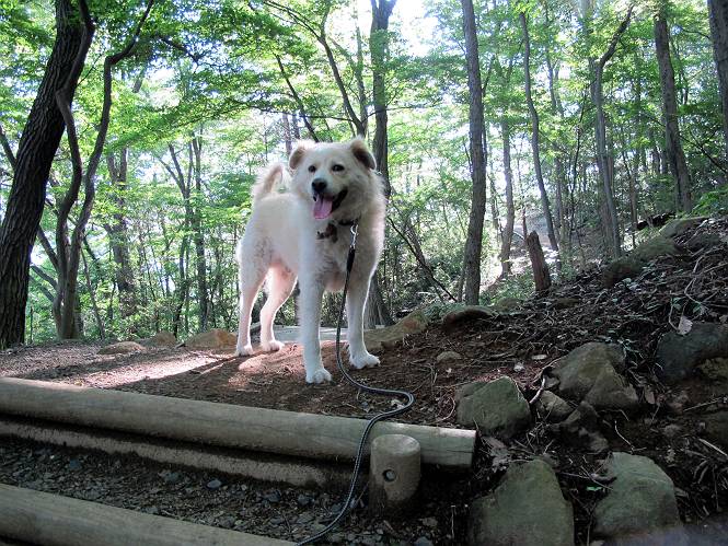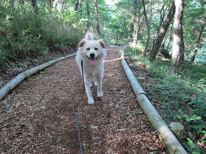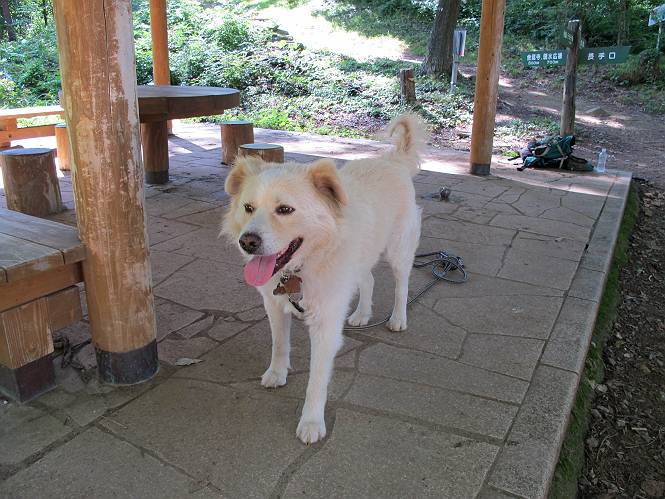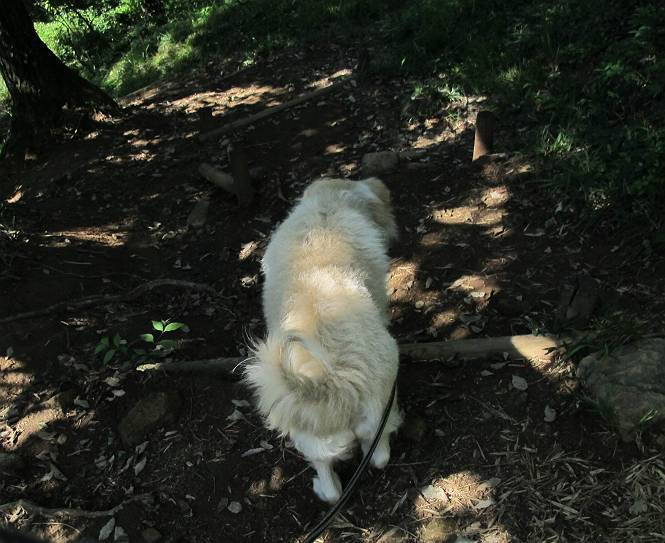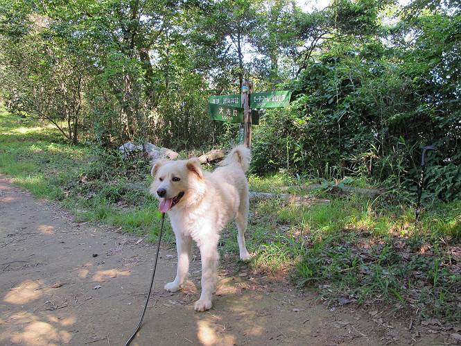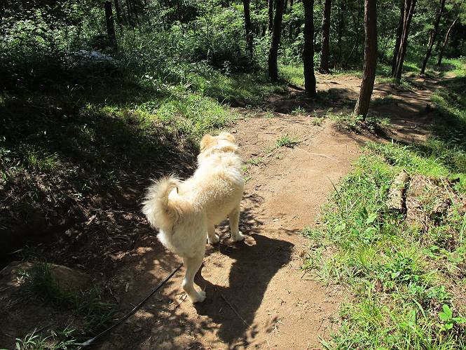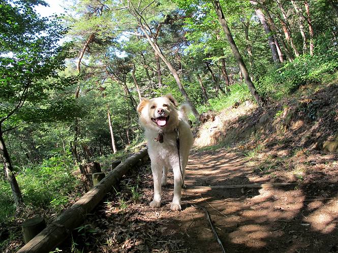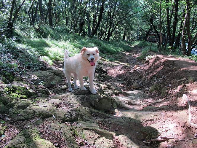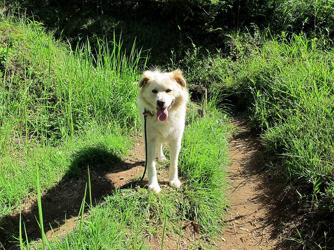 | 平成二十五年七月十九日 Before 写真集目次へ Next お父さんの予定していた山行が延期になったので、近くの金山へ朝の涼しいうちに連れてってもらいました。親水公園、金山山頂新田神社、大光院と一回りしてきました。途中暑くてバテバテになってしまいましたが、木陰は風があって涼しくて気持ちよかったです。 親水公園の駐車場から出発して、御城橋へ進んでます。赤松の林がきれいです。 東側から北側に回り込んで御城橋に出ました。 御城橋を渡ってます、橋の下は道路です。 金山のハイキングコースに入りました、オガクズで固めた道でフワフワして気持ちよく歩けます。 古い登山道に出ました、丸くなった岩が連続してます、ここも歩き易いです。 南から回り込んで山頂の南の鳥居に出ました。 水道でお水を飲んで、山頂の一番奥にある新田神社に着きました。 日の当たらない場所でお休みしてます。 この鳥居、大きいでしょう。左右に狛犬さんがいるんだよ。 山頂から南側のハイキングコースを歩いてます。 下は道路です。 木陰は涼しいですよ。 ヤマユリが点々と咲いてました。 きれいですね、でもここは暑いなあ。 大光院の分岐点に着きました、いつも長手の浅間神社へ進んでますが今日は大光院です。 暑いですが、下りですからラクチンです。 丸太の階段も少しありました。 大きな東屋にやってきました、お休みです。 ここは広々していて、風も抜けてさわやかです。 まわりにギボウシやアザミの花が咲いてました。 少し登って下ると大光院の分岐点です、左に曲ります。 お父さんはぼくが入れるか案内板を見てました、入れるようです。 大光院の裏に着きました、お父さんはまた張り紙など見てました。 大光院に着きました、大きな本堂ですね。 大きな松の横を通り、駐車場に出ましたら、「ペット・・・・」の看板がありました。 工場の脇を通って赤松の林の中に入りました。 赤松も大分少なくなってしまったようですが、沢山苗が植えられてました。 親水公園に着きました、お水で遊んでます。 家に戻ったら、お父さんのお友達がいて、岩魚をいっぱい頂きました。早速カラアゲにしてもらって、ぼくも美味しく頂きました。 スゴイ量だなあ、28匹も頂いたんだってさ。 美味しそうだなあ、あまりあるので怖いなあ。 ぼくは小さいのを一匹頂きました。 美味しかったでーす、また後で頂きます。 Before 写真集目次へ Next |