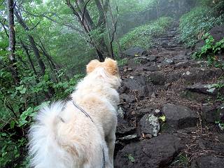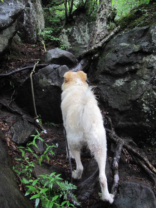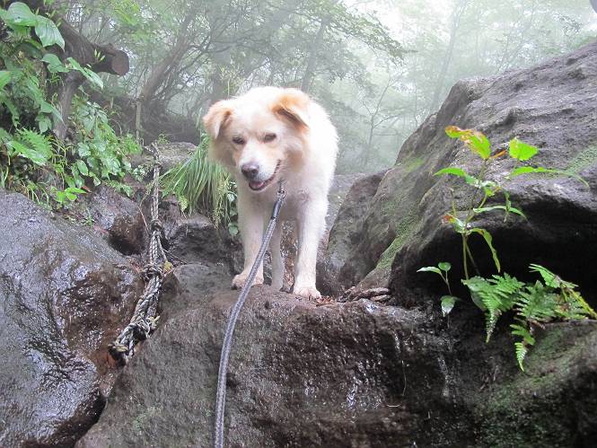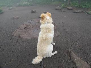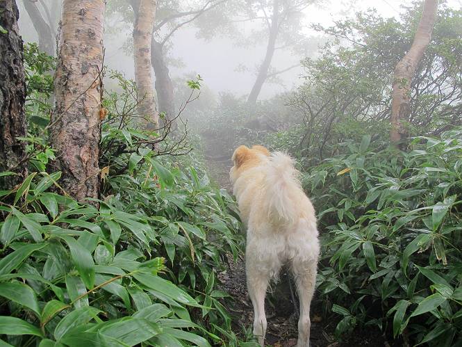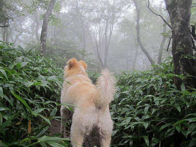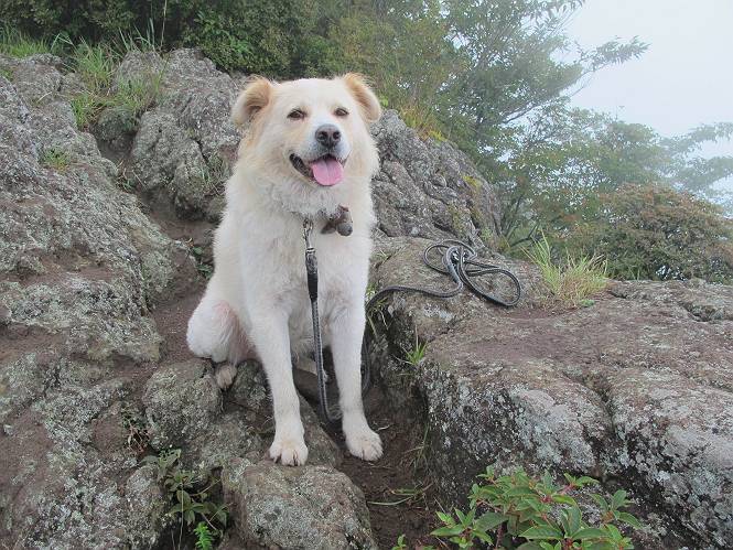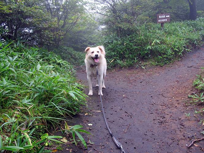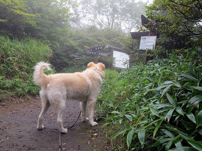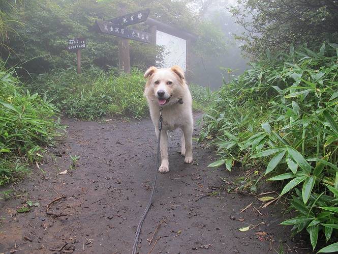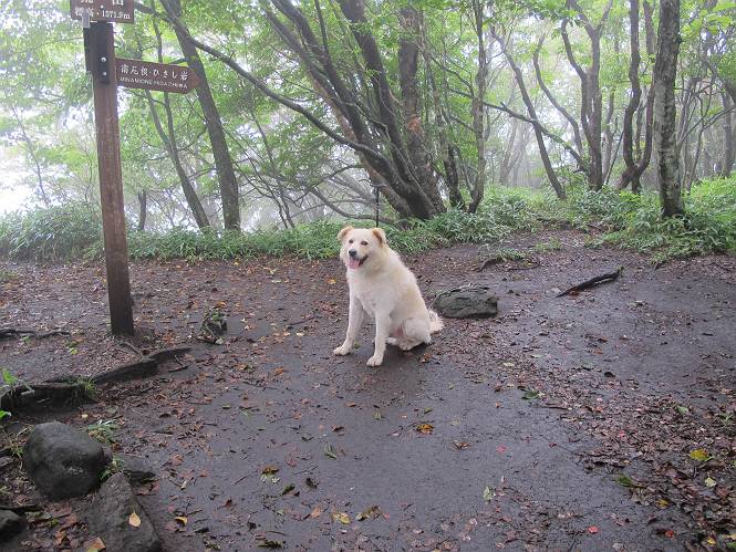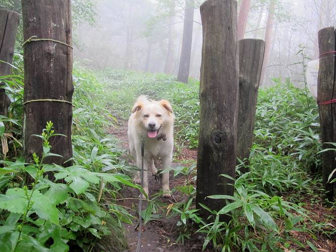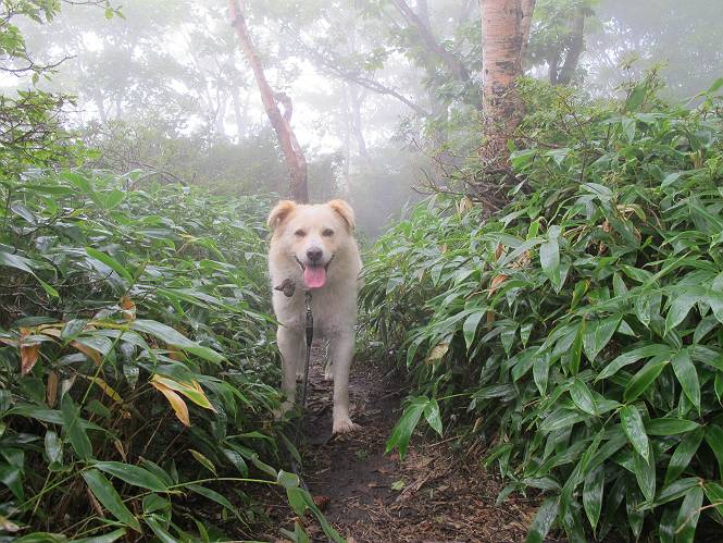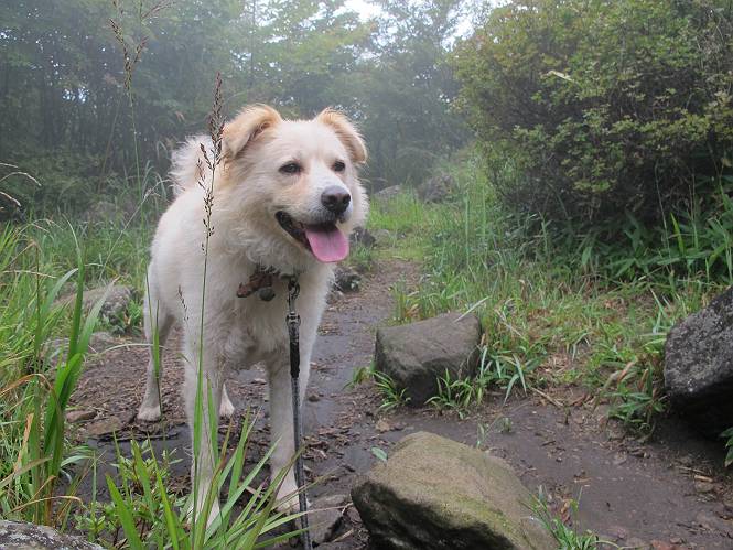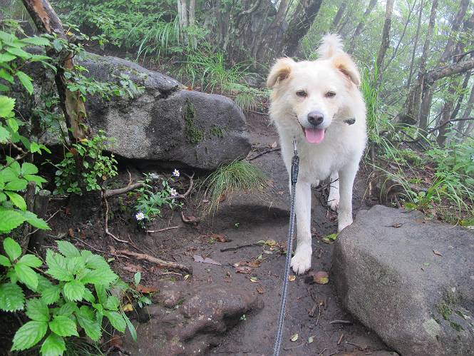 | 平成二十五年九月六日 Before 写真集目次へ Next 昨日、「山を一回りして来よう」と言ってましたが、一日中降ったり止んだりで止めてしまいました。今朝になって、散歩前「忠治、雨が大丈夫そうだから行って来るか」、となりまして荒山にでかけました。登山口は南側の荒山森林公園の駐車場です。 うっそうとした駐車場から出発です。 階段状の道を少し歩きます。 次に笹の道に入ります、露をいっぱい含んでいます。ぼくは時々ブルブルっと体を振って、水滴を払ってしまいますが、お父さんはビショビショになってしまったようです。 サラサドウダンの葉が黒っぽくなってました、紅葉の始まりでしょうか。 大分上って、緩やかな場所にでました。 荒山の山頂が見えるところですが、見渡しても霧で全く見えません。 「忠治、どうした」、「モグラの穴に鼻先を突っ込んで臭いをとったんだよね」 「口の中が真っ黒だ」、「ぼく、平気だよ」 荒山高原、赤城温泉、小沼方面の分岐点に着きました。 荒山高原の方へ行きます。 いつも水の無い沢ですが、今日は水が流れてました、飲んじゃったよ。 荒山高原に着きました。 いつもですと、姫百合駐車場の方から沢山来ているのですが、誰もいません。 ちょっと、お休みしてましたが、誰もきませんでした。 つつじの間の道を上って、展望の広場という場所にでて、 箕輪からの道と合流しました。 また、露っぽい笹の道に入りました、 霧がキレイですね。 シラカバがポツンポツンと生えています、木肌がキレーイ。 もう、大分上ってきました、そろそろ岩場が出てくるそうです。 岩場を前に、一休みしてます。 どうやって上るのかなあ、岩が濡れていて滑るので、お父さんに引っ張り上げてもらいました。 また大きな岩、ここも引っ張ってもらいました。 荒山山頂に着きました。 オヤツとお水をもらって、一休みしてます。 山頂の祠と三角点です。結局誰にも会わず、南方向に下りました。 ここも岩場がありましたが、ラクチンでした。ノギクを入れて撮ってもらいました。 ひさし岩に出ました。霧で全然景色は見えません。またザックを広げて、お父さんが食べ出しました、ぼくはパンと梨を少しもらいました。 おばさんが下からやってきて、ぼくの名前を聞きました、「忠治です」とお父さんが言うと、「あれ! 大きくなったみたい、鍋割山で会った時、リュックを背負っていて・・・・」、そして頭を撫でてもらいました。 ひさし岩の道標 おばさんが、教えてくれたトリカブトの花 ひさし岩からもう少し下ると、小沼の分岐点に出ました。 ここから西の方向に進んで、先ほど通った十字路に出ます。 霧が濃くなって、少し雨が降ってきました。でも林の中なので今のところ大丈夫です。 おやっ、大きく下っているぞ。 怖いなあ、どうしよう。お父さんの後についてゆっくり降りて通過しました。 またまた、岩場の下りです。「忠治、怖くない、ゆっくり降りてきな」 恐る恐るでしたが、滑らないようにして降りました。 ここも、ほとんど水の無い沢ですが、川のように音を立てて流れてました。 十字路に出ました、あとは笹道を下るだけです。雨は小降りですがずっと降ってます。 笹道を下って駐車場に戻りました。 このコースは紅葉でも始まらないと歩く人が少ないようです。でも山歩きって楽しいね。お父さんは上から下までビッショリになってしまい、カッパに着替えて家に戻りました。 Before 写真集目次へ Next |