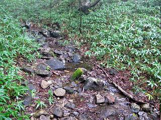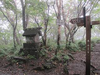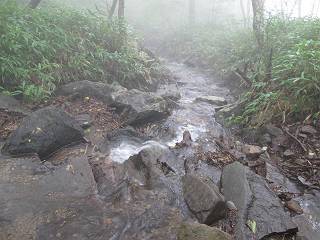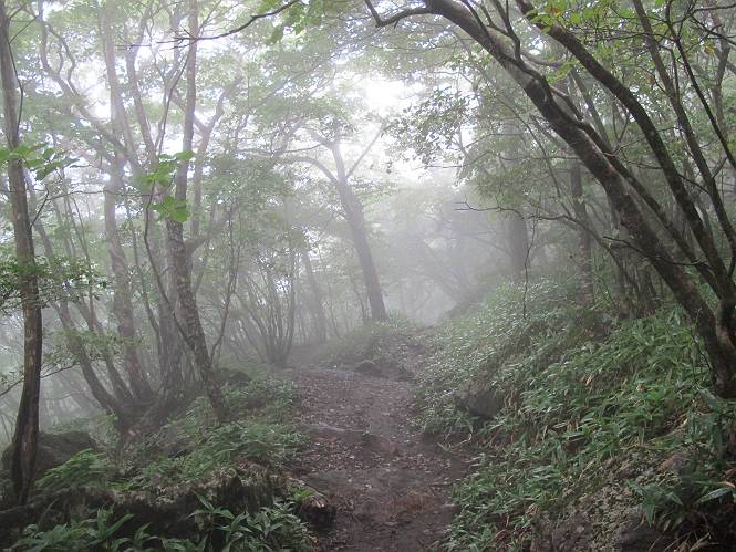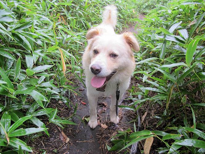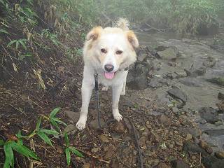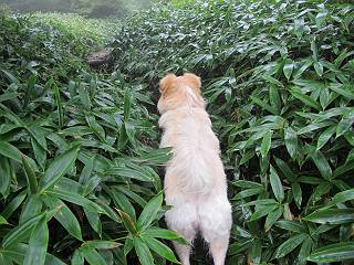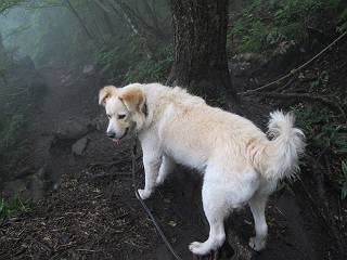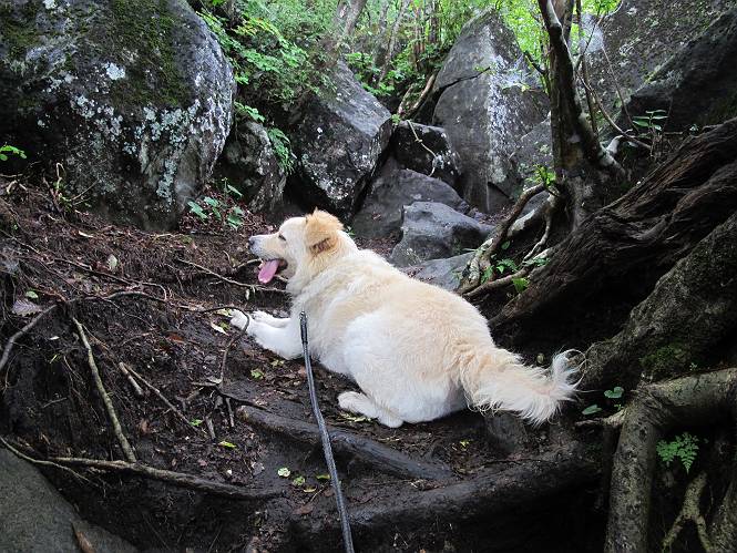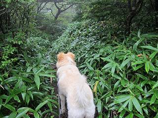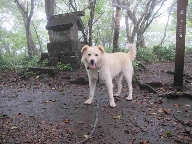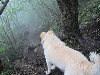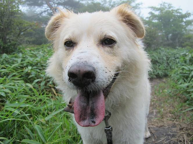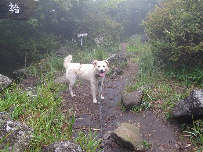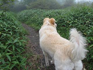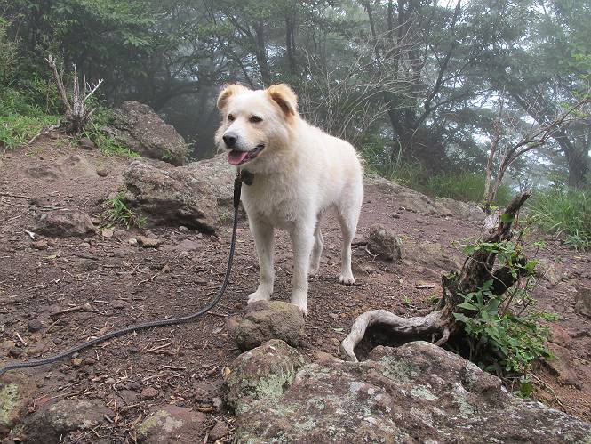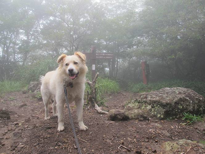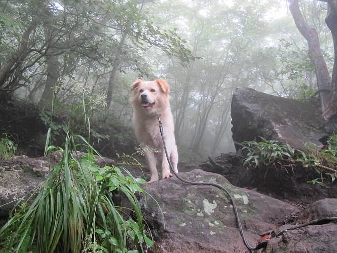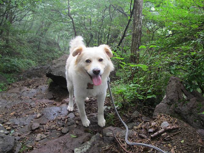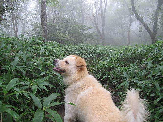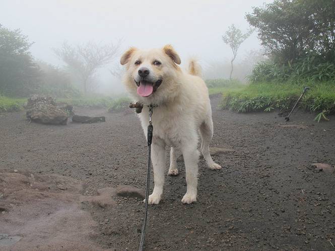 | 平成二十五年九月六日 Before 写真集目次へ Next 昨日、「山を一回りして来よう」と言ってましたが、一日中降ったり止んだりで止めてしまいました。今朝になって、散歩前「忠治、雨が大丈夫そうだから行って来るか」、となりまして荒山にでかけました。登山口は南側の荒山森林公園の駐車場です。 うっそうとした駐車場から出発です。 階段状の道を少し歩きます。 次に笹の道に入ります、露をいっぱい含んでいます。ぼくは時々ブルブルっと体を振って、水滴を払ってしまいますが、お父さんはビショビショになってしまったようです。 サラサドウダンの葉が黒っぽくなってました、紅葉の始まりでしょうか。 大分上って、緩やかな場所にでました。 荒山の山頂が見えるところですが、見渡しても霧で全く見えません。 「忠治、どうした」、「モグラの穴に鼻先を突っ込んで臭いをとったんだよね」 「口の中が真っ黒だ」、「ぼく、平気だよ」 荒山高原、赤城温泉、小沼方面の分岐点に着きました。 荒山高原の方へ行きます。 いつも水の無い沢ですが、今日は水が流れてました、飲んじゃったよ。 荒山高原に着きました。 いつもですと、姫百合駐車場の方から沢山来ているのですが、誰もいません。 ちょっと、お休みしてましたが、誰もきませんでした。 つつじの間の道を上って、展望の広場という場所にでて、 箕輪からの道と合流しました。 また、露っぽい笹の道に入りました、 霧がキレイですね。 シラカバがポツンポツンと生えています、木肌がキレーイ。 もう、大分上ってきました、そろそろ岩場が出てくるそうです。 岩場を前に、一休みしてます。 どうやって上るのかなあ、岩が濡れていて滑るので、お父さんに引っ張り上げてもらいました。 また大きな岩、ここも引っ張ってもらいました。 荒山山頂に着きました。 オヤツとお水をもらって、一休みしてます。 山頂の祠と三角点です。結局誰にも会わず、南方向に下りました。 ここも岩場がありましたが、ラクチンでした。ノギクを入れて撮ってもらいました。 ひさし岩に出ました。霧で全然景色は見えません。またザックを広げて、お父さんが食べ出しました、ぼくはパンと梨を少しもらいました。 おばさんが下からやってきて、ぼくの名前を聞きました、「忠治です」とお父さんが言うと、「あれ! 大きくなったみたい、鍋割山で会った時、リュックを背負っていて・・・・」、そして頭を撫でてもらいました。 ひさし岩の道標 おばさんが、教えてくれたトリカブトの花 ひさし岩からもう少し下ると、小沼の分岐点に出ました。 ここから西の方向に進んで、先ほど通った十字路に出ます。 霧が濃くなって、少し雨が降ってきました。でも林の中なので今のところ大丈夫です。 おやっ、大きく下っているぞ。 怖いなあ、どうしよう。お父さんの後についてゆっくり降りて通過しました。 またまた、岩場の下りです。「忠治、怖くない、ゆっくり降りてきな」 恐る恐るでしたが、滑らないようにして降りました。 ここも、ほとんど水の無い沢ですが、川のように音を立てて流れてました。 十字路に出ました、あとは笹道を下るだけです。雨は小降りですがずっと降ってます。 笹道を下って駐車場に戻りました。 このコースは紅葉でも始まらないと歩く人が少ないようです。でも山歩きって楽しいね。お父さんは上から下までビッショリになってしまい、カッパに着替えて家に戻りました。 Before 写真集目次へ Next |