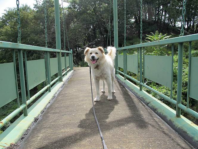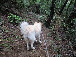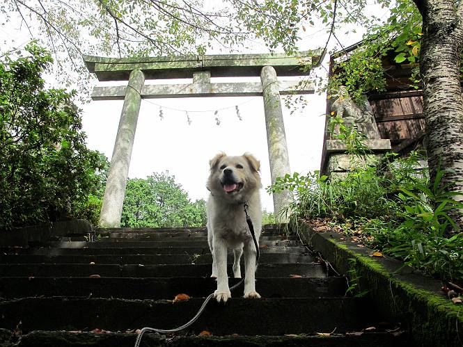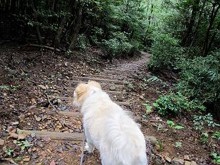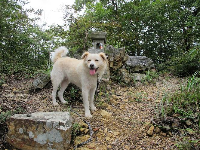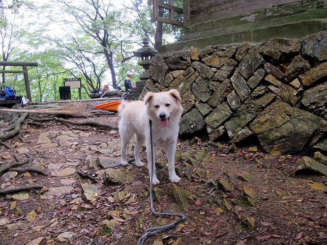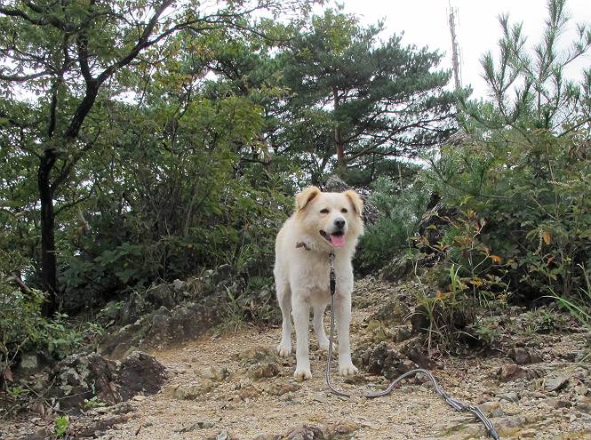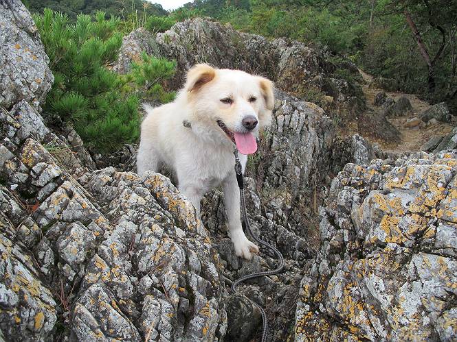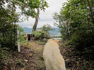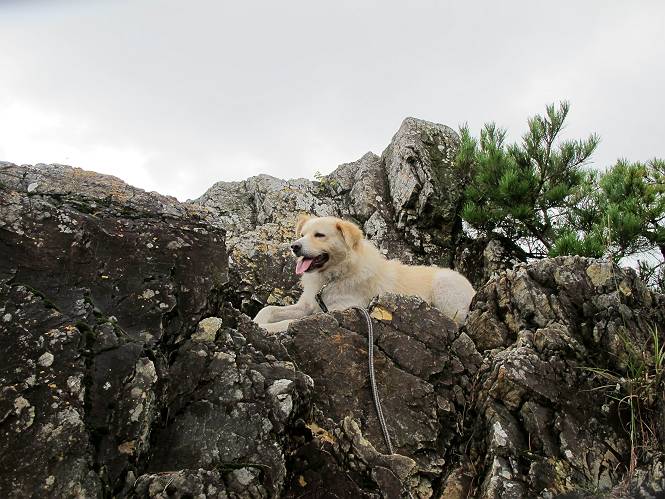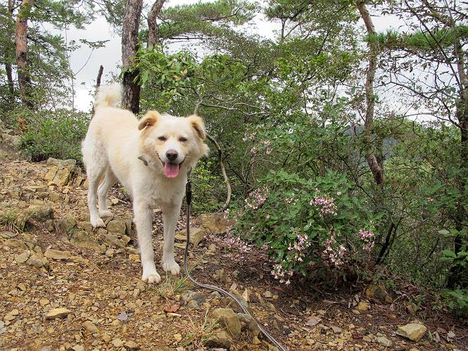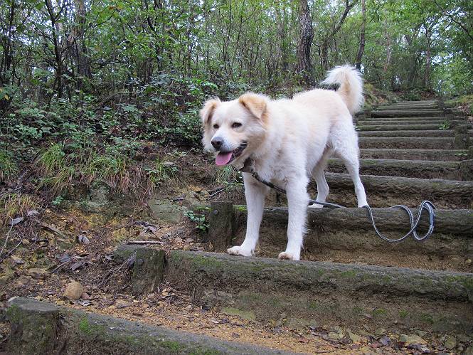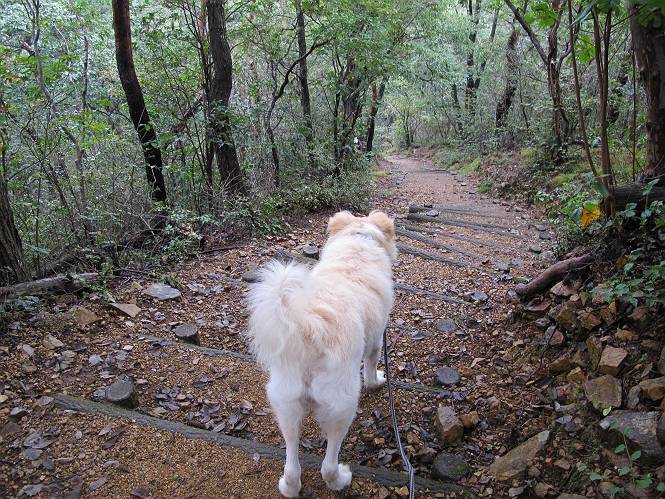 | 平成二十五年十月六日 Before 写真集目次へ Next お父さんが予定していた日光方面の山が天気が良くない予報なので中止してしまいました。霧雨の中、朝の散歩をして、「忠治、今日、山へ連れて行くぞ」、と言ってました。が、なかなか天気が良くなりません、ずっと車のハッチで待っていました。「薄日が差してきた、出かけるぞ」、と織姫神社に向かいました。 織姫神社の石段を上ってます。もう少しで神社に着きます。 今日は特別の日でしょうか。小石がキレイにならされていました。ぼくが一番に足跡をつけちゃったよ。 いつも通るつり橋を渡ってます。 ハイキングコースに入りました。 雨が沢山降りましたが、岩山なのでぬかるみは全然ありません。 秋の花、ハギがアチラコチラ、沢山咲いてます。 そろそろ楽しい岩場が出てきます。 ここから、岩岩の道です。 おお、良く見えるなあ。 いっぱい、歩いてくるぞ。 足利の街も見えている、南方向だそうです。 「折角だから、ちょっとお休みしましょうか」 丁度、ぼくが入れるくぼみがあります。 「もう、行くの?」 ちょっと進んで、アズマ屋にやってきました。ここでね、お休みしていたおじさんに、お菓子をもらっちゃったんだよね。半分食べて、また後でだって。「いいこだね」、って頭を撫でてもらっちゃった。 今度は、街の東側だそうです。眺めがいいですよ。 石段を少し上って、両崖山山頂に着きました。 今日はね、山頂の真ん中、御嶽神社のお祭りだそうです。迷惑かけないように、横の方にいます。でもオヤツを食べる場所がないんですよ。 また、戻って鳥居のそばで、オヤツとお水を頂きました。隣に駐車したおじさんがやってきて、ぼくのことをいろいろ聞いていたようです。おじさんちにも柴犬ミックスがいたそうです、犬が好きそうだったなあ。おじさんは、天狗山の方へ、ぼくたちは北側へと別れました。 山頂の裏から階段を下って、北方向に進みます。 おばさんが、前にいたのですが、木の陰に隠れてしまいました。写真を撮られたと思ったかな、撮ってないってさ。 近道しようと細い脇道に入りましたが、結局同じ道に出て、雷電神社の分岐点に着きました。 ここで、ひとやすみです。ここから雷電神社方面ははじめてです。 分岐点から少し下ると、また人家が沢山見えてきました。 下る一方かと思ったら、また上りです、疲れちゃうね。 ハァハァしながら進んで、ベンチのあるピークに出ました。 また、おやすみです。後に赤いガマズミの実とハギが咲いてます。 真っ赤なガマズミ、美味しそうですね、食べられるのかな? またまた、下って、上りました。分岐点から2つ目のピークです。 まだ小さいピークがありました。3つ目で雷電山だそうです。 東はすぐ下まで人家があるようです。 この鳥居、お父さんが首を曲げて通ってました、あまり大きくないんですよ。 尾根伝いに少し下ると、曲って 薄暗い林に入りました。 急な長い階段をしばらく下りました。 雷電神社にやってきました。 ぼくはちょっと休憩です。 もうすぐ、街に降りるようです。 病院の裏に降りて、お水を頂き、堀にそって、しばらく歩いてます。 やっと一周して、織姫神社の駐車場に戻りました、お父さん、新ルート、またやったね。 今日は、むしあつくて、少し疲れました。お水も沢山のみました。「このコースは、紅葉がはじまるとハイキングにいいな、また来るか、忠治」、とお父さんが言ってました。 Before 写真集目次へ Next |