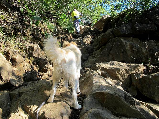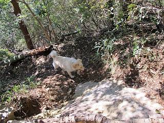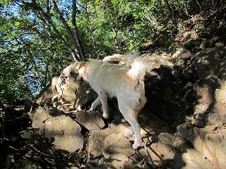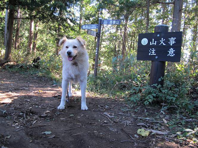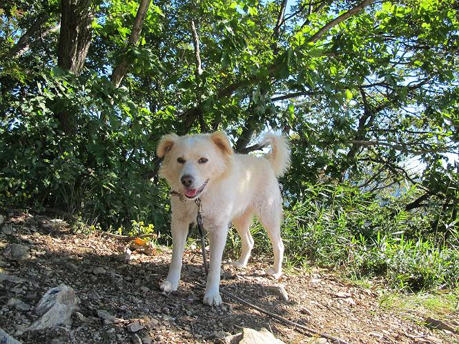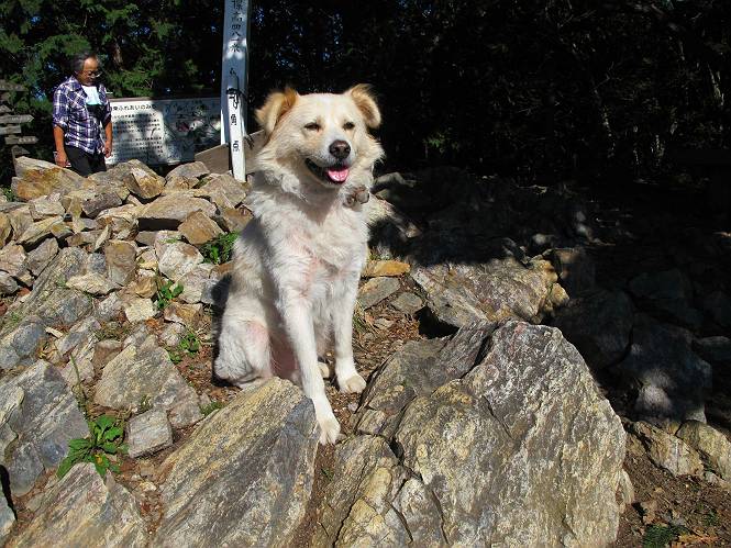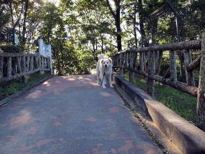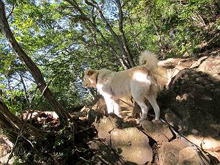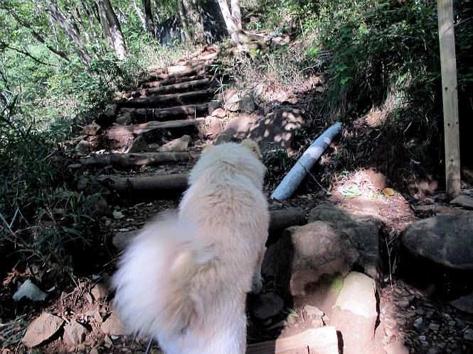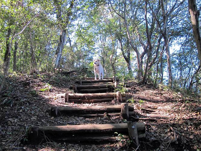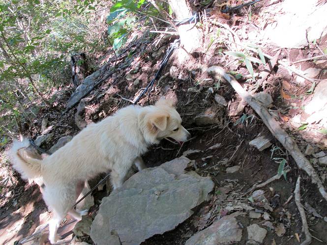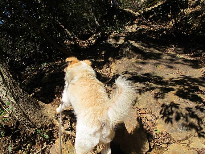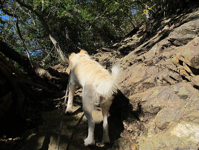 | 平成二十五年十月十七日 Before 写真集目次へ Next 台風が去って、お庭は、大風で皇帝ダリヤがメチャメチャに倒れ、一面の柿の葉だらけです。お母さんが早起きして、手入れをしてます。皇帝ダリヤは1本折れてしまったそうです。ぼくとお父さんは、台風一過の青空の下、桐生の吾妻山へ出かけました。 下の駐車場から架橋まで歩いてきました、もう帰ってくる人がいます。 ぼくはゆっくり歩いているので、みんな抜いてってしまいます。 登山道入口です。小さい柿が沢山落ちてます。 見上げると、色づいた柿が点々と見えます。 ここから木段を上ります、結構急なんですよ。 あっ、また、おじさんに追いつきました。このおじさん、駐車場から抜いたり抜かれたりしてます。 大きな岩の上に出ました、桐生の街だそうです。家が沢山あるなあ。 ぼくたちは景色を眺めてますが、みんな素通り、おじさんも行ってしまいました。 この岩はトンビ岩って言うんだそうです、後の道標に書いてあるそうです。。 急な岩場を乗り越えてます。 杉林の所で緩やかになって、 また、だんだん急坂になって、大きな岩場に出ました。 お父さんは、先に上ってしまいました、次はぼくの番です。 ヨイショ、ヨイショ、 四本の爪を引っ掛けて上りました。「忠治、やったで、さすが、太った四駆」 また、おじさんが見えたよ。 ヨイショ! 近回りして、追いついたのですが、 ぼくたちは左に回り込んで、 歩いているうちに、 おじさんはピッチを上げて 先に行ってしまいました。 一足遅れて 吾妻山山頂に着きました。 山頂の眺めです、ススキ越しにトンビ岩より遠くまで見えますね。 山頂には5,6人、おじさんは前の方で富士山を探してるようです。 でも、雲があって見えないようです。 山頂へ次々とやってきます。 また、一人到着です。 そろそろ、下ります。 吾妻山から北へ歩いて一つ目の女山です。 下って、あと2つ小さい山を越えて村松峠に出るそうです。 「忠治、何してる」、 「ハーイ、ちょっと・・・・」 村松峠に出ました、吾妻公園の方へ戻ります。 ここから下って、 杉林の中、急坂を下って、 林道に出ました、間もなく、公園に通じる道路に出ます。 緩い坂を登りきると、先ほど通った架橋の下でした。 架橋を渡って公園に戻りました、もう直ぐ駐車場です。 Before 写真集目次へ Next |