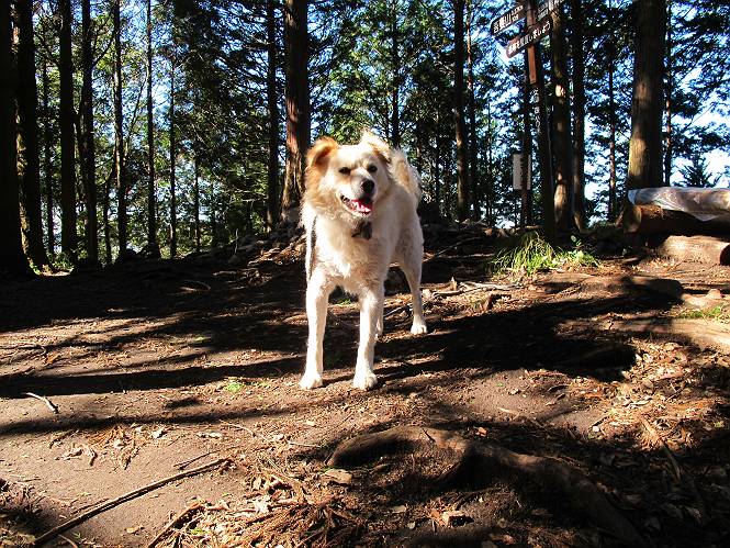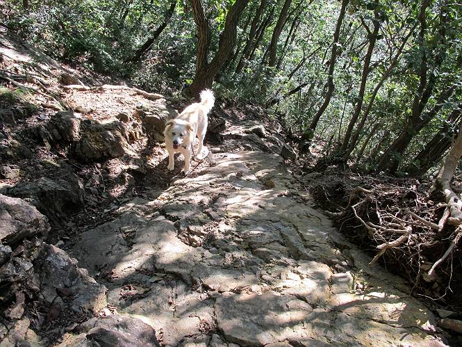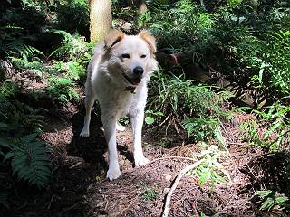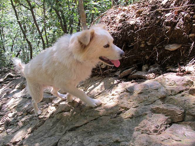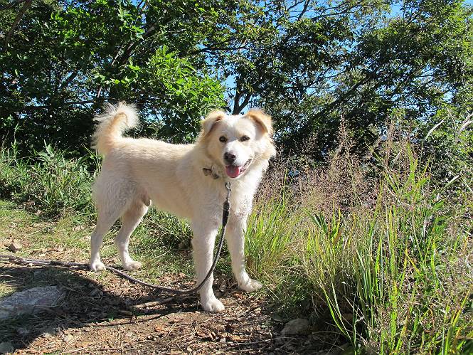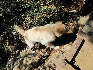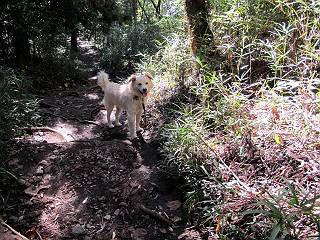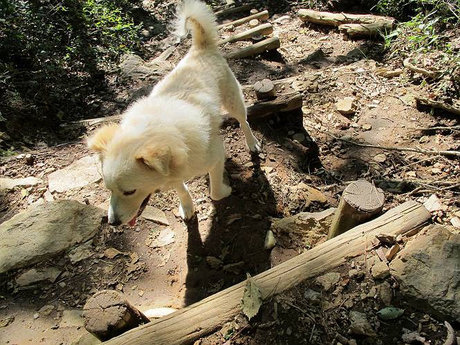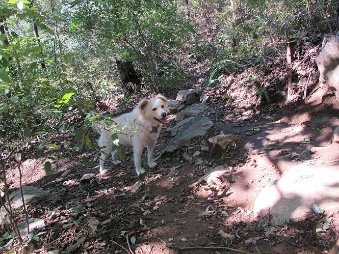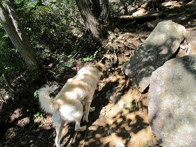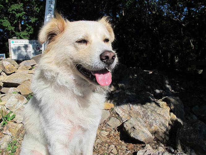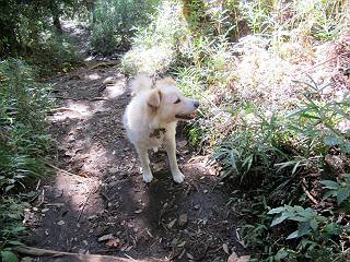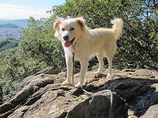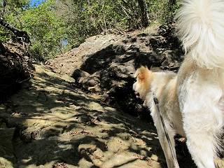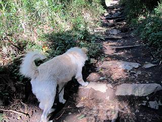 | 平成二十五年十月十七日 Before 写真集目次へ Next 台風が去って、お庭は、大風で皇帝ダリヤがメチャメチャに倒れ、一面の柿の葉だらけです。お母さんが早起きして、手入れをしてます。皇帝ダリヤは1本折れてしまったそうです。ぼくとお父さんは、台風一過の青空の下、桐生の吾妻山へ出かけました。 下の駐車場から架橋まで歩いてきました、もう帰ってくる人がいます。 ぼくはゆっくり歩いているので、みんな抜いてってしまいます。 登山道入口です。小さい柿が沢山落ちてます。 見上げると、色づいた柿が点々と見えます。 ここから木段を上ります、結構急なんですよ。 あっ、また、おじさんに追いつきました。このおじさん、駐車場から抜いたり抜かれたりしてます。 大きな岩の上に出ました、桐生の街だそうです。家が沢山あるなあ。 ぼくたちは景色を眺めてますが、みんな素通り、おじさんも行ってしまいました。 この岩はトンビ岩って言うんだそうです、後の道標に書いてあるそうです。。 急な岩場を乗り越えてます。 杉林の所で緩やかになって、 また、だんだん急坂になって、大きな岩場に出ました。 お父さんは、先に上ってしまいました、次はぼくの番です。 ヨイショ、ヨイショ、 四本の爪を引っ掛けて上りました。「忠治、やったで、さすが、太った四駆」 また、おじさんが見えたよ。 ヨイショ! 近回りして、追いついたのですが、 ぼくたちは左に回り込んで、 歩いているうちに、 おじさんはピッチを上げて 先に行ってしまいました。 一足遅れて 吾妻山山頂に着きました。 山頂の眺めです、ススキ越しにトンビ岩より遠くまで見えますね。 山頂には5,6人、おじさんは前の方で富士山を探してるようです。 でも、雲があって見えないようです。 山頂へ次々とやってきます。 また、一人到着です。 そろそろ、下ります。 吾妻山から北へ歩いて一つ目の女山です。 下って、あと2つ小さい山を越えて村松峠に出るそうです。 「忠治、何してる」、 「ハーイ、ちょっと・・・・」 村松峠に出ました、吾妻公園の方へ戻ります。 ここから下って、 杉林の中、急坂を下って、 林道に出ました、間もなく、公園に通じる道路に出ます。 緩い坂を登りきると、先ほど通った架橋の下でした。 架橋を渡って公園に戻りました、もう直ぐ駐車場です。 Before 写真集目次へ Next |