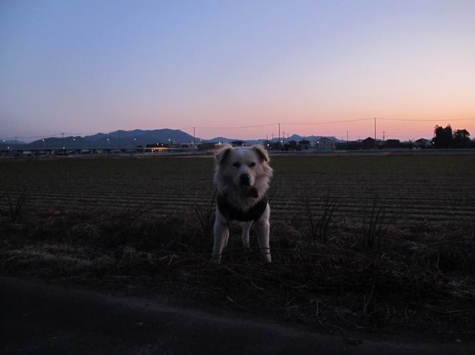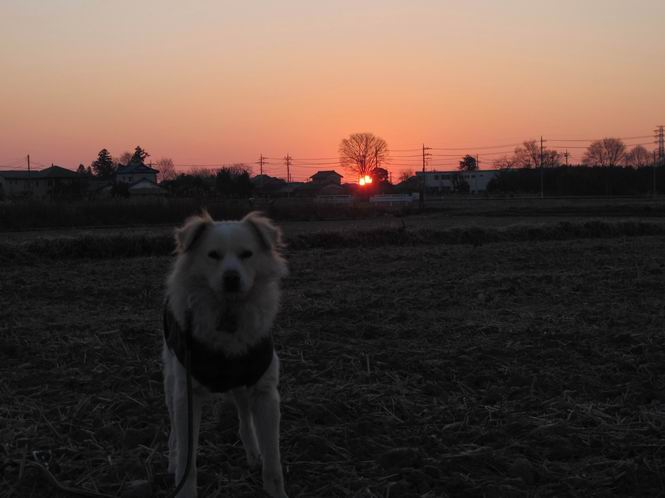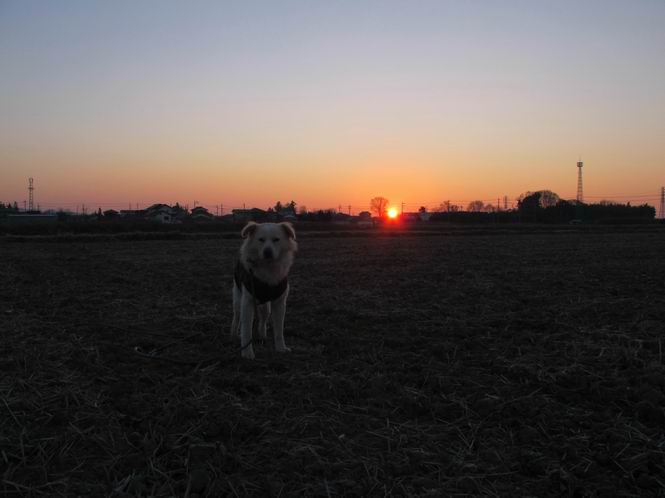 | 平成二十六年一月一日 Before 写真集目次へ Next 皆さん、明けましておめでとうございます。今年もぼくのホームページ見てね。 今朝はいつものコースを散歩して、車に乗って日の出の見られる場所に行きました。 なかなか良い場所がなくて、結局去年とほとんど同じ場所でした。 初日の出を拝んで・・・、「何を拝んだ」って? もちろん「今年も元気に遊べるように」だよ。 家に戻ると日の丸に朝日があたってました、いいね。 休んでいたら、お正月の写真を撮るんだってさ。 「お正月の顔をしろ」だって、どんな顔? こんな顔でいいのかな、ワン。 今年も、あっちこっちの山へ連れてってもらえるといいな。 Before 写真集目次へ Next |
