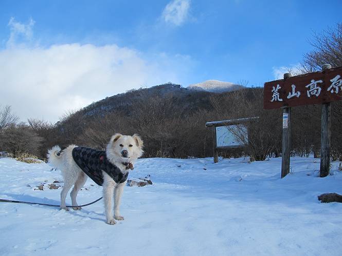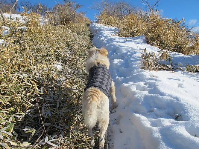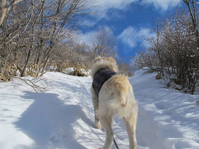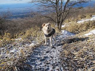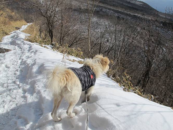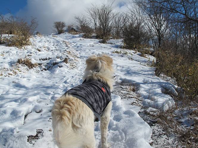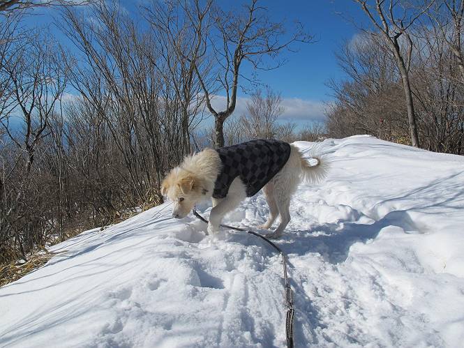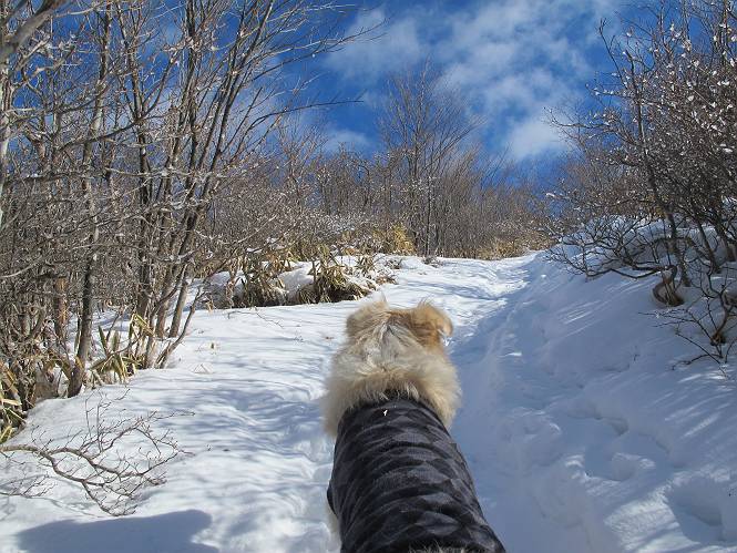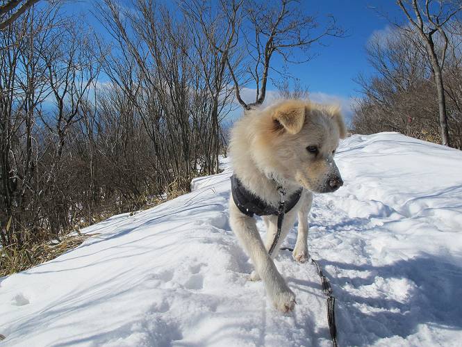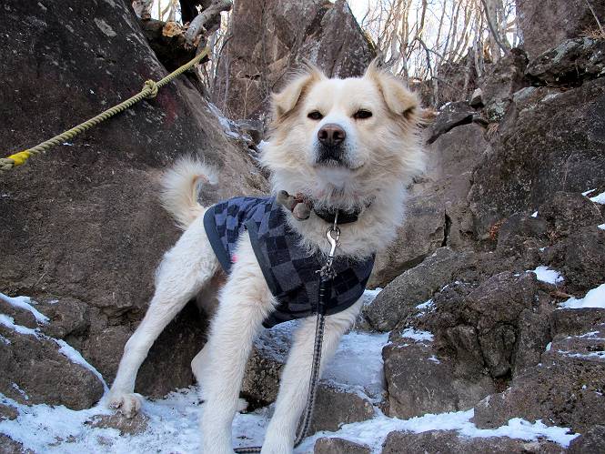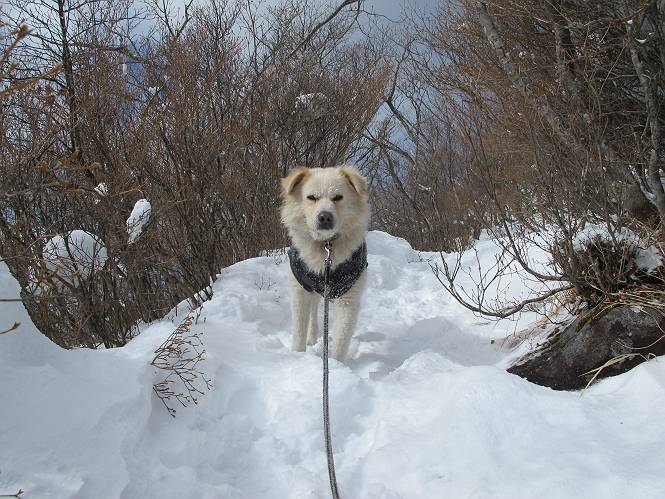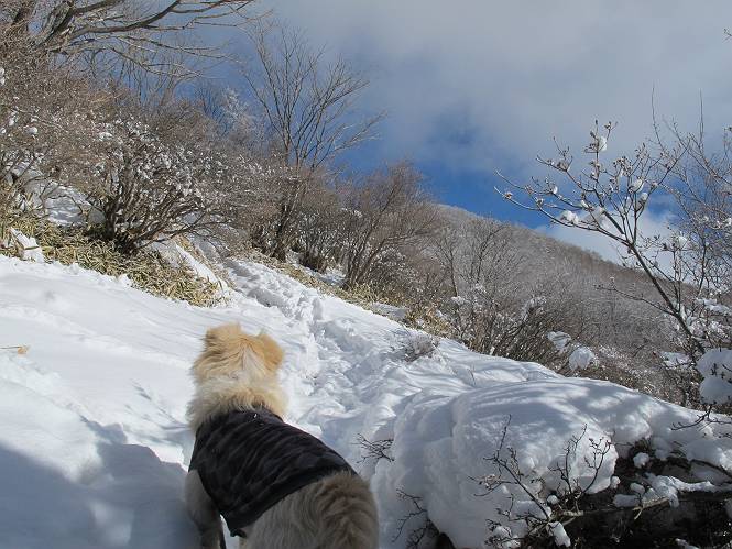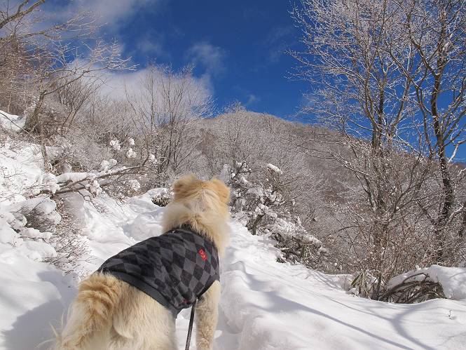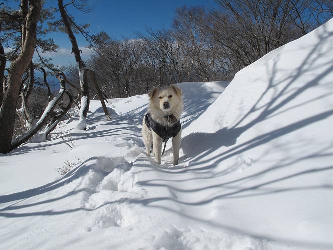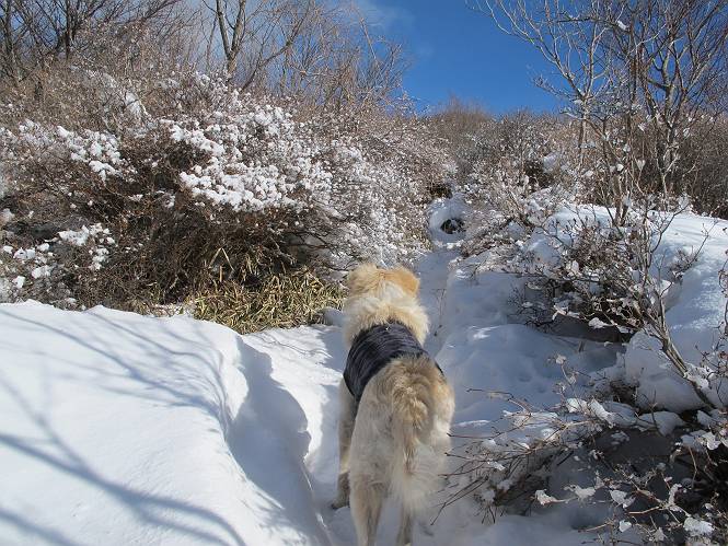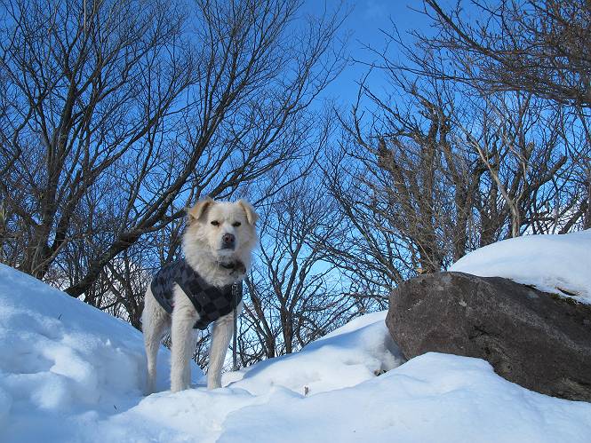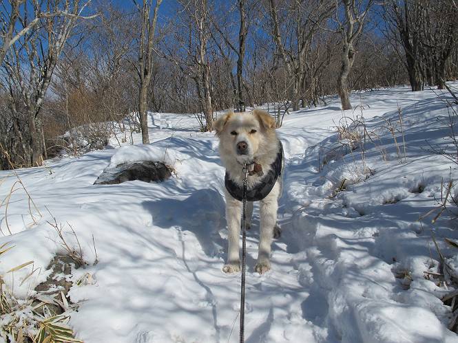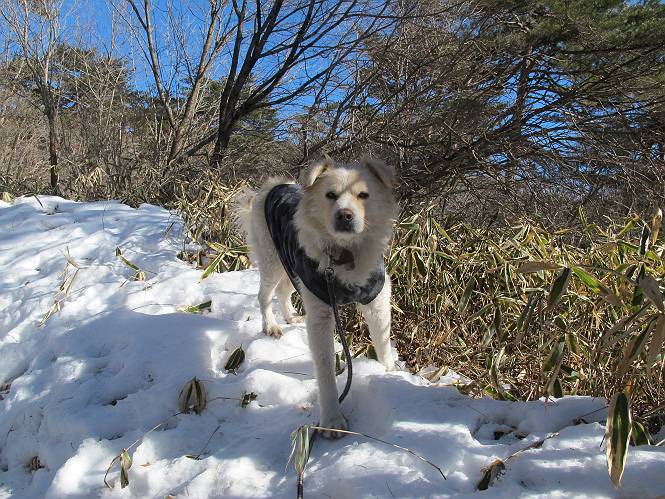 平成二十六年一月十日 Before 写真集目次へ Next この冬に入って、姫百合駐車場とか竜頭の滝周辺で、ちょっと雪遊びをしましたが、山は歩いてないんです。今日は、朝の散歩を抜いて、赤城山に連れてってくれるんですって、ぼく、嬉しいな。コースはね、赤城の南面を走って北に入り込むと、青少年交流の家があります。この奥の鍋割山の登山口から入って、鍋割高原、鍋割山、荒山高原、荒山と歩き、南に下って避難小屋を通り、荒山森林公園へ下って、林道を4kmほど歩いて鍋割山登山口に戻ります。 ここが鍋割山の登山口です、矢印の方向に進みます。 はじめは、緩やかに進むのですが、荒山高原の前後で岩場を急登します。 寒さと、凍っているので怖いのです、「忠治、なに、緊張してる、スマイル、スマイルだよ」 「こんな感じはどう、ワン」 岩場を抜け、緩やかな森に出ました、いいねえ、楽しいね。でも森の中は雪が深いんだよ。 一段高い所に出て、前不動からの道と合流します。 今度は、真っ直ぐ山頂まで丸太の階段を上ります。 隣が笹の斜面なので入り込んで遊びました。 山頂の直ぐ下にきました、もう少しです。 鍋割山の山頂に着きました。 先ほど階段で下山する人に会いました、後からついてきた人は間もなく到着です。 雪をかじったり、掘ったり、引っ掻いたり、雪遊びって楽しくって。 雪の感触っていいなあ、 今度は反対側。 鍋割山から次ぎの荒山に向かいます。 いっぱい動物の足跡があるんだよ。何だろうな、ぼく、遇った事ないなあ。 荒山が見えてきました、まだ雲がとれないようです。左の地蔵岳は、真っ白、陽がさしているかな。 時々林に入り込んで遊びながら進みます。 デッカイ足だな、何だ、これ。 先端に突き出た大きな岩にやってきました。 南に富士山が、 西に浅間山が見えてます。 この先がカマド山っていうんだって。 左が地蔵岳、正面が荒山です。 綺麗に見えますが、時々雲がかかってしまいます。 また、黒い雲がやってきたようです。 ヒオコシ山を過ぎて、荒山高原へ下ります、林の中は雪が深いんだろうね。 この先で、道はジグザグしてます。 荒山高原に着きました。雲って強い風が吹いてます。荒山の山頂は陽がさしてます。 つつじの間の道にに入って行きます、踏み跡ははっきりしてます。 林の木が大きくなってきましたね、雪も増えてきました。 小枝に氷がついてます。 「雪が解けて凍ったんだろう」、とお父さんが言ってました。 だんだん大きくなって、沢山ついてます、雪もありますね、後は鍋割山です。 いっぱいついていると、きれいだねえ。 氷と雪のあいだっこか、透き通ってないのが多くなってきた。 あっ、気持ちいい、顔がすっぽり入っちゃうよ、ほらっ。 大きな松ノ木が出てきたねえ 木が大きくなってきたねえ。 大分上の方は白くなってきたね。 また、荒山の山頂が見えてきたね。 後には鍋割山が見えてるよ。 これはスゴイ、吹き溜まりだね、深そう。 「ぼく、怖くて歩けないよう、ズボッと入っちゃいそう、お父さん先に行って」。 「ヨシッ、大丈夫だからついて来な」 吹き溜まりの度にこんなことして進みました。歩いた跡が消えてないんです。 上の方にきたら、真っ白くなってきましたね。 ここも深そうだなあ、こっちかな、そっちかな。 スゴイ雪が飛んでいるぞ。 やっと山頂直ぐ下の岩場に進みましたが、滑って落ちちゃうんですよ。上の雪がパウダーで下の雪が凍っているんです。ここもお父さんが先に進みました。 でもね、ここまで来ると山頂はすぐそこだって。 見えたぞ、足跡なんか全然ないね、真っ白だ。 荒山山頂に到着しました。早速。記念写真を撮りましょう。後から岩場の手前からずっと、ついてました。お礼を言ってましたよ。 山頂でオヤツをもらいました。足にできた氷タマをとっていると、お父さんがボリボリとっちゃいました。 山頂の雪景色です。 花が咲いたようですね。 さっきのおじさんが、ぼくたちが南をまわると言ったら、ついて行って良いかって。 ひさし岩まで下りました。道は2,3ヶ所消えてましたが、目印とか、木の枝ぶりで大体わかるんだってさ。 ひさし岩から地蔵岳、右奥に黒檜山と駒ケ岳、右側に長七郎山が見えました。 避難小屋から次ぎの十字路まで進みます、途中で荒山高原からきた人に会い、後の方は安心したようです。ぼくたちは真っ直ぐ荒山森林公園の方へ進みます。 十字路で、お休みです。ぼくは、雪を落としています。 ここからは、雪も徐々減って、 ドロンコの道も出てきました。 また、ちょっと藪の中で遊んできました。 もう雪がほとんどなくなりました。お父さんは脱いでザックに詰め込んでます。 荒山森林公園の駐車場まで下りました。あとは林道歩きです。 この道は4kmほどあるようです。ブラブラしながら歩いてます、お腹がすいたなあ。 おお、ぼくんちの車が見えました。ぐるっと周って雪遊び楽しかったなあ。 「お父さん、またお願いしま
