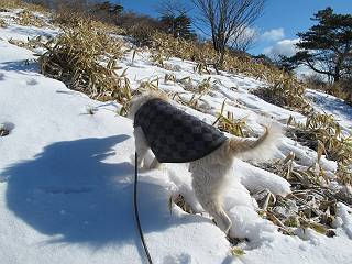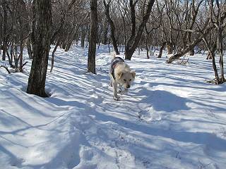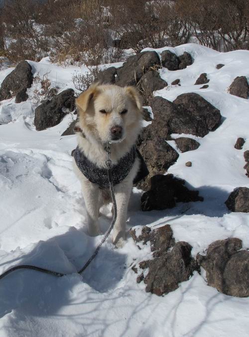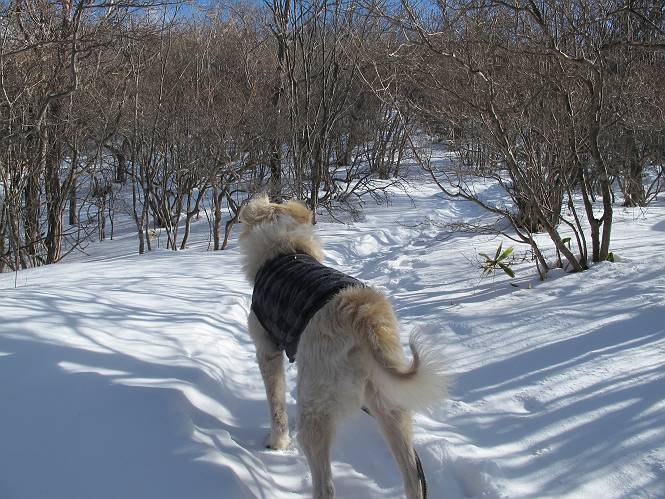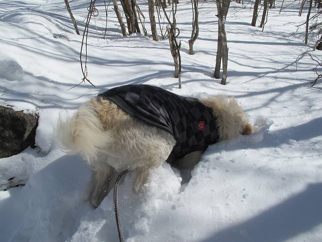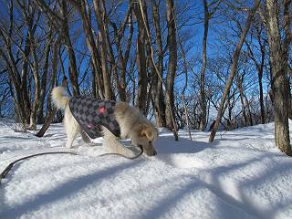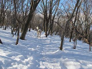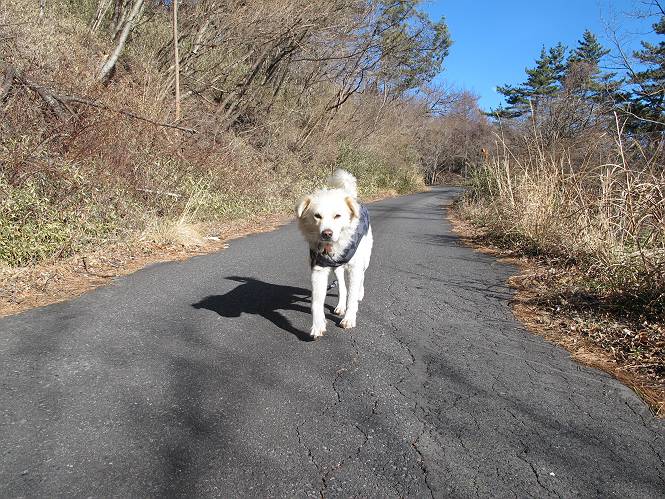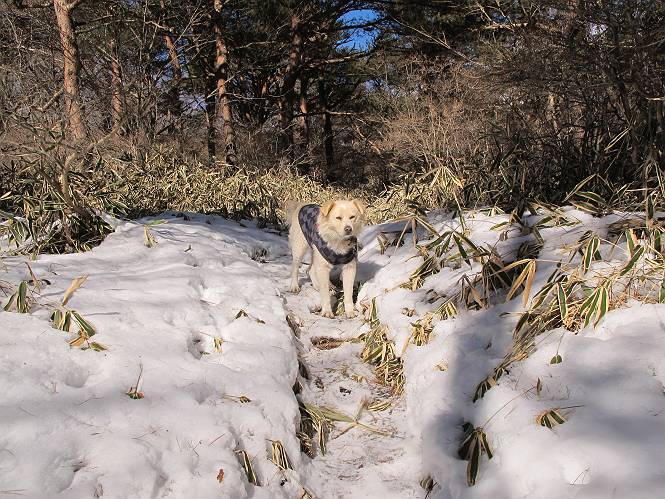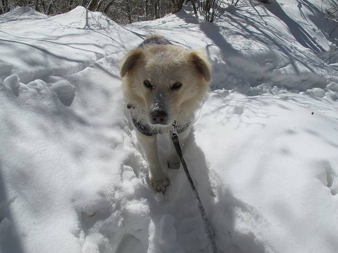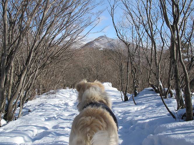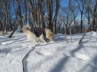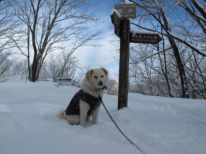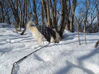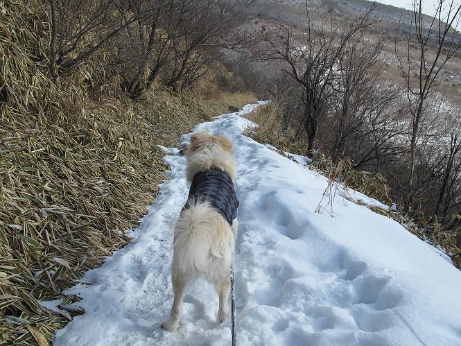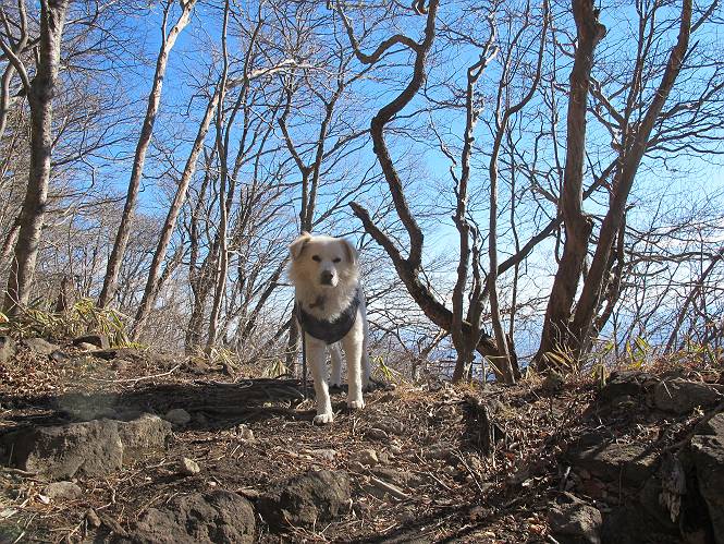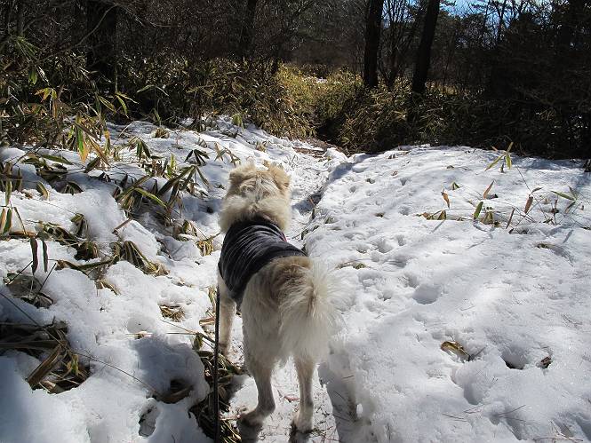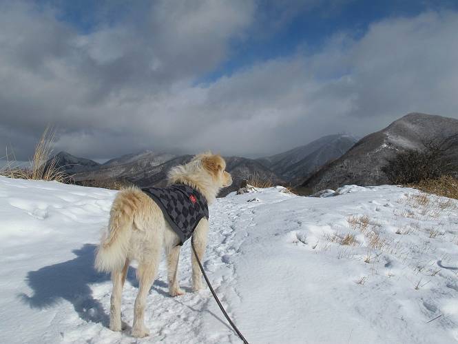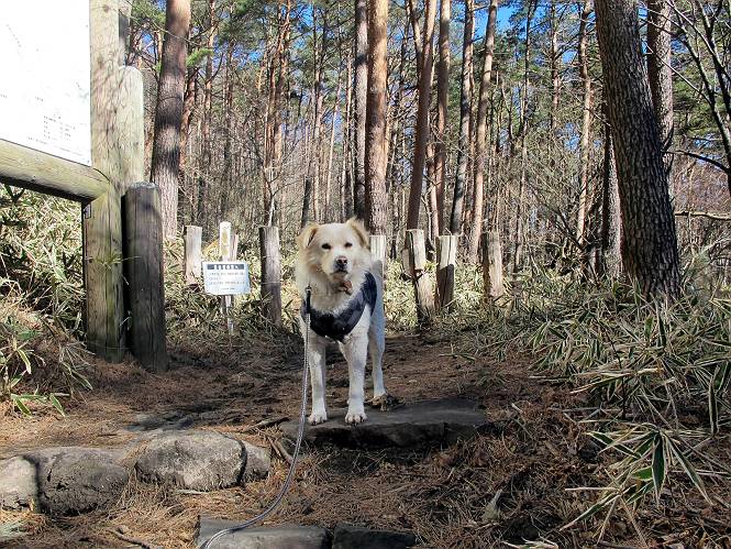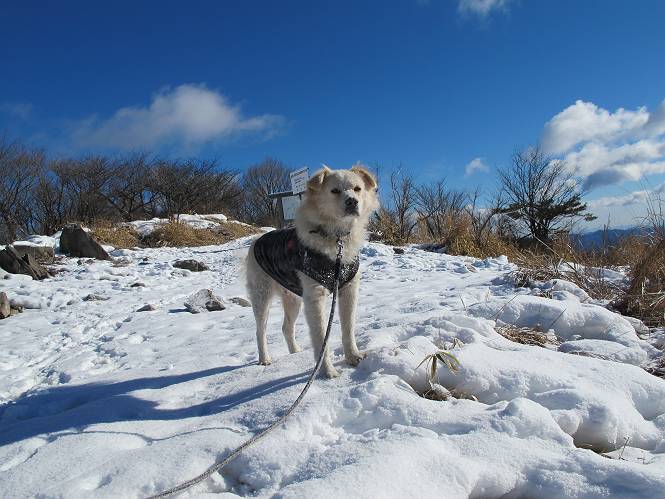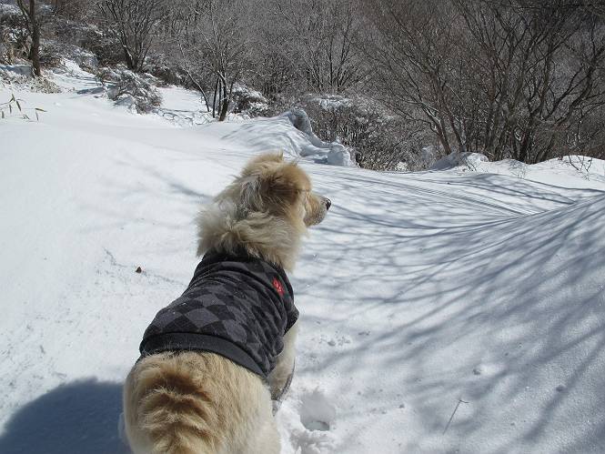 平成二十六年一月十日 Before 写真集目次へ Next この冬に入って、姫百合駐車場とか竜頭の滝周辺で、ちょっと雪遊びをしましたが、山は歩いてないんです。今日は、朝の散歩を抜いて、赤城山に連れてってくれるんですって、ぼく、嬉しいな。コースはね、赤城の南面を走って北に入り込むと、青少年交流の家があります。この奥の鍋割山の登山口から入って、鍋割高原、鍋割山、荒山高原、荒山と歩き、南に下って避難小屋を通り、荒山森林公園へ下って、林道を4kmほど歩いて鍋割山登山口に戻ります。 ここが鍋割山の登山口です、矢印の方向に進みます。 はじめは、緩やかに進むのですが、荒山高原の前後で岩場を急登します。 寒さと、凍っているので怖いのです、「忠治、なに、緊張してる、スマイル、スマイルだよ」 「こんな感じはどう、ワン」 岩場を抜け、緩やかな森に出ました、いいねえ、楽しいね。でも森の中は雪が深いんだよ。 一段高い所に出て、前不動からの道と合流します。 今度は、真っ直ぐ山頂まで丸太の階段を上ります。 隣が笹の斜面なので入り込んで遊びました。 山頂の直ぐ下にきました、もう少しです。 鍋割山の山頂に着きました。 先ほど階段で下山する人に会いました、後からついてきた人は間もなく到着です。 雪をかじったり、掘ったり、引っ掻いたり、雪遊びって楽しくって。 雪の感触っていいなあ、 今度は反対側。 鍋割山から次ぎの荒山に向かいます。 いっぱい動物の足跡があるんだよ。何だろうな、ぼく、遇った事ないなあ。 荒山が見えてきました、まだ雲がとれないようです。左の地蔵岳は、真っ白、陽がさしているかな。 時々林に入り込んで遊びながら進みます。 デッカイ足だな、何だ、これ。 先端に突き出た大きな岩にやってきました。 南に富士山が、 西に浅間山が見えてます。 この先がカマド山っていうんだって。 左が地蔵岳、正面が荒山です。 綺麗に見えますが、時々雲がかかってしまいます。 また、黒い雲がやってきたようです。 ヒオコシ山を過ぎて、荒山高原へ下ります、林の中は雪が深いんだろうね。 この先で、道はジグザグしてます。 荒山高原に着きました。雲って強い風が吹いてます。荒山の山頂は陽がさしてます。 つつじの間の道にに入って行きます、踏み跡ははっきりしてます。 林の木が大きくなってきましたね、雪も増えてきました。 小枝に氷がついてます。 「雪が解けて凍ったんだろう」、とお父さんが言ってました。 だんだん大きくなって、沢山ついてます、雪もありますね、後は鍋割山です。 いっぱいついていると、きれいだねえ。 氷と雪のあいだっこか、透き通ってないのが多くなってきた。 あっ、気持ちいい、顔がすっぽり入っちゃうよ、ほらっ。 大きな松ノ木が出てきたねえ 木が大きくなってきたねえ。 大分上の方は白くなってきたね。 また、荒山の山頂が見えてきたね。 後には鍋割山が見えてるよ。 これはスゴイ、吹き溜まりだね、深そう。 「ぼく、怖くて歩けないよう、ズボッと入っちゃいそう、お父さん先に行って」。 「ヨシッ、大丈夫だからついて来な」 吹き溜まりの度にこんなことして進みました。歩いた跡が消えてないんです。 上の方にきたら、真っ白くなってきましたね。 ここも深そうだなあ、こっちかな、そっちかな。 スゴイ雪が飛んでいるぞ。 やっと山頂直ぐ下の岩場に進みましたが、滑って落ちちゃうんですよ。上の雪がパウダーで下の雪が凍っているんです。ここもお父さんが先に進みました。 でもね、ここまで来ると山頂はすぐそこだって。 見えたぞ、足跡なんか全然ないね、真っ白だ。 荒山山頂に到着しました。早速。記念写真を撮りましょう。後から岩場の手前からずっと、ついてました。お礼を言ってましたよ。 山頂でオヤツをもらいました。足にできた氷タマをとっていると、お父さんがボリボリとっちゃいました。 山頂の雪景色です。 花が咲いたようですね。 さっきのおじさんが、ぼくたちが南をまわると言ったら、ついて行って良いかって。 ひさし岩まで下りました。道は2,3ヶ所消えてましたが、目印とか、木の枝ぶりで大体わかるんだってさ。 ひさし岩から地蔵岳、右奥に黒檜山と駒ケ岳、右側に長七郎山が見えました。 避難小屋から次ぎの十字路まで進みます、途中で荒山高原からきた人に会い、後の方は安心したようです。ぼくたちは真っ直ぐ荒山森林公園の方へ進みます。 十字路で、お休みです。ぼくは、雪を落としています。 ここからは、雪も徐々減って、 ドロンコの道も出てきました。 また、ちょっと藪の中で遊んできました。 もう雪がほとんどなくなりました。お父さんは脱いでザックに詰め込んでます。 荒山森林公園の駐車場まで下りました。あとは林道歩きです。 この道は4kmほどあるようです。ブラブラしながら歩いてます、お腹がすいたなあ。 おお、ぼくんちの車が見えました。ぐるっと周って雪遊び楽しかったなあ。 「お父さん、またお願いしま
