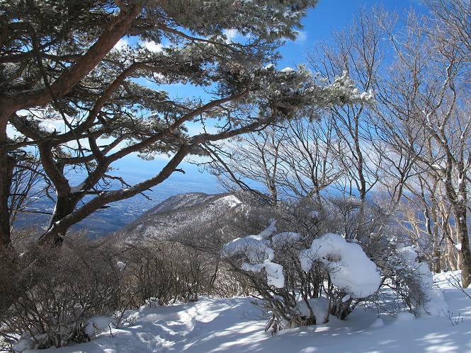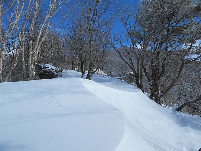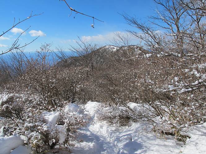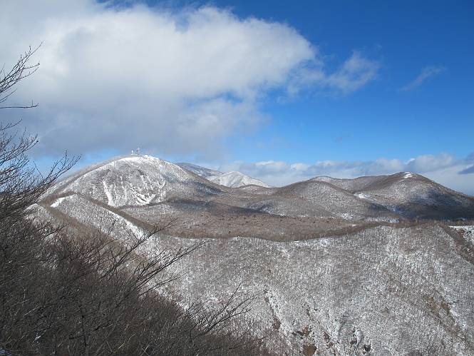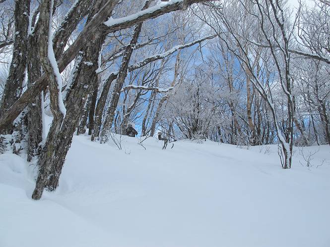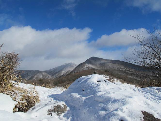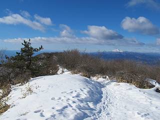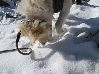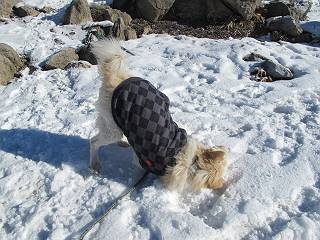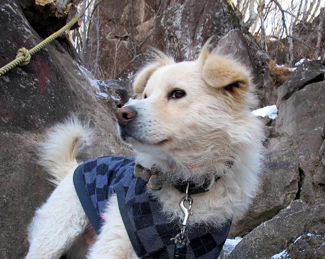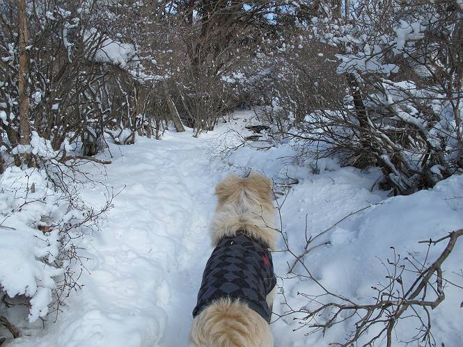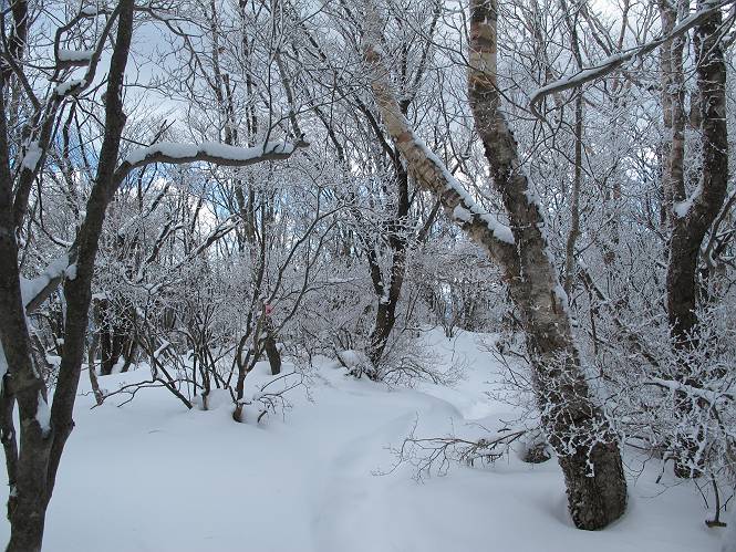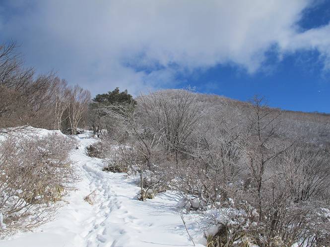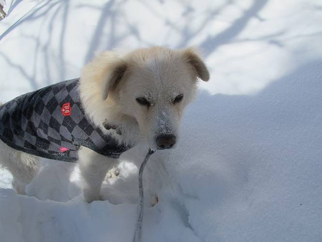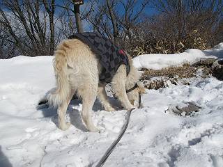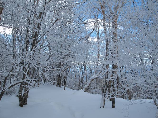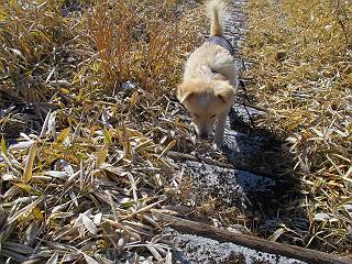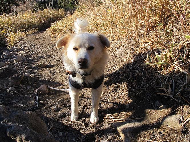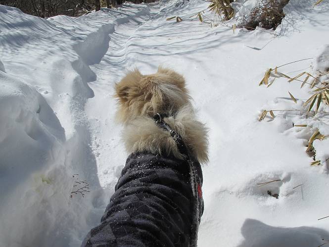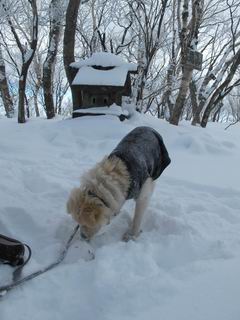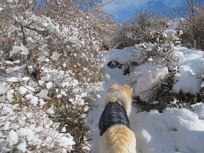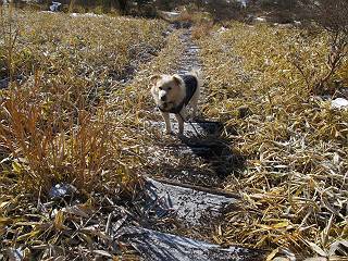平成二十六年一月十日 Before 写真集目次へ Next この冬に入って、姫百合駐車場とか竜頭の滝周辺で、ちょっと雪遊びをしましたが、山は歩いてないんです。今日は、朝の散歩を抜いて、赤城山に連れてってくれるんですって、ぼく、嬉しいな。コースはね、赤城の南面を走って北に入り込むと、青少年交流の家があります。この奥の鍋割山の登山口から入って、鍋割高原、鍋割山、荒山高原、荒山と歩き、南に下って避難小屋を通り、荒山森林公園へ下って、林道を4kmほど歩いて鍋割山登山口に戻ります。 ここが鍋割山の登山口です、矢印の方向に進みます。 はじめは、緩やかに進むのですが、荒山高原の前後で岩場を急登します。 寒さと、凍っているので怖いのです、「忠治、なに、緊張してる、スマイル、スマイルだよ」 「こんな感じはどう、ワン」 岩場を抜け、緩やかな森に出ました、いいねえ、楽しいね。でも森の中は雪が深いんだよ。 一段高い所に出て、前不動からの道と合流します。 今度は、真っ直ぐ山頂まで丸太の階段を上ります。 隣が笹の斜面なので入り込んで遊びました。 山頂の直ぐ下にきました、もう少しです。 鍋割山の山頂に着きました。 先ほど階段で下山する人に会いました、後からついてきた人は間もなく到着です。 雪をかじったり、掘ったり、引っ掻いたり、雪遊びって楽しくって。 雪の感触っていいなあ、 今度は反対側。 鍋割山から次ぎの荒山に向かいます。 いっぱい動物の足跡があるんだよ。何だろうな、ぼく、遇った事ないなあ。 荒山が見えてきました、まだ雲がとれないようです。左の地蔵岳は、真っ白、陽がさしているかな。 時々林に入り込んで遊びながら進みます。 デッカイ足だな、何だ、これ。 先端に突き出た大きな岩にやってきました。 南に富士山が、 西に浅間山が見えてます。 この先がカマド山っていうんだって。 左が地蔵岳、正面が荒山です。 綺麗に見えますが、時々雲がかかってしまいます。 また、黒い雲がやってきたようです。 ヒオコシ山を過ぎて、荒山高原へ下ります、林の中は雪が深いんだろうね。 この先で、道はジグザグしてます。 荒山高原に着きました。雲って強い風が吹いてます。荒山の山頂は陽がさしてます。 つつじの間の道にに入って行きます、踏み跡ははっきりしてます。 林の木が大きくなってきましたね、雪も増えてきました。 小枝に氷がついてます。 「雪が解けて凍ったんだろう」、とお父さんが言ってました。 だんだん大きくなって、沢山ついてます、雪もありますね、後は鍋割山です。 いっぱいついていると、きれいだねえ。 氷と雪のあいだっこか、透き通ってないのが多くなってきた。 あっ、気持ちいい、顔がすっぽり入っちゃうよ、ほらっ。 大きな松ノ木が出てきたねえ 木が大きくなってきたねえ。 大分上の方は白くなってきたね。 また、荒山の山頂が見えてきたね。 後には鍋割山が見えてるよ。 これはスゴイ、吹き溜まりだね、深そう。 「ぼく、怖くて歩けないよう、ズボッと入っちゃいそう、お父さん先に行って」。 「ヨシッ、大丈夫だからついて来な」 吹き溜まりの度にこんなことして進みました。歩いた跡が消えてないんです。 上の方にきたら、真っ白くなってきましたね。 ここも深そうだなあ、こっちかな、そっちかな。 スゴイ雪が飛んでいるぞ。 やっと山頂直ぐ下の岩場に進みましたが、滑って落ちちゃうんですよ。上の雪がパウダーで下の雪が凍っているんです。ここもお父さんが先に進みました。 でもね、ここまで来ると山頂はすぐそこだって。 見えたぞ、足跡なんか全然ないね、真っ白だ。 荒山山頂に到着しました。早速。記念写真を撮りましょう。後から岩場の手前からずっと、ついてました。お礼を言ってましたよ。 山頂でオヤツをもらいました。足にできた氷タマをとっていると、お父さんがボリボリとっちゃいました。 山頂の雪景色です。 花が咲いたようですね。 さっきのおじさんが、ぼくたちが南をまわると言ったら、ついて行って良いかって。 ひさし岩まで下りました。道は2,3ヶ所消えてましたが、目印とか、木の枝ぶりで大体わかるんだってさ。 ひさし岩から地蔵岳、右奥に黒檜山と駒ケ岳、右側に長七郎山が見えました。 避難小屋から次ぎの十字路まで進みます、途中で荒山高原からきた人に会い、後の方は安心したようです。ぼくたちは真っ直ぐ荒山森林公園の方へ進みます。 十字路で、お休みです。ぼくは、雪を落としています。 ここからは、雪も徐々減って、 ドロンコの道も出てきました。 また、ちょっと藪の中で遊んできました。 もう雪がほとんどなくなりました。お父さんは脱いでザックに詰め込んでます。 荒山森林公園の駐車場まで下りました。あとは林道歩きです。 この道は4kmほどあるようです。ブラブラしながら歩いてます、お腹がすいたなあ。 おお、ぼくんちの車が見えました。ぐるっと周って雪遊び楽しかったなあ。 「お父さん、またお願いしま