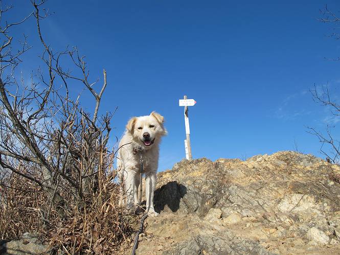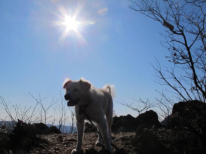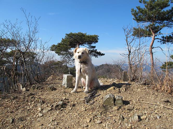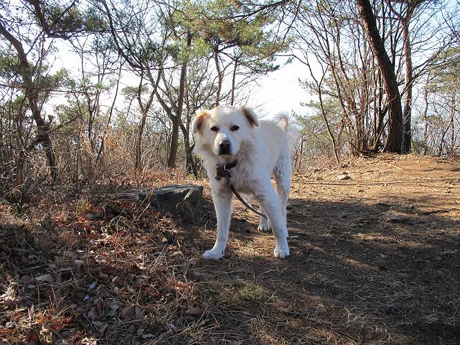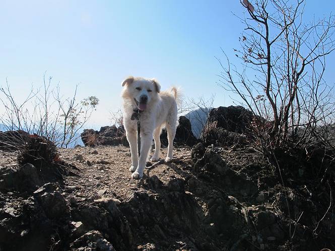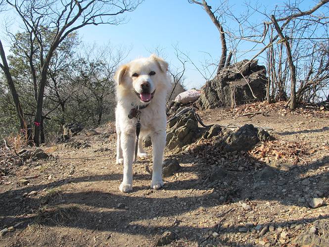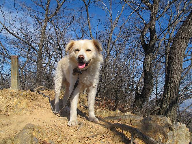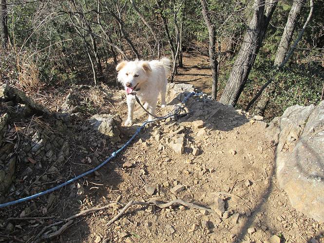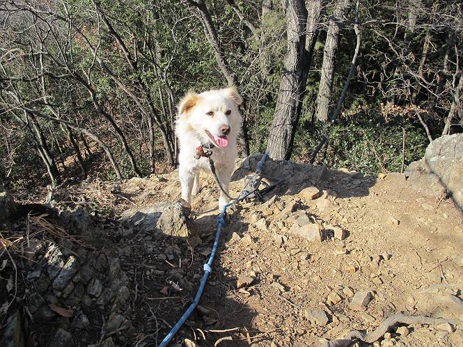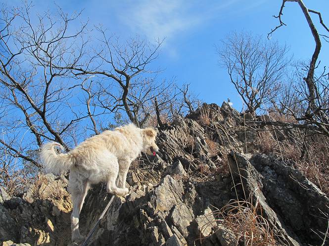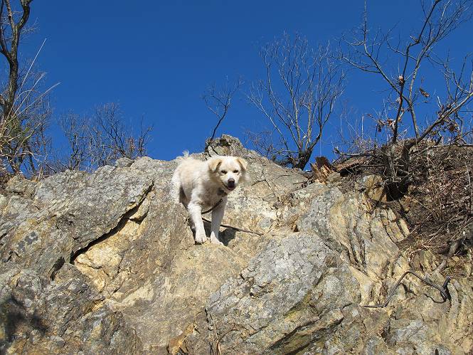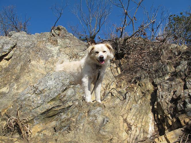 平成二十六年一月二十四日 Before 写真集目次へ Next 今日は「春のような暖かい日になる」という天気予報に誘われて、足利の大坊山・大小山をぐるっと一回りしてきました。沢山のハイカーに会いましたね、ざっと30人ほどです。シャツも邪魔になって、ちょっと歩いたところで、脱いでしまいました。お水もいっぱい飲んじゃったね。 大山祇神社前の駐車場からスタートです。 まず、木段を上って、ジグザグの道を進んで尾根道に出ます。 点々と生えた、赤松の間を緩やかに上って行きます。 灯篭付近で平らになり、 後の鳥居をくぐって、石段を上ると、大坊山山頂です。 ここが山頂で、右奥に祠があります。 「忠治、耳、どうした」、「ちょっと・・・・・・」 「何か入ったのかな?」 「大丈夫か」、「平気だよ」 「耳を見ても異常なしだ」、「大丈夫だよ」 連続した岩尾根を上ったり、下ったり、 「やっぱり、変だなあ、・・・・・」 「何だろうね」、「痛くはないようだな?」、・・・採石場の崖の上を越えて、 急坂を下り、越床峠に出ました。ここからも下って戻れますが、このまま大小山へ向かいます。 越床峠から東方向のピークに出ました。お休みして、オヤツを頂きました。 また、岩尾根が連続します、上ったり、下ったり、楽しいところです。 足利の街が見えます 大坊山です。 楽しいな、上ったり、下ったり、 また、お休みです。耳は治っちゃったみたい、もう普通でしょう? 結構、危ない岩場もありました。 危険な岩はお父さんが、先に行って、リードをしっかり持ってくれます。 ぼくが立ち止まると、「忠治、待て」、と言って、ぼくの先に行くんだよね。 大小山の西のピークまで来ました。 ここからも下れるんだって、でも耳は大丈夫そうだし、良かった。 あの高い方が妙義山で、右が大小山です。 ここ、ザイルの下がった岩場が、ぼくには難所です。この前は、お尻を押してもらって上りましが、 今日は、お父さんが先に行って、3回に分けて、ひとりで上れました。 もう少しで、妙義山の天辺だ。 山頂が見えたぞ。 ここが三角点のある妙義山の山頂です。 記念写真を撮ってもらい、お休みしました。耳、何でもないでしょう。 誰もいなくなってしまいました、そろそろ下ります。 ぼくには、この山の下りは簡単なんだよ。 ポン、ポン、ポンだよ。 あっという間に、大小山の山頂です、後が妙義山です。ここから岩尾根が続きます。 やまゆり学園まで下りました。 道路を歩いて、 大坊山の東の団地に出ました。 駐車場はこの上だそうです。 遊歩道を上っていきます。 この先が駐車場です。 広場で遊んでいたら、「忠治、忠治」、と呼ぶんです。 あわてて、「待って」、と車のところへ。 ちょっと霞んでいたけど、今日は陽だまりハイクに良いお天気でした、楽しかったなあ。 Before 写真集目次へ Next |