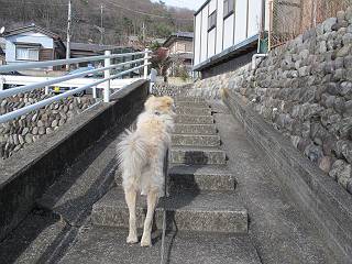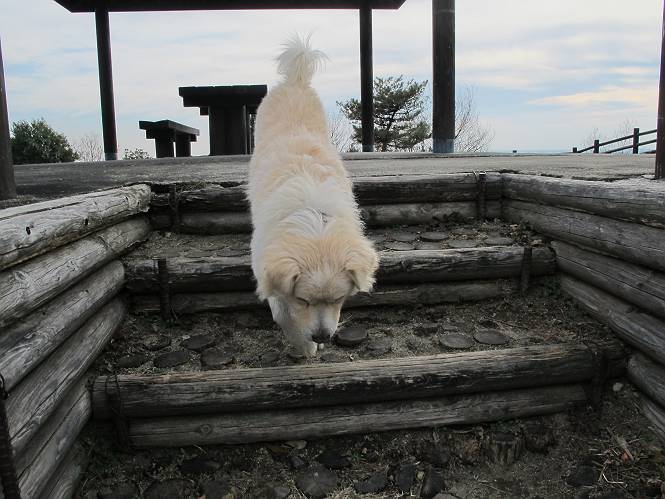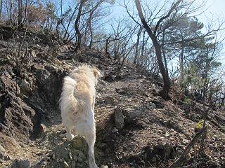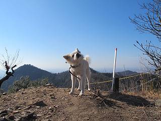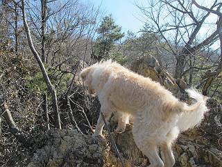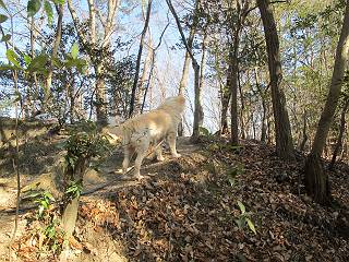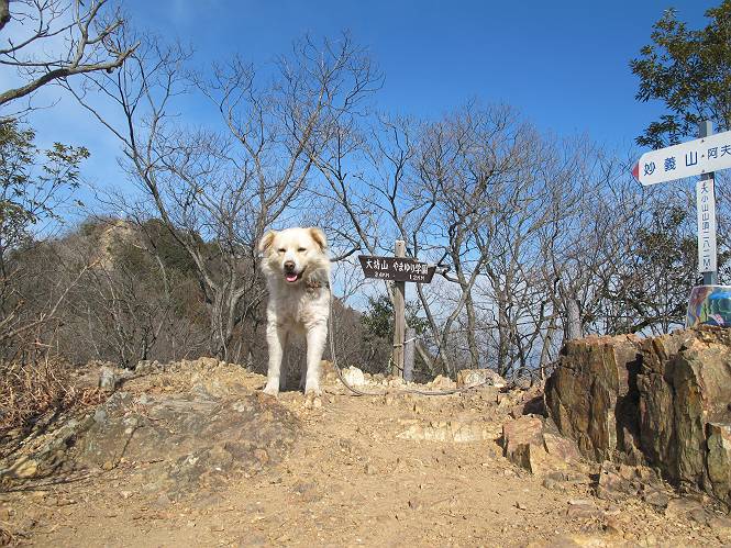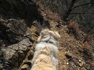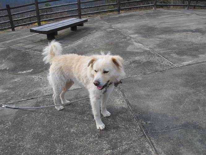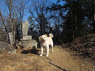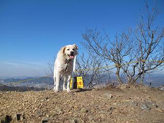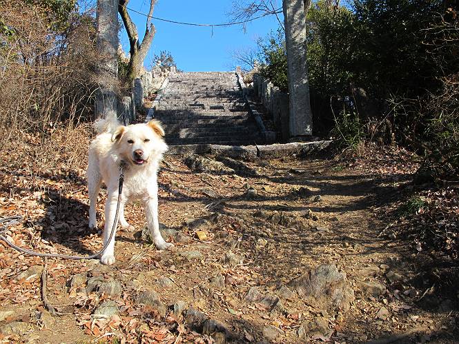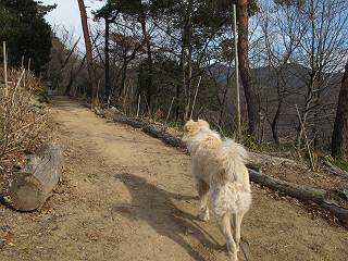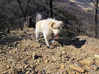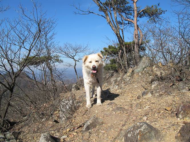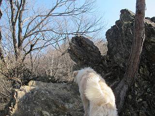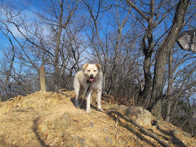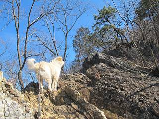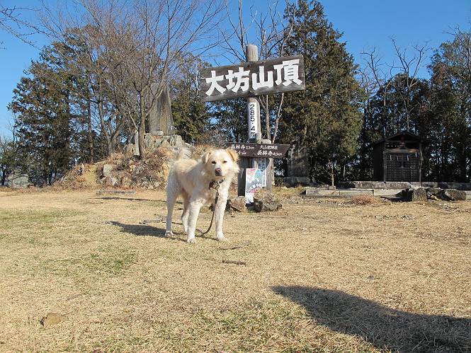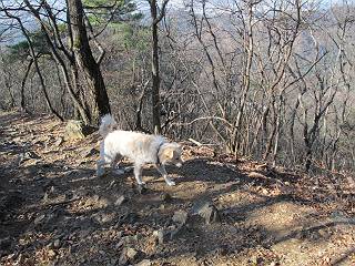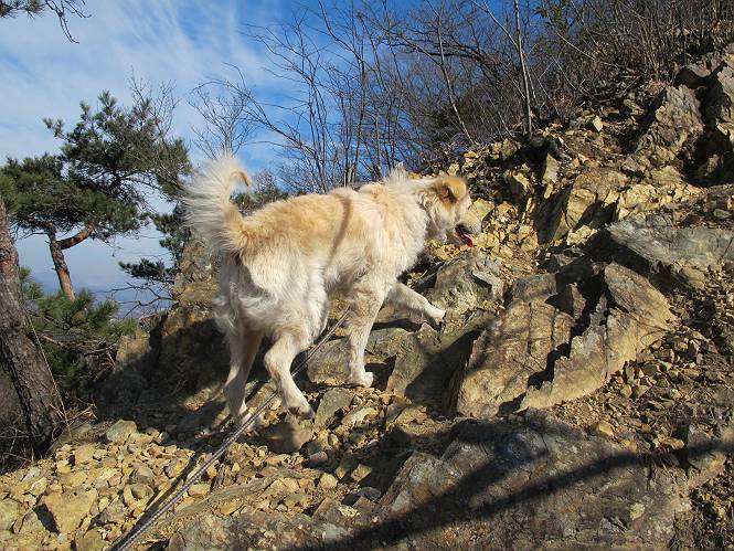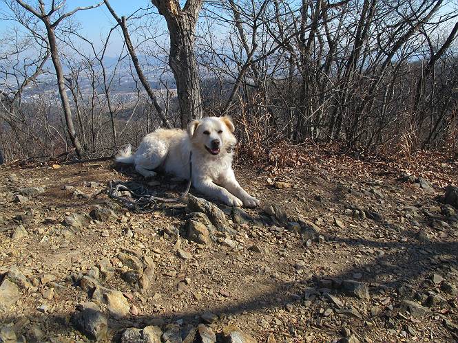 平成二十六年一月二十四日 Before 写真集目次へ Next 今日は「春のような暖かい日になる」という天気予報に誘われて、足利の大坊山・大小山をぐるっと一回りしてきました。沢山のハイカーに会いましたね、ざっと30人ほどです。シャツも邪魔になって、ちょっと歩いたところで、脱いでしまいました。お水もいっぱい飲んじゃったね。 大山祇神社前の駐車場からスタートです。 まず、木段を上って、ジグザグの道を進んで尾根道に出ます。 点々と生えた、赤松の間を緩やかに上って行きます。 灯篭付近で平らになり、 後の鳥居をくぐって、石段を上ると、大坊山山頂です。 ここが山頂で、右奥に祠があります。 「忠治、耳、どうした」、「ちょっと・・・・・・」 「何か入ったのかな?」 「大丈夫か」、「平気だよ」 「耳を見ても異常なしだ」、「大丈夫だよ」 連続した岩尾根を上ったり、下ったり、 「やっぱり、変だなあ、・・・・・」 「何だろうね」、「痛くはないようだな?」、・・・採石場の崖の上を越えて、 急坂を下り、越床峠に出ました。ここからも下って戻れますが、このまま大小山へ向かいます。 越床峠から東方向のピークに出ました。お休みして、オヤツを頂きました。 また、岩尾根が連続します、上ったり、下ったり、楽しいところです。 足利の街が見えます 大坊山です。 楽しいな、上ったり、下ったり、 また、お休みです。耳は治っちゃったみたい、もう普通でしょう? 結構、危ない岩場もありました。 危険な岩はお父さんが、先に行って、リードをしっかり持ってくれます。 ぼくが立ち止まると、「忠治、待て」、と言って、ぼくの先に行くんだよね。 大小山の西のピークまで来ました。 ここからも下れるんだって、でも耳は大丈夫そうだし、良かった。 あの高い方が妙義山で、右が大小山です。 ここ、ザイルの下がった岩場が、ぼくには難所です。この前は、お尻を押してもらって上りましが、 今日は、お父さんが先に行って、3回に分けて、ひとりで上れました。 もう少しで、妙義山の天辺だ。 山頂が見えたぞ。 ここが三角点のある妙義山の山頂です。 記念写真を撮ってもらい、お休みしました。耳、何でもないでしょう。 誰もいなくなってしまいました、そろそろ下ります。 ぼくには、この山の下りは簡単なんだよ。 ポン、ポン、ポンだよ。 あっという間に、大小山の山頂です、後が妙義山です。ここから岩尾根が続きます。 やまゆり学園まで下りました。 道路を歩いて、 大坊山の東の団地に出ました。 駐車場はこの上だそうです。 遊歩道を上っていきます。 この先が駐車場です。 広場で遊んでいたら、「忠治、忠治」、と呼ぶんです。 あわてて、「待って」、と車のところへ。 ちょっと霞んでいたけど、今日は陽だまりハイクに良いお天気でした、楽しかったなあ。 Before 写真集目次へ Next |