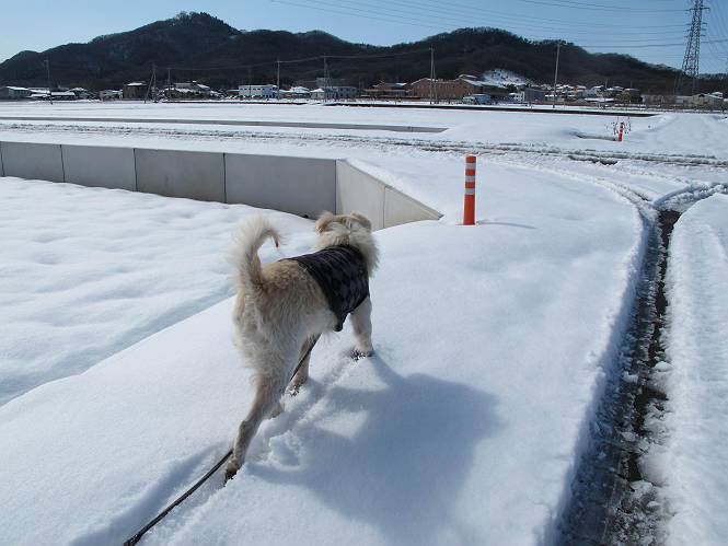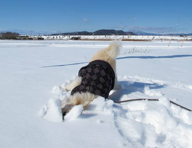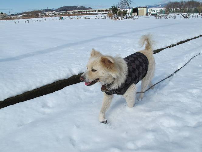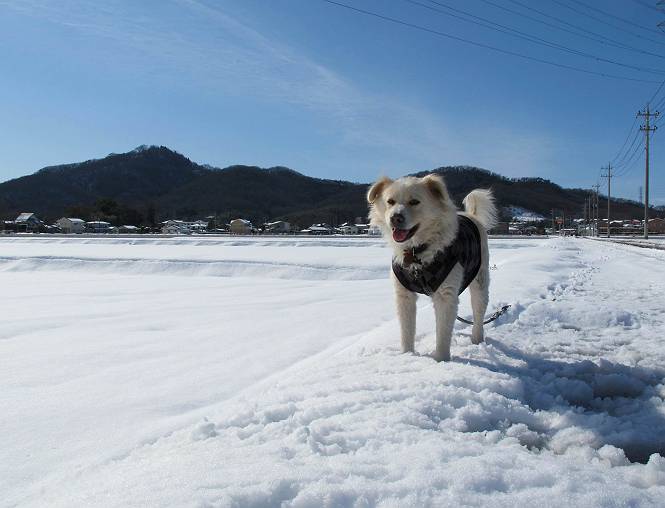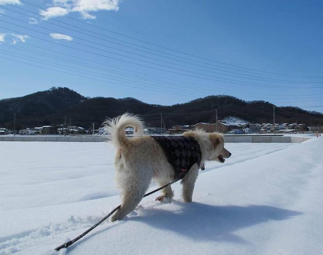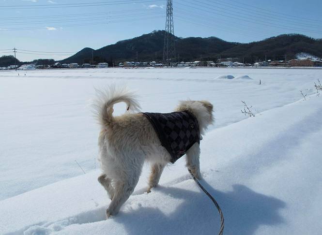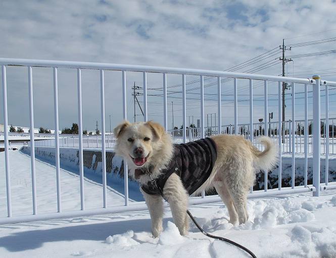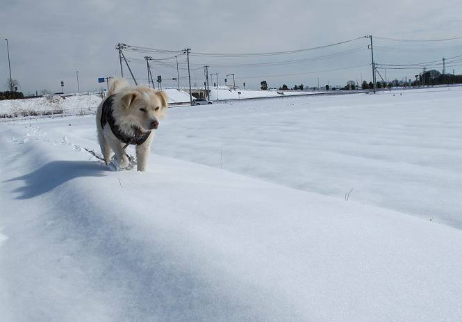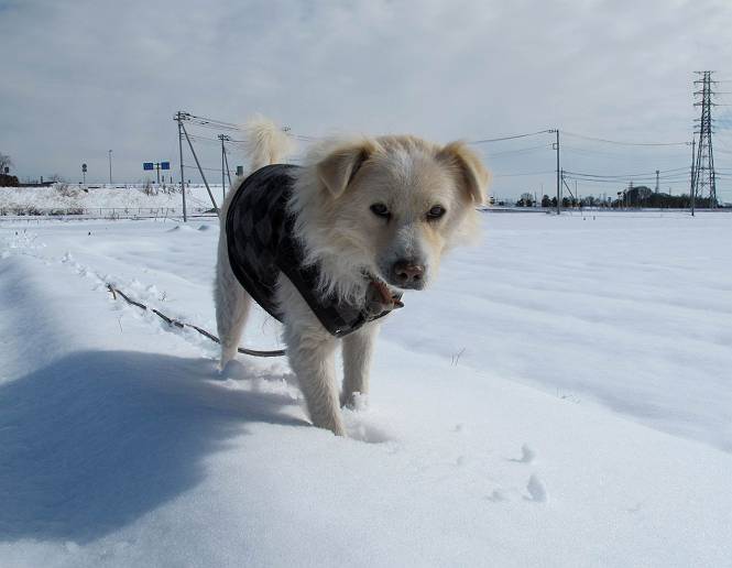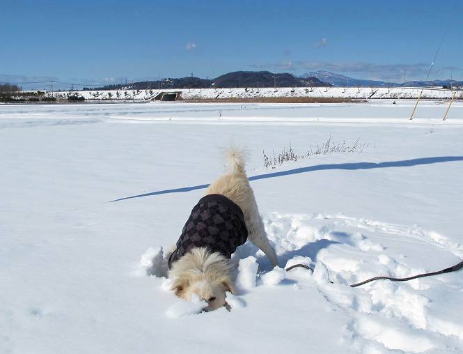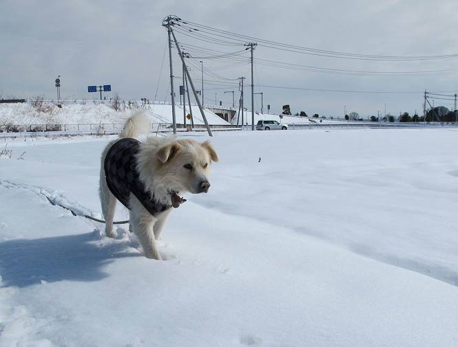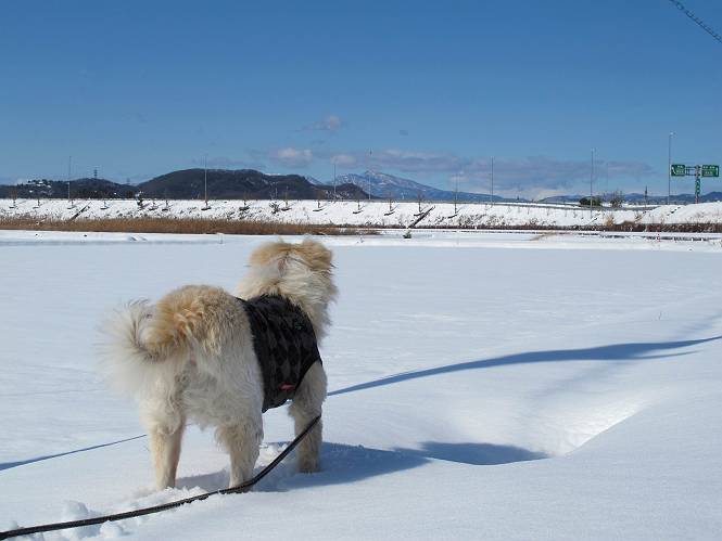 平成二十六年二月九日 Before 写真集目次へ Next 昨日は、今年2回目の雪でした。どこもかしこもいっぱい降ったんですってね。ぼくの家の庭は、「軽く30センチ積もった」、とお父さんがスケールをあててました。そんなわけで、夕べは玄関に泊まりました。朝の散歩は、まだ足も治らないし、お父さんの雪かきもあって、午後になりました。歩けそうな場所まで、車に乗って行きました。結局、いつもの散歩コース付近でした。 ぼくんちも雪でいっぱい お庭は30センチ積もったんだってさ インターチェンジの南の田圃のまわりを一周します。 あっちへ真っ直ぐ歩いて行こう。 雪、いいねえ、♪、♪、♪ 「忠治、足、大丈夫か」 「靴がちょっと邪魔だけど、 痛くはないよ」 「ゆっくり歩きな」 全然寒くないなあ。 これ、どっちへ行こうかな、真っ直ぐ行こう。 今度は、どっちかな。 左へ行ってみよう。 この道は、真っ直ぐは、行けないんだよ、なんでかな? 道がないんです。 どんどん、行っちゃうぞ。 ぼく、ゆっくりだけど、走ってます、雪がふわふわだから、痛くないよ。 なんだ、臭うぞ。 だれか、○○○○したのかな。 良い感じだね、お山の雪も楽しいけど、雪の田圃もいいなあ。 「忠治、靴下をどこかで脱いじゃったな」 「いいって、歩きやすくなったよ」 もう少しで、車に着いちゃうぞ、 あーあ、どこかで・・・・・。 そうだ、あそこで遊んでいこう。 雪の感触っていいなあ、 ぼく、大好き。 今度はこっちをスリスリしちゃって、 「楽しかったよ」 「もっと遊んでいて、いい?」 よーし、今度はあそこだ。 赤城山を背に雪の中にもぐっちゃおう。 「忠治、目が見えてるぞ」、「片目だよ、・・・」 ああ、今日の散歩は楽しかった。赤城山はきれいだね。沢山降ったんだろうな。 Before 写真集目次へ Next |