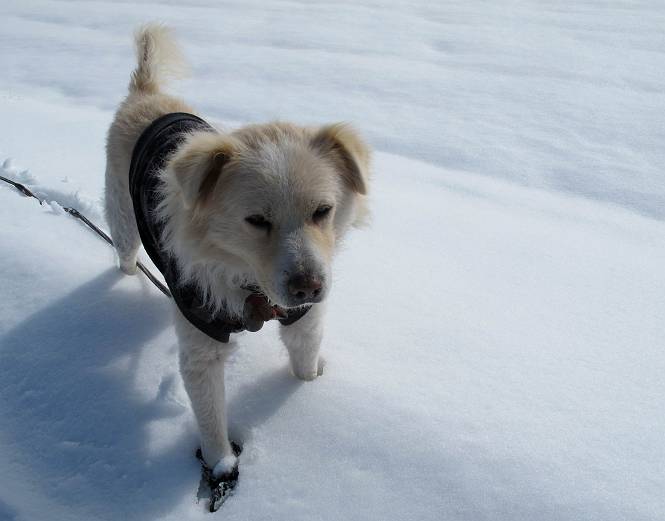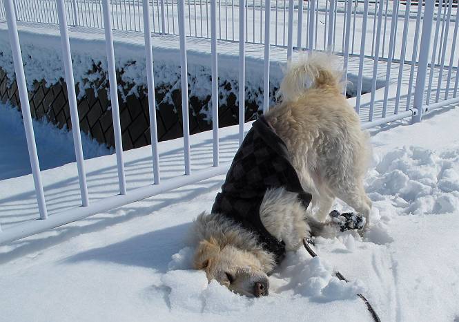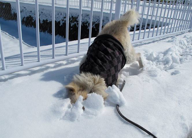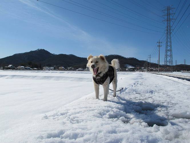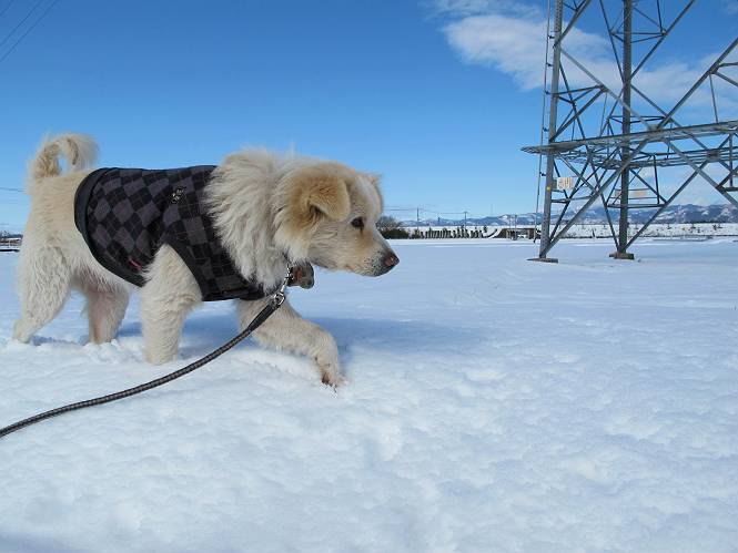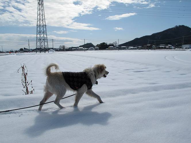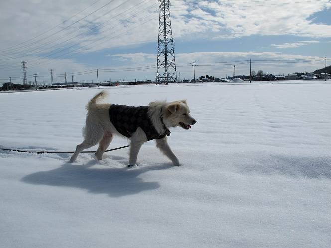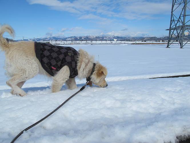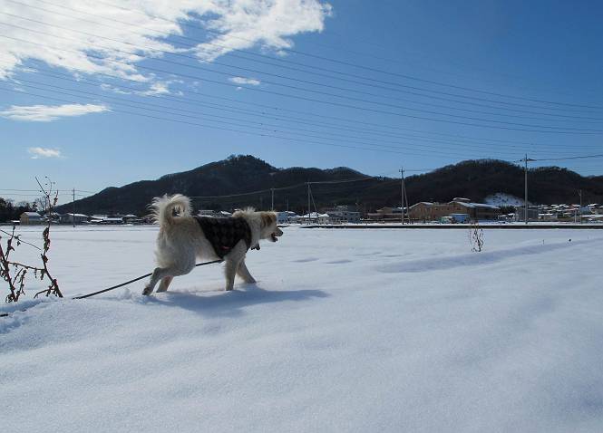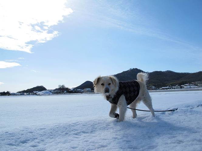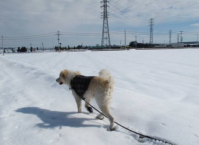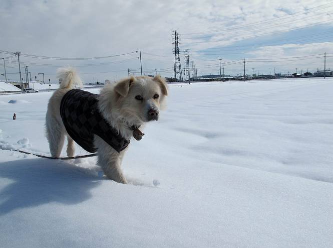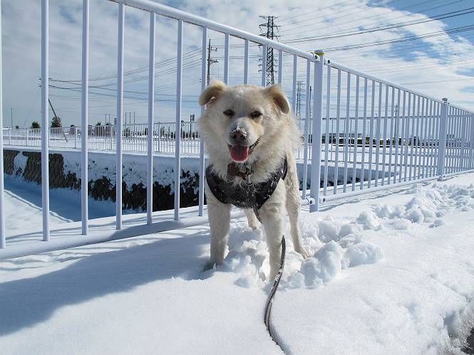 平成二十六年二月九日 Before 写真集目次へ Next 昨日は、今年2回目の雪でした。どこもかしこもいっぱい降ったんですってね。ぼくの家の庭は、「軽く30センチ積もった」、とお父さんがスケールをあててました。そんなわけで、夕べは玄関に泊まりました。朝の散歩は、まだ足も治らないし、お父さんの雪かきもあって、午後になりました。歩けそうな場所まで、車に乗って行きました。結局、いつもの散歩コース付近でした。 ぼくんちも雪でいっぱい お庭は30センチ積もったんだってさ インターチェンジの南の田圃のまわりを一周します。 あっちへ真っ直ぐ歩いて行こう。 雪、いいねえ、♪、♪、♪ 「忠治、足、大丈夫か」 「靴がちょっと邪魔だけど、 痛くはないよ」 「ゆっくり歩きな」 全然寒くないなあ。 これ、どっちへ行こうかな、真っ直ぐ行こう。 今度は、どっちかな。 左へ行ってみよう。 この道は、真っ直ぐは、行けないんだよ、なんでかな? 道がないんです。 どんどん、行っちゃうぞ。 ぼく、ゆっくりだけど、走ってます、雪がふわふわだから、痛くないよ。 なんだ、臭うぞ。 だれか、○○○○したのかな。 良い感じだね、お山の雪も楽しいけど、雪の田圃もいいなあ。 「忠治、靴下をどこかで脱いじゃったな」 「いいって、歩きやすくなったよ」 もう少しで、車に着いちゃうぞ、 あーあ、どこかで・・・・・。 そうだ、あそこで遊んでいこう。 雪の感触っていいなあ、 ぼく、大好き。 今度はこっちをスリスリしちゃって、 「楽しかったよ」 「もっと遊んでいて、いい?」 よーし、今度はあそこだ。 赤城山を背に雪の中にもぐっちゃおう。 「忠治、目が見えてるぞ」、「片目だよ、・・・」 ああ、今日の散歩は楽しかった。赤城山はきれいだね。沢山降ったんだろうな。 Before 写真集目次へ Next |