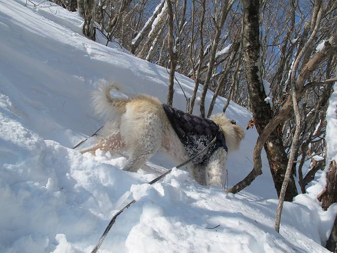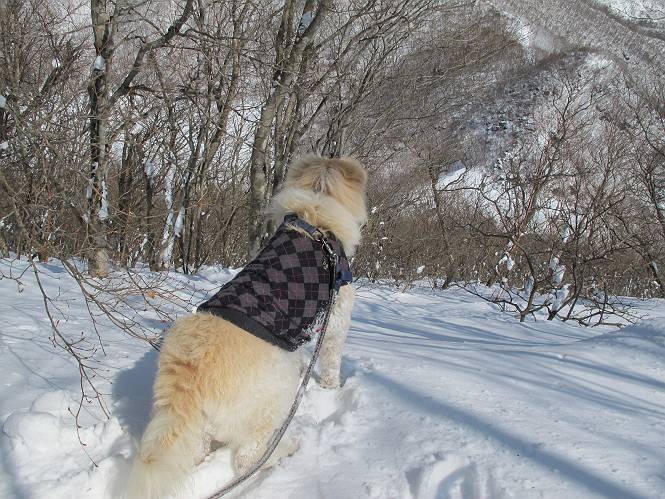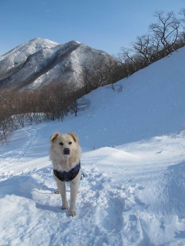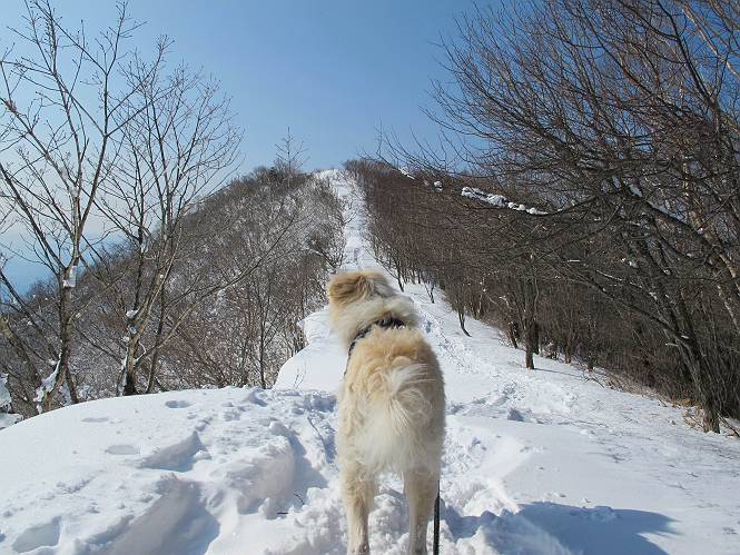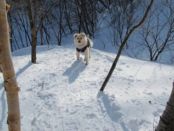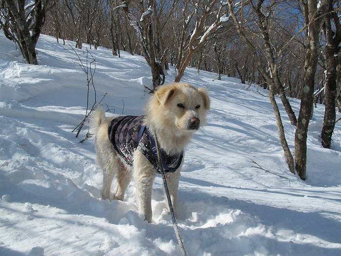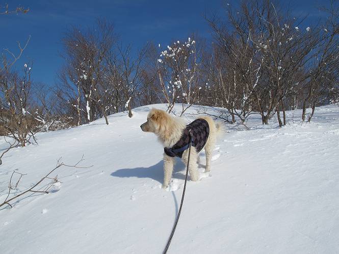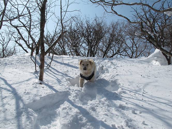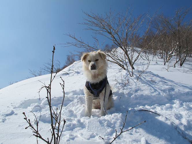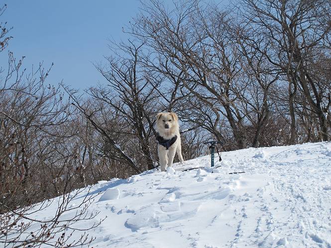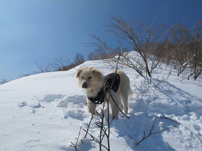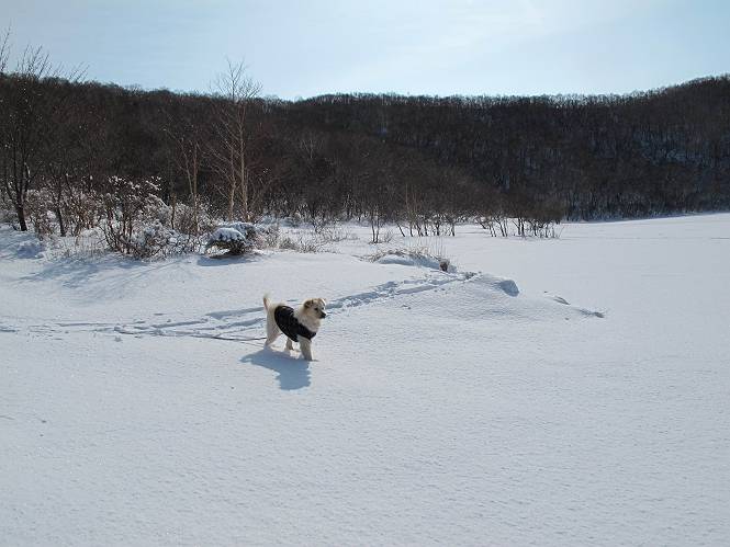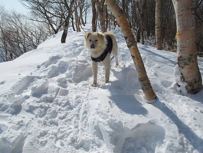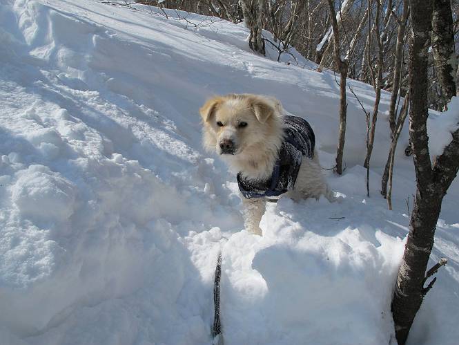 平成二十六年三月九日 Before 写真集目次へ Next 日光の高山で怪我した足を気遣って、運動は1ケ月ほど控え目にしてました。良くお便りを頂く、石塚さんちのさくらちゃんは、毎週赤城山へスノーハイクに連れてってもらっているんだって、羨ましいなあ。ぼくもやっと、「今日は、天気が良さそうだから、長七郎山を鳥居峠から一回りして来るか」、と連れてってもらいました。 鳥居峠で車から降り、早速、雪の感触を、いいなあ、赤城山の雪大好き。 小沼へ向かう遊歩道へ入ります。 「お父さん、ずっと道がついているよ」、「それは、結構なことだ」 遊歩道に上ると、駐車場と篭山、覚満淵が直ぐ下に見えました。 道は所々で、小さく回り込んでいましたが、歩き易かったですよ。 「あれっ、こんなところあったっけ」 おかしいな、と思ったら、いつもの少し先に出るようです。 お陰で、こんな良い景色が見られました、左が武尊山、右が黒檜山と駒ケ岳です。 武尊山を大きくすると、右に笠ケ岳と至仏山も見えてます。 ぼくも入れて撮ってもらいました。 出た場所は、丁度富士山の見える付近です。 ここから道を離れて真っ直ぐ小沼に下ります。 真っ白な小沼周辺の山、これも、ぼくがはじめて見る景色です。 雪は10-15cm沈みますが、歩き易い雪質です。 スノーシューの跡がアチラコチラ、いっぱいついてます もう少しで小沼に出ます。 ここは、平らな場所で、ちょっと深いですね。 また、左からスノーシューの跡が続いてます。 小沼に出たぞ、真っ白だ、ぼくには沼の姿が想像できません、別物の銀世界です。 スノーシューの跡を辿り また、真っ白い雪で・・・。 長七郎山の西斜面に取り付きました。踏み跡の無い場所を選んで上って行きます。 木々の間から地蔵岳、朝香嶺が見えます 左へ少し反れたようですが、間もなく尾根に出るそうです。 山頂のちょっと北側、雪庇の発達したところでした。 雪庇をバックに一枚撮ってもらいました。 雪庇の先の盛り上がった場所が長七郎山の山頂です。 今は、雪が大きく盛り上がって、標柱は雪の下だそうです。 見晴らしが良いですね。駒ケ岳の右側を見てます、日光白根山、皇海山、袈裟丸山ですって。 北側で赤城山の最高峰、黒檜山です。 黒檜山、その手前に駒ケ岳、左に武尊山、右に日光白根山です。 こちらは荒山の方向です。 荒山と右遠方に真っ白な浅間山が見えてます。 オヤツを頂いて、足に凍りついた雪を落として、そろそろ小地蔵岳に進むそうです。 雪庇の尾根を北方向に歩いてます。 雪庇って、大きくなるんですね。 沢山の人が昨日歩いた跡かな。 ここからツツジの間を歩きます。 この辺に大きな吹き溜まりがあったようですが? 小地蔵岳の分岐点が見えました。 ここから緩やかに少し上ります。 後は長七郎山です。 おやっ、何だか辺だぞ。 大きな吹き溜まりが出来ていました。 吹き溜まりから地蔵岳を撮りました、雪の無い季節はヤブヤブのところです。。 ぼくも一枚記念に。 確か、この辺が小地蔵岳の山頂と思いますが? ここから北方向に真っ直ぐ下れば出発点の鳥居峠に出られるそうです。急斜面で雪が深いので、お父さんが前を歩いて、ぼくが続きます。 ヤブの中ばかりでは面白くないので、東側の雪庇に沿って下るそうです。 「イヤー、絶景」 山頂方向の雪庇です、あまり先端へ出ると危険です。 黒檜山と手前が昨日さくらちゃんが登った駒ケ岳です。 こんな格好で一枚、どうでしょうか。 木がなくて歩き易いですよ、でも危ない場所ですよね。 もうこの辺から、ヤブに入って真っ直ぐ進むようです。 急斜面、吹き溜まりで凸凹してます。 お父さんの後を走ってついてます。 「あれっ、・・・・」 「鳥居峠だよ、もう着いたんだ、あれ、篭山だ」 一周を終えて、鳥居峠から覚満淵と駒ケ岳を眺めてます。 ぼくの足、何でもなかったよ、これでもう大丈夫かな。今度はどこへ連れてってくれるのかなあ。 Before 写真集目次へ Next |