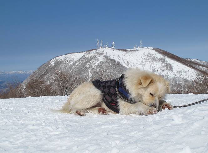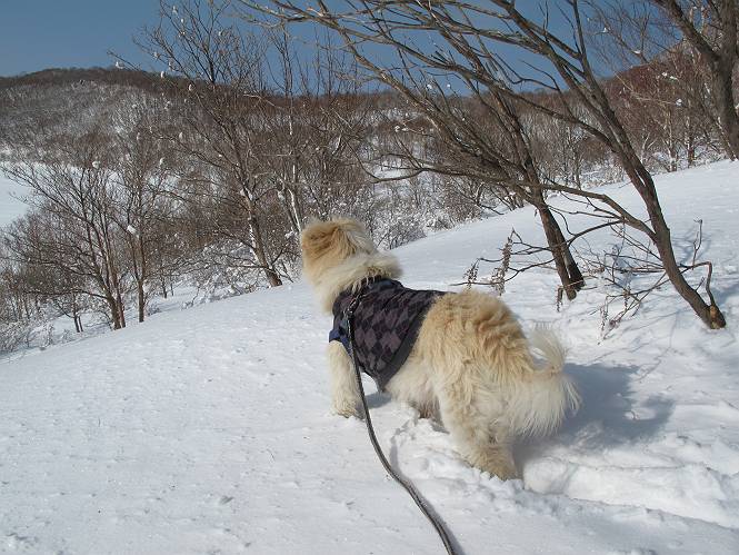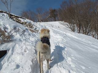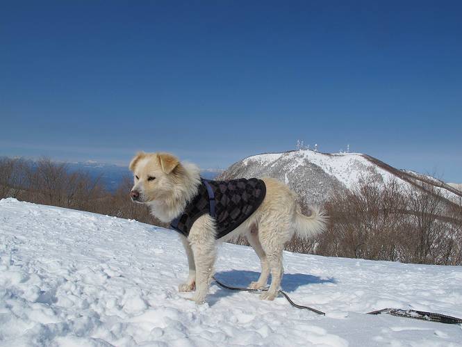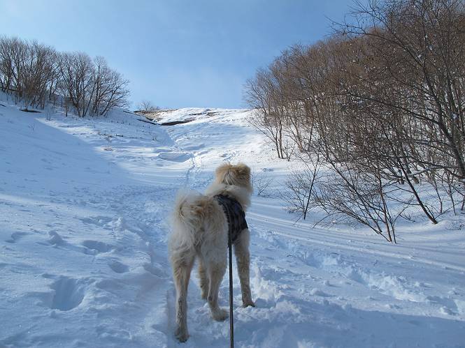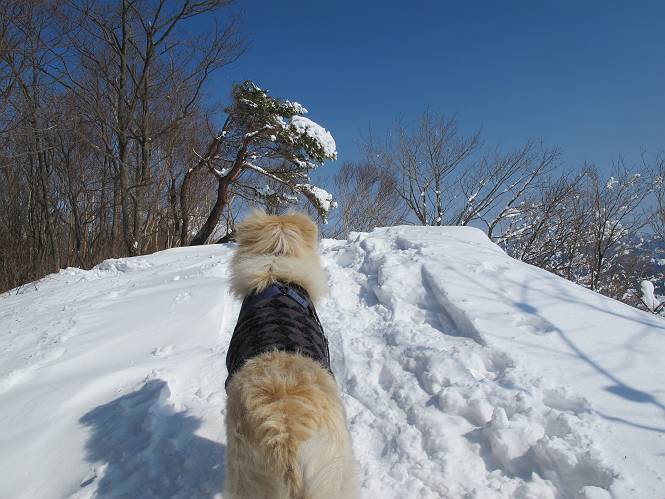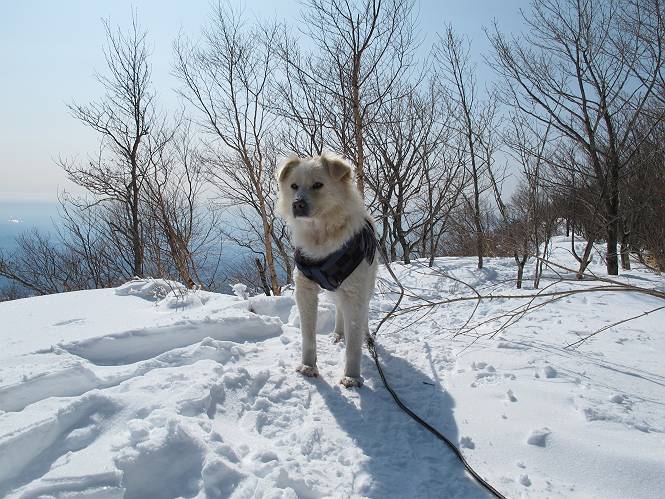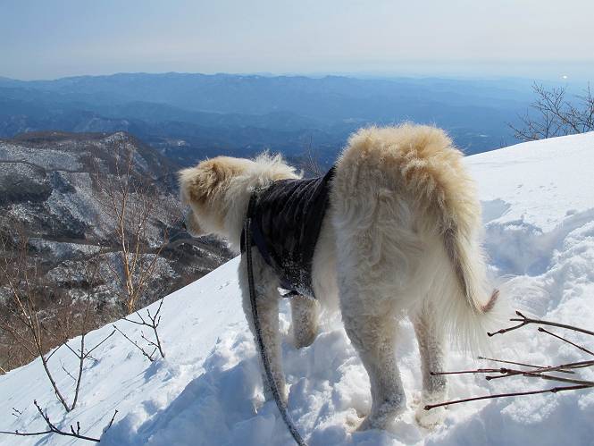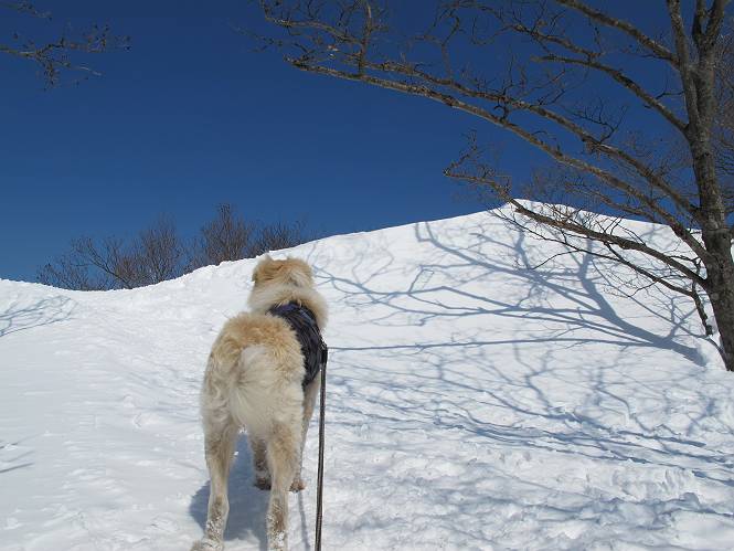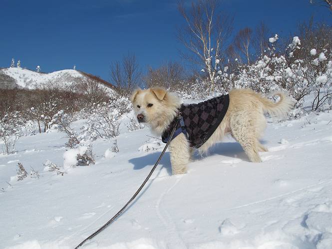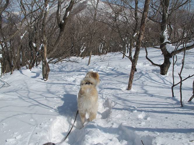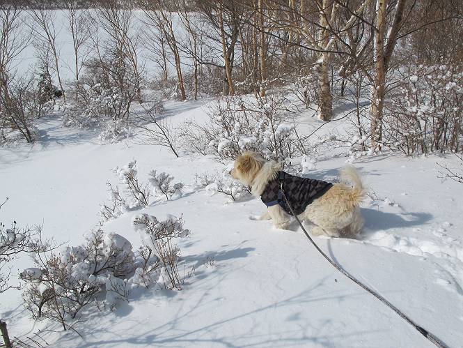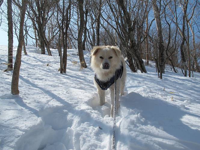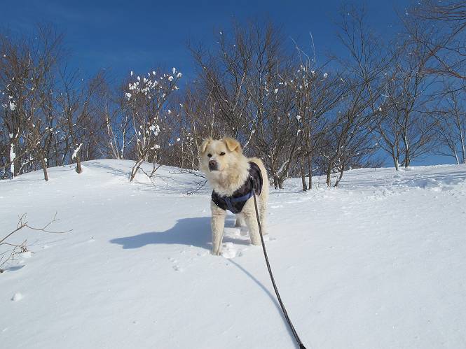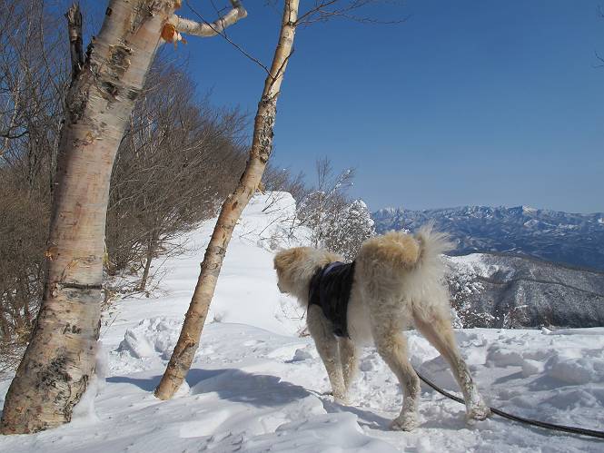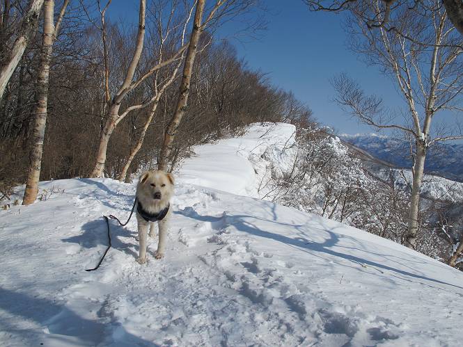 平成二十六年三月九日 Before 写真集目次へ Next 日光の高山で怪我した足を気遣って、運動は1ケ月ほど控え目にしてました。良くお便りを頂く、石塚さんちのさくらちゃんは、毎週赤城山へスノーハイクに連れてってもらっているんだって、羨ましいなあ。ぼくもやっと、「今日は、天気が良さそうだから、長七郎山を鳥居峠から一回りして来るか」、と連れてってもらいました。 鳥居峠で車から降り、早速、雪の感触を、いいなあ、赤城山の雪大好き。 小沼へ向かう遊歩道へ入ります。 「お父さん、ずっと道がついているよ」、「それは、結構なことだ」 遊歩道に上ると、駐車場と篭山、覚満淵が直ぐ下に見えました。 道は所々で、小さく回り込んでいましたが、歩き易かったですよ。 「あれっ、こんなところあったっけ」 おかしいな、と思ったら、いつもの少し先に出るようです。 お陰で、こんな良い景色が見られました、左が武尊山、右が黒檜山と駒ケ岳です。 武尊山を大きくすると、右に笠ケ岳と至仏山も見えてます。 ぼくも入れて撮ってもらいました。 出た場所は、丁度富士山の見える付近です。 ここから道を離れて真っ直ぐ小沼に下ります。 真っ白な小沼周辺の山、これも、ぼくがはじめて見る景色です。 雪は10-15cm沈みますが、歩き易い雪質です。 スノーシューの跡がアチラコチラ、いっぱいついてます もう少しで小沼に出ます。 ここは、平らな場所で、ちょっと深いですね。 また、左からスノーシューの跡が続いてます。 小沼に出たぞ、真っ白だ、ぼくには沼の姿が想像できません、別物の銀世界です。 スノーシューの跡を辿り また、真っ白い雪で・・・。 長七郎山の西斜面に取り付きました。踏み跡の無い場所を選んで上って行きます。 木々の間から地蔵岳、朝香嶺が見えます 左へ少し反れたようですが、間もなく尾根に出るそうです。 山頂のちょっと北側、雪庇の発達したところでした。 雪庇をバックに一枚撮ってもらいました。 雪庇の先の盛り上がった場所が長七郎山の山頂です。 今は、雪が大きく盛り上がって、標柱は雪の下だそうです。 見晴らしが良いですね。駒ケ岳の右側を見てます、日光白根山、皇海山、袈裟丸山ですって。 北側で赤城山の最高峰、黒檜山です。 黒檜山、その手前に駒ケ岳、左に武尊山、右に日光白根山です。 こちらは荒山の方向です。 荒山と右遠方に真っ白な浅間山が見えてます。 オヤツを頂いて、足に凍りついた雪を落として、そろそろ小地蔵岳に進むそうです。 雪庇の尾根を北方向に歩いてます。 雪庇って、大きくなるんですね。 沢山の人が昨日歩いた跡かな。 ここからツツジの間を歩きます。 この辺に大きな吹き溜まりがあったようですが? 小地蔵岳の分岐点が見えました。 ここから緩やかに少し上ります。 後は長七郎山です。 おやっ、何だか辺だぞ。 大きな吹き溜まりが出来ていました。 吹き溜まりから地蔵岳を撮りました、雪の無い季節はヤブヤブのところです。。 ぼくも一枚記念に。 確か、この辺が小地蔵岳の山頂と思いますが? ここから北方向に真っ直ぐ下れば出発点の鳥居峠に出られるそうです。急斜面で雪が深いので、お父さんが前を歩いて、ぼくが続きます。 ヤブの中ばかりでは面白くないので、東側の雪庇に沿って下るそうです。 「イヤー、絶景」 山頂方向の雪庇です、あまり先端へ出ると危険です。 黒檜山と手前が昨日さくらちゃんが登った駒ケ岳です。 こんな格好で一枚、どうでしょうか。 木がなくて歩き易いですよ、でも危ない場所ですよね。 もうこの辺から、ヤブに入って真っ直ぐ進むようです。 急斜面、吹き溜まりで凸凹してます。 お父さんの後を走ってついてます。 「あれっ、・・・・」 「鳥居峠だよ、もう着いたんだ、あれ、篭山だ」 一周を終えて、鳥居峠から覚満淵と駒ケ岳を眺めてます。 ぼくの足、何でもなかったよ、これでもう大丈夫かな。今度はどこへ連れてってくれるのかなあ。 Before 写真集目次へ Next |