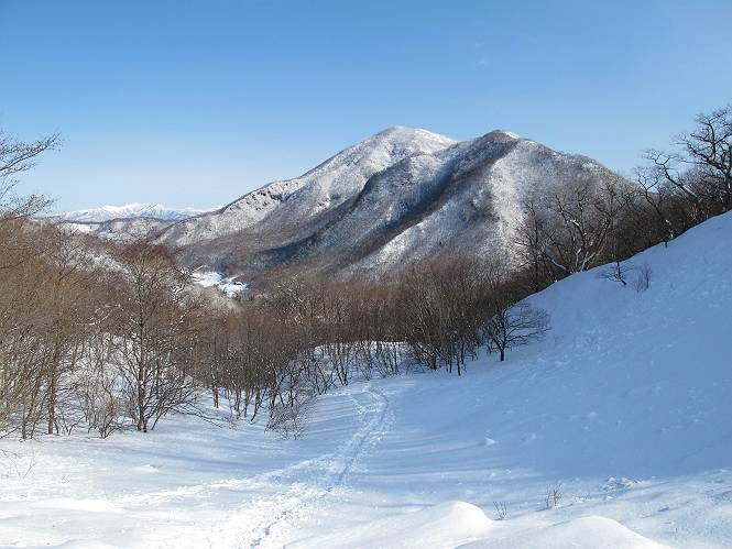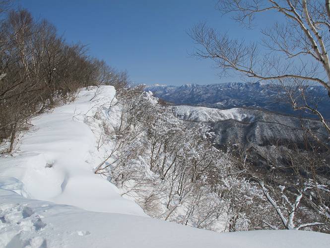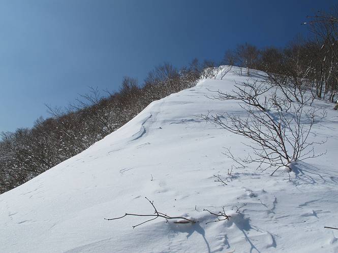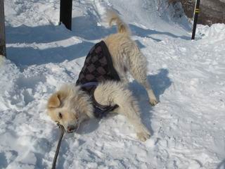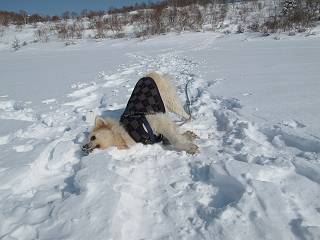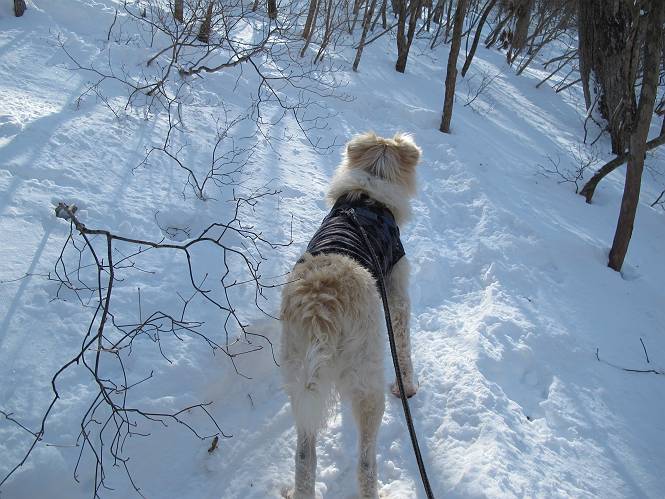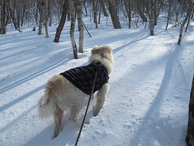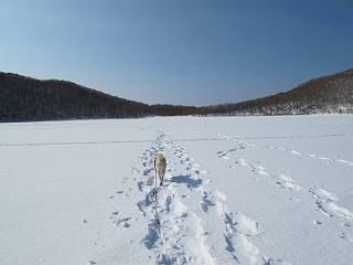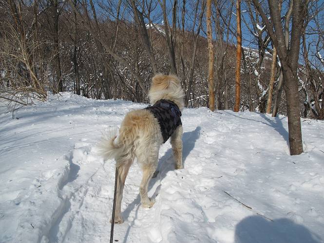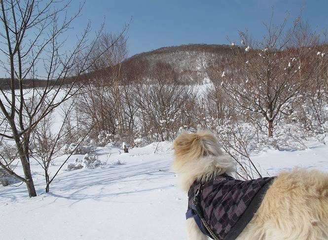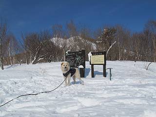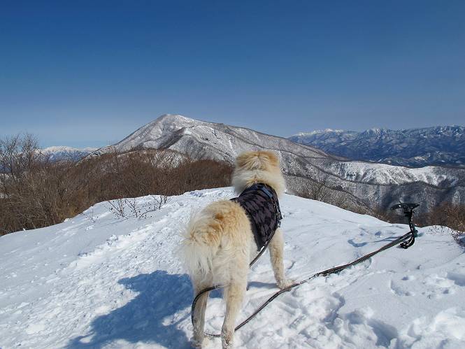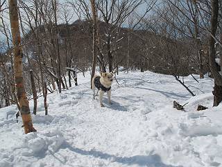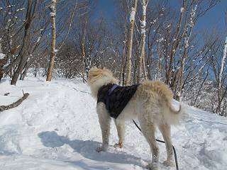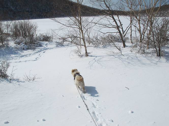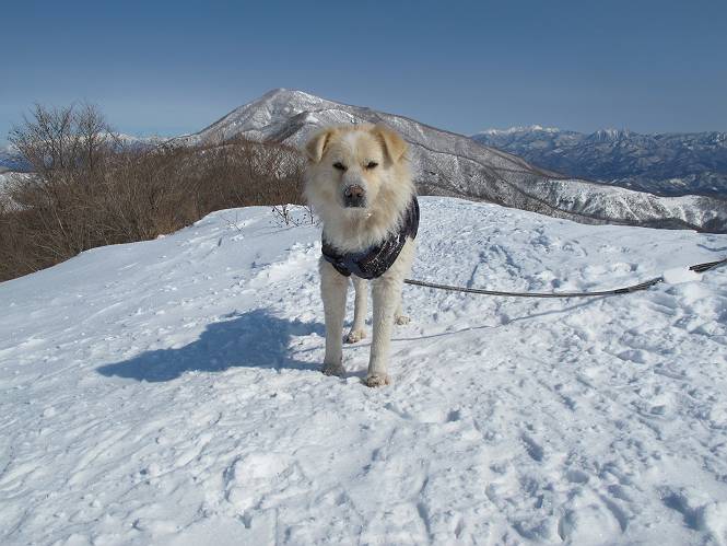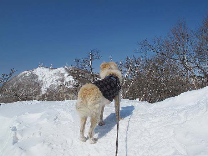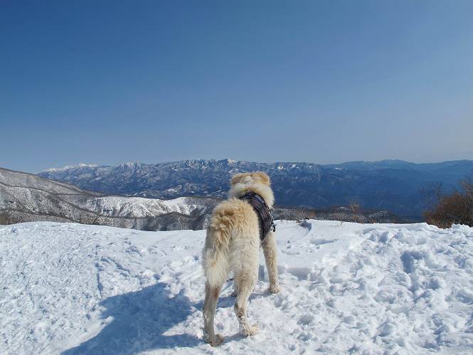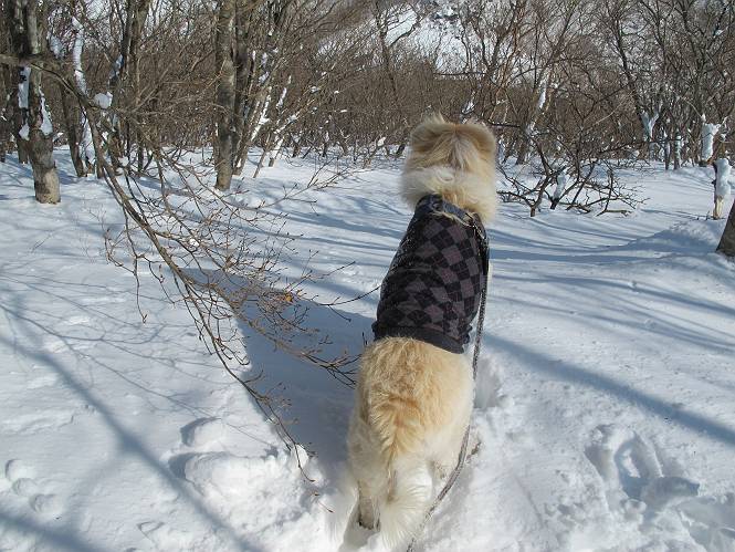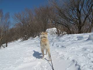 平成二十六年三月九日 Before 写真集目次へ Next 日光の高山で怪我した足を気遣って、運動は1ケ月ほど控え目にしてました。良くお便りを頂く、石塚さんちのさくらちゃんは、毎週赤城山へスノーハイクに連れてってもらっているんだって、羨ましいなあ。ぼくもやっと、「今日は、天気が良さそうだから、長七郎山を鳥居峠から一回りして来るか」、と連れてってもらいました。 鳥居峠で車から降り、早速、雪の感触を、いいなあ、赤城山の雪大好き。 小沼へ向かう遊歩道へ入ります。 「お父さん、ずっと道がついているよ」、「それは、結構なことだ」 遊歩道に上ると、駐車場と篭山、覚満淵が直ぐ下に見えました。 道は所々で、小さく回り込んでいましたが、歩き易かったですよ。 「あれっ、こんなところあったっけ」 おかしいな、と思ったら、いつもの少し先に出るようです。 お陰で、こんな良い景色が見られました、左が武尊山、右が黒檜山と駒ケ岳です。 武尊山を大きくすると、右に笠ケ岳と至仏山も見えてます。 ぼくも入れて撮ってもらいました。 出た場所は、丁度富士山の見える付近です。 ここから道を離れて真っ直ぐ小沼に下ります。 真っ白な小沼周辺の山、これも、ぼくがはじめて見る景色です。 雪は10-15cm沈みますが、歩き易い雪質です。 スノーシューの跡がアチラコチラ、いっぱいついてます もう少しで小沼に出ます。 ここは、平らな場所で、ちょっと深いですね。 また、左からスノーシューの跡が続いてます。 小沼に出たぞ、真っ白だ、ぼくには沼の姿が想像できません、別物の銀世界です。 スノーシューの跡を辿り また、真っ白い雪で・・・。 長七郎山の西斜面に取り付きました。踏み跡の無い場所を選んで上って行きます。 木々の間から地蔵岳、朝香嶺が見えます 左へ少し反れたようですが、間もなく尾根に出るそうです。 山頂のちょっと北側、雪庇の発達したところでした。 雪庇をバックに一枚撮ってもらいました。 雪庇の先の盛り上がった場所が長七郎山の山頂です。 今は、雪が大きく盛り上がって、標柱は雪の下だそうです。 見晴らしが良いですね。駒ケ岳の右側を見てます、日光白根山、皇海山、袈裟丸山ですって。 北側で赤城山の最高峰、黒檜山です。 黒檜山、その手前に駒ケ岳、左に武尊山、右に日光白根山です。 こちらは荒山の方向です。 荒山と右遠方に真っ白な浅間山が見えてます。 オヤツを頂いて、足に凍りついた雪を落として、そろそろ小地蔵岳に進むそうです。 雪庇の尾根を北方向に歩いてます。 雪庇って、大きくなるんですね。 沢山の人が昨日歩いた跡かな。 ここからツツジの間を歩きます。 この辺に大きな吹き溜まりがあったようですが? 小地蔵岳の分岐点が見えました。 ここから緩やかに少し上ります。 後は長七郎山です。 おやっ、何だか辺だぞ。 大きな吹き溜まりが出来ていました。 吹き溜まりから地蔵岳を撮りました、雪の無い季節はヤブヤブのところです。。 ぼくも一枚記念に。 確か、この辺が小地蔵岳の山頂と思いますが? ここから北方向に真っ直ぐ下れば出発点の鳥居峠に出られるそうです。急斜面で雪が深いので、お父さんが前を歩いて、ぼくが続きます。 ヤブの中ばかりでは面白くないので、東側の雪庇に沿って下るそうです。 「イヤー、絶景」 山頂方向の雪庇です、あまり先端へ出ると危険です。 黒檜山と手前が昨日さくらちゃんが登った駒ケ岳です。 こんな格好で一枚、どうでしょうか。 木がなくて歩き易いですよ、でも危ない場所ですよね。 もうこの辺から、ヤブに入って真っ直ぐ進むようです。 急斜面、吹き溜まりで凸凹してます。 お父さんの後を走ってついてます。 「あれっ、・・・・」 「鳥居峠だよ、もう着いたんだ、あれ、篭山だ」 一周を終えて、鳥居峠から覚満淵と駒ケ岳を眺めてます。 ぼくの足、何でもなかったよ、これでもう大丈夫かな。今度はどこへ連れてってくれるのかなあ。 Before 写真集目次へ Next |