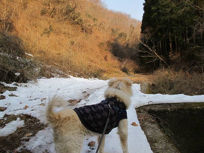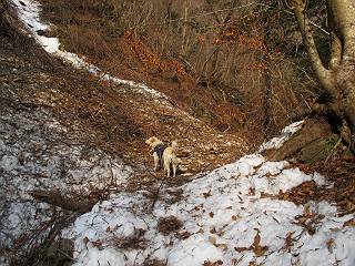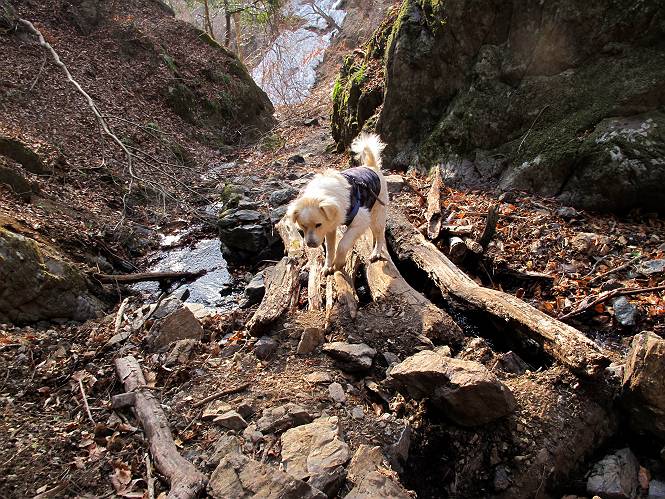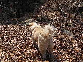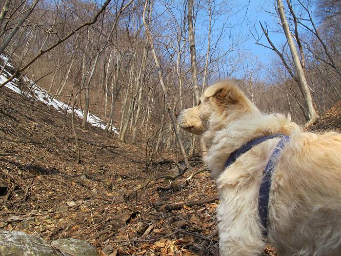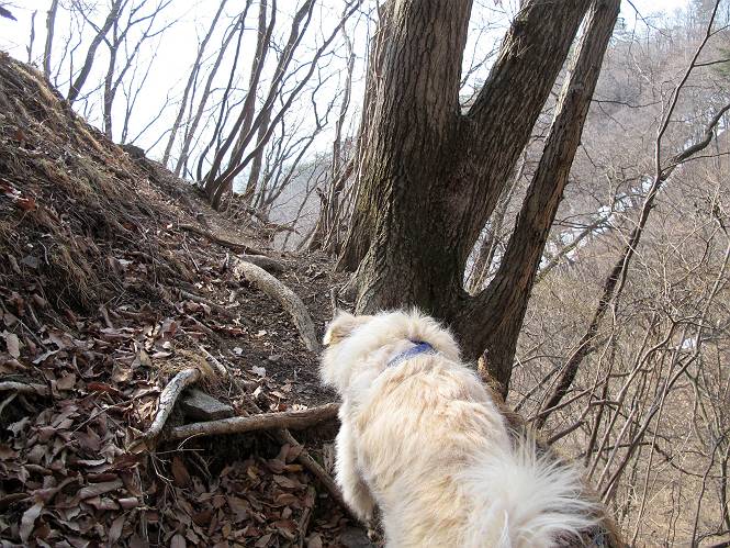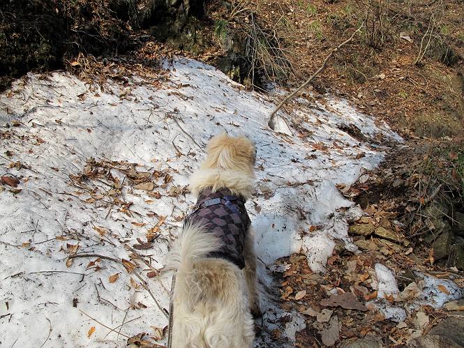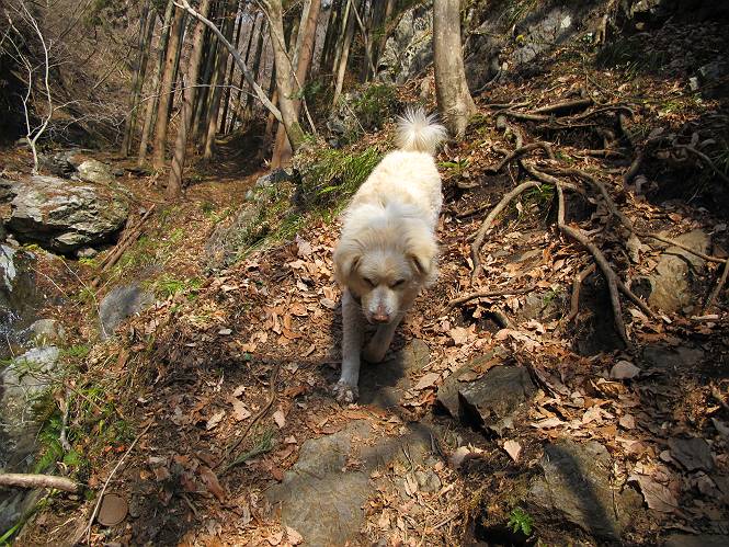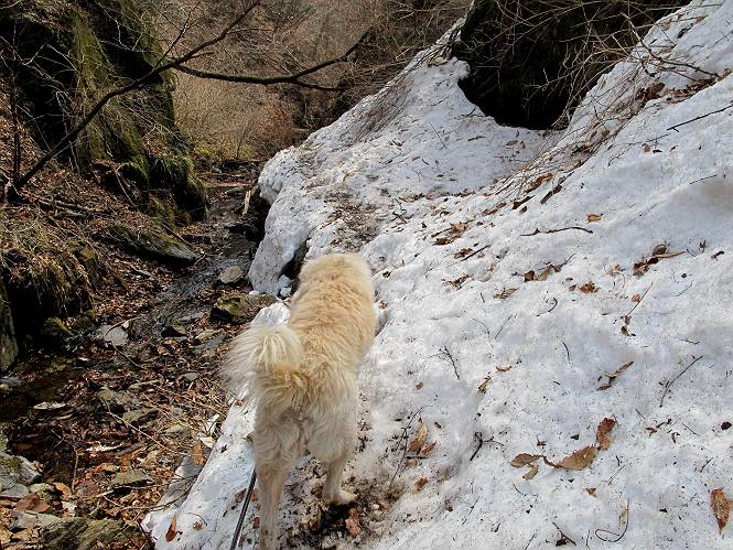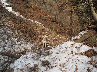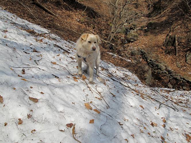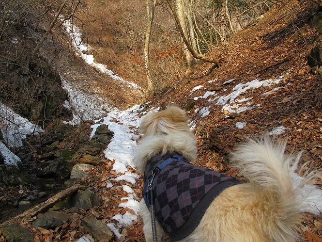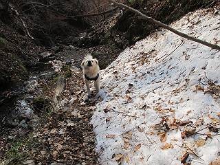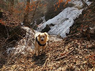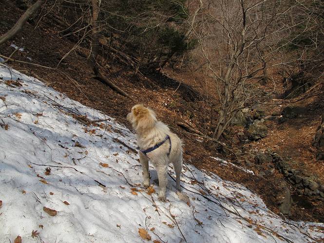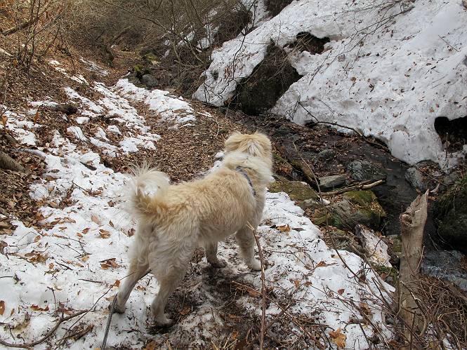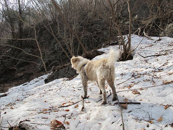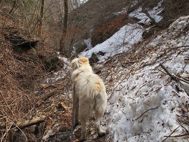 平成二十六年三月十二日 Before 写真集目次へ Next お父さんが、「春を探しに仙人ケ岳へ行く」、というので連れてってもらい、陽だまりハイクをしてきました。まだ、この間降った雪があちらこちらに残っていて、やっと見つけたのが咲きたてのハナネコノメでした。「まだ春は遠いかな」、と言ってました。 岩切の不動橋から入ります。 灯篭に“岩切中”と掘ってあります。 岩切沢に沿ってしばらく林道を進みます。 山陰の道にはまだ一面に雪が残ってました。 早速、寝転んで感触を楽しみました。 堰堤の先で、林道が終ります。 3/30(日)のトレランの案内が、張ってありました。 林道終点からハイキンギコースへ。 杉林を通り、徐々に上って行くと、 不動滝に出ます。 水量は少ないのですが、周辺は広く、美しい滝です。 岩にはりっつくようにして、通り抜けます。 沢を右、左、 行ったり来たりしながら進みます。 時々、きれいな沢の水を飲みながら歩きます。 雪もおいしいですよ。 ここは、雪が沢山残ってますね。 リードが、引っかかっちゃったよ。 と・れ・た・よ、よかった。 ここも多いなあ。 丸太の橋が沢山ありますが、ひとりで渡ります。 ここの雪はあっちの方まで続いているよ。 ここは上の方から落ちてきて積もっちゃったんだって。 枯れ枝、落葉、土がいっぱい混ざっているね。 この橋は、スキマが大きくて嫌いなんだよね、端を少し歩いて、 途中からスキマの小さいところに乗り移って、これで渡れます。 道の雪はなくなりましたね、もうないのかな。 この橋を渡れば、 生不動です。 この辺の杉も大分小枝が落ちてますね、雪と強風ですかね。 この橋は、ぼくには、渡りやすいんですよ。これを渡って、 濡れた岩場を慎重に歩いて、沢を渡ります。 沢の水が大分少なくなりました。 コースの倒木は払われてますが、アチコチにまだ残ってます。 右と左の山が近寄ってきましたね。 臭うなあ、モグラがいるのかな、掘ってみよう。 「顔も足もどろだらけになっちゃぞ」 「カッコいいですか」、「きたねぇ・・・」 シャツを脱いで顔だけ拭いてもらいました、これでスッキリ。 尾根の前の急坂にやってきました。 ヨイショ、 コラショ、 ドッコイショ、 大分上ってきたなあ。 あっちの方から上ってきたんだ。 もう少しで尾根に出るんだってさ。 尾根が見えたぞ、 熊の分岐だ。 こっちがダムだよね。 この板には、山頂までもう少しって書いてあるんだってさ。 尾根に出ても結構急ですね。 小休止しましょう。 また上りだぞ、ガンバロー なんだ坂 こんな坂 あれっ、下ってる。 おかしいな。 下ったり上ったり、忙しい登山道です。 赤雪山の分岐点に着きました。 のどがかわきましたので、雪を食べてます。 ここまで来れば、直ぐに山頂です、 仙人ケ岳到着。 記念写真を撮ってもらいました。 遠くは霞んでいて見えませんが、暖かいです。いつもの年ですと、「マンサクが咲いているのだが、おかしいな?」、と言ってました。オヤツを頂いて、休憩して来た道を戻ります。 ちょっと、雪が少ないなあ。 赤雪山の分岐点で、また休憩してます。 ここから日光方面の山並が見えるそうですが、生憎霞んでます。 ここは荒倉方面への尾根分岐点です、 また、お休みです、ここから少し下った所からショートカットするそうです。 これは正規の尾根道です、左下の残雪目指して一気に下るんですって。 「あやややや・・・・、マイッタ、マイッタ」 さっき通った道にでたら、大勢の人が山頂に向かってました。 今も4人のグループに会ったところです。 ぼくのこと、いろいろ聞いていたそうです。 ふわふわの落葉の道を下って 小さな滝の横を通ると、間もなく生不動到着です。 沢の反対側に渡って雪遊びをしました。 ここはいっぱい雪が残っています。 この上は危ないなあ。 上る時は簡単にあがったけど、下を見ると急だなあ。 スゴイ、ゴミだらけの雪だ、この下は沢が流れているんだね。 道に出ました。 まだまだ、雪は沢山ありますね。 不動滝付近まで下って、やっと、咲き出した、ネコノメソウの花を見つけたそうです。 不動滝を覗き込んでいます。 上りは足元ばかり気にしてましたが、 帰りは余裕です。 滝をバックに一枚撮ってもらいました。 林道に戻り、 間もなく、岩切の出発点に到着です、花はなかったですが、山歩きは楽しいね。 Before 写真集目次へ Next |