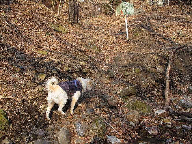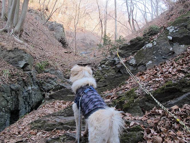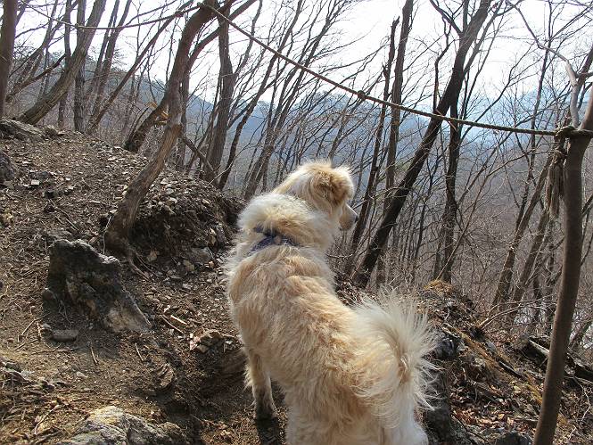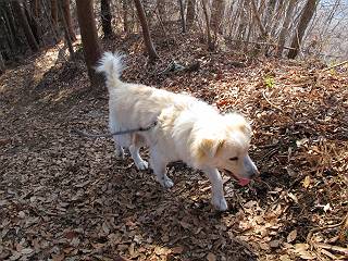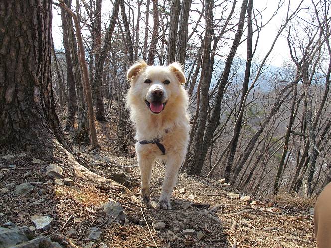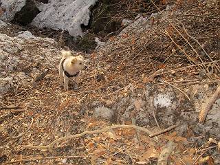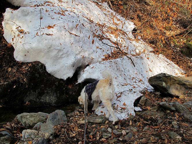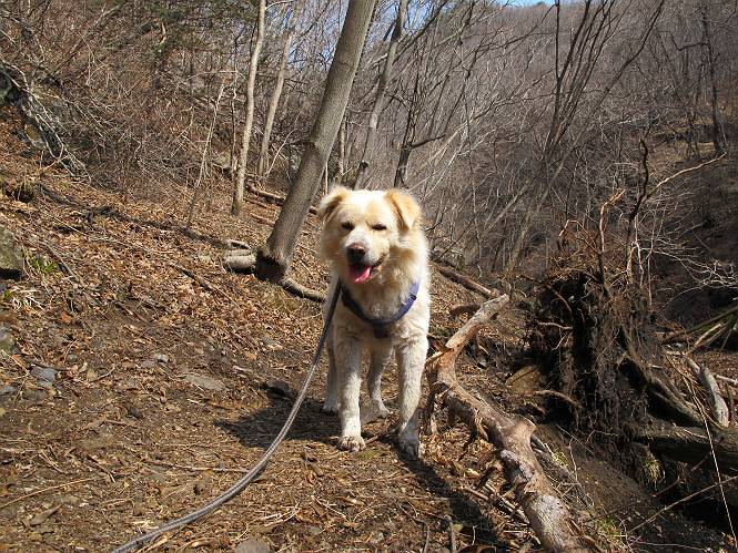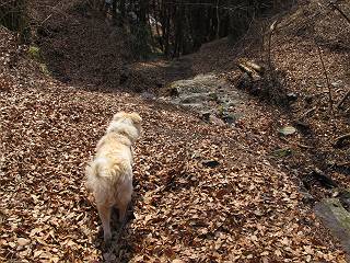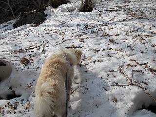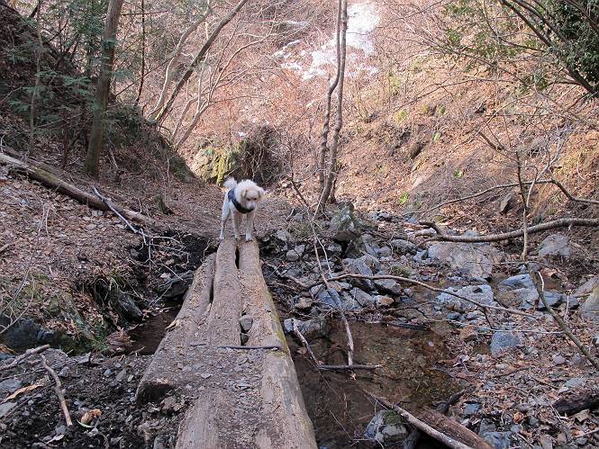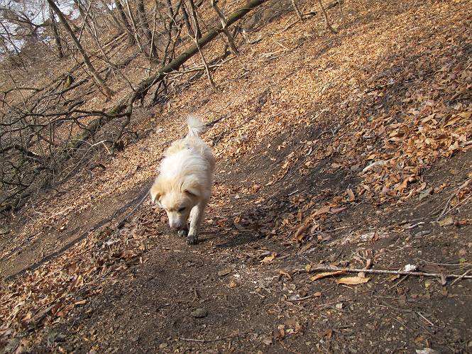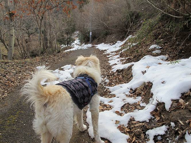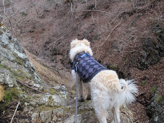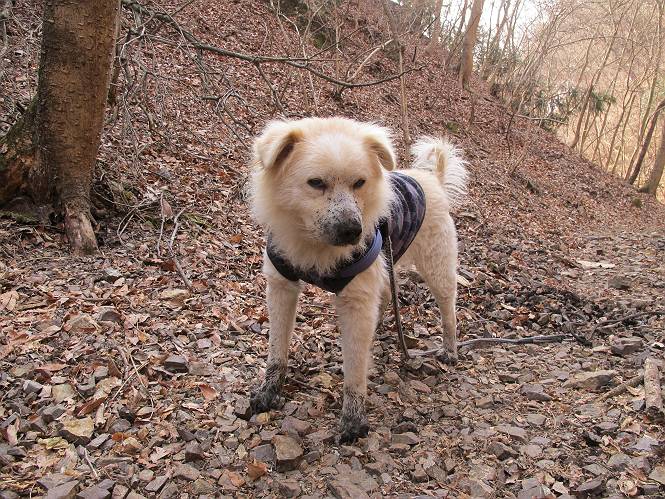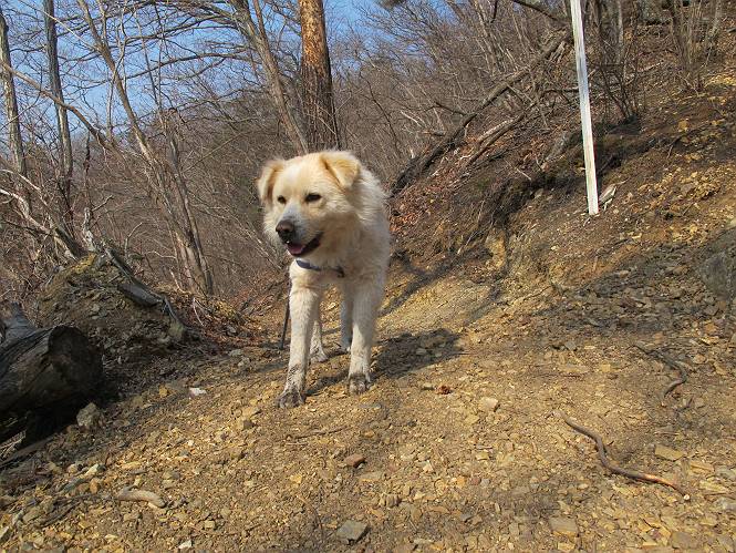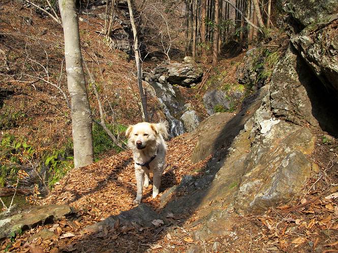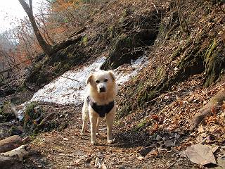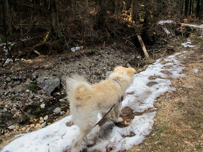 平成二十六年三月十二日 Before 写真集目次へ Next お父さんが、「春を探しに仙人ケ岳へ行く」、というので連れてってもらい、陽だまりハイクをしてきました。まだ、この間降った雪があちらこちらに残っていて、やっと見つけたのが咲きたてのハナネコノメでした。「まだ春は遠いかな」、と言ってました。 岩切の不動橋から入ります。 灯篭に“岩切中”と掘ってあります。 岩切沢に沿ってしばらく林道を進みます。 山陰の道にはまだ一面に雪が残ってました。 早速、寝転んで感触を楽しみました。 堰堤の先で、林道が終ります。 3/30(日)のトレランの案内が、張ってありました。 林道終点からハイキンギコースへ。 杉林を通り、徐々に上って行くと、 不動滝に出ます。 水量は少ないのですが、周辺は広く、美しい滝です。 岩にはりっつくようにして、通り抜けます。 沢を右、左、 行ったり来たりしながら進みます。 時々、きれいな沢の水を飲みながら歩きます。 雪もおいしいですよ。 ここは、雪が沢山残ってますね。 リードが、引っかかっちゃったよ。 と・れ・た・よ、よかった。 ここも多いなあ。 丸太の橋が沢山ありますが、ひとりで渡ります。 ここの雪はあっちの方まで続いているよ。 ここは上の方から落ちてきて積もっちゃったんだって。 枯れ枝、落葉、土がいっぱい混ざっているね。 この橋は、スキマが大きくて嫌いなんだよね、端を少し歩いて、 途中からスキマの小さいところに乗り移って、これで渡れます。 道の雪はなくなりましたね、もうないのかな。 この橋を渡れば、 生不動です。 この辺の杉も大分小枝が落ちてますね、雪と強風ですかね。 この橋は、ぼくには、渡りやすいんですよ。これを渡って、 濡れた岩場を慎重に歩いて、沢を渡ります。 沢の水が大分少なくなりました。 コースの倒木は払われてますが、アチコチにまだ残ってます。 右と左の山が近寄ってきましたね。 臭うなあ、モグラがいるのかな、掘ってみよう。 「顔も足もどろだらけになっちゃぞ」 「カッコいいですか」、「きたねぇ・・・」 シャツを脱いで顔だけ拭いてもらいました、これでスッキリ。 尾根の前の急坂にやってきました。 ヨイショ、 コラショ、 ドッコイショ、 大分上ってきたなあ。 あっちの方から上ってきたんだ。 もう少しで尾根に出るんだってさ。 尾根が見えたぞ、 熊の分岐だ。 こっちがダムだよね。 この板には、山頂までもう少しって書いてあるんだってさ。 尾根に出ても結構急ですね。 小休止しましょう。 また上りだぞ、ガンバロー なんだ坂 こんな坂 あれっ、下ってる。 おかしいな。 下ったり上ったり、忙しい登山道です。 赤雪山の分岐点に着きました。 のどがかわきましたので、雪を食べてます。 ここまで来れば、直ぐに山頂です、 仙人ケ岳到着。 記念写真を撮ってもらいました。 遠くは霞んでいて見えませんが、暖かいです。いつもの年ですと、「マンサクが咲いているのだが、おかしいな?」、と言ってました。オヤツを頂いて、休憩して来た道を戻ります。 ちょっと、雪が少ないなあ。 赤雪山の分岐点で、また休憩してます。 ここから日光方面の山並が見えるそうですが、生憎霞んでます。 ここは荒倉方面への尾根分岐点です、 また、お休みです、ここから少し下った所からショートカットするそうです。 これは正規の尾根道です、左下の残雪目指して一気に下るんですって。 「あやややや・・・・、マイッタ、マイッタ」 さっき通った道にでたら、大勢の人が山頂に向かってました。 今も4人のグループに会ったところです。 ぼくのこと、いろいろ聞いていたそうです。 ふわふわの落葉の道を下って 小さな滝の横を通ると、間もなく生不動到着です。 沢の反対側に渡って雪遊びをしました。 ここはいっぱい雪が残っています。 この上は危ないなあ。 上る時は簡単にあがったけど、下を見ると急だなあ。 スゴイ、ゴミだらけの雪だ、この下は沢が流れているんだね。 道に出ました。 まだまだ、雪は沢山ありますね。 不動滝付近まで下って、やっと、咲き出した、ネコノメソウの花を見つけたそうです。 不動滝を覗き込んでいます。 上りは足元ばかり気にしてましたが、 帰りは余裕です。 滝をバックに一枚撮ってもらいました。 林道に戻り、 間もなく、岩切の出発点に到着です、花はなかったですが、山歩きは楽しいね。 Before 写真集目次へ Next |