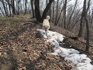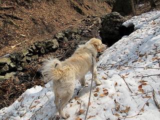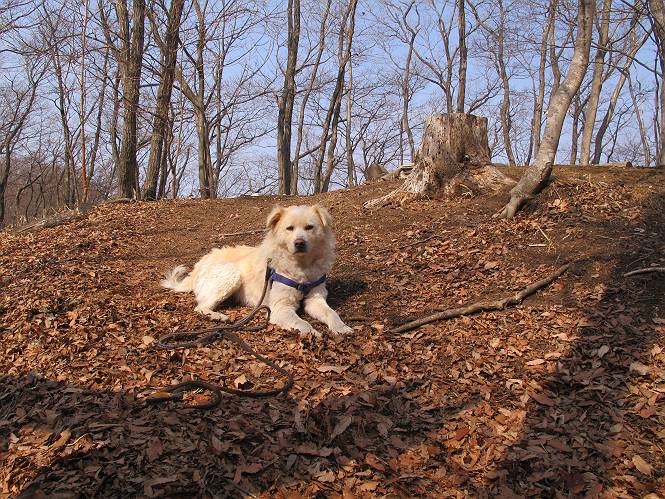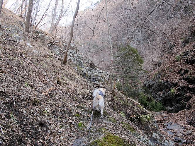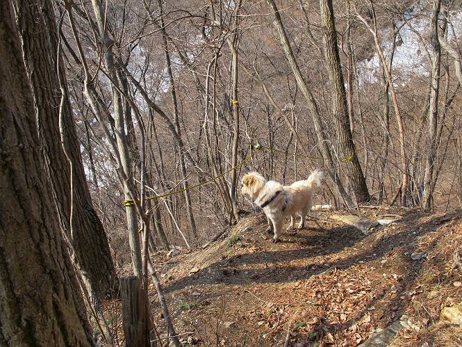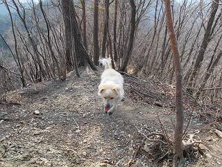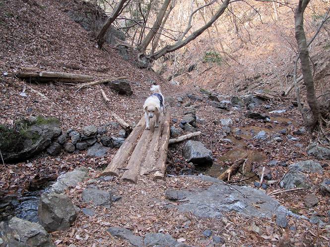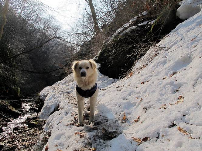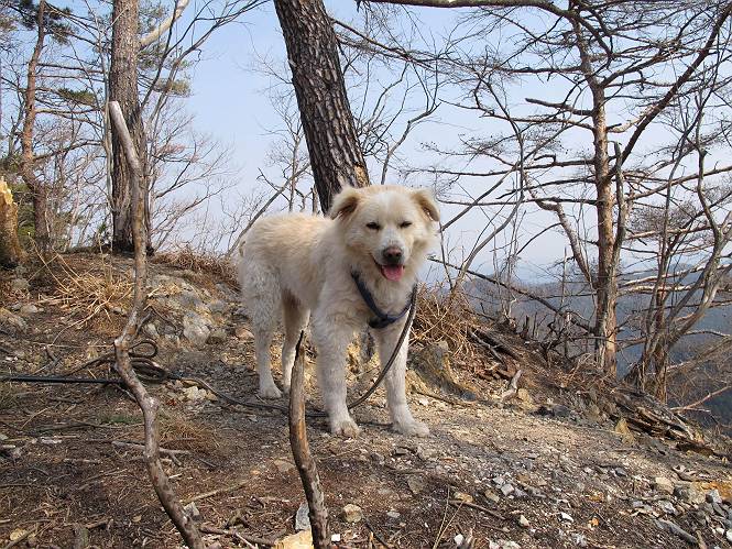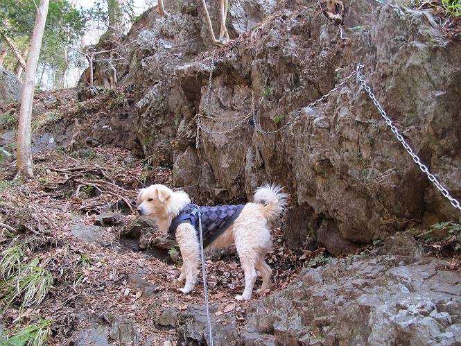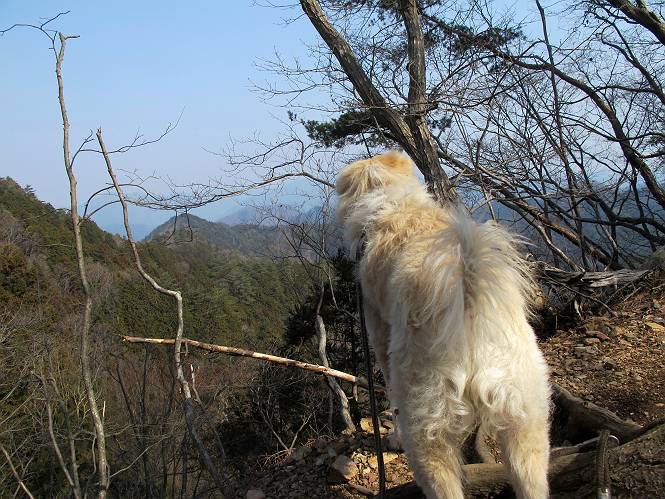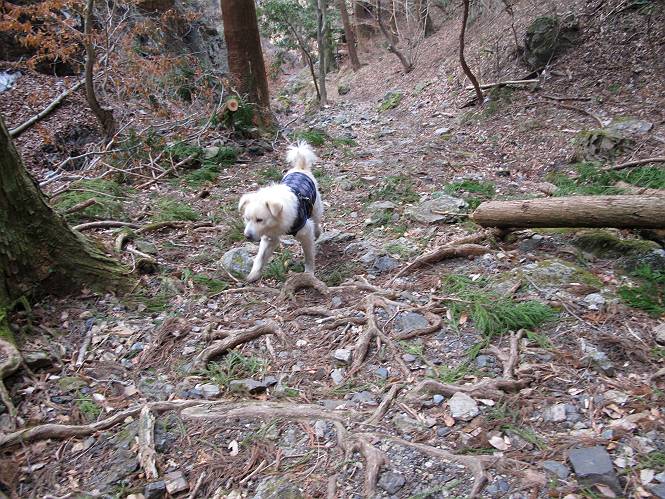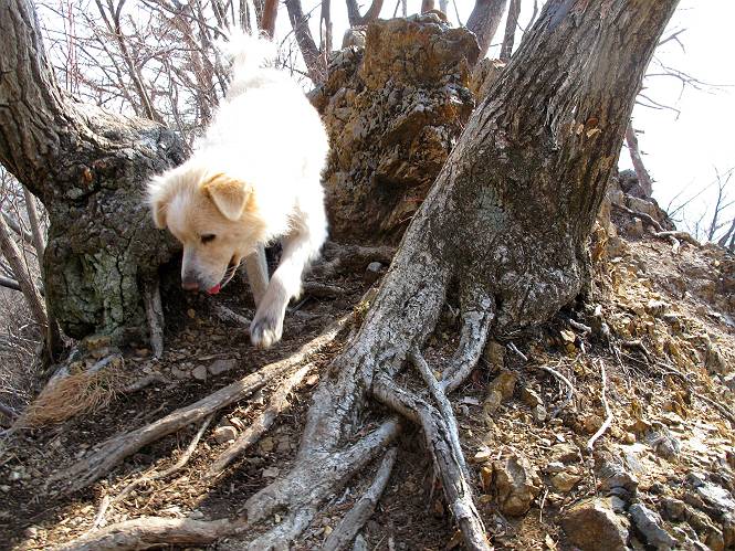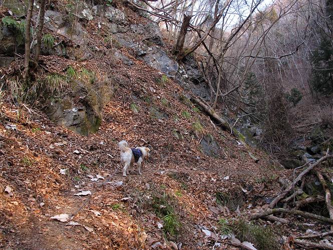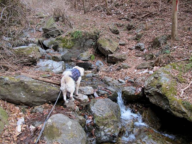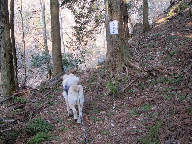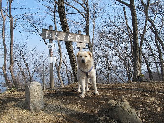 平成二十六年三月十二日 Before 写真集目次へ Next お父さんが、「春を探しに仙人ケ岳へ行く」、というので連れてってもらい、陽だまりハイクをしてきました。まだ、この間降った雪があちらこちらに残っていて、やっと見つけたのが咲きたてのハナネコノメでした。「まだ春は遠いかな」、と言ってました。 岩切の不動橋から入ります。 灯篭に“岩切中”と掘ってあります。 岩切沢に沿ってしばらく林道を進みます。 山陰の道にはまだ一面に雪が残ってました。 早速、寝転んで感触を楽しみました。 堰堤の先で、林道が終ります。 3/30(日)のトレランの案内が、張ってありました。 林道終点からハイキンギコースへ。 杉林を通り、徐々に上って行くと、 不動滝に出ます。 水量は少ないのですが、周辺は広く、美しい滝です。 岩にはりっつくようにして、通り抜けます。 沢を右、左、 行ったり来たりしながら進みます。 時々、きれいな沢の水を飲みながら歩きます。 雪もおいしいですよ。 ここは、雪が沢山残ってますね。 リードが、引っかかっちゃったよ。 と・れ・た・よ、よかった。 ここも多いなあ。 丸太の橋が沢山ありますが、ひとりで渡ります。 ここの雪はあっちの方まで続いているよ。 ここは上の方から落ちてきて積もっちゃったんだって。 枯れ枝、落葉、土がいっぱい混ざっているね。 この橋は、スキマが大きくて嫌いなんだよね、端を少し歩いて、 途中からスキマの小さいところに乗り移って、これで渡れます。 道の雪はなくなりましたね、もうないのかな。 この橋を渡れば、 生不動です。 この辺の杉も大分小枝が落ちてますね、雪と強風ですかね。 この橋は、ぼくには、渡りやすいんですよ。これを渡って、 濡れた岩場を慎重に歩いて、沢を渡ります。 沢の水が大分少なくなりました。 コースの倒木は払われてますが、アチコチにまだ残ってます。 右と左の山が近寄ってきましたね。 臭うなあ、モグラがいるのかな、掘ってみよう。 「顔も足もどろだらけになっちゃぞ」 「カッコいいですか」、「きたねぇ・・・」 シャツを脱いで顔だけ拭いてもらいました、これでスッキリ。 尾根の前の急坂にやってきました。 ヨイショ、 コラショ、 ドッコイショ、 大分上ってきたなあ。 あっちの方から上ってきたんだ。 もう少しで尾根に出るんだってさ。 尾根が見えたぞ、 熊の分岐だ。 こっちがダムだよね。 この板には、山頂までもう少しって書いてあるんだってさ。 尾根に出ても結構急ですね。 小休止しましょう。 また上りだぞ、ガンバロー なんだ坂 こんな坂 あれっ、下ってる。 おかしいな。 下ったり上ったり、忙しい登山道です。 赤雪山の分岐点に着きました。 のどがかわきましたので、雪を食べてます。 ここまで来れば、直ぐに山頂です、 仙人ケ岳到着。 記念写真を撮ってもらいました。 遠くは霞んでいて見えませんが、暖かいです。いつもの年ですと、「マンサクが咲いているのだが、おかしいな?」、と言ってました。オヤツを頂いて、休憩して来た道を戻ります。 ちょっと、雪が少ないなあ。 赤雪山の分岐点で、また休憩してます。 ここから日光方面の山並が見えるそうですが、生憎霞んでます。 ここは荒倉方面への尾根分岐点です、 また、お休みです、ここから少し下った所からショートカットするそうです。 これは正規の尾根道です、左下の残雪目指して一気に下るんですって。 「あやややや・・・・、マイッタ、マイッタ」 さっき通った道にでたら、大勢の人が山頂に向かってました。 今も4人のグループに会ったところです。 ぼくのこと、いろいろ聞いていたそうです。 ふわふわの落葉の道を下って 小さな滝の横を通ると、間もなく生不動到着です。 沢の反対側に渡って雪遊びをしました。 ここはいっぱい雪が残っています。 この上は危ないなあ。 上る時は簡単にあがったけど、下を見ると急だなあ。 スゴイ、ゴミだらけの雪だ、この下は沢が流れているんだね。 道に出ました。 まだまだ、雪は沢山ありますね。 不動滝付近まで下って、やっと、咲き出した、ネコノメソウの花を見つけたそうです。 不動滝を覗き込んでいます。 上りは足元ばかり気にしてましたが、 帰りは余裕です。 滝をバックに一枚撮ってもらいました。 林道に戻り、 間もなく、岩切の出発点に到着です、花はなかったですが、山歩きは楽しいね。 Before 写真集目次へ Next |