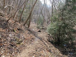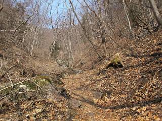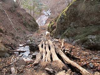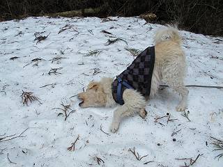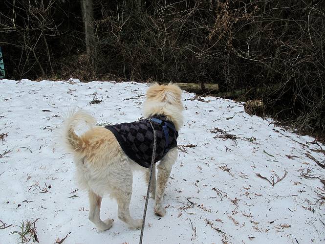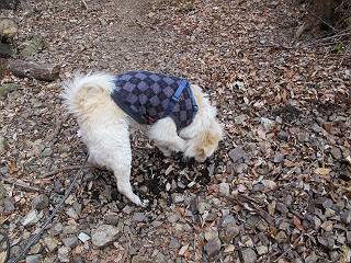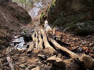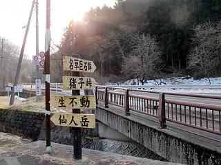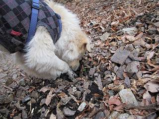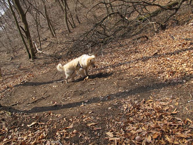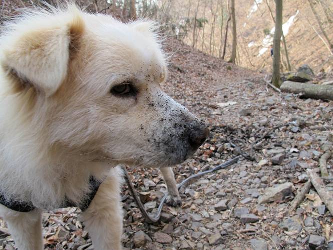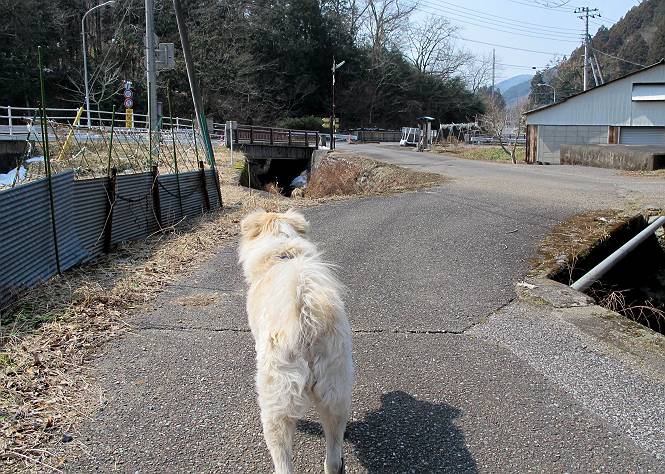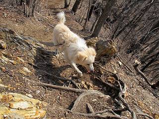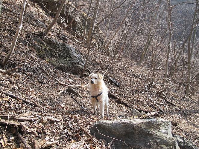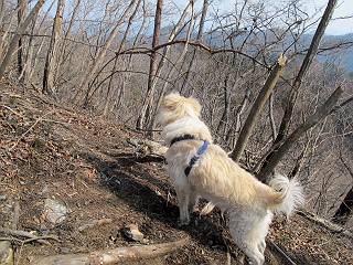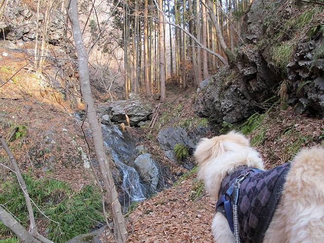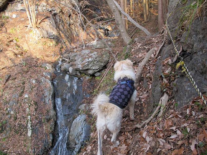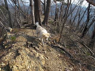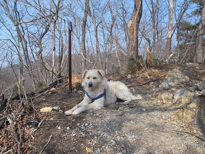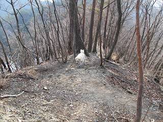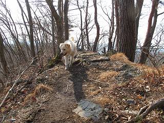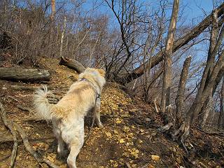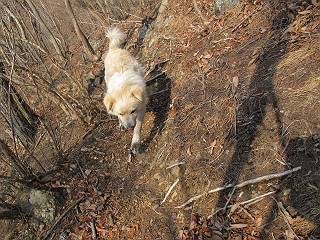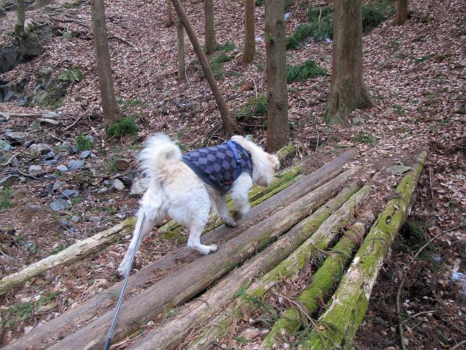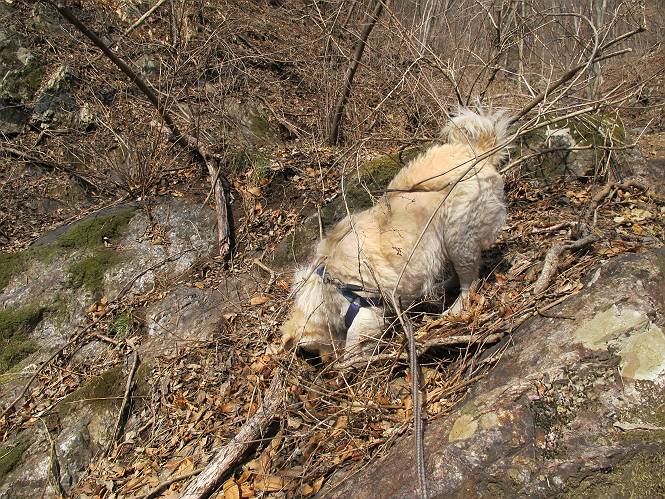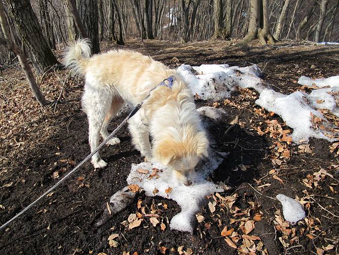 平成二十六年三月十二日 Before 写真集目次へ Next お父さんが、「春を探しに仙人ケ岳へ行く」、というので連れてってもらい、陽だまりハイクをしてきました。まだ、この間降った雪があちらこちらに残っていて、やっと見つけたのが咲きたてのハナネコノメでした。「まだ春は遠いかな」、と言ってました。 岩切の不動橋から入ります。 灯篭に“岩切中”と掘ってあります。 岩切沢に沿ってしばらく林道を進みます。 山陰の道にはまだ一面に雪が残ってました。 早速、寝転んで感触を楽しみました。 堰堤の先で、林道が終ります。 3/30(日)のトレランの案内が、張ってありました。 林道終点からハイキンギコースへ。 杉林を通り、徐々に上って行くと、 不動滝に出ます。 水量は少ないのですが、周辺は広く、美しい滝です。 岩にはりっつくようにして、通り抜けます。 沢を右、左、 行ったり来たりしながら進みます。 時々、きれいな沢の水を飲みながら歩きます。 雪もおいしいですよ。 ここは、雪が沢山残ってますね。 リードが、引っかかっちゃったよ。 と・れ・た・よ、よかった。 ここも多いなあ。 丸太の橋が沢山ありますが、ひとりで渡ります。 ここの雪はあっちの方まで続いているよ。 ここは上の方から落ちてきて積もっちゃったんだって。 枯れ枝、落葉、土がいっぱい混ざっているね。 この橋は、スキマが大きくて嫌いなんだよね、端を少し歩いて、 途中からスキマの小さいところに乗り移って、これで渡れます。 道の雪はなくなりましたね、もうないのかな。 この橋を渡れば、 生不動です。 この辺の杉も大分小枝が落ちてますね、雪と強風ですかね。 この橋は、ぼくには、渡りやすいんですよ。これを渡って、 濡れた岩場を慎重に歩いて、沢を渡ります。 沢の水が大分少なくなりました。 コースの倒木は払われてますが、アチコチにまだ残ってます。 右と左の山が近寄ってきましたね。 臭うなあ、モグラがいるのかな、掘ってみよう。 「顔も足もどろだらけになっちゃぞ」 「カッコいいですか」、「きたねぇ・・・」 シャツを脱いで顔だけ拭いてもらいました、これでスッキリ。 尾根の前の急坂にやってきました。 ヨイショ、 コラショ、 ドッコイショ、 大分上ってきたなあ。 あっちの方から上ってきたんだ。 もう少しで尾根に出るんだってさ。 尾根が見えたぞ、 熊の分岐だ。 こっちがダムだよね。 この板には、山頂までもう少しって書いてあるんだってさ。 尾根に出ても結構急ですね。 小休止しましょう。 また上りだぞ、ガンバロー なんだ坂 こんな坂 あれっ、下ってる。 おかしいな。 下ったり上ったり、忙しい登山道です。 赤雪山の分岐点に着きました。 のどがかわきましたので、雪を食べてます。 ここまで来れば、直ぐに山頂です、 仙人ケ岳到着。 記念写真を撮ってもらいました。 遠くは霞んでいて見えませんが、暖かいです。いつもの年ですと、「マンサクが咲いているのだが、おかしいな?」、と言ってました。オヤツを頂いて、休憩して来た道を戻ります。 ちょっと、雪が少ないなあ。 赤雪山の分岐点で、また休憩してます。 ここから日光方面の山並が見えるそうですが、生憎霞んでます。 ここは荒倉方面への尾根分岐点です、 また、お休みです、ここから少し下った所からショートカットするそうです。 これは正規の尾根道です、左下の残雪目指して一気に下るんですって。 「あやややや・・・・、マイッタ、マイッタ」 さっき通った道にでたら、大勢の人が山頂に向かってました。 今も4人のグループに会ったところです。 ぼくのこと、いろいろ聞いていたそうです。 ふわふわの落葉の道を下って 小さな滝の横を通ると、間もなく生不動到着です。 沢の反対側に渡って雪遊びをしました。 ここはいっぱい雪が残っています。 この上は危ないなあ。 上る時は簡単にあがったけど、下を見ると急だなあ。 スゴイ、ゴミだらけの雪だ、この下は沢が流れているんだね。 道に出ました。 まだまだ、雪は沢山ありますね。 不動滝付近まで下って、やっと、咲き出した、ネコノメソウの花を見つけたそうです。 不動滝を覗き込んでいます。 上りは足元ばかり気にしてましたが、 帰りは余裕です。 滝をバックに一枚撮ってもらいました。 林道に戻り、 間もなく、岩切の出発点に到着です、花はなかったですが、山歩きは楽しいね。 Before 写真集目次へ Next |