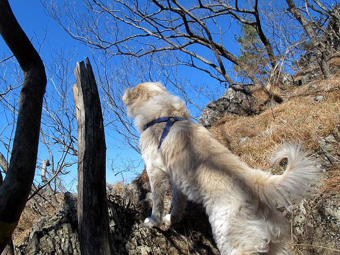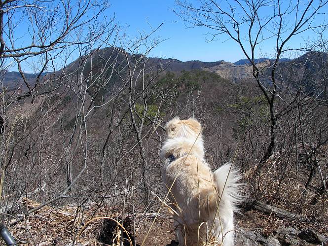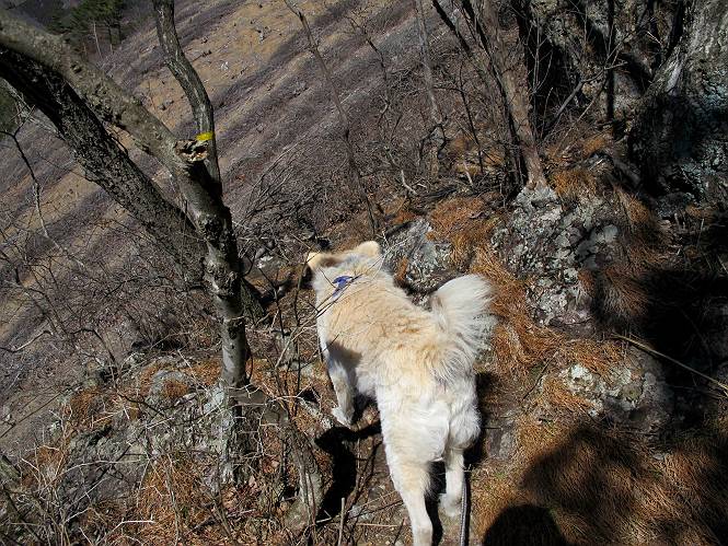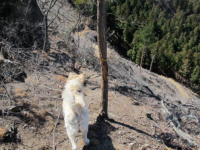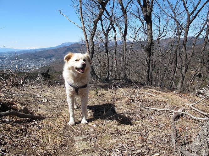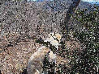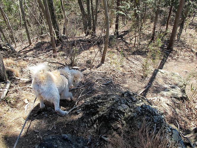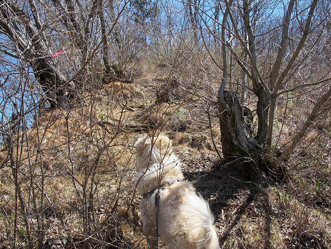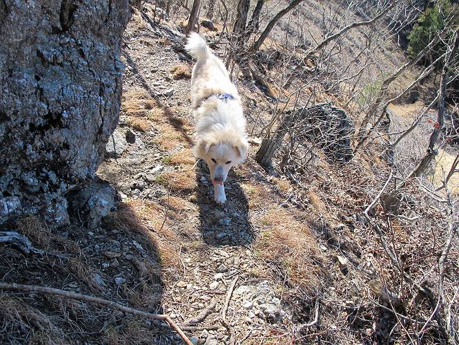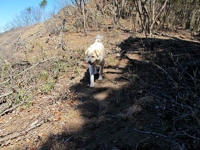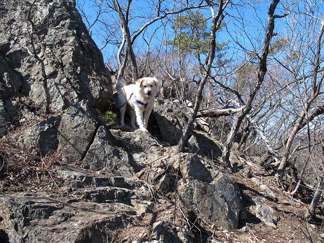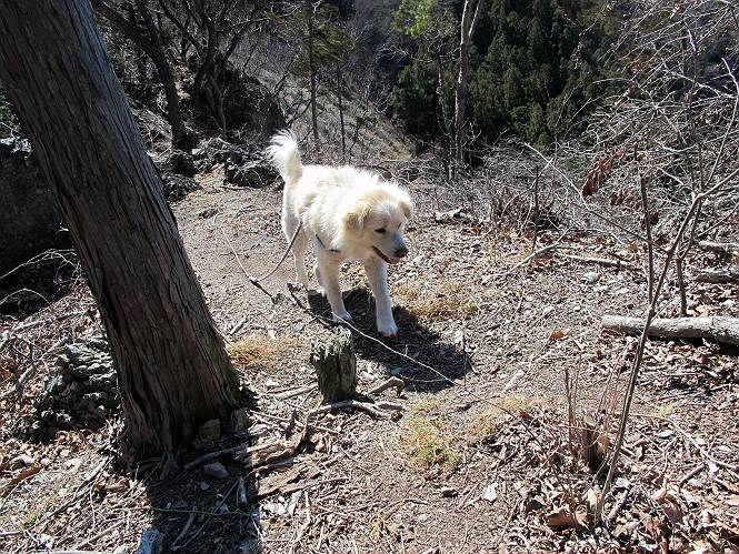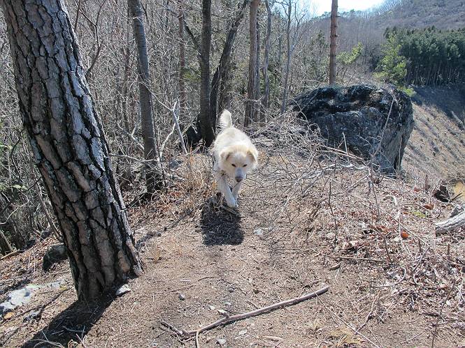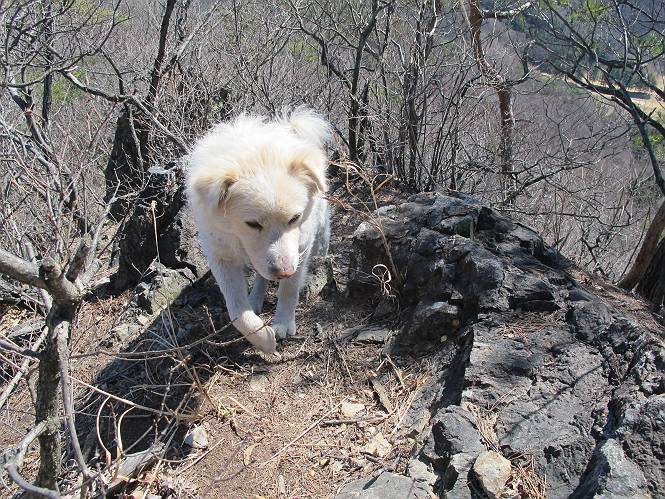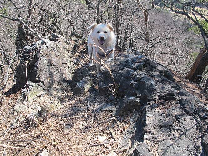 平成二十六年三月二十二日 Before 写真集目次へ Next 午前中は強い風が吹いていましたが、午後になって少し静かになりましたので、足利と桐生の境にあるヤシオ山と姥穴山へ連れてってもらいました。「ヤシオツツジが咲き始めているだろう」、と言ってましたが、「まだ3-5日かかるかな」、と言ってました。これで帰るのは早すぎる、姥穴山へ行ってみよう、となりました。 ここは桐生と足利の市境、白葉峠です。ここからヤシオ山へ上ります。ここの西斜面はすっかり伐採されて西方向の見晴らしが良くなりました。 桐生の街と浅間山です。 草津白根山方面です。 赤城山です。 こんな道をしばらく進みます。 少し進むと左側に小枝の間から石尊山が、右側にはどっしりした姥穴山が見えてきます。 石尊山 姥穴山 もう少し進むと伐採された広々した場所に出ます。 浅間山と榛名山が、赤城山の裾野の向こうに見えてきます。 細い尾根道になって、 岩場を通っていきます。 景色は良いし、面白い所です。 また岩場を下って、 檜林をちょっと抜けます。 この辺は、下を回らないで、ちょっと近道をして斜めに上っていきます。 ここからまた登山道に入り、坂道を進みます。 すると、標高327mと書いたプレートの下がった小さなピークに出ます。 おお、あと少しだワン。 ここから東方向を見ると、丸い低い山、ヤシオ山が手前にあって、奥に石尊山が見えます。 ここから、岩場を下って、 倒木の間を通って下り 緩やかに登り返します。 ちょっと上るとヤシオ山に着きます、こんな道標が木に縛りつけてあります。 アカヤシオの蕾のつきは良いそうですが、開花までにはこの木ですと5-10日かかるそうです。 「この辺の蕾で早ければ3日、7日たてば楽しめるでしょう」、と言ってました。 少しお休みして、来た道を戻り、途中から姥穴山に向かうそうです。 327mの表示のあるピーク付近に来ました。 こんな道を歩くのって、楽しいよね。 好きなところを通って、 走ったり、歩いたり、立ち止まったりしながらね。 ここが一番高いかな、向こうに姥穴山が見えてます。 白葉峠の分岐点まで下ると、二人おじさんが後からやってきました。同じコースを歩きます。 急坂を上って尾根へ出ると、直ぐに姥穴山山頂です。 おじさんたちは休憩、ぼくはオヤツとお水を頂きました。 祠を入れて、記念写真を撮って、急坂を下り、来た道を白葉峠へ戻ります。 またまた、岩が沢山ある道にやってきました。 小さいの、大きいの、いっぱいありまーす。 この大きい岩でおしまいかな。 伐採地、広々して気持ち良いね。 上ったり、下ったりしながら 尾根道を楽しんでます。 もう少しで、白葉峠です。 シュンランを一株見つけました。 白葉峠に戻ると消防自動車が折り返して行きました。 アカヤシオの花、咲いてなくて残念でした、「また来れば、その時はまた連れてきてね」 Before 写真集目次へ Next |