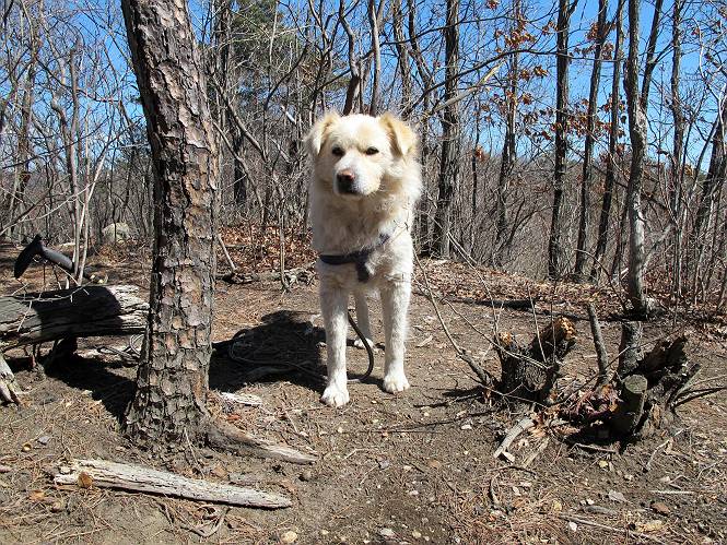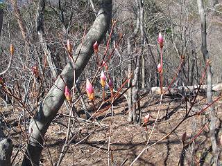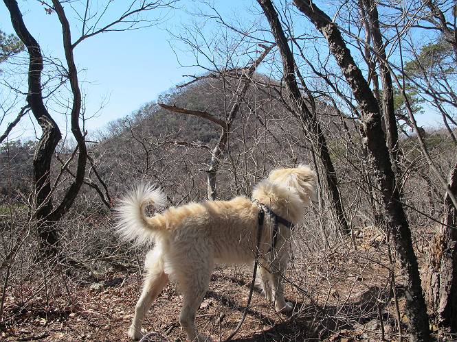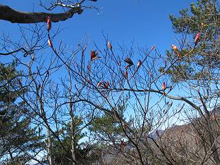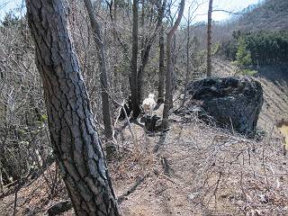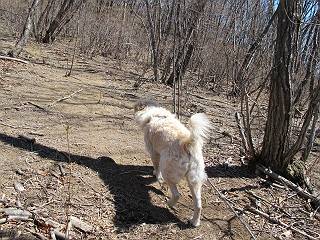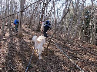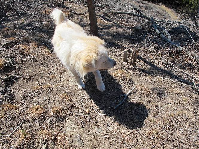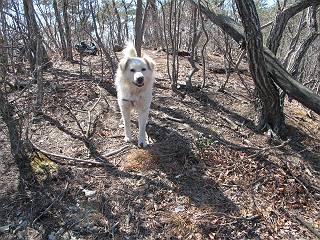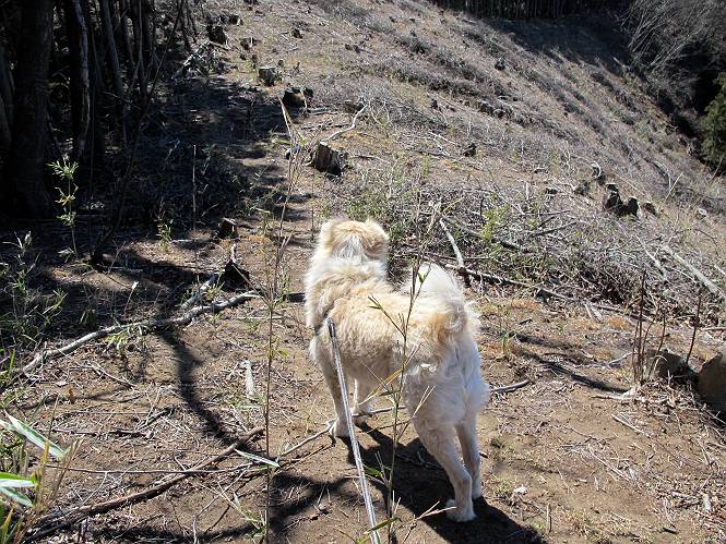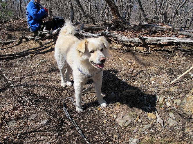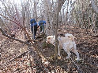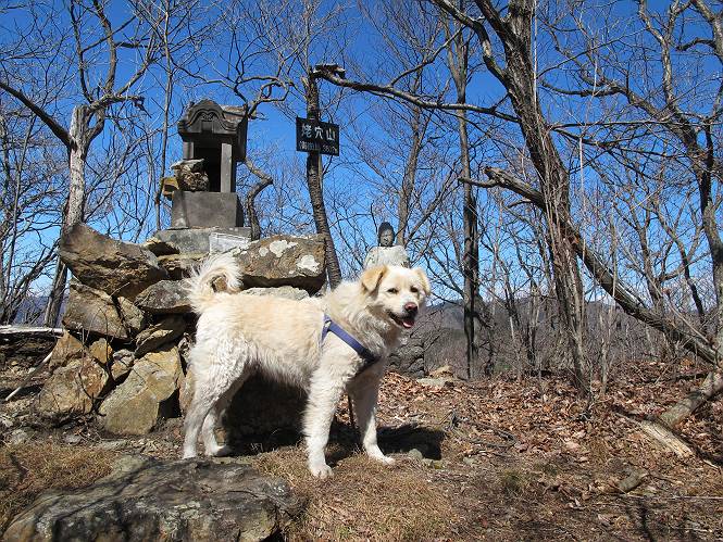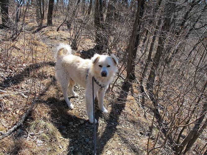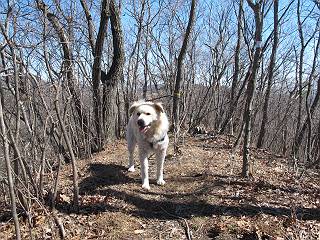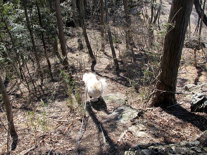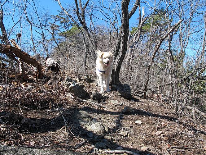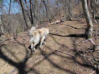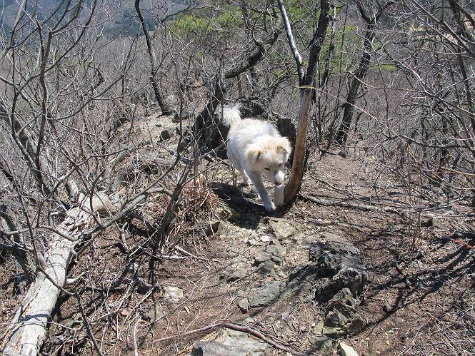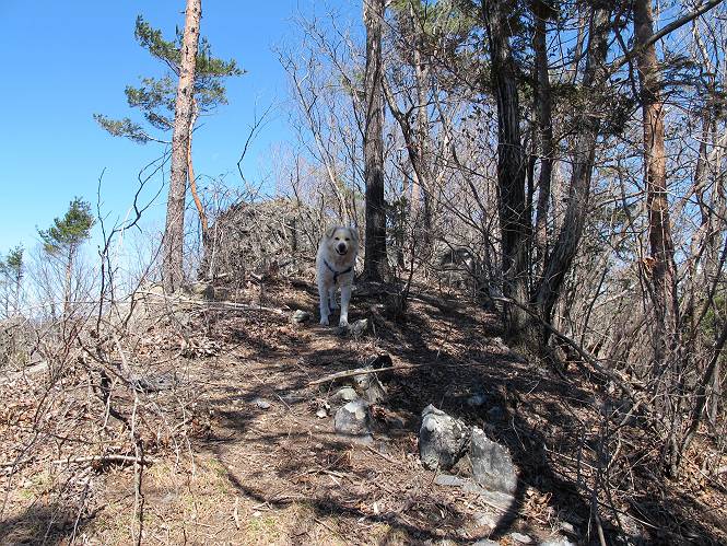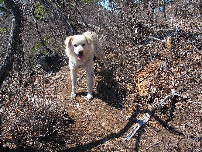 平成二十六年三月二十二日 Before 写真集目次へ Next 午前中は強い風が吹いていましたが、午後になって少し静かになりましたので、足利と桐生の境にあるヤシオ山と姥穴山へ連れてってもらいました。「ヤシオツツジが咲き始めているだろう」、と言ってましたが、「まだ3-5日かかるかな」、と言ってました。これで帰るのは早すぎる、姥穴山へ行ってみよう、となりました。 ここは桐生と足利の市境、白葉峠です。ここからヤシオ山へ上ります。ここの西斜面はすっかり伐採されて西方向の見晴らしが良くなりました。 桐生の街と浅間山です。 草津白根山方面です。 赤城山です。 こんな道をしばらく進みます。 少し進むと左側に小枝の間から石尊山が、右側にはどっしりした姥穴山が見えてきます。 石尊山 姥穴山 もう少し進むと伐採された広々した場所に出ます。 浅間山と榛名山が、赤城山の裾野の向こうに見えてきます。 細い尾根道になって、 岩場を通っていきます。 景色は良いし、面白い所です。 また岩場を下って、 檜林をちょっと抜けます。 この辺は、下を回らないで、ちょっと近道をして斜めに上っていきます。 ここからまた登山道に入り、坂道を進みます。 すると、標高327mと書いたプレートの下がった小さなピークに出ます。 おお、あと少しだワン。 ここから東方向を見ると、丸い低い山、ヤシオ山が手前にあって、奥に石尊山が見えます。 ここから、岩場を下って、 倒木の間を通って下り 緩やかに登り返します。 ちょっと上るとヤシオ山に着きます、こんな道標が木に縛りつけてあります。 アカヤシオの蕾のつきは良いそうですが、開花までにはこの木ですと5-10日かかるそうです。 「この辺の蕾で早ければ3日、7日たてば楽しめるでしょう」、と言ってました。 少しお休みして、来た道を戻り、途中から姥穴山に向かうそうです。 327mの表示のあるピーク付近に来ました。 こんな道を歩くのって、楽しいよね。 好きなところを通って、 走ったり、歩いたり、立ち止まったりしながらね。 ここが一番高いかな、向こうに姥穴山が見えてます。 白葉峠の分岐点まで下ると、二人おじさんが後からやってきました。同じコースを歩きます。 急坂を上って尾根へ出ると、直ぐに姥穴山山頂です。 おじさんたちは休憩、ぼくはオヤツとお水を頂きました。 祠を入れて、記念写真を撮って、急坂を下り、来た道を白葉峠へ戻ります。 またまた、岩が沢山ある道にやってきました。 小さいの、大きいの、いっぱいありまーす。 この大きい岩でおしまいかな。 伐採地、広々して気持ち良いね。 上ったり、下ったりしながら 尾根道を楽しんでます。 もう少しで、白葉峠です。 シュンランを一株見つけました。 白葉峠に戻ると消防自動車が折り返して行きました。 アカヤシオの花、咲いてなくて残念でした、「また来れば、その時はまた連れてきてね」 Before 写真集目次へ Next |