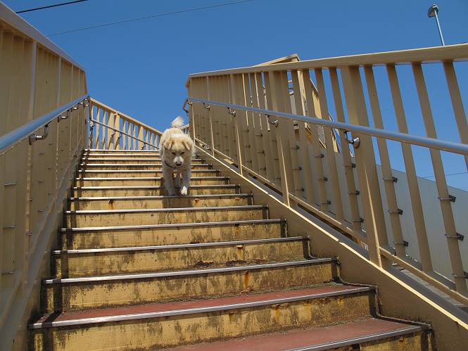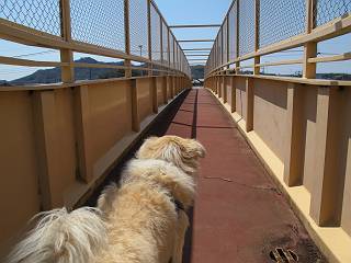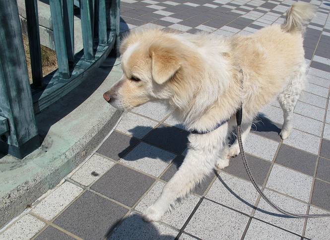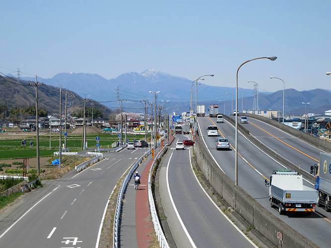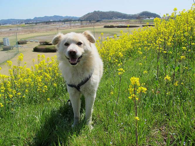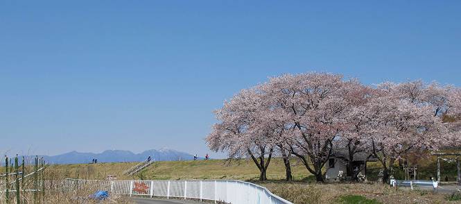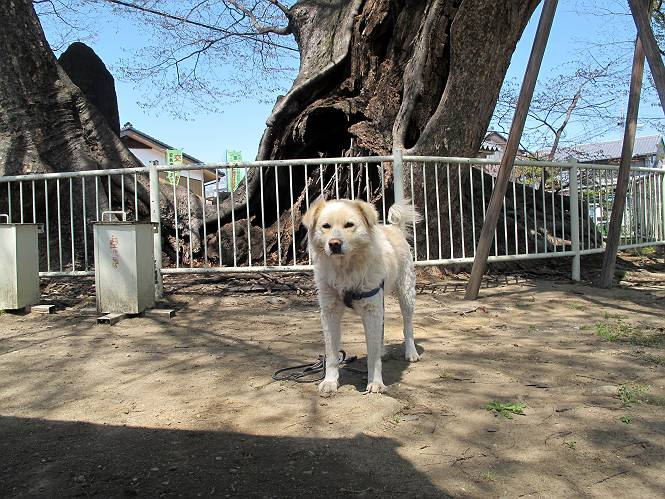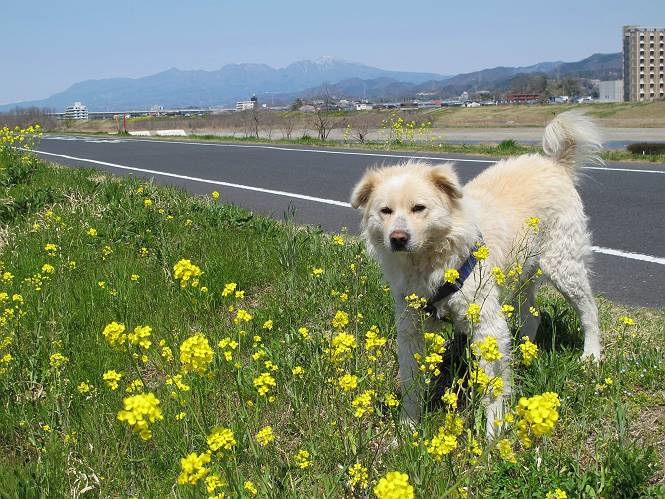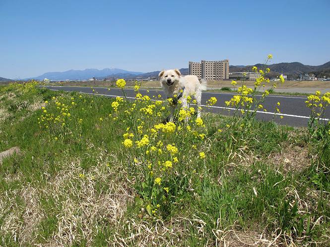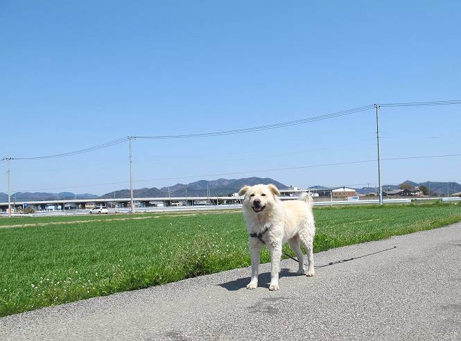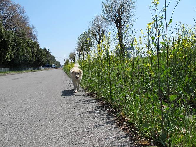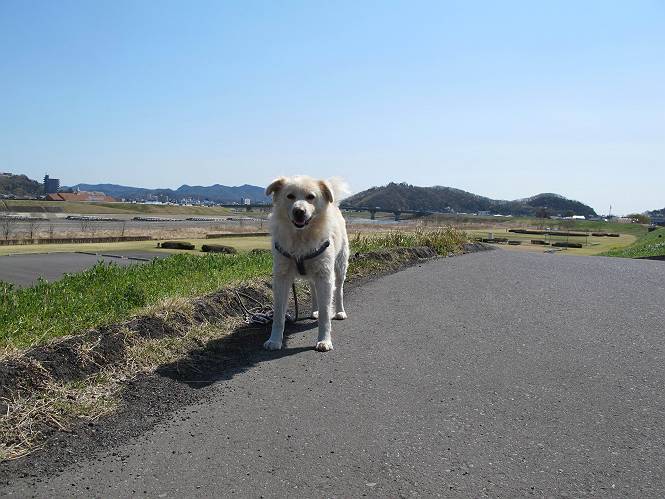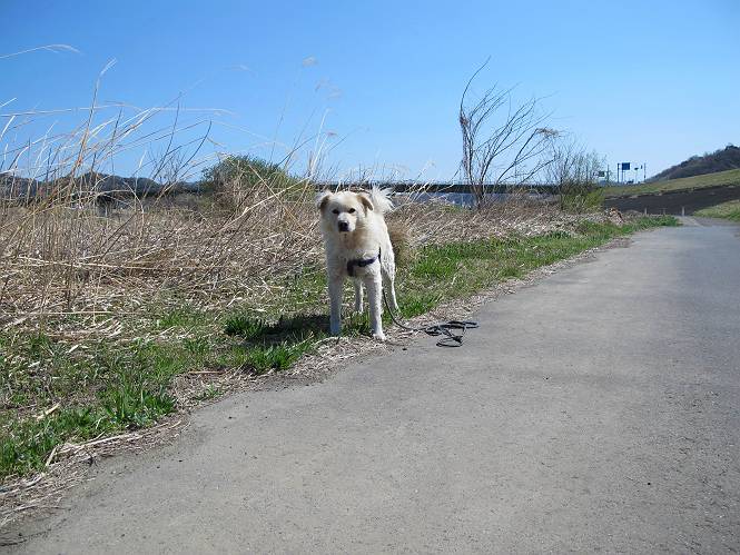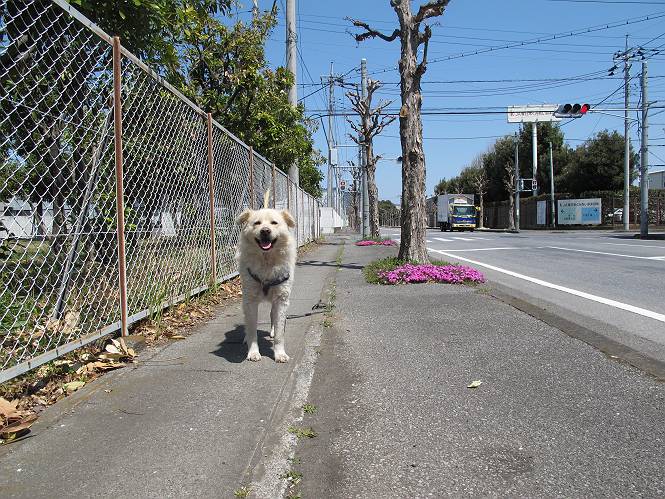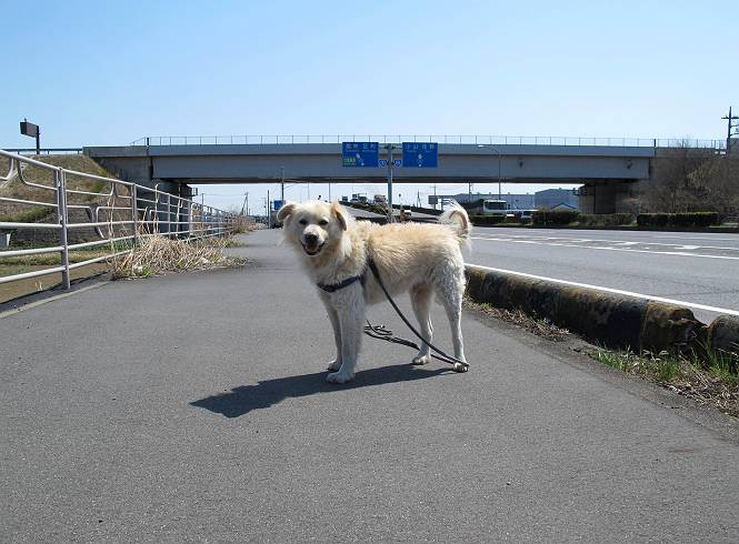 平成二十六年四月七日 Before 写真集目次へ Next お父さんは、ここ4,5日、ホームページを移し変えるのに部屋にこもりっきりでした。やっと、終わったようで、「花を見ながら散歩して来よう」、ということになりました。足利の緑橋北詰から渡良瀬川に沿って歩き、お花見して、工業団地を抜けて帰りました。 渡良瀬川にかかる緑橋を北詰から渡ってます。車が沢山走ってました。 南詰めで右に曲って、 土手の下に降ります。 土手下の遊歩道を歩いてます。道際は緑に、奥はまだ枯れ草です。 ここは土手ですが、菜の花が満開でキレイでした。奥に見える橋が緑橋です。 土手の上の道路です、時々通る車があります。下は運動場のようです。 渡良瀬川の向こうの大きな建物は病院だって、 左は赤城山です、また雪が降ったようです。 遠くから見えていた桜です、奥に神社があるそうです。 少し散り始めていますが、きれいですね。枝を全然切られてから伸び伸びしてますね。 見上げても青空が見えて、「いい感じ」、だってさ。 南側から見ると左に赤城山、手前に土手、土手下が神社と桜です。 土手から南方向に、家並みの間を通って、神社横の大ケヤキの所にやってきました。 真ん中は枯れて穴だらけですが、周りは元気のようです。もう芽をふいてます。 工業団地を南方向に抜けてます。街路樹は剪定され、根元に芝桜が咲いてました。 国道50号線に沿って側道(?)を西に向かっています。 高速道路をくぐってきました、今朝もここを歩いたんだよね。ぼくんちまであと20分ほどだって。 歩道橋を渡って国道の南側へ出ます。 歩道橋から見た国道と赤城山です。 歩道橋を降りて、 田圃の中を西方向に進めば、間もなく到着です。 今日は風が少し冷たかったですが、花を眺めながらのんびり歩けて楽しかったです。 Before 写真集目次へ Next |