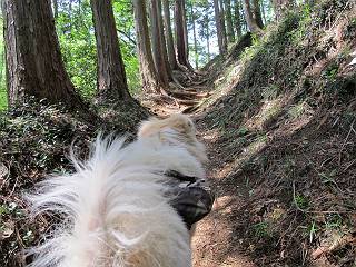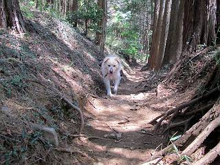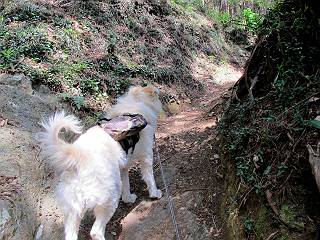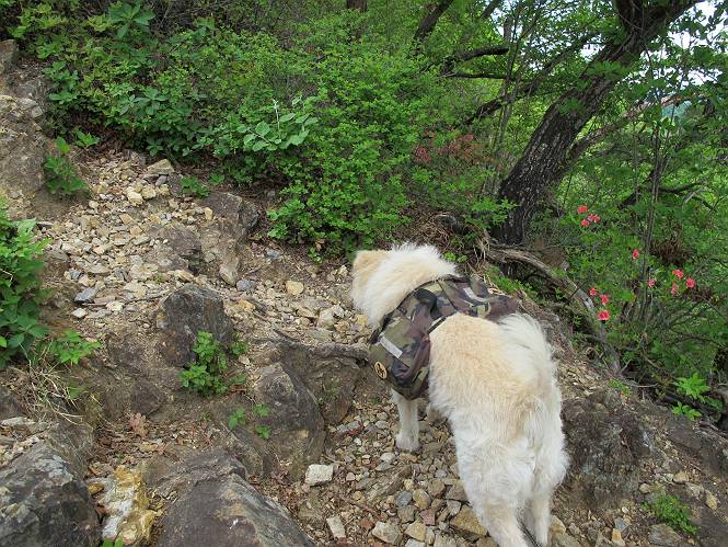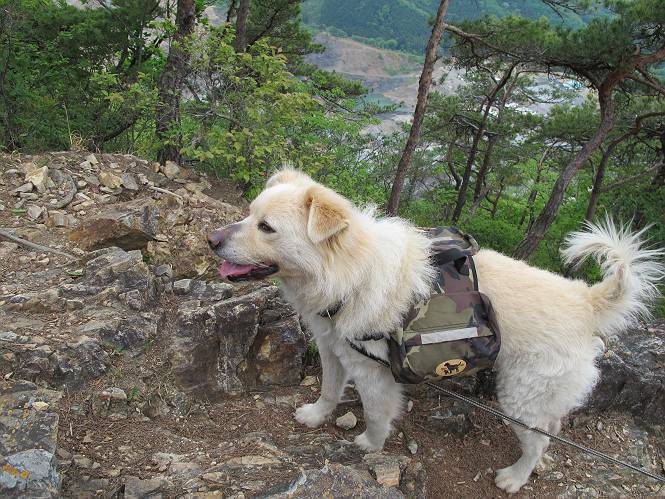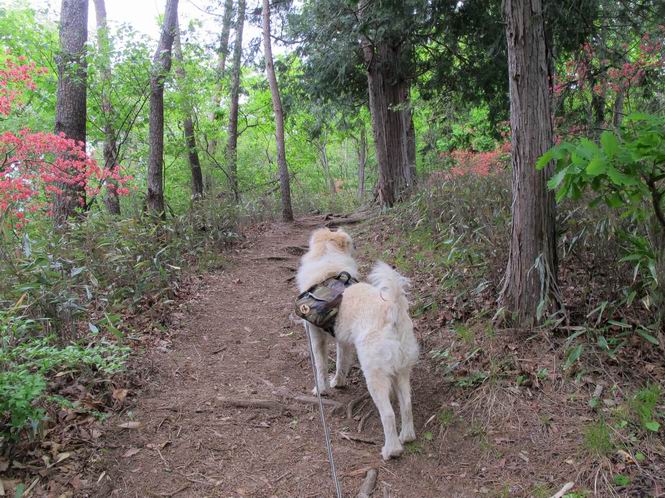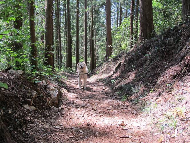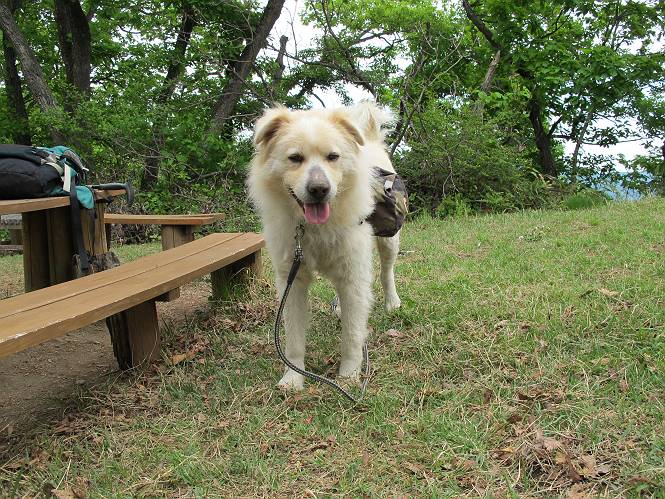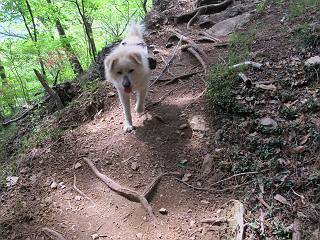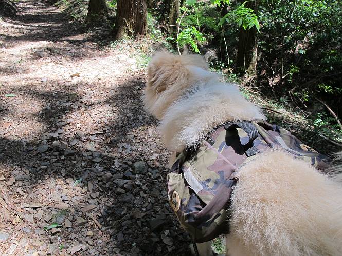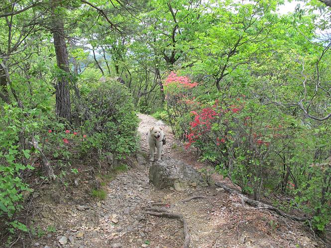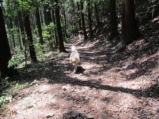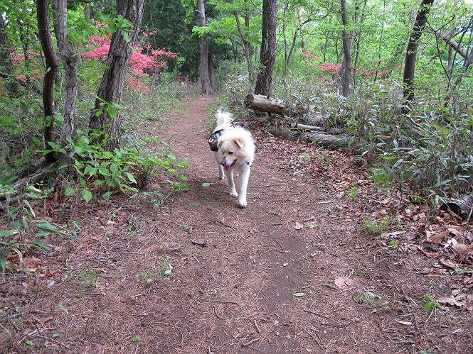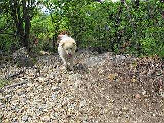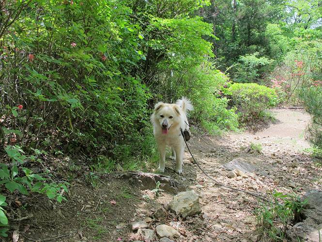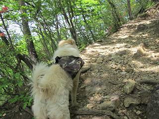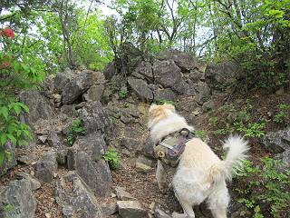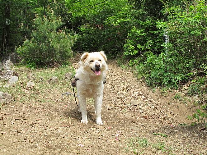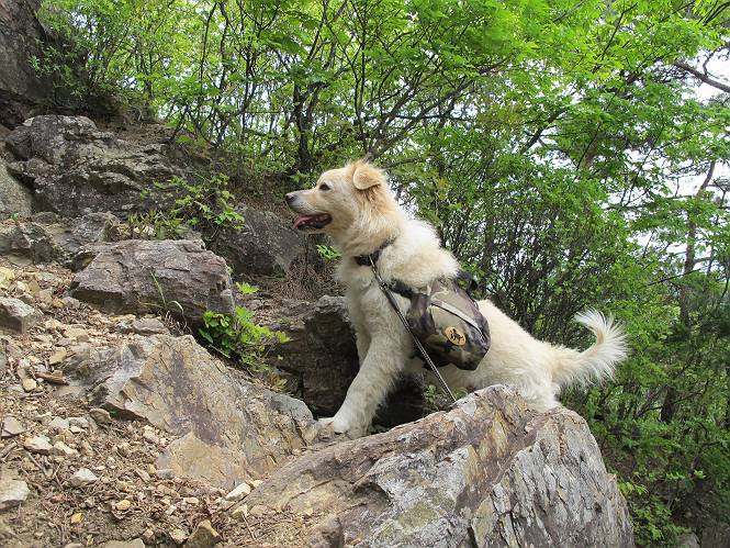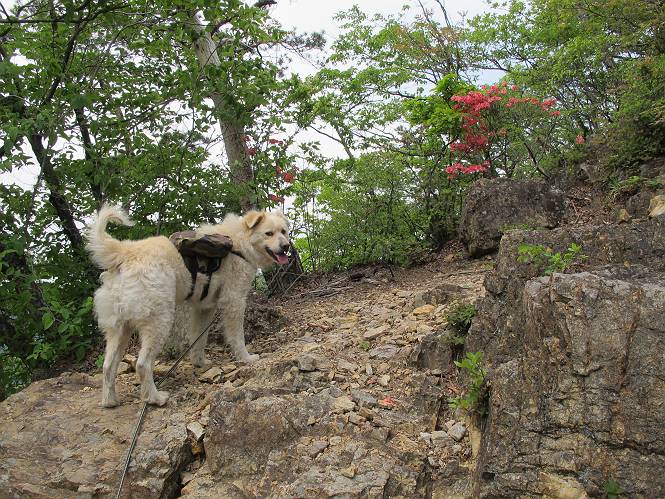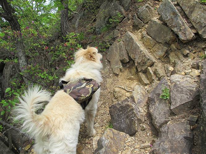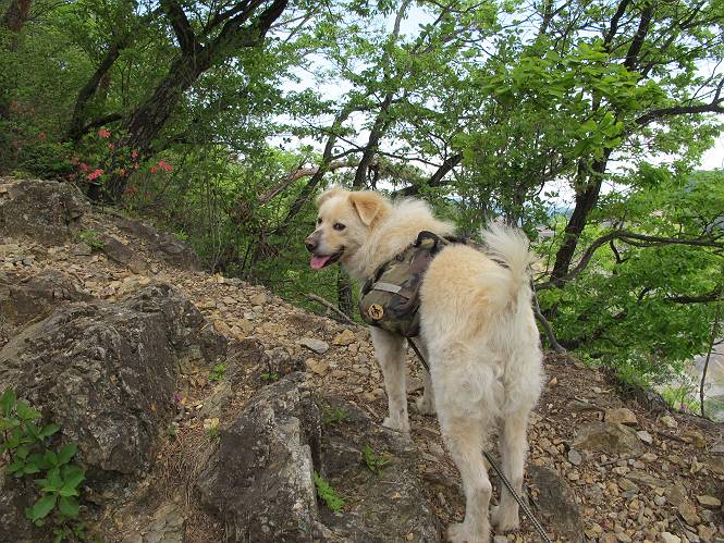 平成二十六年五月四日 Before 写真集目次へ Next 朝から良い天気で、「チュー、どこかへ出かけるか」って言うんです。この言葉、ぼくは分っているんです、「ワン、ワン・・・、早く連れてって」言っても、「まだ、まだ」で、なかなか車が動きません。やっと、昼頃になって、近くの石尊山に決まりました。叶花不動尊前は車がいっぱい、やっと、端の方に停めて出発です。 叶花不動尊から杉森の中をしばらく歩きます。 キレイに手入れされているので、日が差し込んでいます。 土手が徐々に高くなっていきます。 道も少し狭くなって、木の根や岩が出っ張っていたりします。 道が所々で分かれたり、くっついたりします。 今日は、久しぶりに、リュックを背負っています。 ぼく、デブっちゃったのでので、紐を一番緩くしてもらいました。そんなわけで、今日は緩い方の道を歩いてます。 “女人禁制”の碑のところまできました、ちょっと一息入れます。 根っ子の道がしばらく続き、丸太の道に変ります。 この丸太の階段、長いんですよ。 最後が結構な急坂です。 中間のベンチのあるお休み所に着きました。 ここから岩場の道になります。 はじめは緩やかですが、急坂になるんですよ。 岩がゴロゴロしてきました。 ヤマツツジがまだ咲いてます、きれいですね。 ヤマツツジ ヤマツツジ アブラツツジ この前行った湯殿山と石尊山はすぐ近くなんですよ。あそこもツツジがいっぱい咲いていたね。 ここも岩場の道が続きます。 でも、ここの岩場は滑らないです。 今、狭い道があって、リュックがちょっと引っかかりました。 今度はリードが引っかかりました、「お父さん、外して」 岩場って、ピョンピョン跳ね上がるのが面白いです。 こんなふうに、ピョーン、で上ります。 うーん、ここは急だなあ。 ピョン、ピョン、ピョンで上れるかなあ。 ここで少し緩くなります。 ここにもキレイな花があったよ、ツクバネウツギって言うんだってさ。 こっちは、コゴメウツギだって。 また、岩場が出てきたぞ。 でも、岩場は楽しいね。 この辺から見晴しの良い岩場ですが、今日はモヤで遠くは見えません。 ピョーン、 ピョン、だね。 このちょっと先で岩場は終わります。 リュックがチョコチョコ引っかかりましたが、すぐ先は見晴らしの良い広場です。 見晴に到着です。 お水、オヤツを頂きました。 ちょっと芝生の感触を確かめて、いいねえ。お父さんはダニがたかるから、「止めとけ」って言うんです。今日はダニヨケのスプレーをかけてきました。この前の湯殿山は50匹とったってさ、ヤダニー。 ここから緩やかに石尊山へ進みます。 ツツジがキレイですね。家族づれに2組会いました。 カッコイイって言ってたよ。 石尊山山頂に着きました。ヤマツツジの前で記念写真を撮ってもらいました。 帰りは、来た道を戻りますが、ちょっと展望の利く東側にやってきました。 また、芝生の上でお休みしてます。後では家族連れがお休み中です。 下りはラクチンです、あっという間に中間のベンチまで下りました。 丸太の階段を下って 根っ子の道を下り、 凹んだ道を下って叶花不動尊に戻りました。 ちょっと、今日は暑かったけど、緑の中を歩くのも良いねえ、ツツジなんかまだ残っていて。あとね、お父さんは、ぼくのことデブ、デブ言うのですが、動物病院の先生は、「丁度いいよ」って言ってました。 Before 写真集目次へ Next |