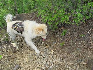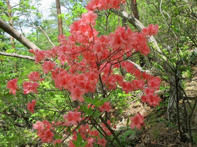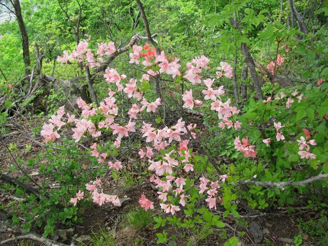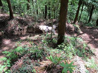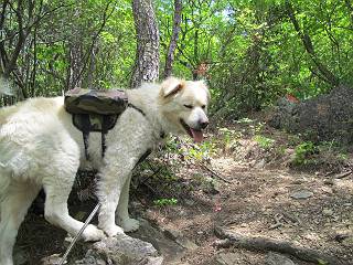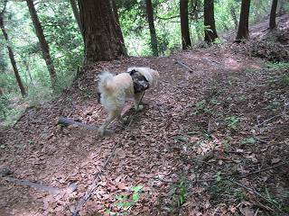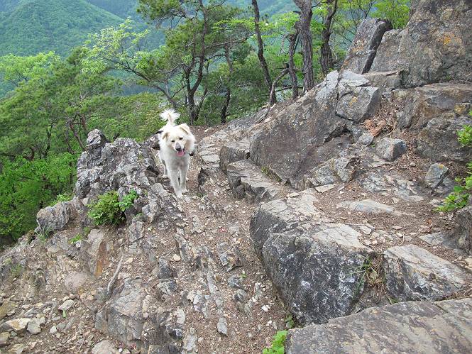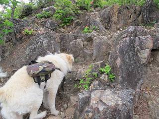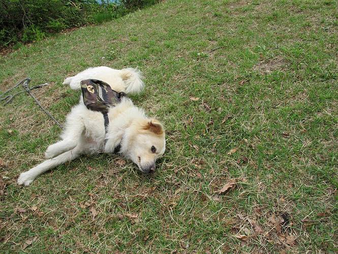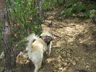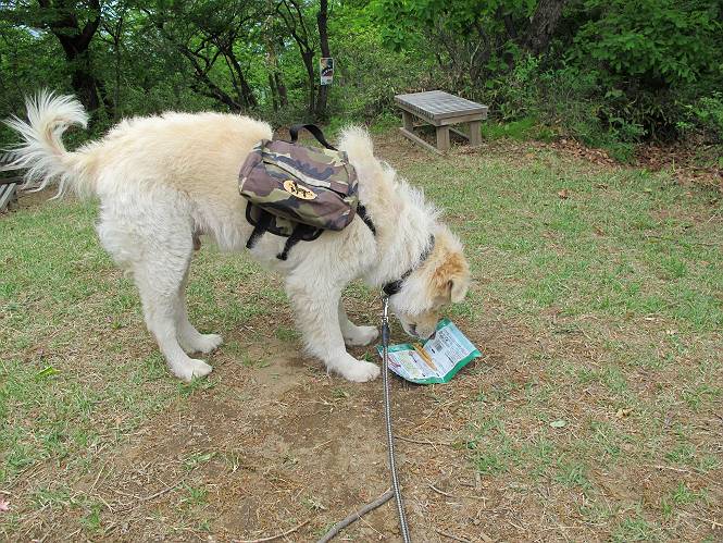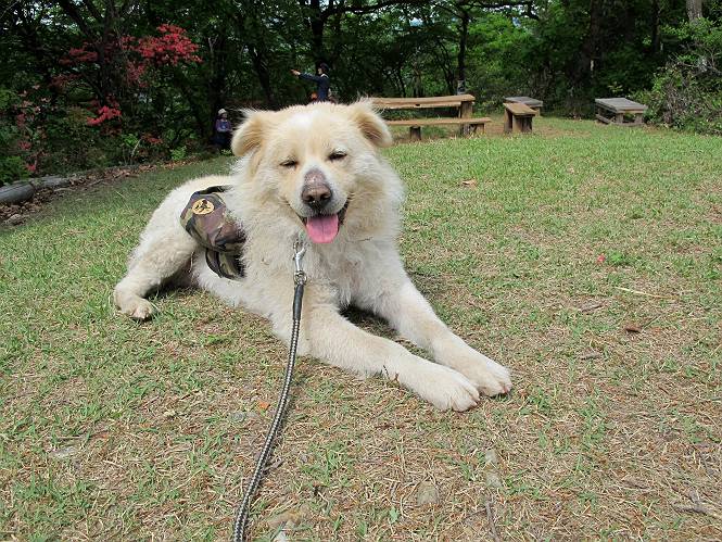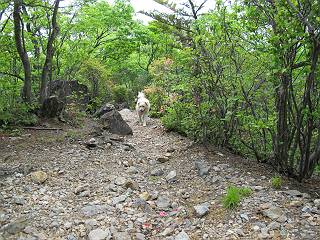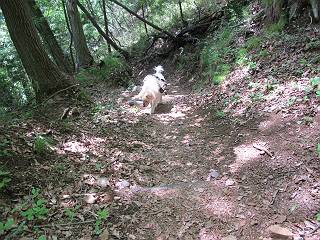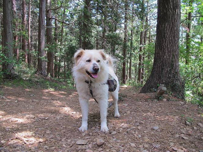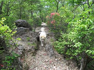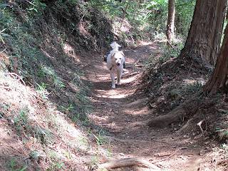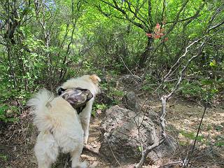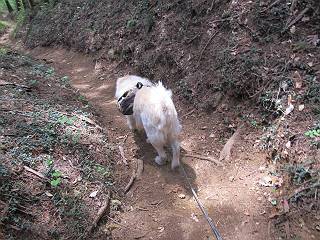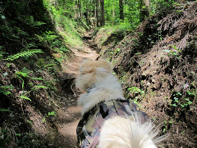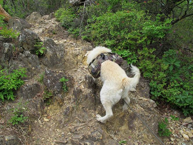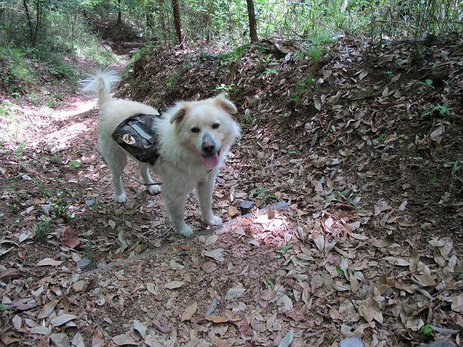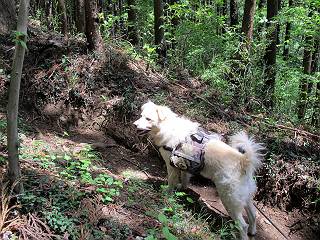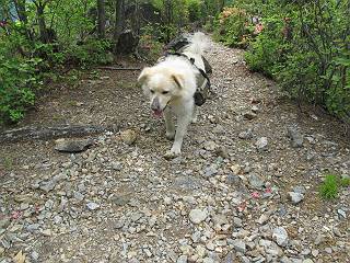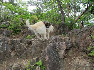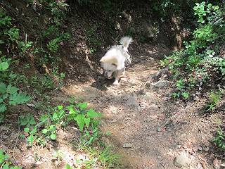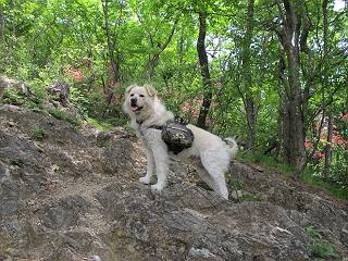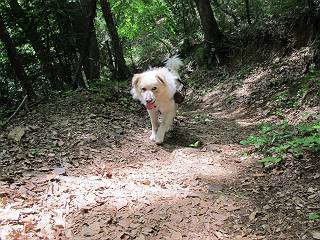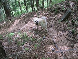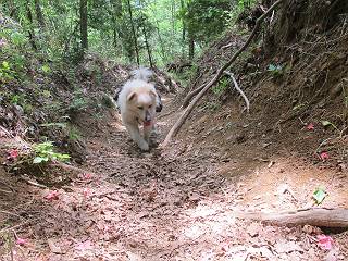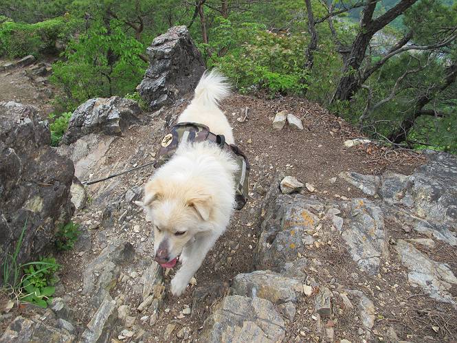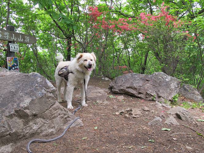 平成二十六年五月四日 Before 写真集目次へ Next 朝から良い天気で、「チュー、どこかへ出かけるか」って言うんです。この言葉、ぼくは分っているんです、「ワン、ワン・・・、早く連れてって」言っても、「まだ、まだ」で、なかなか車が動きません。やっと、昼頃になって、近くの石尊山に決まりました。叶花不動尊前は車がいっぱい、やっと、端の方に停めて出発です。 叶花不動尊から杉森の中をしばらく歩きます。 キレイに手入れされているので、日が差し込んでいます。 土手が徐々に高くなっていきます。 道も少し狭くなって、木の根や岩が出っ張っていたりします。 道が所々で分かれたり、くっついたりします。 今日は、久しぶりに、リュックを背負っています。 ぼく、デブっちゃったのでので、紐を一番緩くしてもらいました。そんなわけで、今日は緩い方の道を歩いてます。 “女人禁制”の碑のところまできました、ちょっと一息入れます。 根っ子の道がしばらく続き、丸太の道に変ります。 この丸太の階段、長いんですよ。 最後が結構な急坂です。 中間のベンチのあるお休み所に着きました。 ここから岩場の道になります。 はじめは緩やかですが、急坂になるんですよ。 岩がゴロゴロしてきました。 ヤマツツジがまだ咲いてます、きれいですね。 ヤマツツジ ヤマツツジ アブラツツジ この前行った湯殿山と石尊山はすぐ近くなんですよ。あそこもツツジがいっぱい咲いていたね。 ここも岩場の道が続きます。 でも、ここの岩場は滑らないです。 今、狭い道があって、リュックがちょっと引っかかりました。 今度はリードが引っかかりました、「お父さん、外して」 岩場って、ピョンピョン跳ね上がるのが面白いです。 こんなふうに、ピョーン、で上ります。 うーん、ここは急だなあ。 ピョン、ピョン、ピョンで上れるかなあ。 ここで少し緩くなります。 ここにもキレイな花があったよ、ツクバネウツギって言うんだってさ。 こっちは、コゴメウツギだって。 また、岩場が出てきたぞ。 でも、岩場は楽しいね。 この辺から見晴しの良い岩場ですが、今日はモヤで遠くは見えません。 ピョーン、 ピョン、だね。 このちょっと先で岩場は終わります。 リュックがチョコチョコ引っかかりましたが、すぐ先は見晴らしの良い広場です。 見晴に到着です。 お水、オヤツを頂きました。 ちょっと芝生の感触を確かめて、いいねえ。お父さんはダニがたかるから、「止めとけ」って言うんです。今日はダニヨケのスプレーをかけてきました。この前の湯殿山は50匹とったってさ、ヤダニー。 ここから緩やかに石尊山へ進みます。 ツツジがキレイですね。家族づれに2組会いました。 カッコイイって言ってたよ。 石尊山山頂に着きました。ヤマツツジの前で記念写真を撮ってもらいました。 帰りは、来た道を戻りますが、ちょっと展望の利く東側にやってきました。 また、芝生の上でお休みしてます。後では家族連れがお休み中です。 下りはラクチンです、あっという間に中間のベンチまで下りました。 丸太の階段を下って 根っ子の道を下り、 凹んだ道を下って叶花不動尊に戻りました。 ちょっと、今日は暑かったけど、緑の中を歩くのも良いねえ、ツツジなんかまだ残っていて。あとね、お父さんは、ぼくのことデブ、デブ言うのですが、動物病院の先生は、「丁度いいよ」って言ってました。 Before 写真集目次へ Next |