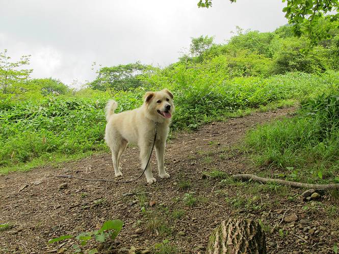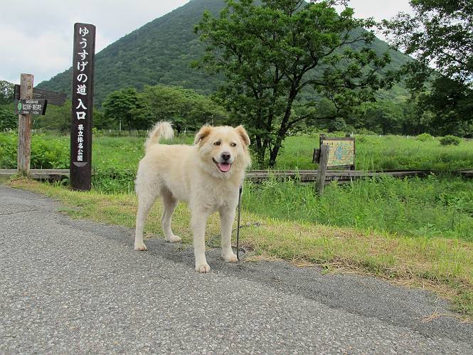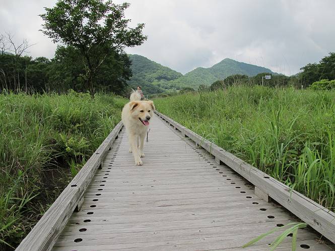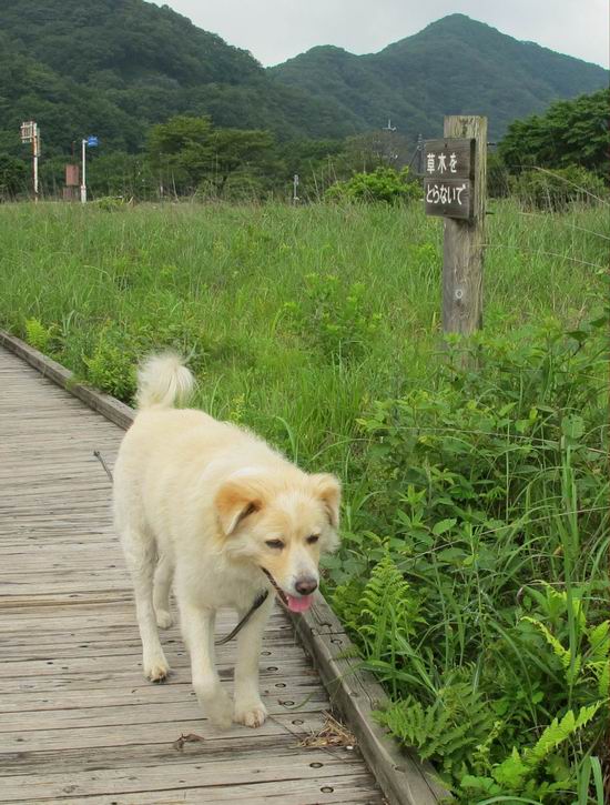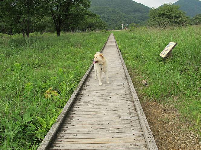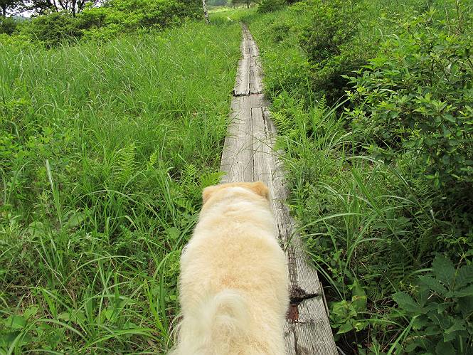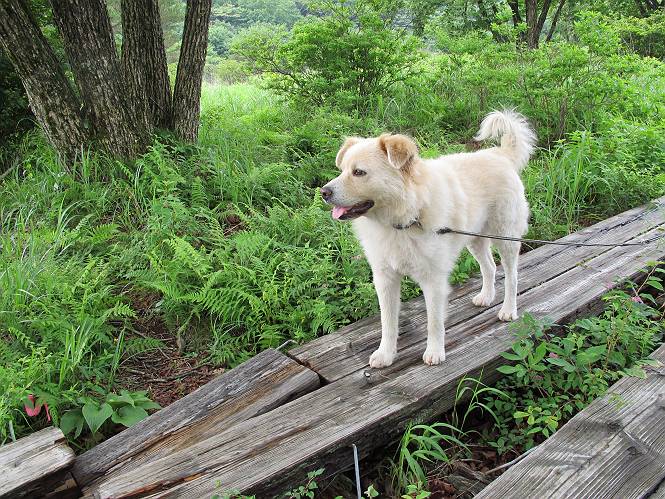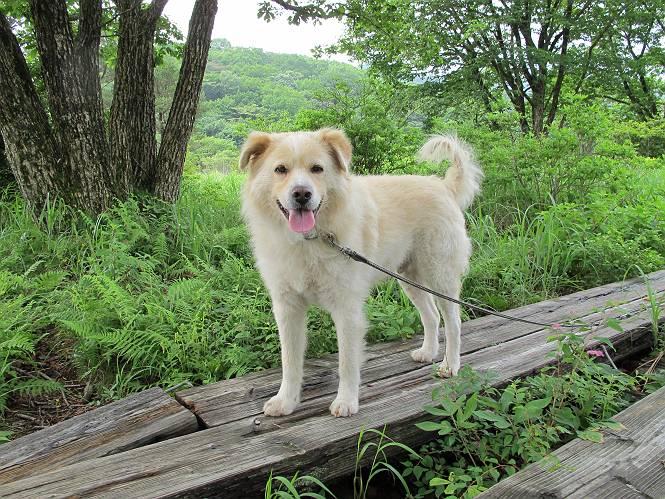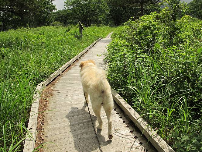 | 平成二十六年七月十五日 Before 写真集目次へ Next 毎日暑い日が続きますね。今日も日中は暑そうだから、どこか涼しい所へ連れてってくれるそうです。今朝の散歩はいつもの倍以上歩いちゃってね、大丈夫かな。行き先はしばらく振りに榛名山だそうです。もうユウスゲがが咲く頃のようです。 榛名湖近くの草原、ゆうすげの道にやってきました。ここを一周するそうです。今日はぼくと、お父さんとお母さんが一緒に歩きます。ぼくのお水とオヤツをいっぱい持ったそうです、うれしいなワン。 お花があっちにも、こっちにも咲いてます。ユウスゲってどんな花だったかなあ。 木道って歩きやすいですね。 真っ直ぐでなくて、所々で曲ったり、お休みできるようにちょっと広い場所もあります。 何が咲いてたのかな、ユウスゲかな。 そう、ユウスゲでした。色は黄色、花の形はニッコウキスゲにそっくりです。 この花は夕方咲いて日がさすと萎んでしまうそうです。 こんなのもなっていたそうです。クサボケ(シドメ)の実です、小さいりんごみたいですね。 今度は何かな。 カラマツソウです、大きくなるんですね。 あちらこちら、白い花はみんなカラマツソウのようです、後ろの山は榛名富士です。 カラマツの芽吹きに形が似ているんですって、虫が止まってますね。 ここで、道が曲ります。 このはなはアキノタムラソウかな、と言ってました。 これはヤマオダマキです。ぼくんちにも咲いてますよ。 でも、雰囲気が自然の中で一段ときれいですね、イイねぇ。 大分歩いてきました、暑くなりました。 もう少し先で、ベンチがあったらお休みするそうです。 チョウもいろいろ飛んでいます、これはシジミチョウだそうです。 これは、ちょっとボケてしまいましたが、ヒョウモンチョウの一種だそうです。 あれっ、道が狭くなるぞ。 でも大丈夫、しっかりしています。 リードが引っかかってしまった、外してチョウダイ。 木陰にやってきました、ミズナラの大木です。 ベンチがあったらいいのになあ。お水だけもらいました。 「忠治、どこ歩いてる」、「ちょっとだけ・・・・・・・」 「何かいるんだよ、ちょっとだけです」 道に戻りました。何もいませんでした。 アヤメかな、ノハナショウブだって、この辺に点々と咲いてます。 真っ直ぐ上を向いて咲くんですね。 また木陰に入りました、涼しいですね。 この赤い花、シモツケだそうです。 シモツケって、小さい花がいっぱい集まって、大きな花に見えるんだね。 シモツケを入れて撮ってもらいました。 この花はトラノオだそうです。ぼくの尻尾より短いなあ。 コアジサイ、水沢山で沢山見たね、ここは少しだけでした。 結局、ベンチがなく、一周して出口付近まできてやっと見つけました。草原を散策してオヤツをもらって、最高だね、毎日こうだといいんだけど・・・・・。 Before 写真集目次へ Next |