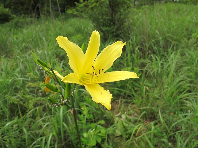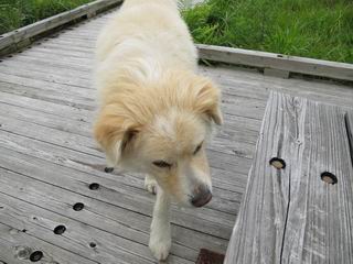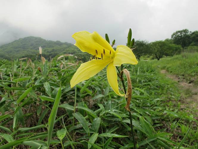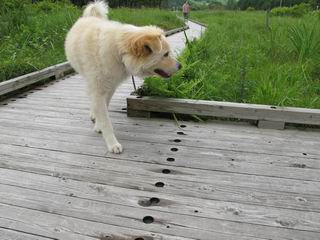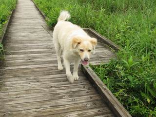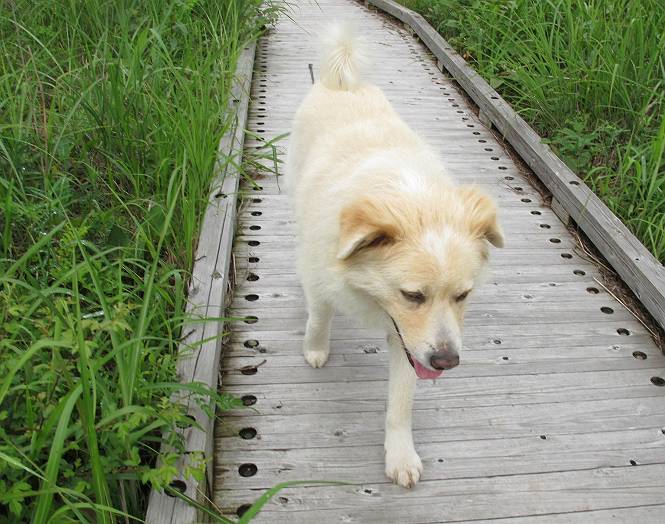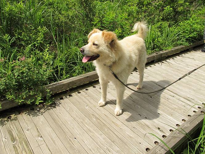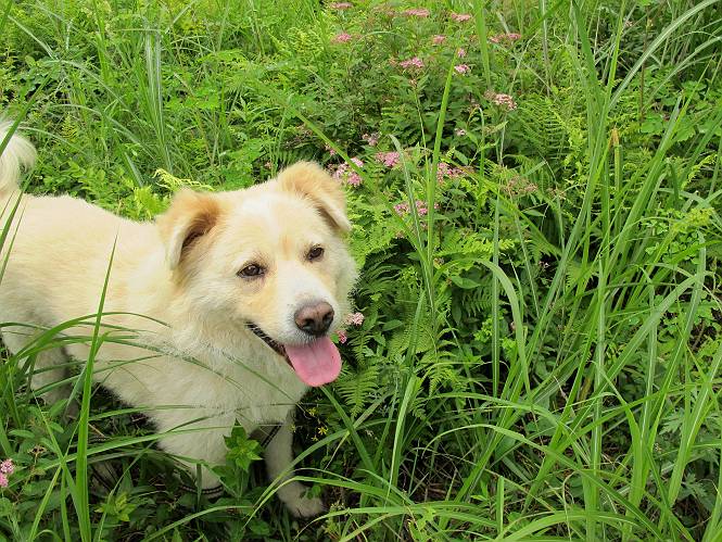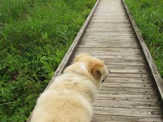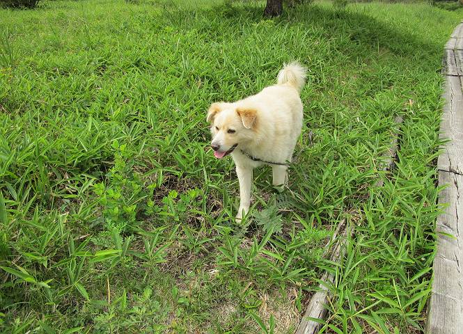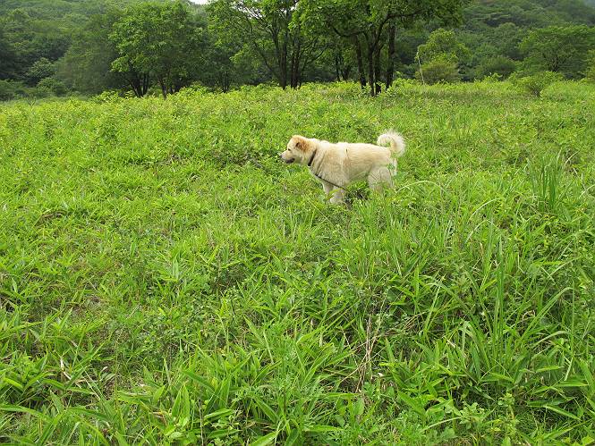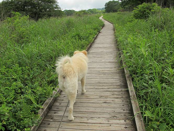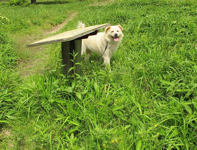 | 平成二十六年七月十五日 Before 写真集目次へ Next 毎日暑い日が続きますね。今日も日中は暑そうだから、どこか涼しい所へ連れてってくれるそうです。今朝の散歩はいつもの倍以上歩いちゃってね、大丈夫かな。行き先はしばらく振りに榛名山だそうです。もうユウスゲがが咲く頃のようです。 榛名湖近くの草原、ゆうすげの道にやってきました。ここを一周するそうです。今日はぼくと、お父さんとお母さんが一緒に歩きます。ぼくのお水とオヤツをいっぱい持ったそうです、うれしいなワン。 お花があっちにも、こっちにも咲いてます。ユウスゲってどんな花だったかなあ。 木道って歩きやすいですね。 真っ直ぐでなくて、所々で曲ったり、お休みできるようにちょっと広い場所もあります。 何が咲いてたのかな、ユウスゲかな。 そう、ユウスゲでした。色は黄色、花の形はニッコウキスゲにそっくりです。 この花は夕方咲いて日がさすと萎んでしまうそうです。 こんなのもなっていたそうです。クサボケ(シドメ)の実です、小さいりんごみたいですね。 今度は何かな。 カラマツソウです、大きくなるんですね。 あちらこちら、白い花はみんなカラマツソウのようです、後ろの山は榛名富士です。 カラマツの芽吹きに形が似ているんですって、虫が止まってますね。 ここで、道が曲ります。 このはなはアキノタムラソウかな、と言ってました。 これはヤマオダマキです。ぼくんちにも咲いてますよ。 でも、雰囲気が自然の中で一段ときれいですね、イイねぇ。 大分歩いてきました、暑くなりました。 もう少し先で、ベンチがあったらお休みするそうです。 チョウもいろいろ飛んでいます、これはシジミチョウだそうです。 これは、ちょっとボケてしまいましたが、ヒョウモンチョウの一種だそうです。 あれっ、道が狭くなるぞ。 でも大丈夫、しっかりしています。 リードが引っかかってしまった、外してチョウダイ。 木陰にやってきました、ミズナラの大木です。 ベンチがあったらいいのになあ。お水だけもらいました。 「忠治、どこ歩いてる」、「ちょっとだけ・・・・・・・」 「何かいるんだよ、ちょっとだけです」 道に戻りました。何もいませんでした。 アヤメかな、ノハナショウブだって、この辺に点々と咲いてます。 真っ直ぐ上を向いて咲くんですね。 また木陰に入りました、涼しいですね。 この赤い花、シモツケだそうです。 シモツケって、小さい花がいっぱい集まって、大きな花に見えるんだね。 シモツケを入れて撮ってもらいました。 この花はトラノオだそうです。ぼくの尻尾より短いなあ。 コアジサイ、水沢山で沢山見たね、ここは少しだけでした。 結局、ベンチがなく、一周して出口付近まできてやっと見つけました。草原を散策してオヤツをもらって、最高だね、毎日こうだといいんだけど・・・・・。 Before 写真集目次へ Next |