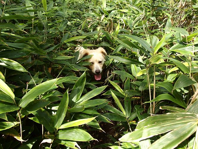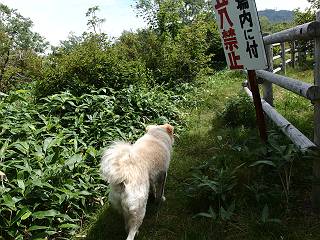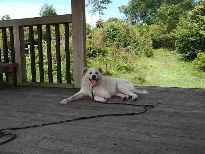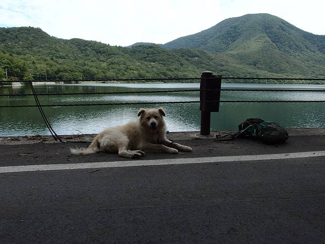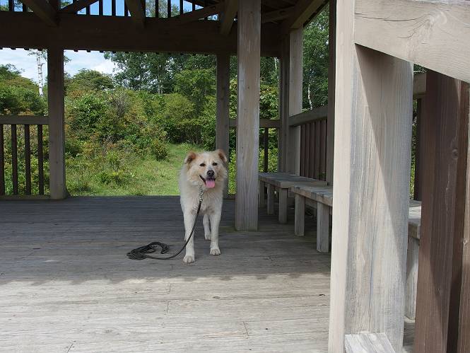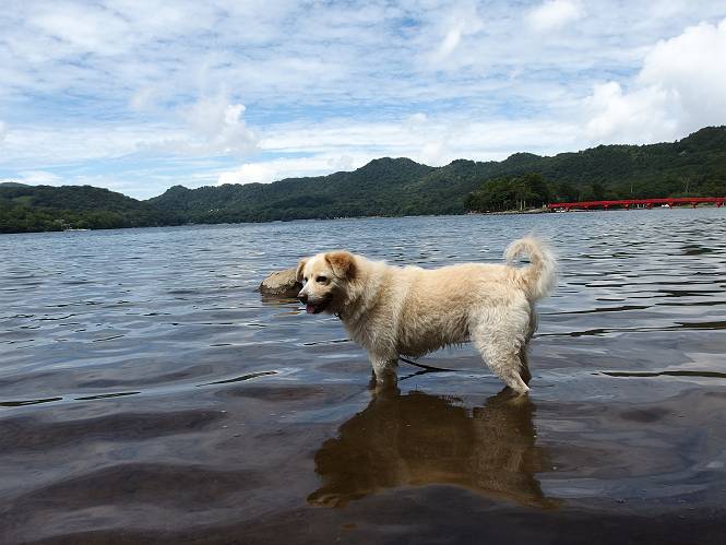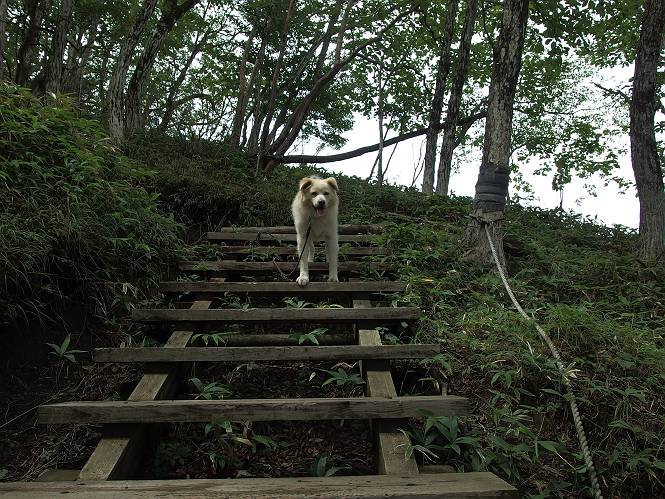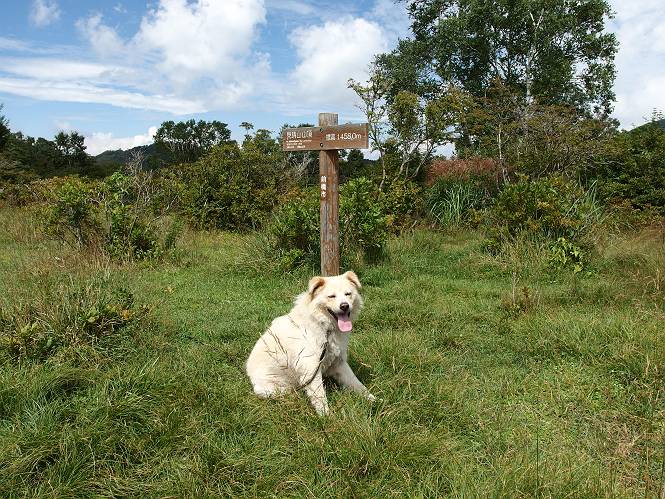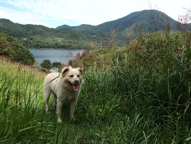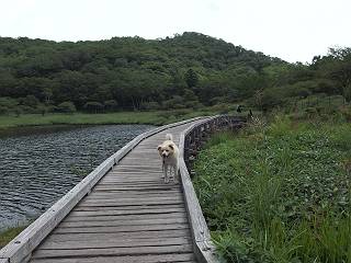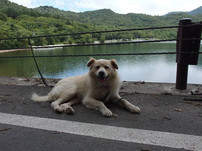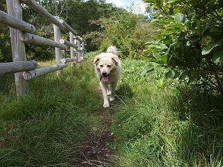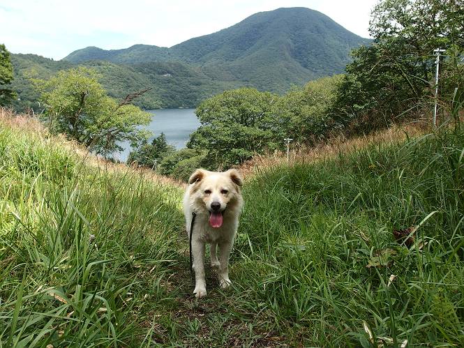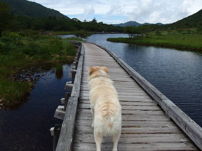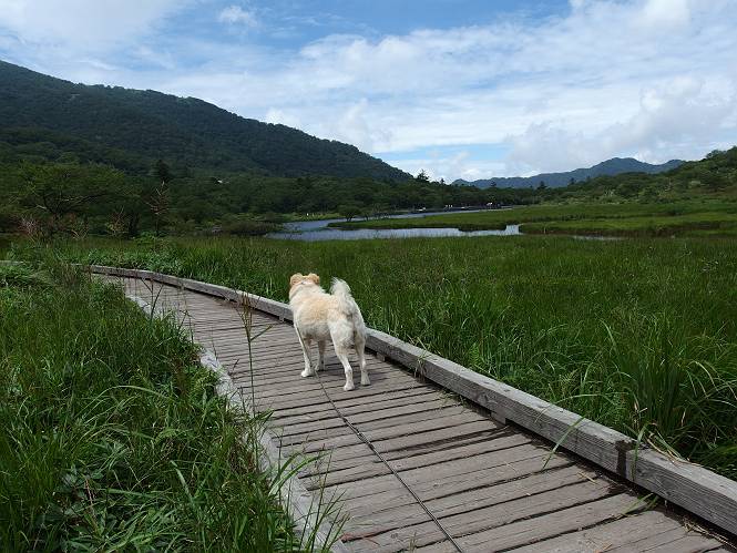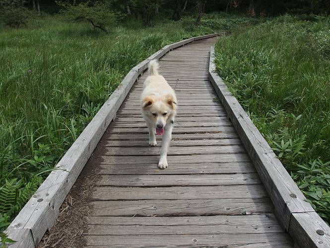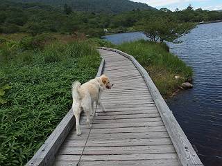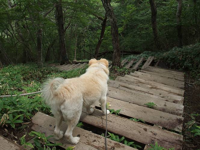 (後編) 戻り 鳥居峠に向かって、 木段を下る。 小地蔵岳の北側を緩やかに進むと鳥居峠に出ます。 鳥居峠から覚満淵です。 下って、鹿避けのネットをくぐり、覚満淵の木道にやってきました。 水辺には、リンドウ アザミ ヨツバヒヨドリが咲いてました。 こうして見ると、浮島のようですね。 木道のお休み所は家族連れでいっぱいでした。 ここの木道は、ちょっと傾いてますね。 水面には、カモの一家が楽しそうに遊んでました。 覚満淵から流れ出る小さな川です。 お水を飲んで、川の中を歩きました。冷たくて気持ち良かったでーす。 道路を少し歩いて 駐車場を抜け 大沼に出て 遊びました。 水の中は気持ち良いですよ、お父さんもどうぞ。 水面にぼくが写っているんだってね、向こうに見える赤い橋の先は赤城神社です。 石を転がして遊んでます、これが、なかなか面白いんですよ。 大勢の小さい子が並んで歩いてる、こっちへこないかなあ。 「何だ、何だ」、「モーターボートの波だよ」 「吠えて、かじって、見ている忠治が面白いや」、 「・・・・・」 次はぼくの得意、穴掘りです。 水が出てくるんですよ 「忠治、もう止めにして、沼から上ろう」 泥だらけになってしまいました、でも楽しかったね。 赤城神社を過ぎて、キャンプ場の方に曲りました。 乾いたら、泥がおちてしまいました、きれいになったでしょう。 沼尾川を過ぎた所で一休みです。後の山は黒檜山です。 これから見晴山を越えて車に戻ります。 青木旅館のところから山に上ってます。ススキの穂と黒檜山、いいですね。 大分、上ってきましたよ。この先で林に入ってしまいます。 こんな道ですよ、ぼくの背丈より高い笹です。 林から出て、やっと笹道から抜けたようです。 牧場の柵に沿って少し進みます。 ここが見晴山の山頂です、暑いなあ。 アズマヤにやってきました、残りのオヤツを全部頂きました。 今日は沢山歩いて楽しかったなあ。 ここからちょっと下れば駐車場にでます。 5時間ほど遊び歩きましたが、ぼく、まだ歩けるよ。 ぼくの写真、長くなってしまいましたが、これで終わります。 戻り |