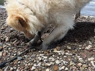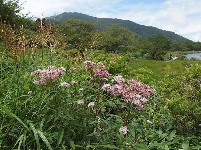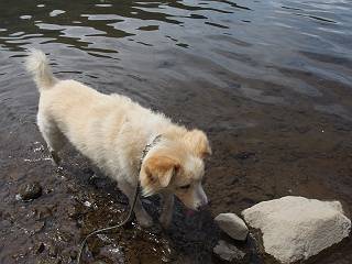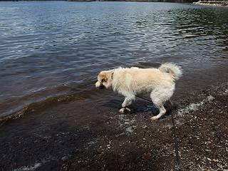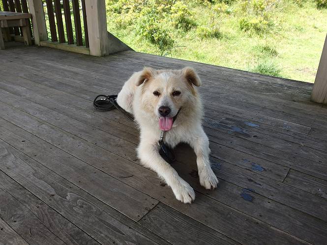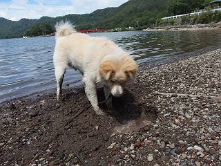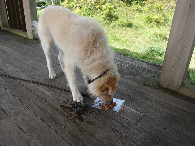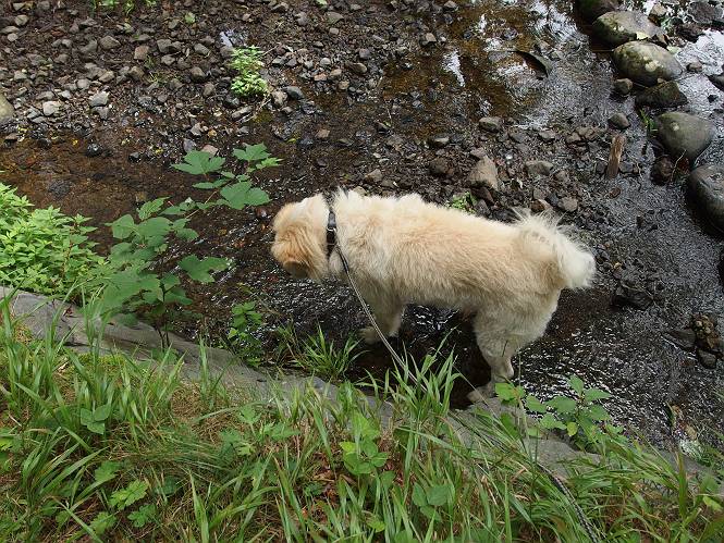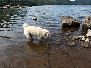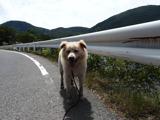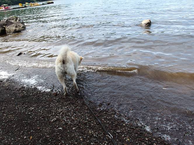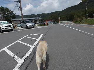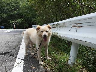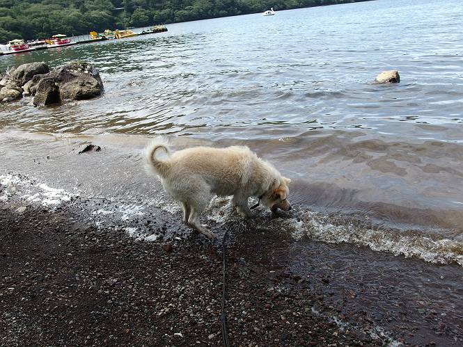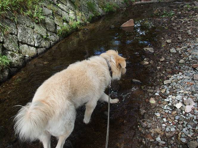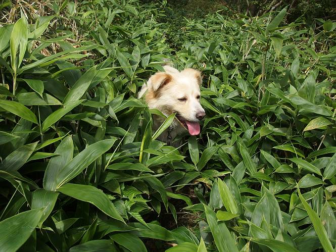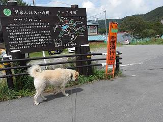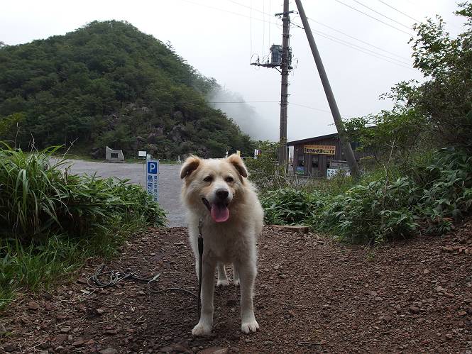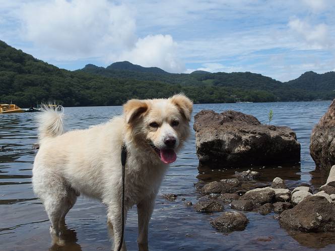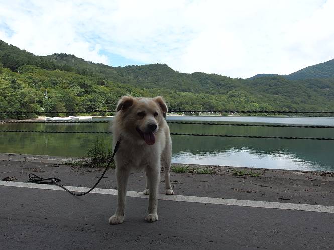 (後編) 戻り 鳥居峠に向かって、 木段を下る。 小地蔵岳の北側を緩やかに進むと鳥居峠に出ます。 鳥居峠から覚満淵です。 下って、鹿避けのネットをくぐり、覚満淵の木道にやってきました。 水辺には、リンドウ アザミ ヨツバヒヨドリが咲いてました。 こうして見ると、浮島のようですね。 木道のお休み所は家族連れでいっぱいでした。 ここの木道は、ちょっと傾いてますね。 水面には、カモの一家が楽しそうに遊んでました。 覚満淵から流れ出る小さな川です。 お水を飲んで、川の中を歩きました。冷たくて気持ち良かったでーす。 道路を少し歩いて 駐車場を抜け 大沼に出て 遊びました。 水の中は気持ち良いですよ、お父さんもどうぞ。 水面にぼくが写っているんだってね、向こうに見える赤い橋の先は赤城神社です。 石を転がして遊んでます、これが、なかなか面白いんですよ。 大勢の小さい子が並んで歩いてる、こっちへこないかなあ。 「何だ、何だ」、「モーターボートの波だよ」 「吠えて、かじって、見ている忠治が面白いや」、 「・・・・・」 次はぼくの得意、穴掘りです。 水が出てくるんですよ 「忠治、もう止めにして、沼から上ろう」 泥だらけになってしまいました、でも楽しかったね。 赤城神社を過ぎて、キャンプ場の方に曲りました。 乾いたら、泥がおちてしまいました、きれいになったでしょう。 沼尾川を過ぎた所で一休みです。後の山は黒檜山です。 これから見晴山を越えて車に戻ります。 青木旅館のところから山に上ってます。ススキの穂と黒檜山、いいですね。 大分、上ってきましたよ。この先で林に入ってしまいます。 こんな道ですよ、ぼくの背丈より高い笹です。 林から出て、やっと笹道から抜けたようです。 牧場の柵に沿って少し進みます。 ここが見晴山の山頂です、暑いなあ。 アズマヤにやってきました、残りのオヤツを全部頂きました。 今日は沢山歩いて楽しかったなあ。 ここからちょっと下れば駐車場にでます。 5時間ほど遊び歩きましたが、ぼく、まだ歩けるよ。 ぼくの写真、長くなってしまいましたが、これで終わります。 戻り |