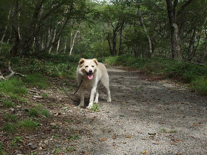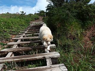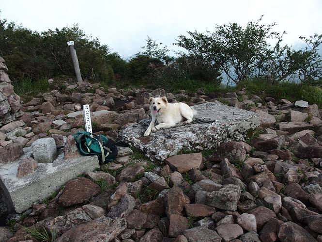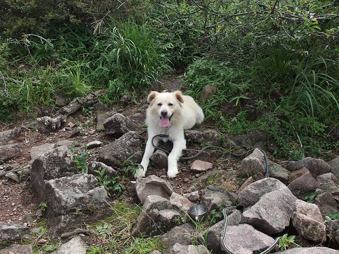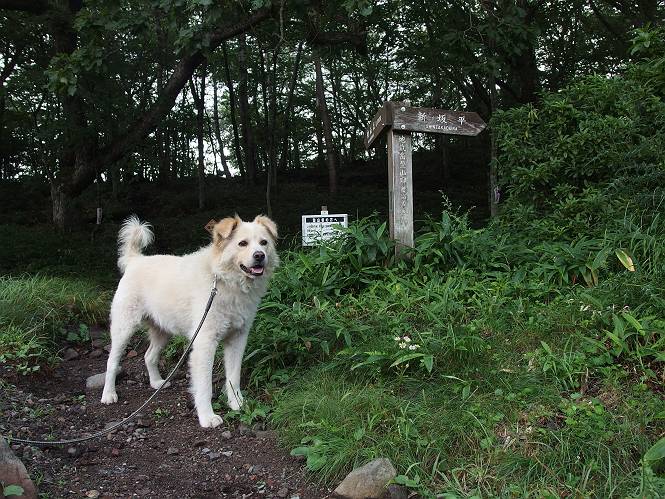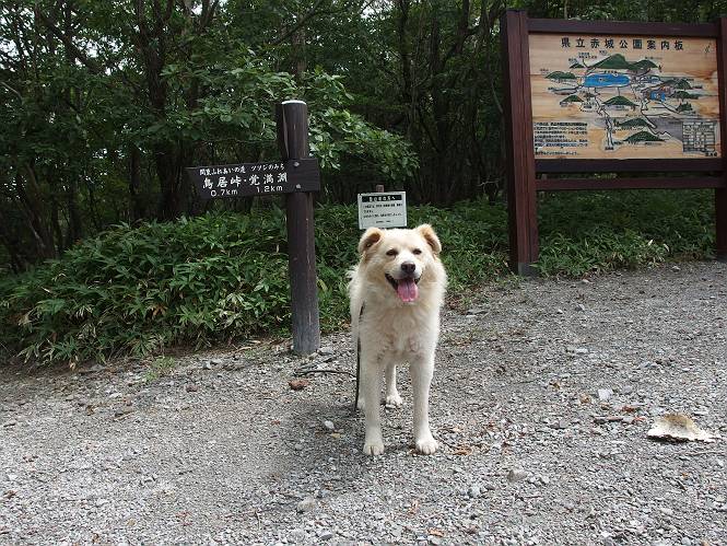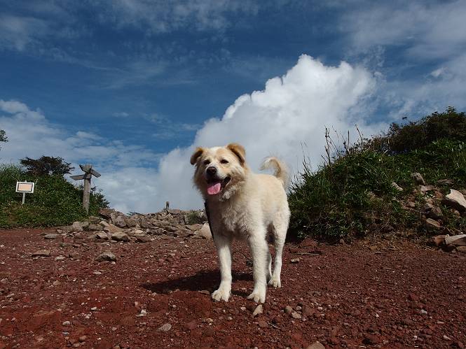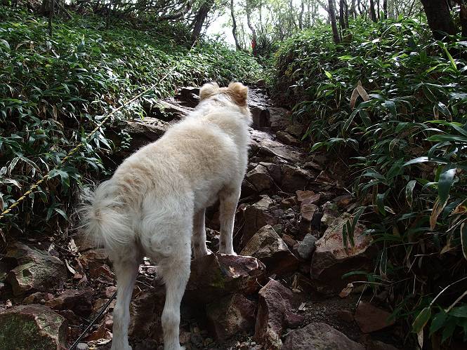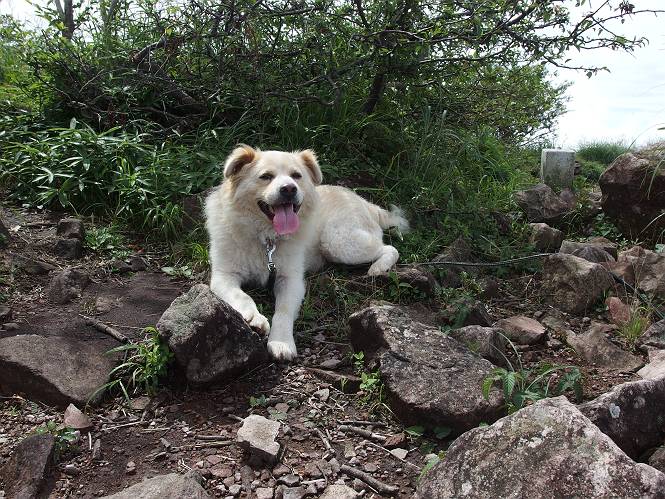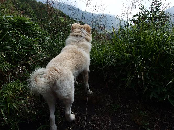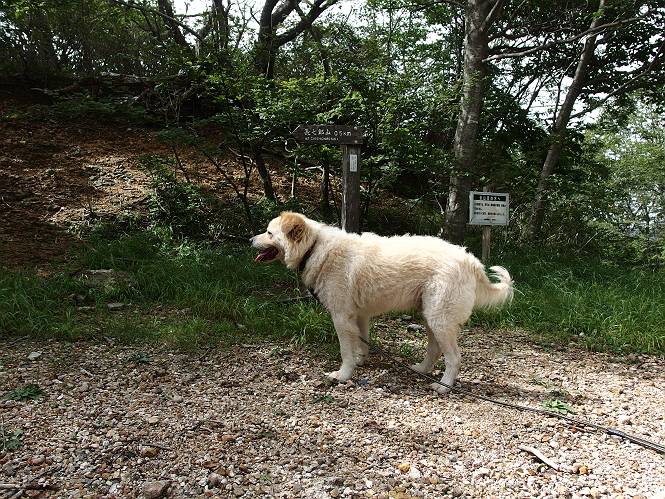 | 平成二十六年八月二十一日(前編) Before 写真集目次へ Next 暑い日が続いてます。久しぶりに赤城山をぐるっと、涼しいうちに一回り、連れてってもらいました。見晴駐車場から地蔵岳、小沼、長七郎山、西側へ下って鳥居峠へ、ここから覚満淵を通って、大沼を半周、見晴山を越えて、見晴駐車場に戻る予定だそうです。コースが長いようなので、ぼく、大丈夫かな。 【後編】も見てね。 見晴駐車場を地蔵岳に向けて出発です。 牧場の柵に沿って緩やかに上がって行きます。 尾根で、新坂駐車場からの道と合流しました。 ゴツゴツした石ころだらけの坂道に変りました。 坂が緩くなると、アンテナが正面に見えてきました、山頂はすぐそこです。 アンテナの西側です、青空と真っ黒い雲が見えます。 ここが、地蔵岳の山頂です。 黒檜山は、ガスがかかったり、払われたりしてます。 地蔵岳の石仏です。 黒檜山の山頂が見えました、早く撮って。 お水と干し肉を1枚頂きました。 まだ、それほど暑くはありません。 地蔵岳の山頂は、アンテナのところまで入れたら小沼より広いんじゃないかって言ってますよ。 東側に青空が広がりました。そろそろ長七郎山へ向かいます。 木道に沿って、点々とお花がさいてます。アザミだそうです。 これもアザミです。 これはツリガネニンジン ワレモコウだそうです。 シオガマギク ハギ マルバダケブキ マルバダケブキ 長い木段を下ります。アンテナ工事のおじさんたち、10人ほどに会いました。 ススキの間から小沼が見えました。また木段が続きます。 八丁峠の斜面を歩いて遊びました。 小沼に沿った林道を歩いて 東側で右に曲り、 長七郎山の登山口に出ました。 何だか、急に暑くなって、木陰で一休みしたいなあ。もう少し先だって。 ここで少し休んで、もうひと頑張りすれば山頂ですって。 あれ、変な道だぞ 広いところにでました、地蔵岳を入れて撮ってもらいました。 7,8人に会って、元気もらってね、長七郎山山頂に着きました。 木陰で休んでます、気持ち良いですよ。また二人通って行きました。 お水と梨を頂きました、おいしかったよ、ぼくの水はカラッポになっちゃったよ。 笹道を下って、 ツツジの間を抜けると、 林道に出ました。 林道を下ると、鳥居峠へ通じる道に出ました。最近通った道です。 ここから先は【後編】を見てね。 Before 写真集目次へ Next |