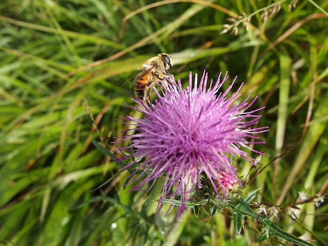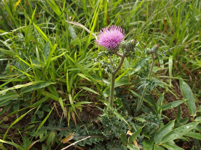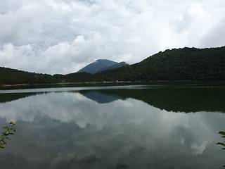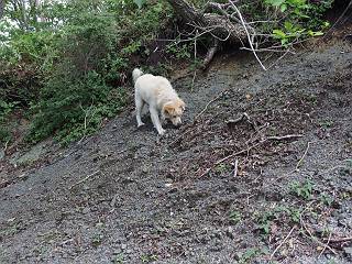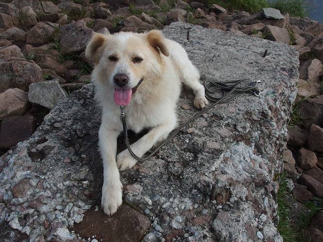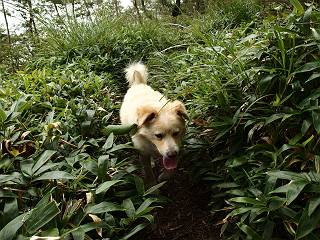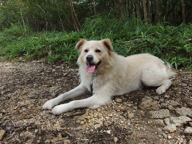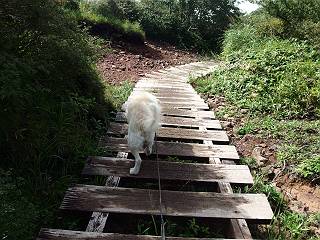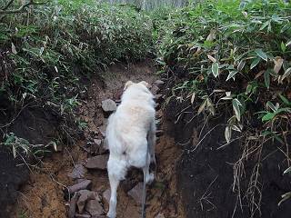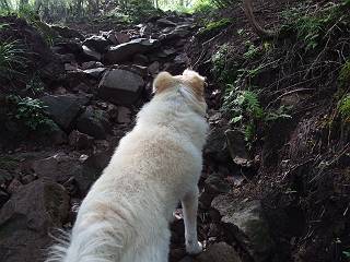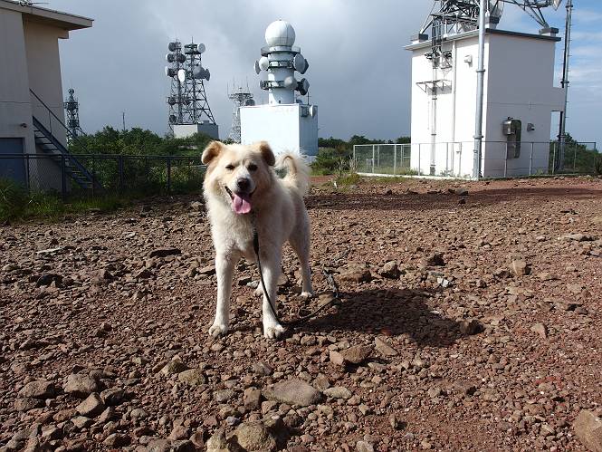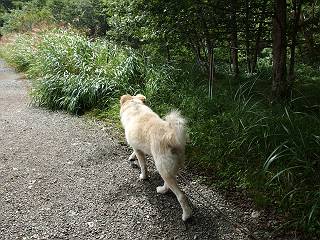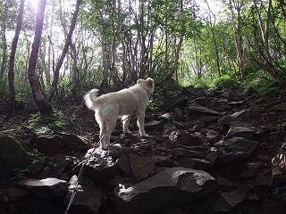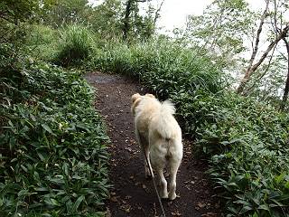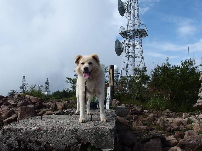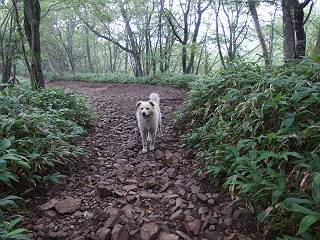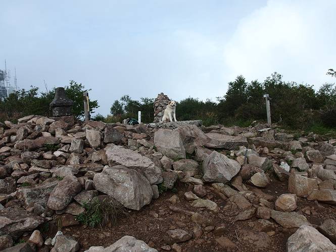 | 平成二十六年八月二十一日(前編) Before 写真集目次へ Next 暑い日が続いてます。久しぶりに赤城山をぐるっと、涼しいうちに一回り、連れてってもらいました。見晴駐車場から地蔵岳、小沼、長七郎山、西側へ下って鳥居峠へ、ここから覚満淵を通って、大沼を半周、見晴山を越えて、見晴駐車場に戻る予定だそうです。コースが長いようなので、ぼく、大丈夫かな。 【後編】も見てね。 見晴駐車場を地蔵岳に向けて出発です。 牧場の柵に沿って緩やかに上がって行きます。 尾根で、新坂駐車場からの道と合流しました。 ゴツゴツした石ころだらけの坂道に変りました。 坂が緩くなると、アンテナが正面に見えてきました、山頂はすぐそこです。 アンテナの西側です、青空と真っ黒い雲が見えます。 ここが、地蔵岳の山頂です。 黒檜山は、ガスがかかったり、払われたりしてます。 地蔵岳の石仏です。 黒檜山の山頂が見えました、早く撮って。 お水と干し肉を1枚頂きました。 まだ、それほど暑くはありません。 地蔵岳の山頂は、アンテナのところまで入れたら小沼より広いんじゃないかって言ってますよ。 東側に青空が広がりました。そろそろ長七郎山へ向かいます。 木道に沿って、点々とお花がさいてます。アザミだそうです。 これもアザミです。 これはツリガネニンジン ワレモコウだそうです。 シオガマギク ハギ マルバダケブキ マルバダケブキ 長い木段を下ります。アンテナ工事のおじさんたち、10人ほどに会いました。 ススキの間から小沼が見えました。また木段が続きます。 八丁峠の斜面を歩いて遊びました。 小沼に沿った林道を歩いて 東側で右に曲り、 長七郎山の登山口に出ました。 何だか、急に暑くなって、木陰で一休みしたいなあ。もう少し先だって。 ここで少し休んで、もうひと頑張りすれば山頂ですって。 あれ、変な道だぞ 広いところにでました、地蔵岳を入れて撮ってもらいました。 7,8人に会って、元気もらってね、長七郎山山頂に着きました。 木陰で休んでます、気持ち良いですよ。また二人通って行きました。 お水と梨を頂きました、おいしかったよ、ぼくの水はカラッポになっちゃったよ。 笹道を下って、 ツツジの間を抜けると、 林道に出ました。 林道を下ると、鳥居峠へ通じる道に出ました。最近通った道です。 ここから先は【後編】を見てね。 Before 写真集目次へ Next |