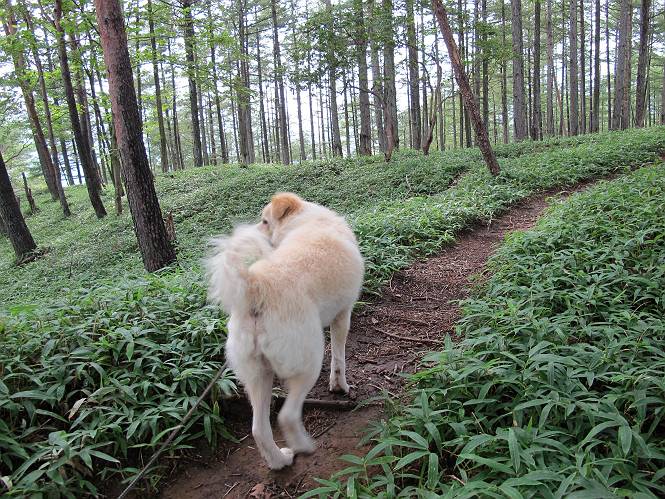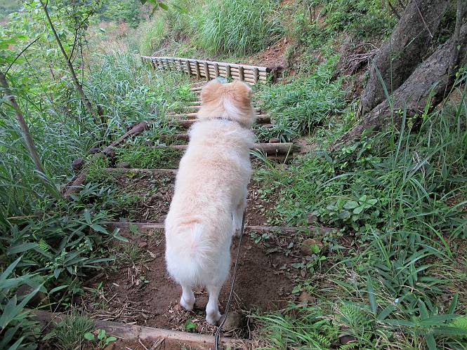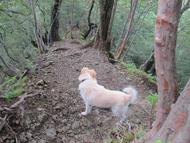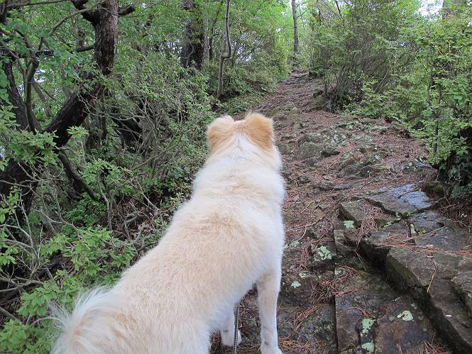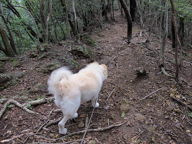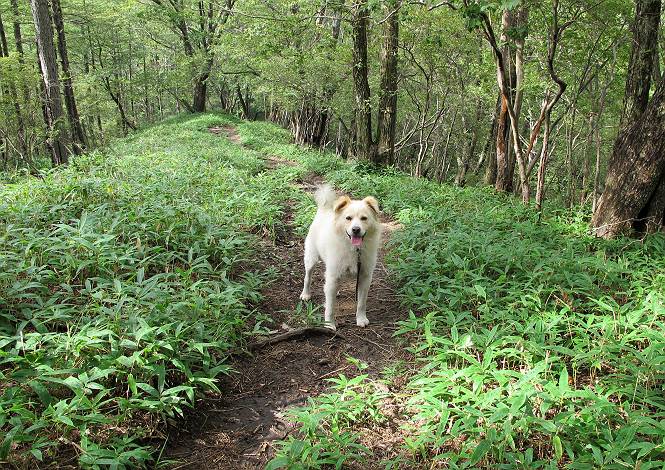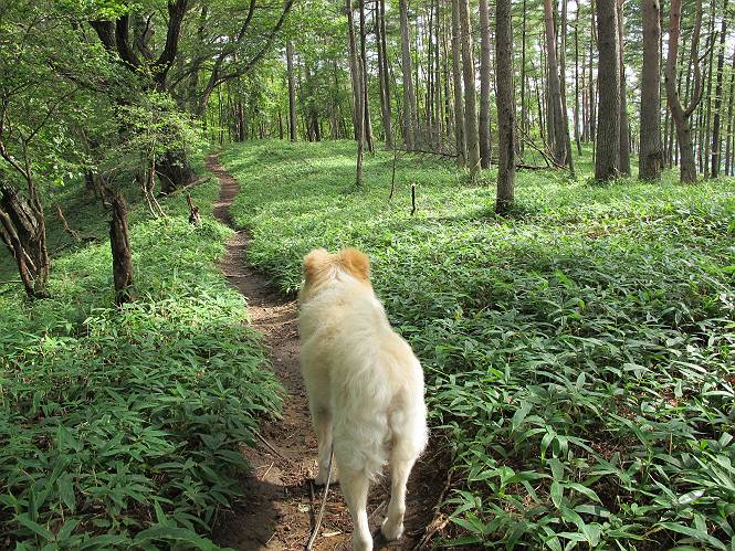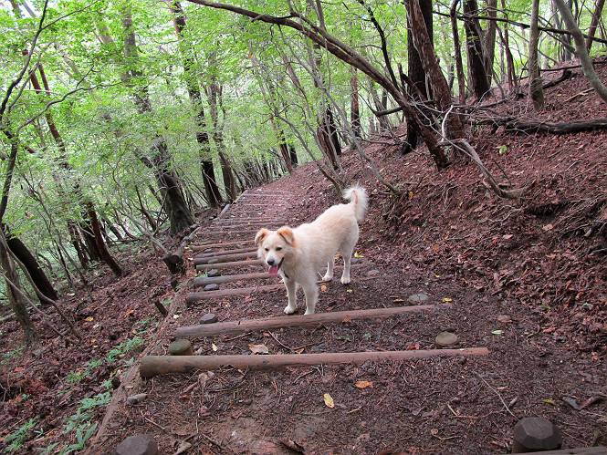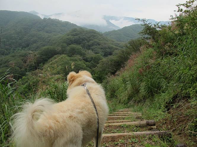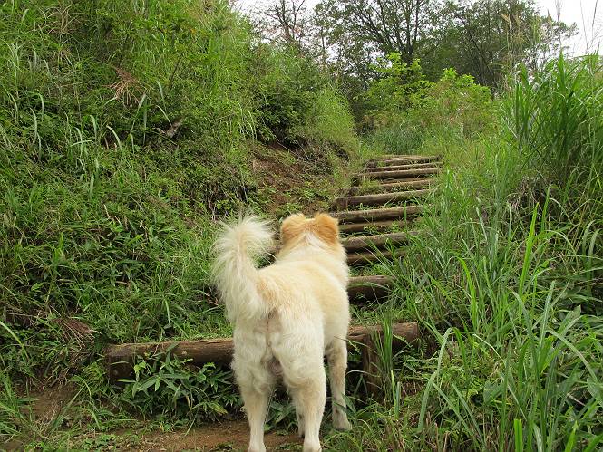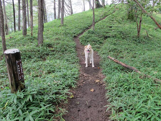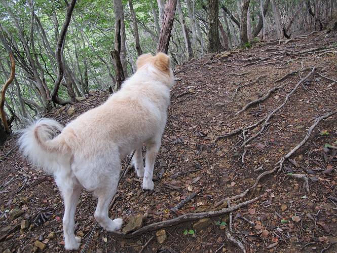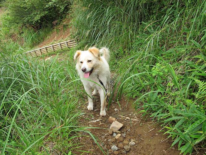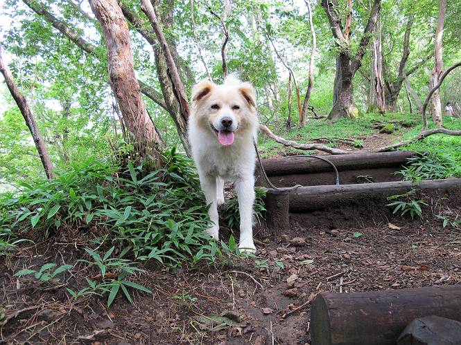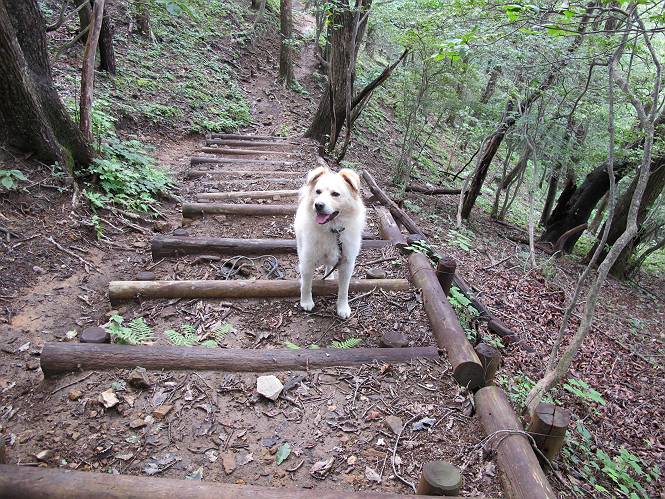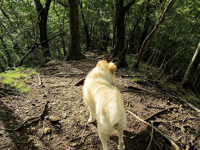 | 平成二十六年九月五日 Before 写真集目次へ Next お昼を過ぎて、雨が降りそうなので、散歩に出かけるのかと思ったら、「足尾の備前楯山へ行くぞ」、ということになりました。久しぶりに、お母さんも一緒に歩くんだって。登山口の舟石峠へ向かう途中、銀山平まで、雨が降っていたのですが、幸い降らなかったようです。 ぼくが先頭、お父さん、お母さんの順で出発します。 ススキの原から丸太の段を上っていきます。 ピョコピョコ跳ねながら上ってます、後ろのススキがきれいでしょう。 ここから笹の中を緩やかに歩きます。 備前楯山まで、あと1.2kmだって。 ひと登りすると、山頂まで意外に近いんですよ。 緑がきれいでしょう。ちょっと先に、お休みのベンチもあるんですよ。 また、丸太の段を上って、 ここで道が曲って、あと0.7kmだそうです。 もう少しで、尾根に出るんだよ。 みんな、来てるかな。 木の根もアチコチで出ているから引っかからないように、ヨイショ。 時々きつい坂道がありますが、木段が出来てます。ここは段差が小さいので歩き易いです。 あと、もう少しかな? まだかなあ? この坂が最後の上りのようです。 やっと、山頂です、ヨイショ。 ぼく、お母さんが、後にいるので、一生懸命あるいちゃったね。薄日がさして、山頂は暑いね。お水と、オヤツもらって、お休みしました。これが楽しいんだよね。 ここは、見晴らしが良いのですが、??? 今日は、・・・、見えないなあ。 ちょっと先まで、行って見ます。 こちら側も雲がかかっていて、見えないなあ。 ちょっと、降りてみるか。 お父さん、駄目だよ、崖だから危ないよ。 「ぼくも行っていい?」、「ダメだね」 しばらく遊んで、来た道を戻ります。 下りはラクチンです。 何か居そうだな、鹿かな? もう、半分下っちゃったよ。舟石駐車場まで、0.8kmだって。 お母さんは、後ろからゆっくり来るよ、見えますか? まわりを覗き込みながら歩いていたら、 直ぐ後に近づいて来てました。 ぼくは、この笹の中を歩きたいなあ。 もう、ススキが出てきましたよ。 遠くの山もちょっと見えてきたね、もうちょっとだ。 舟石駐車場に到着です。 ぼく、今日は、ハリキリ過ぎかな、お母さんと一緒、楽しかったねえ。 Before 写真集目次へ Next |