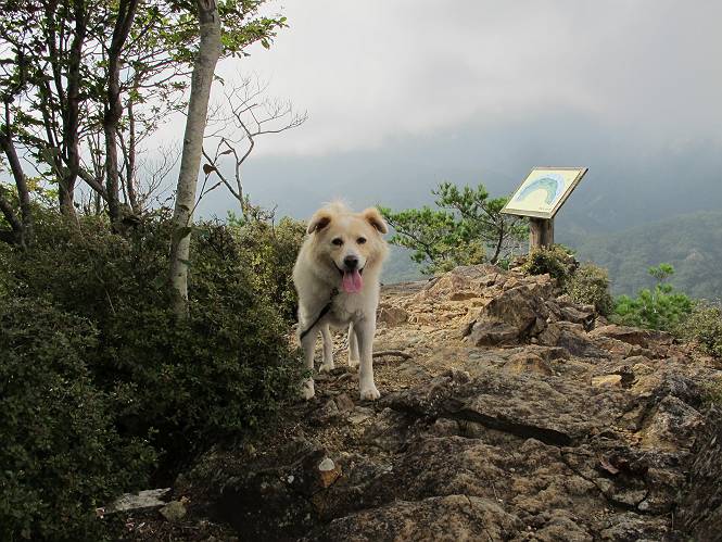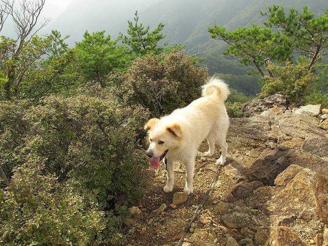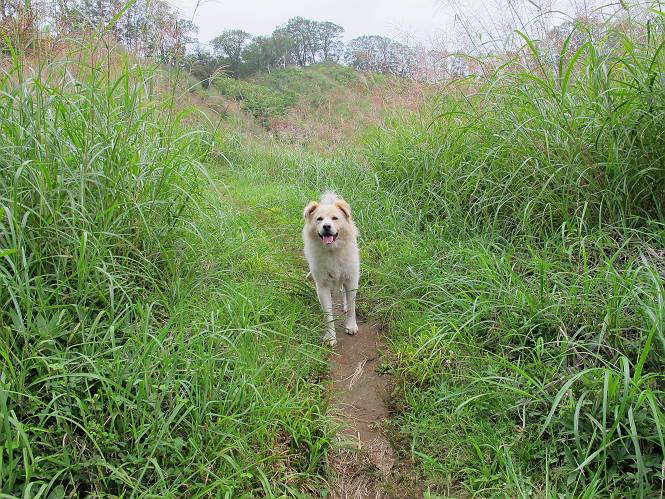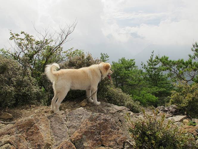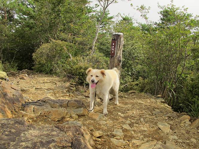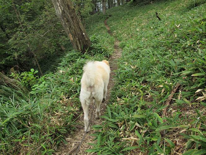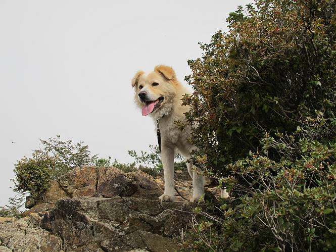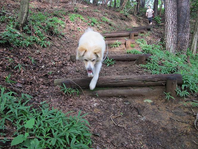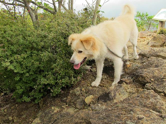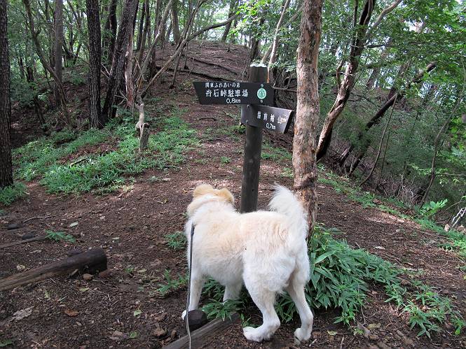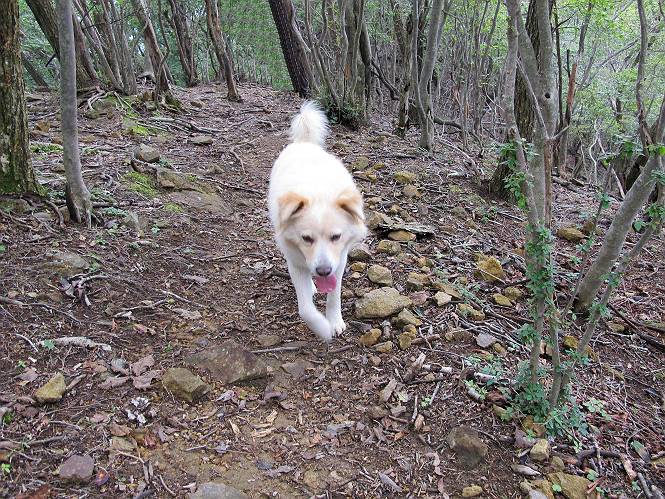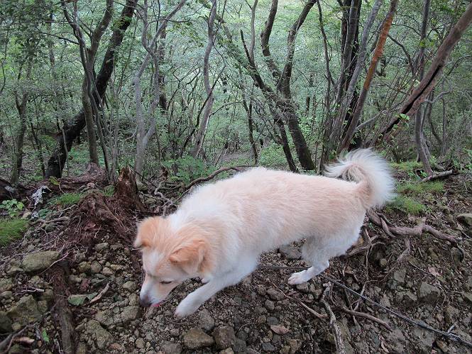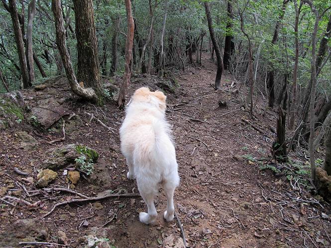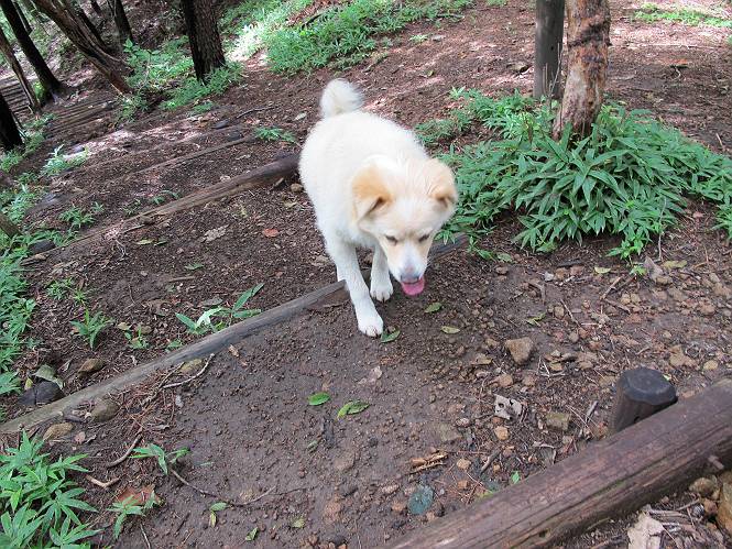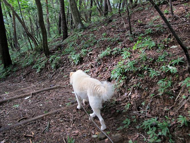 | 平成二十六年九月五日 Before 写真集目次へ Next お昼を過ぎて、雨が降りそうなので、散歩に出かけるのかと思ったら、「足尾の備前楯山へ行くぞ」、ということになりました。久しぶりに、お母さんも一緒に歩くんだって。登山口の舟石峠へ向かう途中、銀山平まで、雨が降っていたのですが、幸い降らなかったようです。 ぼくが先頭、お父さん、お母さんの順で出発します。 ススキの原から丸太の段を上っていきます。 ピョコピョコ跳ねながら上ってます、後ろのススキがきれいでしょう。 ここから笹の中を緩やかに歩きます。 備前楯山まで、あと1.2kmだって。 ひと登りすると、山頂まで意外に近いんですよ。 緑がきれいでしょう。ちょっと先に、お休みのベンチもあるんですよ。 また、丸太の段を上って、 ここで道が曲って、あと0.7kmだそうです。 もう少しで、尾根に出るんだよ。 みんな、来てるかな。 木の根もアチコチで出ているから引っかからないように、ヨイショ。 時々きつい坂道がありますが、木段が出来てます。ここは段差が小さいので歩き易いです。 あと、もう少しかな? まだかなあ? この坂が最後の上りのようです。 やっと、山頂です、ヨイショ。 ぼく、お母さんが、後にいるので、一生懸命あるいちゃったね。薄日がさして、山頂は暑いね。お水と、オヤツもらって、お休みしました。これが楽しいんだよね。 ここは、見晴らしが良いのですが、??? 今日は、・・・、見えないなあ。 ちょっと先まで、行って見ます。 こちら側も雲がかかっていて、見えないなあ。 ちょっと、降りてみるか。 お父さん、駄目だよ、崖だから危ないよ。 「ぼくも行っていい?」、「ダメだね」 しばらく遊んで、来た道を戻ります。 下りはラクチンです。 何か居そうだな、鹿かな? もう、半分下っちゃったよ。舟石駐車場まで、0.8kmだって。 お母さんは、後ろからゆっくり来るよ、見えますか? まわりを覗き込みながら歩いていたら、 直ぐ後に近づいて来てました。 ぼくは、この笹の中を歩きたいなあ。 もう、ススキが出てきましたよ。 遠くの山もちょっと見えてきたね、もうちょっとだ。 舟石駐車場に到着です。 ぼく、今日は、ハリキリ過ぎかな、お母さんと一緒、楽しかったねえ。 Before 写真集目次へ Next |