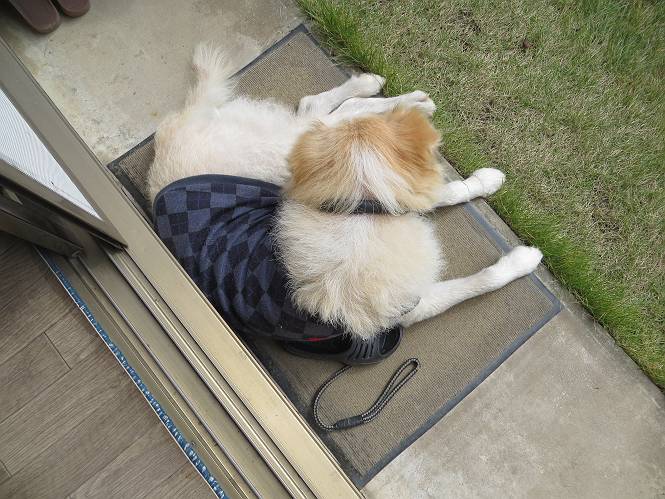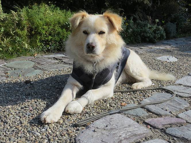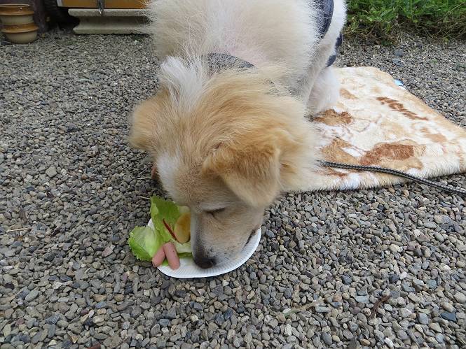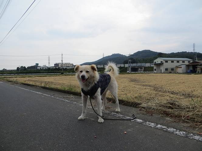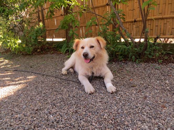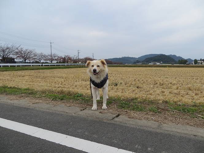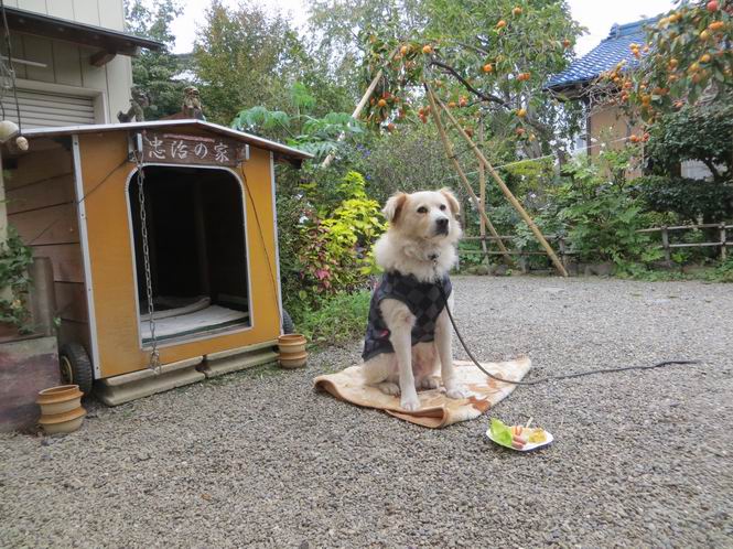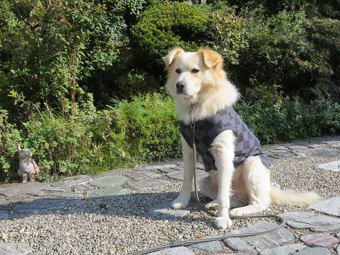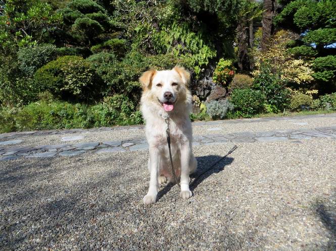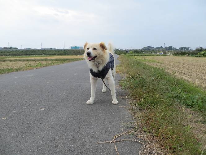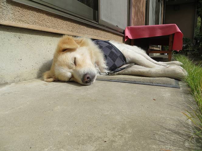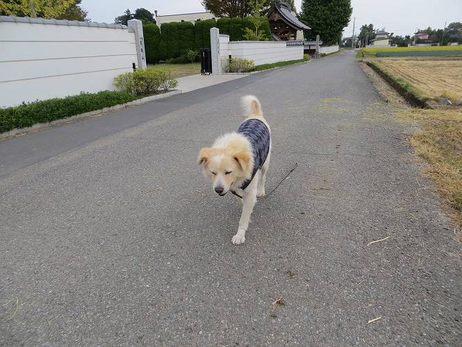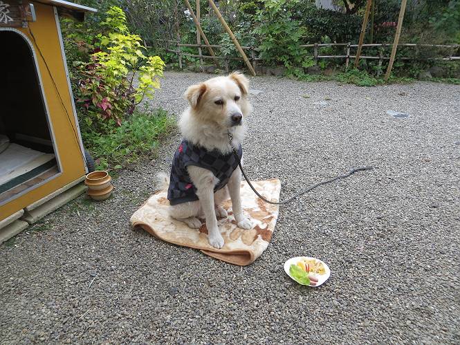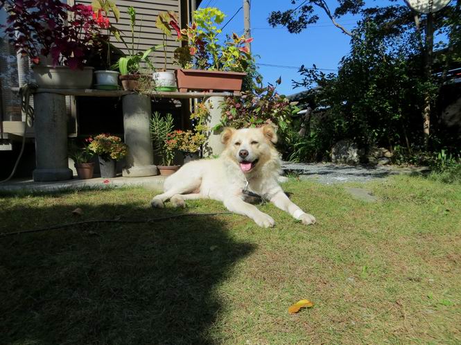 平成二十六年十月二十日 Before 写真集目次へ Next ぼく、19日で9才になりました、早いものですね。毎日同じようなことをして過ごしてますが、「忠治は、それでいいんだよ」って言われてます。怪我するな、病気になるな、といつも言われてますが、また、左前足の狼爪を引っ掛って取っちゃって、まだ直らないんです。 【16日にお庭で撮った写真、3枚です】 ぼくの9才って、中型犬として人間の56才位だってさ。小さいときは毛が厚く、コロコロしてましたが、今は皮膚が透けて見えるんだってね。だから、暑がりだったのが、寒がりになっちゃったんだよね。朝晩、寒くて震えているので、チョッキを着せてもらってます。 【19日にお庭で撮ってもらった2枚です】 昨日は日差しが弱くて寒かったので、犬走りのマットの上で丸くなっていたら、寝てしまいました。薄日がさしてポカポカして眠ってしまいました。 【20日、軒下で2枚撮られてました】 散歩は好きなんですよ、今の時期ですと、薄暗いうちに家を出て、40、50分かけて一回りします。午後は、昼過ぎ、朝よりちょっと少ないかな、一回りしてきます。午後の散歩は遊びながらが多いので、ゆっくりです。 【20日、午後の散歩】 2時過ぎに、お母さんがお使いから帰って、誕生祝をしてくれました。ホットケーキでしょ、リンゴでしょ、ウインナーソーセージ、レタス・・の盛り合わせです。美味しかったです。 「食べていい、ワン」 「まだ? 早く、ワン」 バターの香りがいいなあ、ホットケーキから食べよう リンゴも大好き 家の者、みんなぼくを可愛がってくれます。ぼくは、お留守番をしてお返しぐらいしかできませんが、美味しいご飯をいつも頂いてます。そうだ、朝晩の散歩はね、お父さんの健康づくりに役立っているとか、良く引張りっこするからね。 Before 写真集目次へ Next |