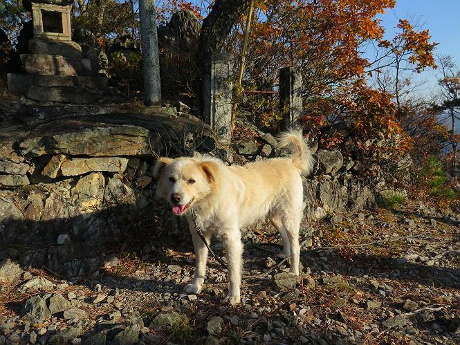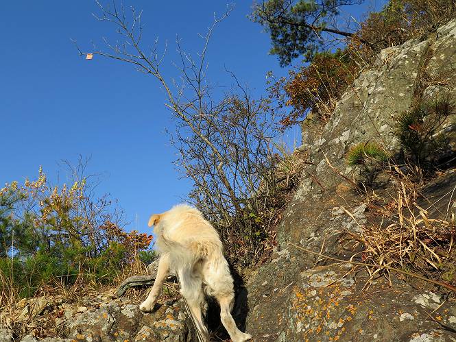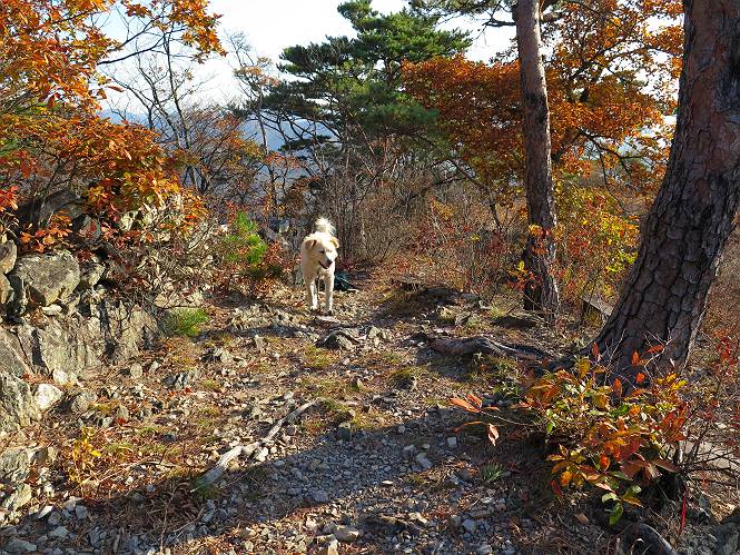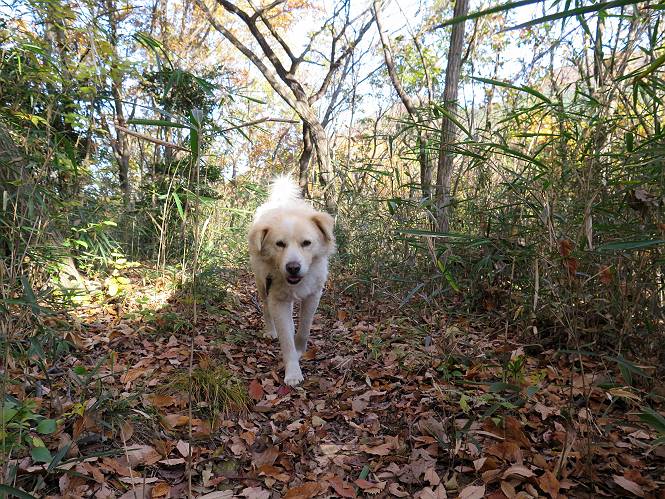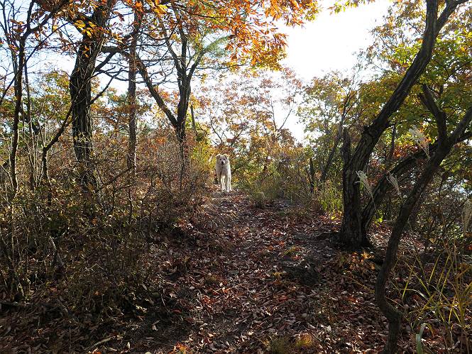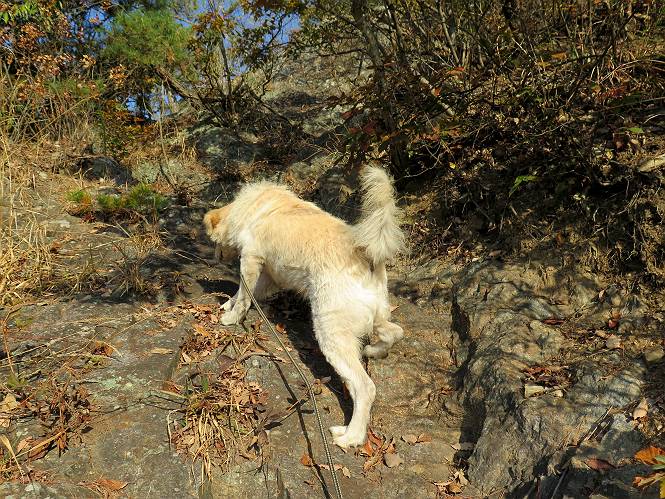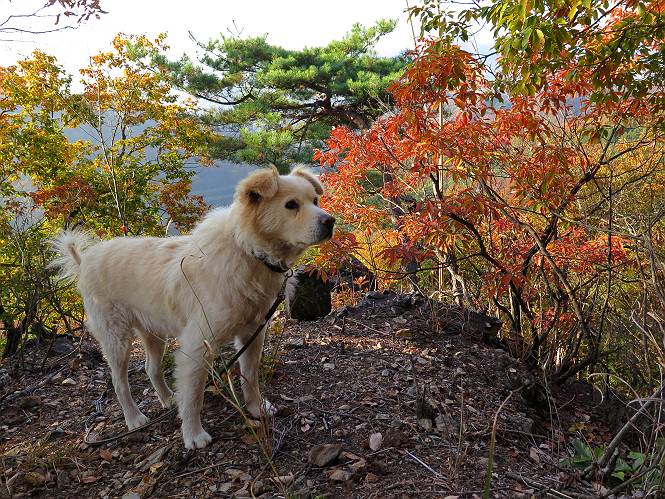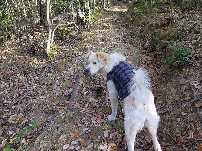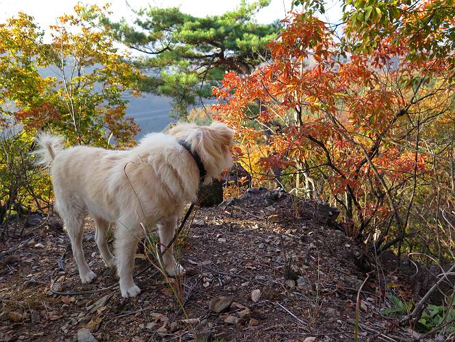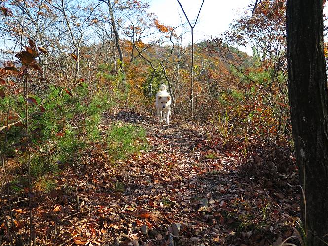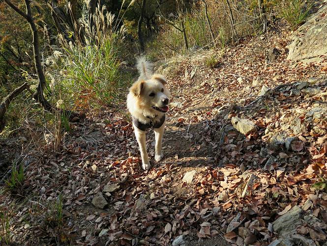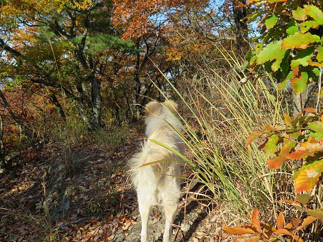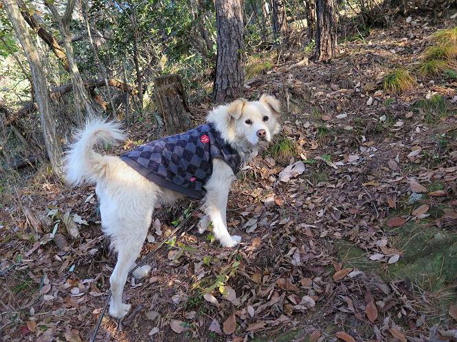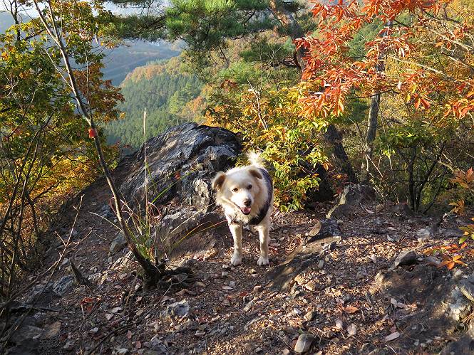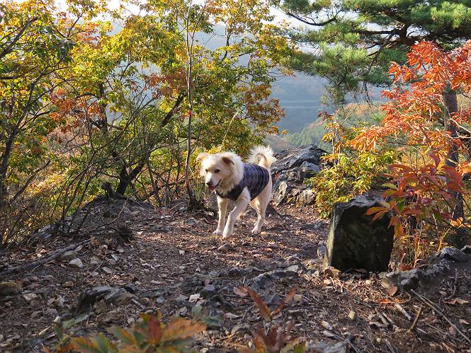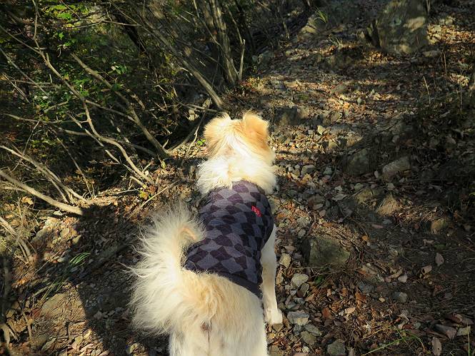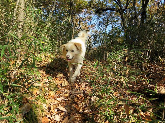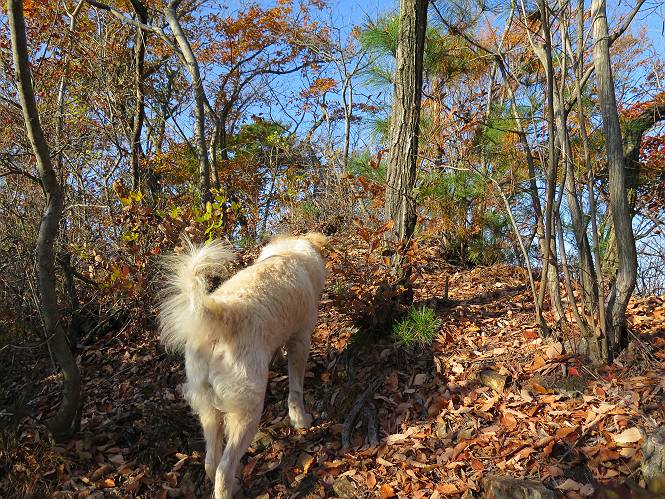 平成二十六年十一月二十三日 Before 写真集目次へ Next 足の怪我は爪がはえかわり、すっかり治ってますが、お父さんの用事が混んでいて、なかなかお山に連れて行ってもらえません。今日は突然、「朝の散歩やめて、山に行くぞ」、って言うんです。ビックリしてしまいましたが、でも嬉しいです。どこへ行くのかな、と思ったら、渡良瀬川の葉鹿橋を渡り、良く来るホームセンターの先を右に曲りました、湯殿山です。 いつもと同じ登山口から山頂へ向かうそうです。 お墓(?)の脇を通り尾根伝いに歩いてます。 所々で落葉が沢山積もってます。 一気に急坂を上がってきましたので、暑くなりました。 しばらくゆるやかな道が続きます。 陽が当たってきました、 お父さんは、上着を脱いで、 、帽子をとって、手袋を外しましたが、ぼくはもう少し先まで行って・・・。 そろそろ岩場に出ます。 おお、紅葉がきれいだな。 早速、紅葉の前で撮ってもらいました。 お水とビスケットを一つもらって、チョッキを脱ぎました。 赤い紅葉は、ミズナラの木ですって 、きれいですね。 ここから岩場がずっと続きます。 「ヨイショ、ドッコイショ」 「オットット、危なかったなあ」 「ヨイショ!、今度はうまくいったな」 「ここは簡単、ヨイショ」 もう、危なそうな場所は過ぎたってさ。 岩の間を緩やかに上ります。 「おお、もう少しで、湯殿山の山頂です」 ちょっと戻るように進んで、 山頂周辺も紅葉がきれいですね。 ミズナラやツツジが多いようです。 湯殿山神社到着です。 記念写真を撮ってもらいました。 ベンチでオヤツとお水を頂きました。 帰りは、いつも東側に下るのですが、 今日は、西側の尾根、つつじの峰を下ります。 小さい小山が幾つも連なっているようです。 落葉が沢山積もってますね。 尾根は、ほとんど落葉樹で明るく、今日の陽気ではポカポカです。 後の山は湯殿山です。 上ったり、下ったり 結構長い尾根ですね。この辺は紅葉が終わったようですが、 この先は紅葉が残ってますね。 「早く、来い!」、だって。 「ハイ、ハーイ」 「ウワー、赤城山が見えた、手前の山は紅葉真っ盛りだ、姥穴山かな」 「スゴイぞ、スゴイ、真っ赤っ赤だヨー」 「あっちって、ぼくんちの方かな」 紅葉を眺めながら残ったオヤツとお水を頂きました。 「この尾根、まだまだ続くのかなあ」、「この先は下っちゃうんだよ」 「そうか、・・・・・」 、ということで、また記念写真を撮ってもらいました。 間もなく桧林を抜け笹道を通って、 どんどん下って、 分岐点に出ました、中山駐車場の方向に下ります。 危なっかしい橋を渡り、林道にでました。 車の方向は? しばらく考えてましたが、5分ほどで出発点に戻れました。今日の湯殿山、初めての道を歩いて、楽しかったでーす。 Before 写真集目次へ Next |