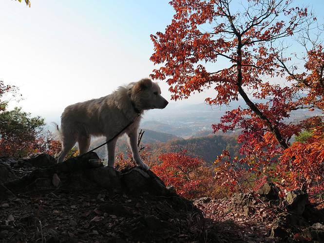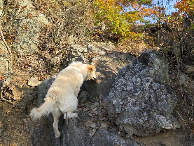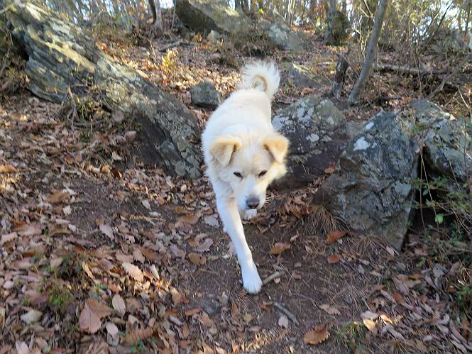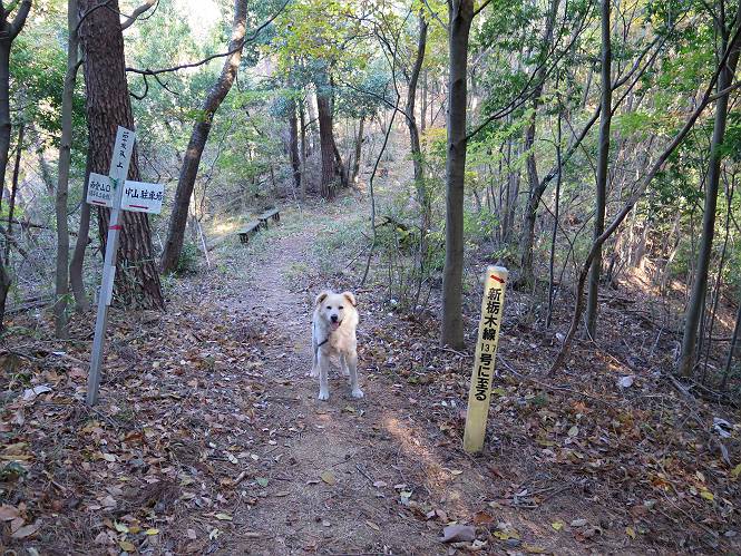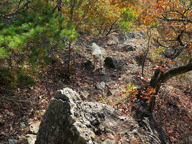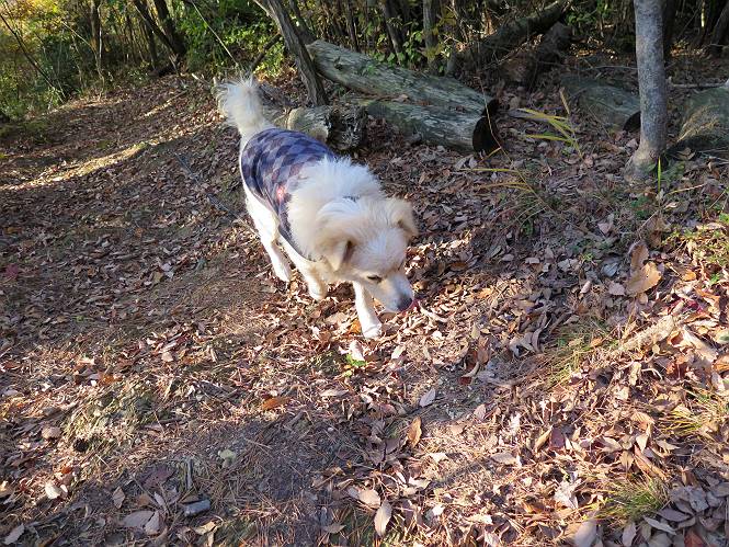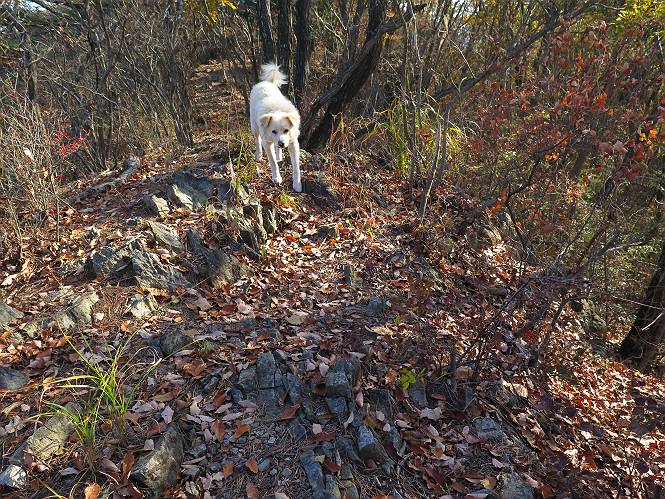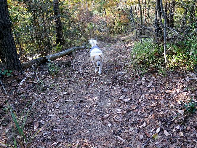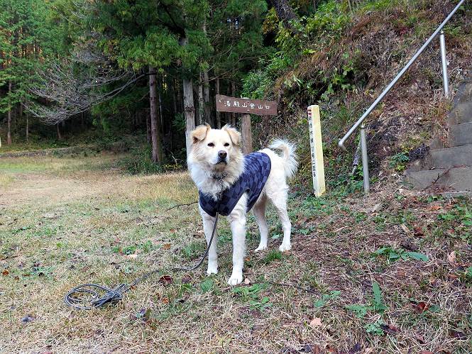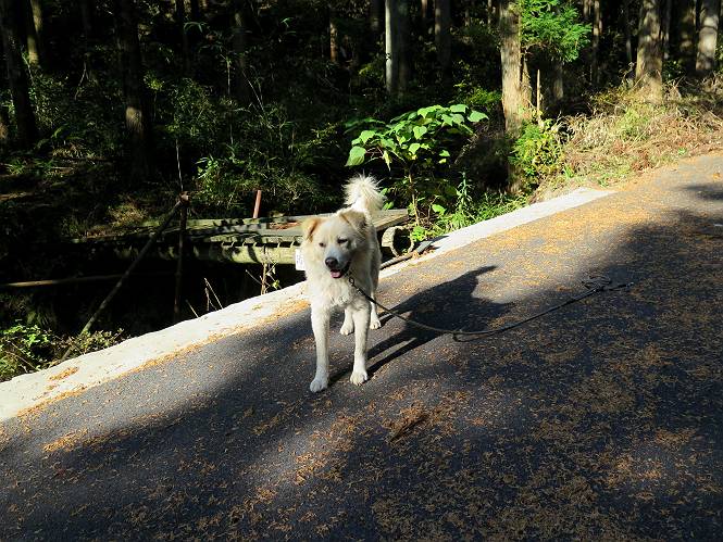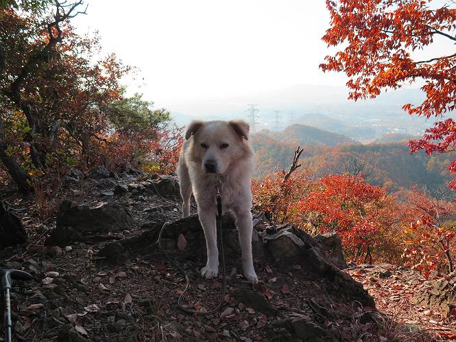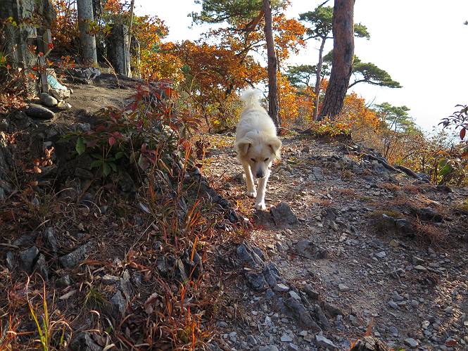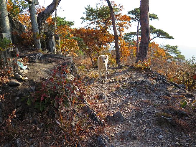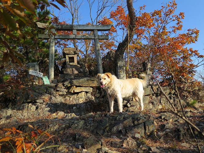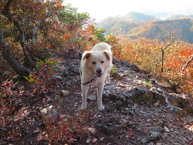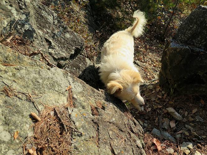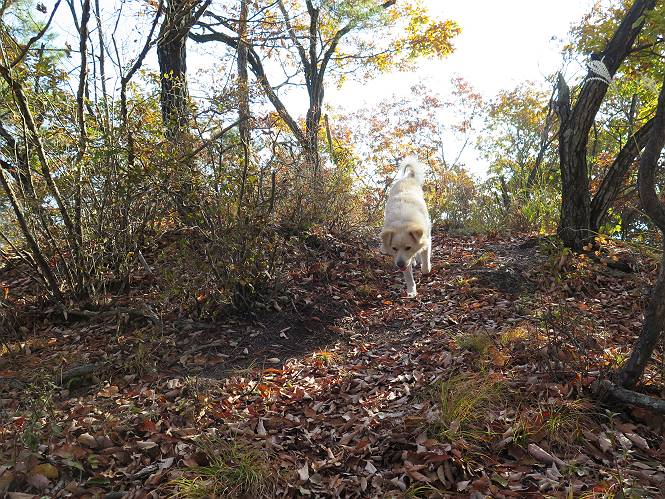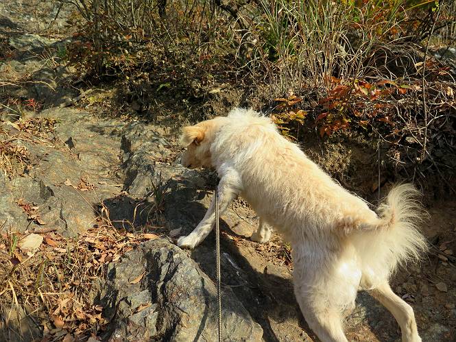 平成二十六年十一月二十三日 Before 写真集目次へ Next 足の怪我は爪がはえかわり、すっかり治ってますが、お父さんの用事が混んでいて、なかなかお山に連れて行ってもらえません。今日は突然、「朝の散歩やめて、山に行くぞ」、って言うんです。ビックリしてしまいましたが、でも嬉しいです。どこへ行くのかな、と思ったら、渡良瀬川の葉鹿橋を渡り、良く来るホームセンターの先を右に曲りました、湯殿山です。 いつもと同じ登山口から山頂へ向かうそうです。 お墓(?)の脇を通り尾根伝いに歩いてます。 所々で落葉が沢山積もってます。 一気に急坂を上がってきましたので、暑くなりました。 しばらくゆるやかな道が続きます。 陽が当たってきました、 お父さんは、上着を脱いで、 、帽子をとって、手袋を外しましたが、ぼくはもう少し先まで行って・・・。 そろそろ岩場に出ます。 おお、紅葉がきれいだな。 早速、紅葉の前で撮ってもらいました。 お水とビスケットを一つもらって、チョッキを脱ぎました。 赤い紅葉は、ミズナラの木ですって 、きれいですね。 ここから岩場がずっと続きます。 「ヨイショ、ドッコイショ」 「オットット、危なかったなあ」 「ヨイショ!、今度はうまくいったな」 「ここは簡単、ヨイショ」 もう、危なそうな場所は過ぎたってさ。 岩の間を緩やかに上ります。 「おお、もう少しで、湯殿山の山頂です」 ちょっと戻るように進んで、 山頂周辺も紅葉がきれいですね。 ミズナラやツツジが多いようです。 湯殿山神社到着です。 記念写真を撮ってもらいました。 ベンチでオヤツとお水を頂きました。 帰りは、いつも東側に下るのですが、 今日は、西側の尾根、つつじの峰を下ります。 小さい小山が幾つも連なっているようです。 落葉が沢山積もってますね。 尾根は、ほとんど落葉樹で明るく、今日の陽気ではポカポカです。 後の山は湯殿山です。 上ったり、下ったり 結構長い尾根ですね。この辺は紅葉が終わったようですが、 この先は紅葉が残ってますね。 「早く、来い!」、だって。 「ハイ、ハーイ」 「ウワー、赤城山が見えた、手前の山は紅葉真っ盛りだ、姥穴山かな」 「スゴイぞ、スゴイ、真っ赤っ赤だヨー」 「あっちって、ぼくんちの方かな」 紅葉を眺めながら残ったオヤツとお水を頂きました。 「この尾根、まだまだ続くのかなあ」、「この先は下っちゃうんだよ」 「そうか、・・・・・」 、ということで、また記念写真を撮ってもらいました。 間もなく桧林を抜け笹道を通って、 どんどん下って、 分岐点に出ました、中山駐車場の方向に下ります。 危なっかしい橋を渡り、林道にでました。 車の方向は? しばらく考えてましたが、5分ほどで出発点に戻れました。今日の湯殿山、初めての道を歩いて、楽しかったでーす。 Before 写真集目次へ Next |
