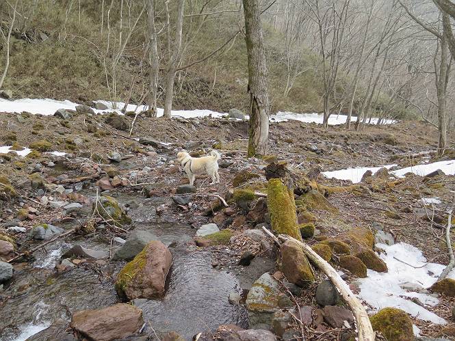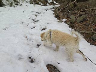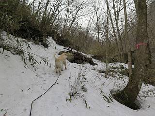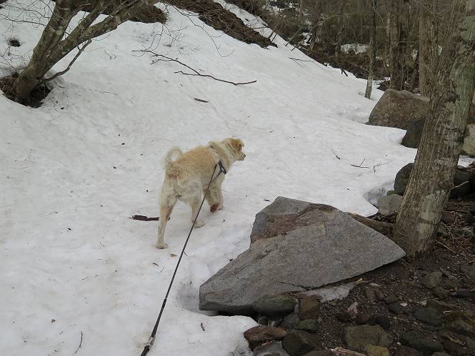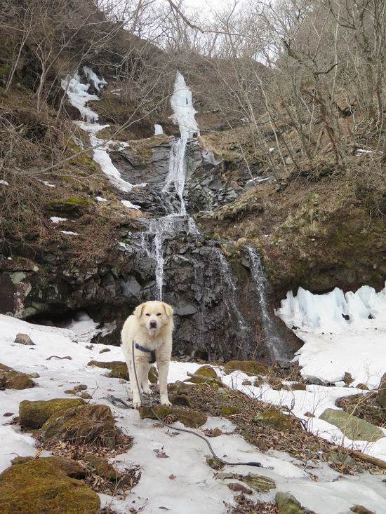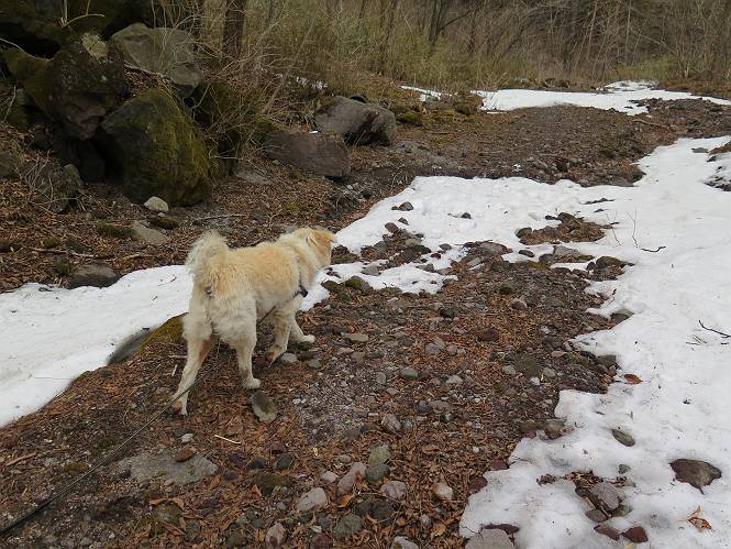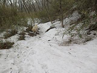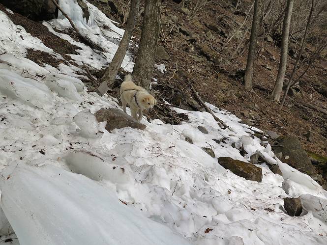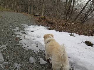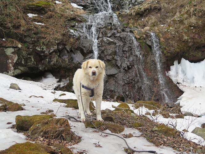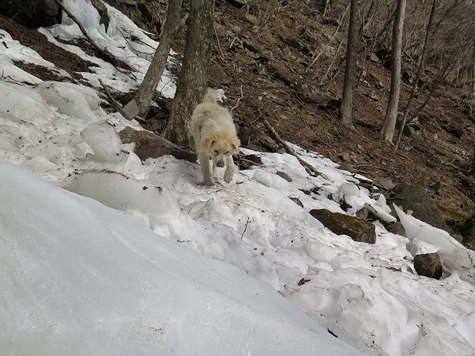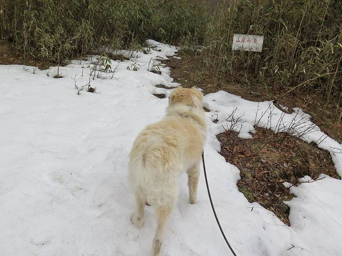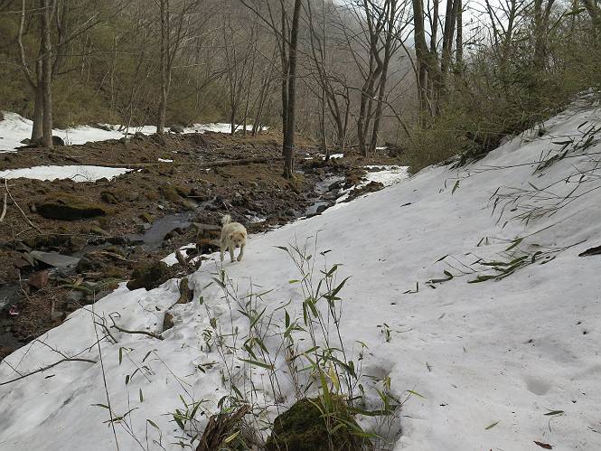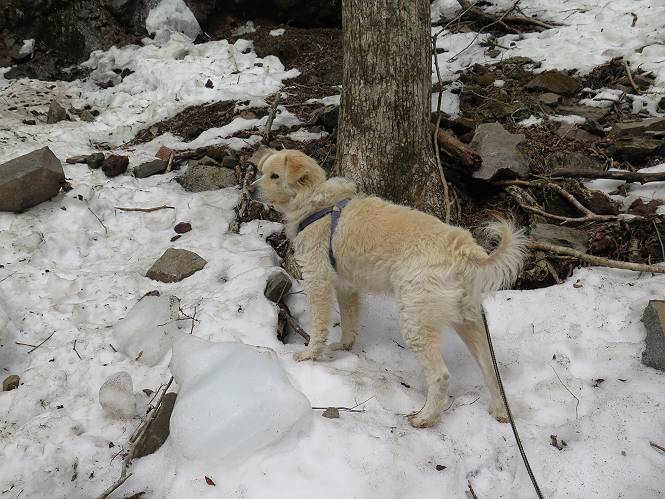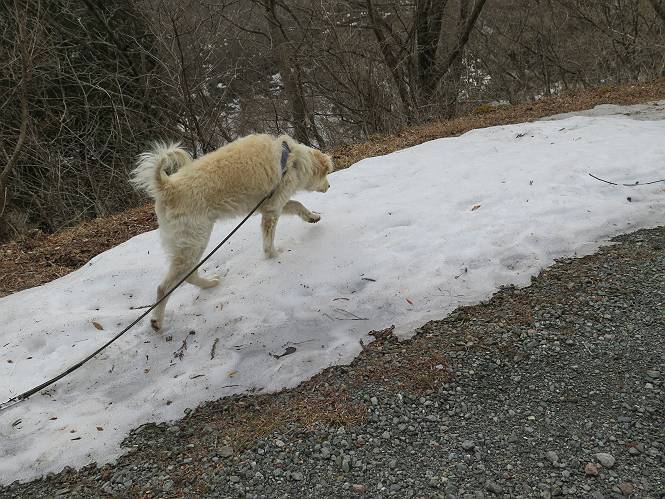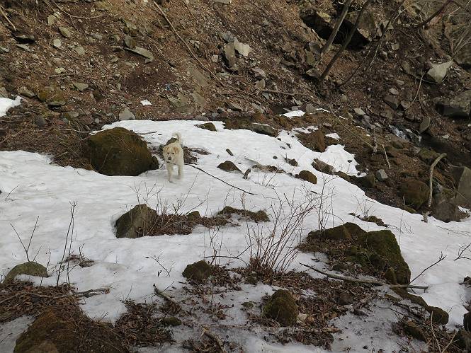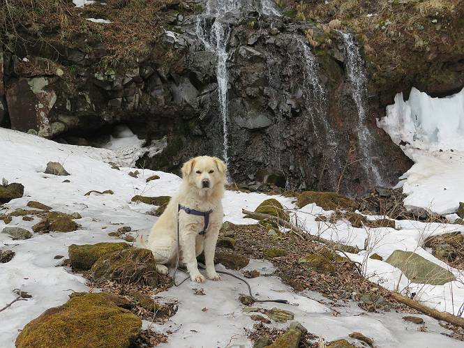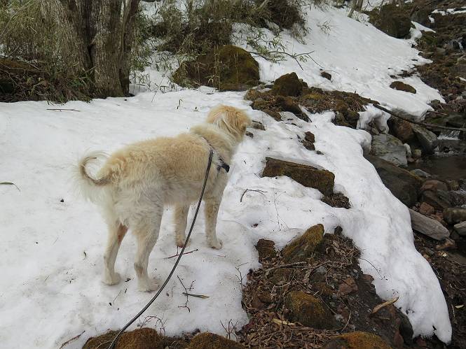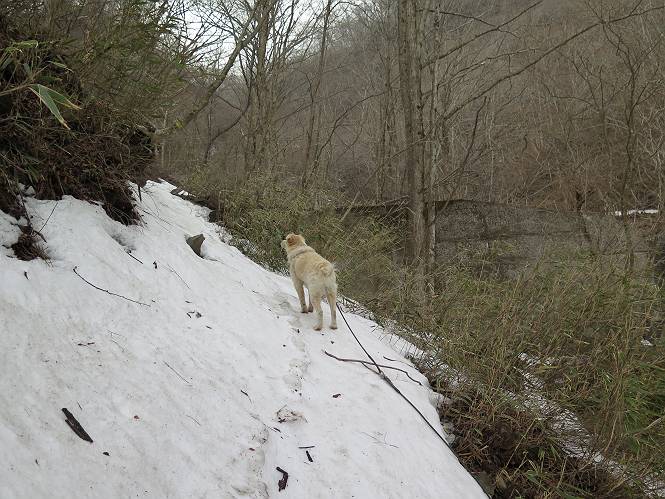 | 平成二十七年三月二十一日 Before 写真集目次へ Next 3月2日に利平茶屋森林公園に出かけましたが、道がアイスバーンで先へ行けず、引き返しました。それから暖かい日が続いて、雪が解けてしまったかも知れませんが、「忠治が遊ぶ雪ぐらいあるだろう」、と出かけました。ほどんど曇ってましたが、山崖の滝まで遊びながら歩いてきました。 利平茶屋森林公園のゲート付近です、早速雪の感触を確かめました。 キャンプ場の中の道を少し歩くと、ミズバショウが咲いていました、 植えたもののようです。 坂道を歩いて、広場に出ました。 広場から、つり橋を渡ってます。 ちょっと道が狭くなって、雪が徐々に増えてきました。 斜面を登ったり下ったりして、遊びながら上流」へ歩いてます。 山崖の滝の案内板がありました、ここに入ります。 道は一段と狭くなって、急になりました。 雪もほとんど連続してます、たっぷりあって遊ぶには十分です。 堰堤に近づきました。左の雪の急斜面を越えます。 しばらく雪の上を歩くと、 河原に出ました。向こう側へ渡ろうとしたら止められてしまいました。 また、少し歩いて、渡ろうとしたら、 また、止められてしまいました。 仕方なく、戻ってきました。 すると、山崖の滝が正面に見えました。 氷は解けてしまって、残念です、水も少ないようです。 滝の下に進んでます。 やれ、やれ、山崖の滝に到着です。 記念写真を撮ってもらいました。 今日は、日差しが弱いですね。 オヤツをもらって、もう一枚撮ってもらいました。 お父さんが、「忠治向こう側の上に行ってみな」、と言うのできましたが、 怖いなあ。 「もっと、下の方でいいや」、って言ってます。 上の方は、凍っていて急なんだもの、怖いよ。 よかった、よかった。 先ほど記念写真を撮った、直ぐ反対側です、ここなら傾斜も緩いしね。 迫力ありますか? 大きなつららが解けちゃったみたいです。 滝とつららがこんな感じになってます。 いっぱい、遊んだので、そろそろ下ります。 もう、広い道に出てしまいました。 「あれっ、何?」、「パイプから水が出ているだけだよ」、「飲んで来ようか」 ヤブをショートカットしながら下って、つり橋を渡り、 広場に戻りました。 「いっぱい、お家があるね、でも誰もいないや」、もうこの先は駐車場です。 沢をもうちょっと遡っていけば、面白いんだって、でも忠治は行けるかなって言ってました。 Before 写真集目次へ Next |