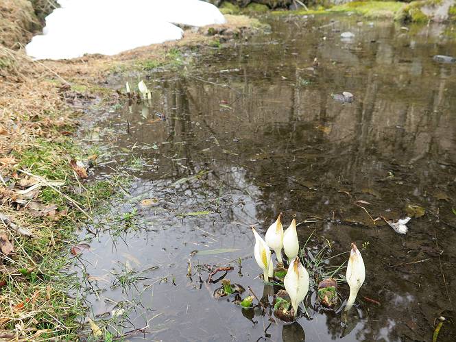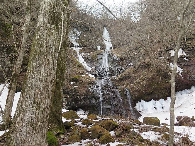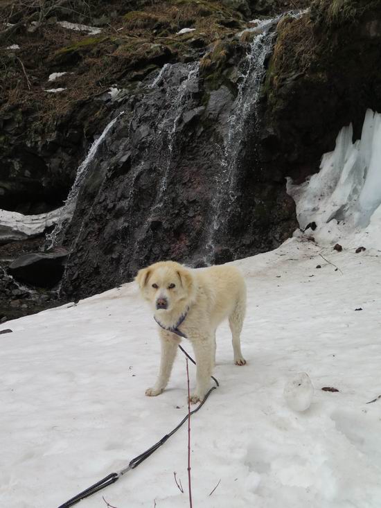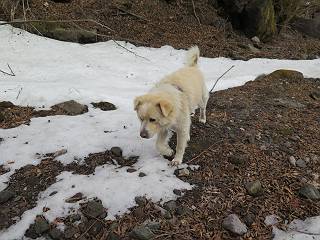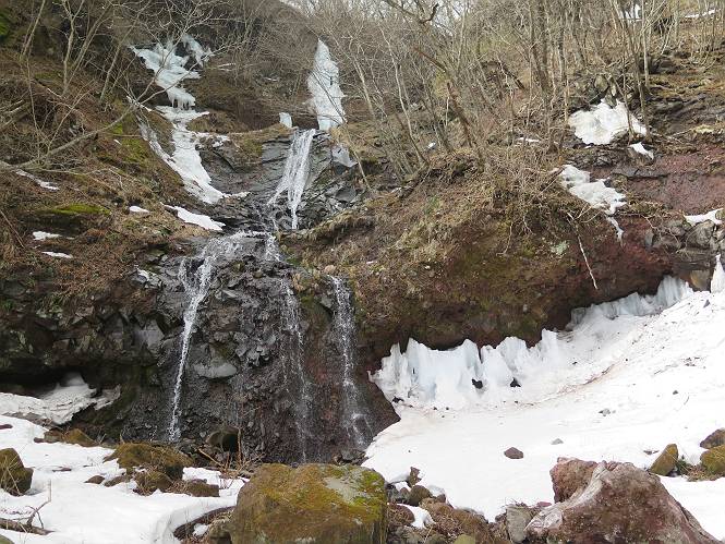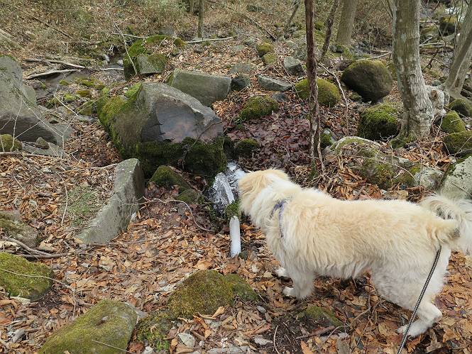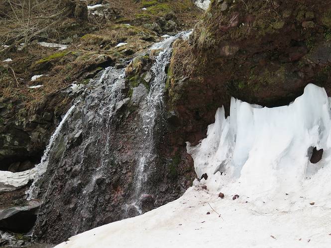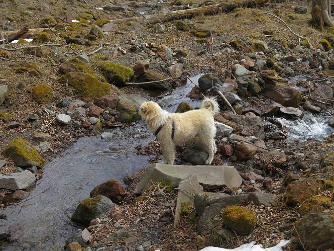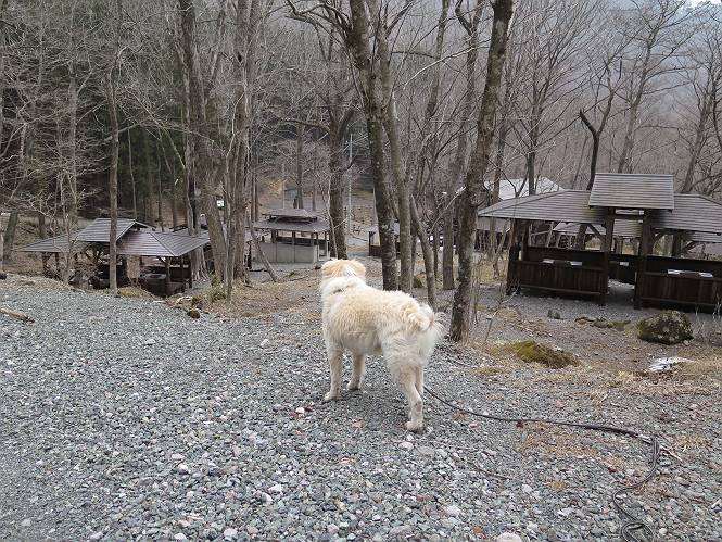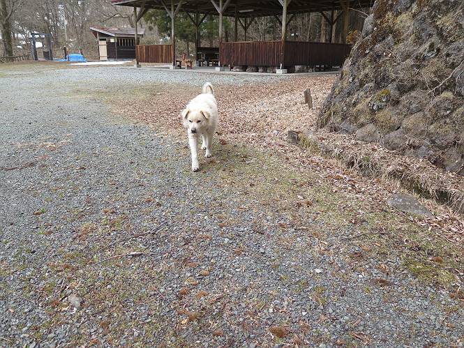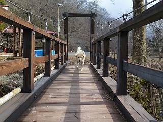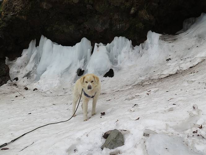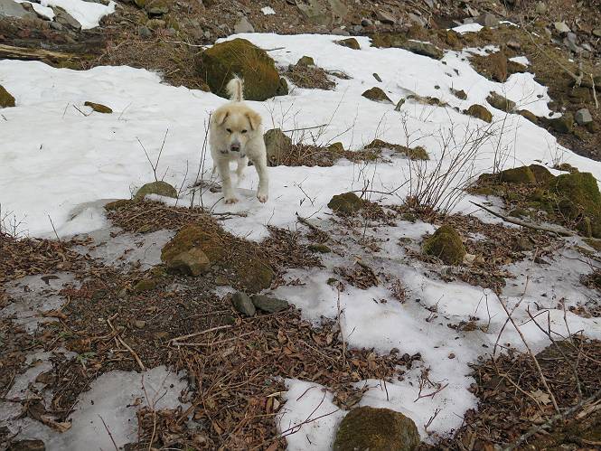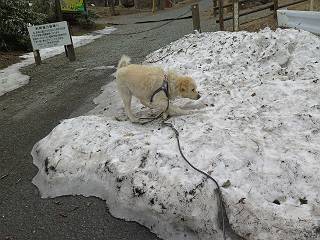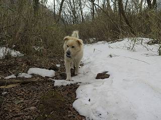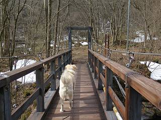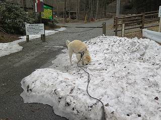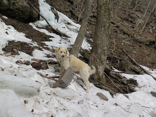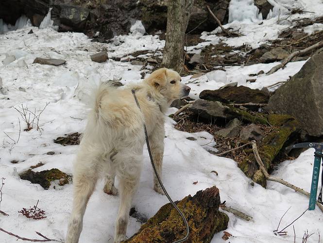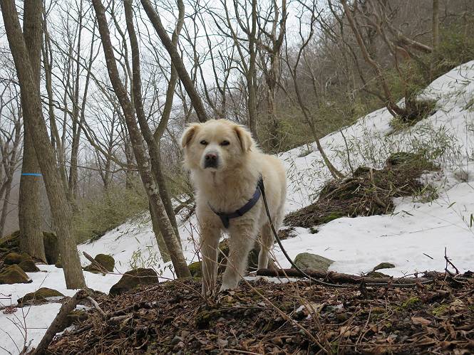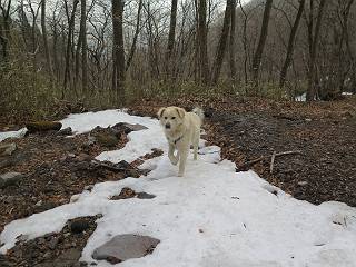 | 平成二十七年三月二十一日 Before 写真集目次へ Next 3月2日に利平茶屋森林公園に出かけましたが、道がアイスバーンで先へ行けず、引き返しました。それから暖かい日が続いて、雪が解けてしまったかも知れませんが、「忠治が遊ぶ雪ぐらいあるだろう」、と出かけました。ほどんど曇ってましたが、山崖の滝まで遊びながら歩いてきました。 利平茶屋森林公園のゲート付近です、早速雪の感触を確かめました。 キャンプ場の中の道を少し歩くと、ミズバショウが咲いていました、 植えたもののようです。 坂道を歩いて、広場に出ました。 広場から、つり橋を渡ってます。 ちょっと道が狭くなって、雪が徐々に増えてきました。 斜面を登ったり下ったりして、遊びながら上流」へ歩いてます。 山崖の滝の案内板がありました、ここに入ります。 道は一段と狭くなって、急になりました。 雪もほとんど連続してます、たっぷりあって遊ぶには十分です。 堰堤に近づきました。左の雪の急斜面を越えます。 しばらく雪の上を歩くと、 河原に出ました。向こう側へ渡ろうとしたら止められてしまいました。 また、少し歩いて、渡ろうとしたら、 また、止められてしまいました。 仕方なく、戻ってきました。 すると、山崖の滝が正面に見えました。 氷は解けてしまって、残念です、水も少ないようです。 滝の下に進んでます。 やれ、やれ、山崖の滝に到着です。 記念写真を撮ってもらいました。 今日は、日差しが弱いですね。 オヤツをもらって、もう一枚撮ってもらいました。 お父さんが、「忠治向こう側の上に行ってみな」、と言うのできましたが、 怖いなあ。 「もっと、下の方でいいや」、って言ってます。 上の方は、凍っていて急なんだもの、怖いよ。 よかった、よかった。 先ほど記念写真を撮った、直ぐ反対側です、ここなら傾斜も緩いしね。 迫力ありますか? 大きなつららが解けちゃったみたいです。 滝とつららがこんな感じになってます。 いっぱい、遊んだので、そろそろ下ります。 もう、広い道に出てしまいました。 「あれっ、何?」、「パイプから水が出ているだけだよ」、「飲んで来ようか」 ヤブをショートカットしながら下って、つり橋を渡り、 広場に戻りました。 「いっぱい、お家があるね、でも誰もいないや」、もうこの先は駐車場です。 沢をもうちょっと遡っていけば、面白いんだって、でも忠治は行けるかなって言ってました。 Before 写真集目次へ Next |