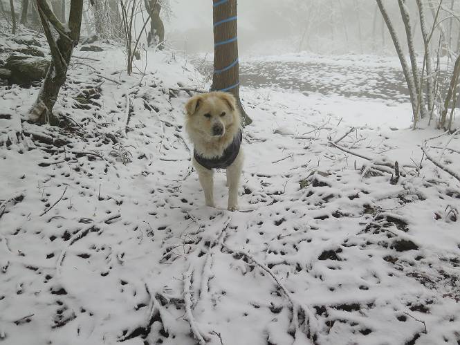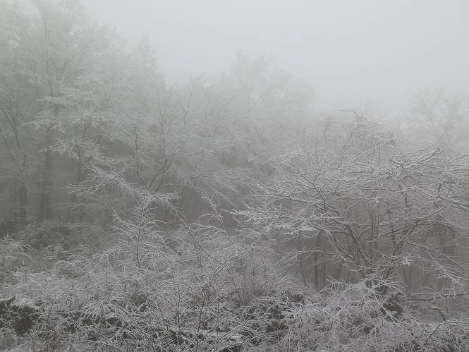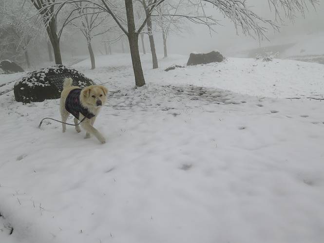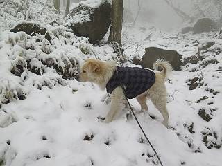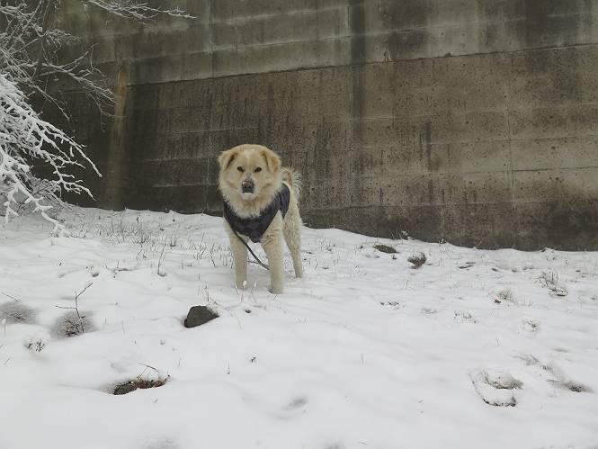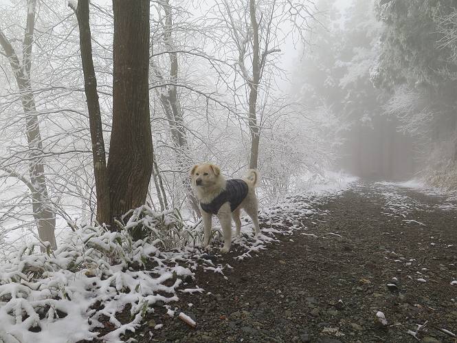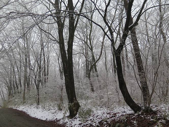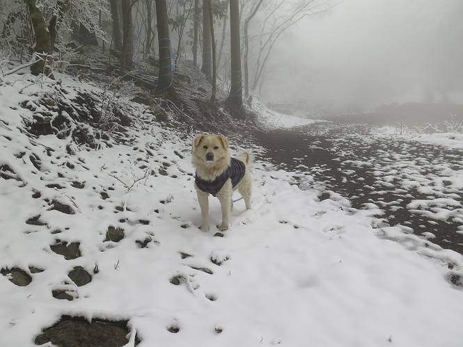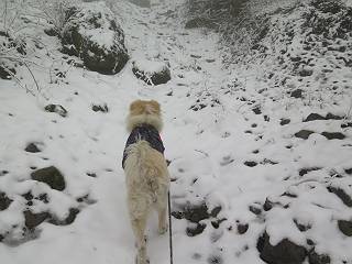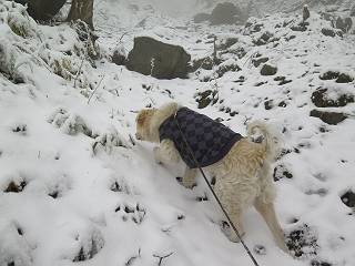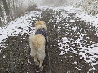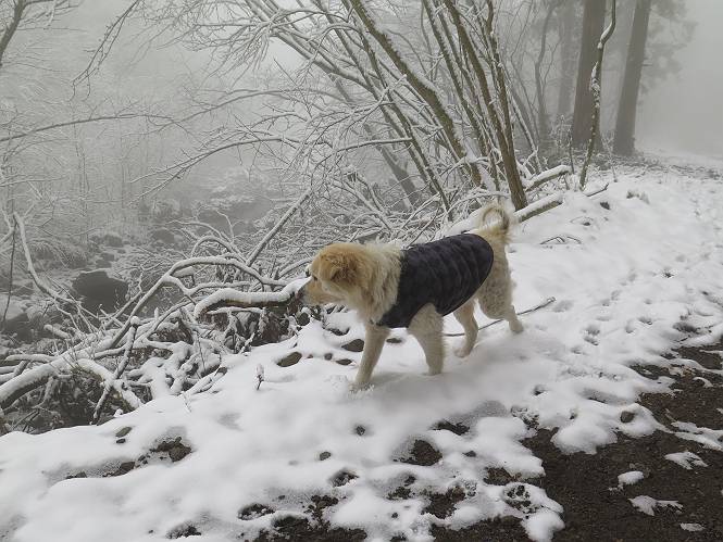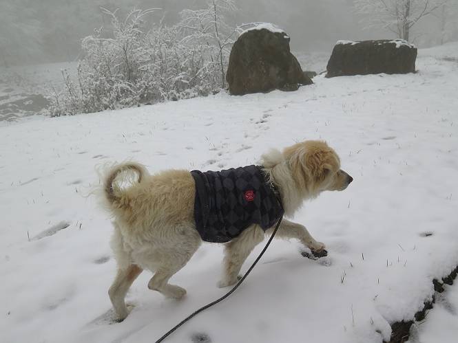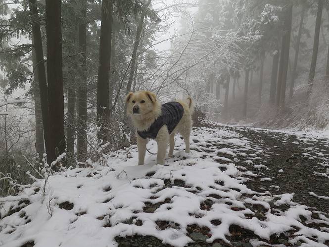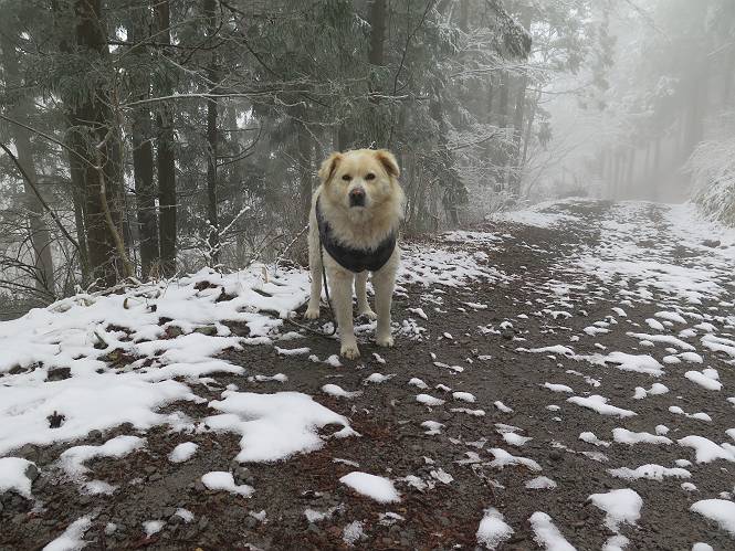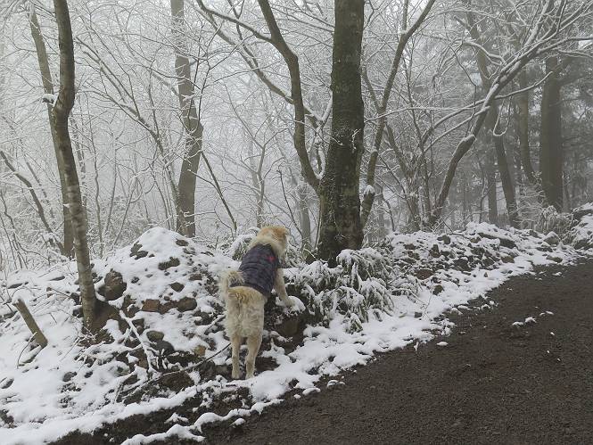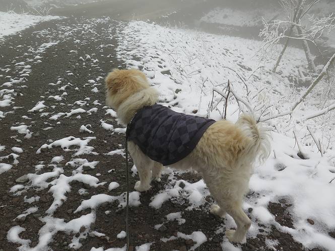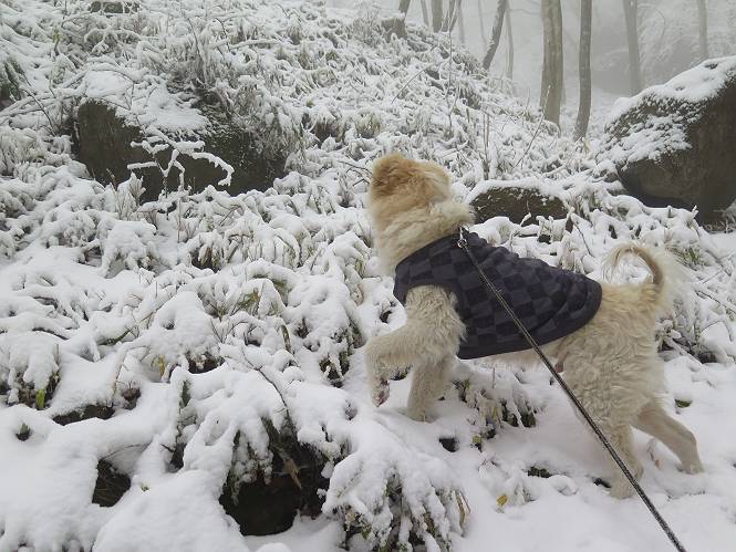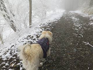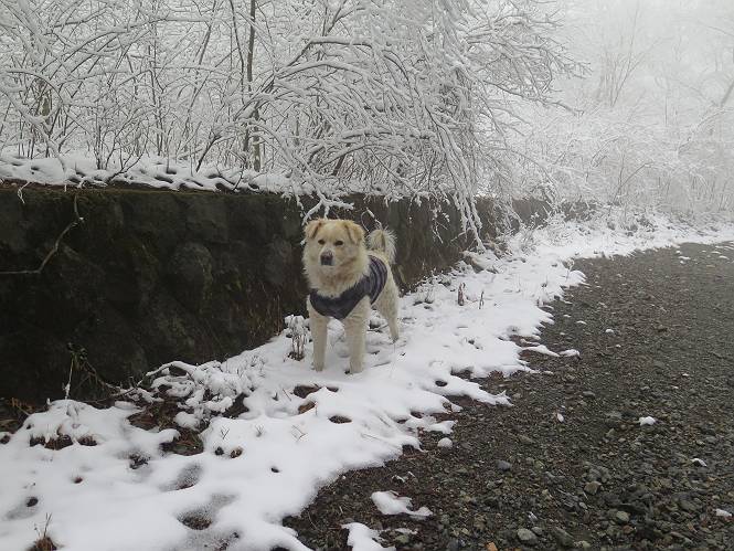 平成二十七年四月九日 Before 写真集目次へ Next 桜の花見に赤城山方面に出かけましたが、天気も良くないし、千本桜には大勢の人が見えたので、大猿山乃家方面に変更しました。すると、葉の上に雪が、更に進むと、霧の中にきれいな着雪が見えました。大猿の駐車場周辺を散策してきました。 大猿山乃家に近づくと雪だ出てきました。 着雪がきれいでしたよ、写真は松の葉です。 雑木林の着雪です。 芽吹いてきた小さい木にもきれいに雪がついてました。 奥へ進むほど雪の量が増して、怖くなるほどでした。 駐車場から大猿川に沿って、 霧の中を歩いて行きました。 ワンコの足跡がついている、今日、だれか歩いたな。 足跡がなくなった、どっちへ行ったのかな。 ここは、ちょっと広くなっているので、いっぱい足跡をつけちゃいました、ワン。 川に降りても面白そうだけど、今日は駄目なんだって、 真っ直ぐ、川沿いに進むと、怪しい雰囲気になりました。 堰堤で行き止まってしまいました。 戻って、途中から上の道に出る、って言ってますが、 小さい草木にはいっぱい雪がついてますし、ここからでは、上には上がれないなあ。 仕方なく、半分ほど戻って、 斜めにショートカットして、 上の道に出られました。 沿道の雪が大分多くなってきました。 道の真ん中は、解けて、雪がないのですが、多い端を歩いてます、面白いんだものね。 桧と杉に着いた雪です、きれいだね。 この道、どこまで行くのかねえ。 猿田彦神社? 乙女の滝? そこまでは行けないよ。 「もう、随分歩いたよね」、「うん」 「霧が立ち込めて、何だか怖いなあ」、「大丈夫だよ」 ここの岩、崩れるんじゃない? 「もう、戻りましょう」、「じゃあ、遊びながら戻るか」 この辺で、ちょっと遊んで、行きましょう。 動物の足跡が沢山あるよ、鹿さんかな? この先は薮です。 一旦出て、 入り直しをしました。 何だかわりませんが、テープが沢山巻いてあります。 ちょっと歩いてみましたが、 すぐ、道に出てしまいました。 今度は、・・・・・、 上がってみよう、 面白いぞ、ドンドン行ってみよう 変なところに出ちゃったなあ。 この沢みたいなところを上ってみよう、ヨイショ、ヨイショ、 大分上がってきたぞ、 「忠治、もうやめとけ」 「もう少し・・・・、」 平になったところで、この辺んでやめておきましょう。 道に戻って、 しばらく歩くと、 先ほど歩いた大猿川沿いの遊歩道に入りました、 ちょっと先で、駐車場に出ました、良かった、安心でーす。 大猿山乃家付近は年間通して静かな所で、何度か長い尾根から長七郎山まで歩いたことがあります。賑やかな場所を歩くのも、また、楽しいですが、ここもいいですよ。 Before 写真集目次へ Next |